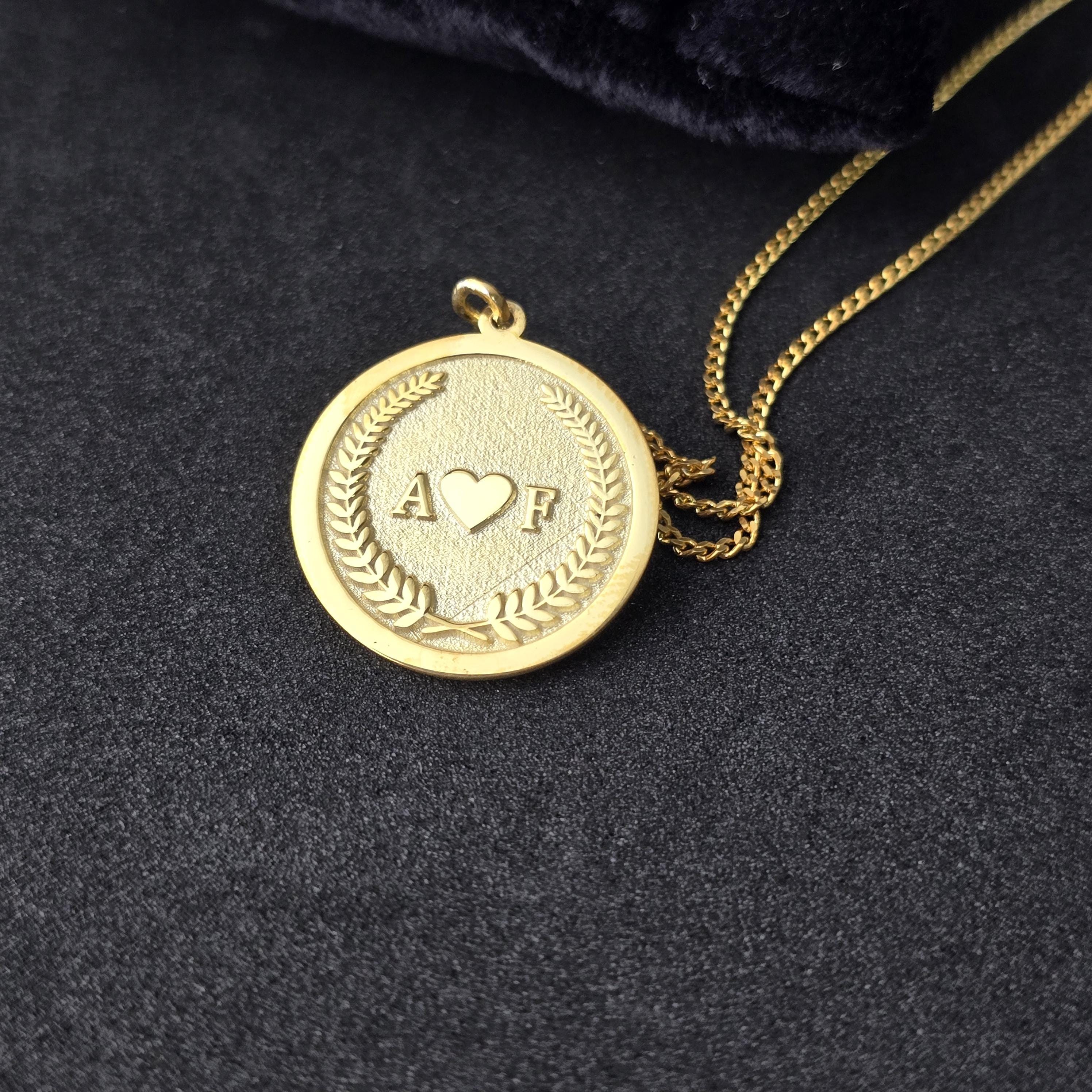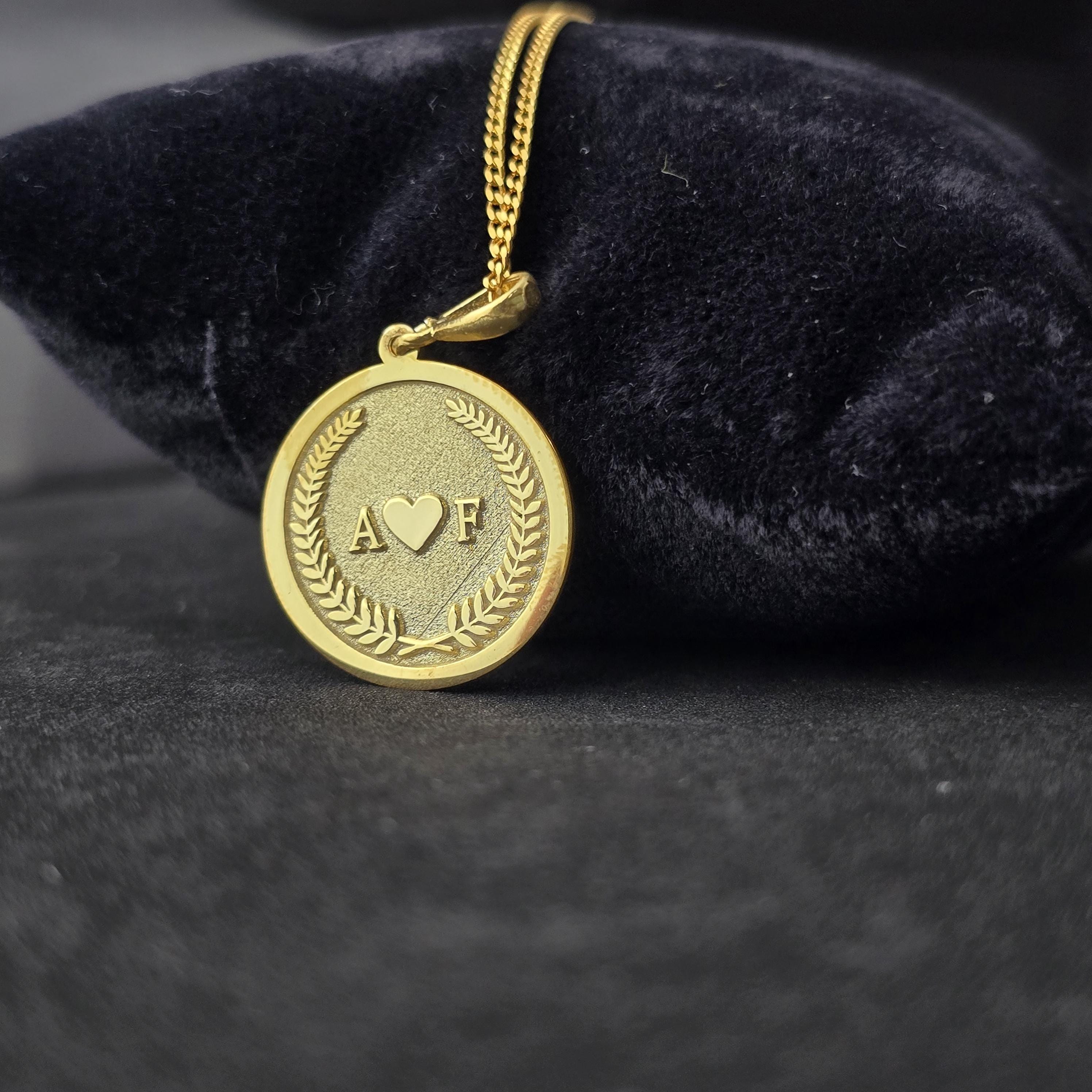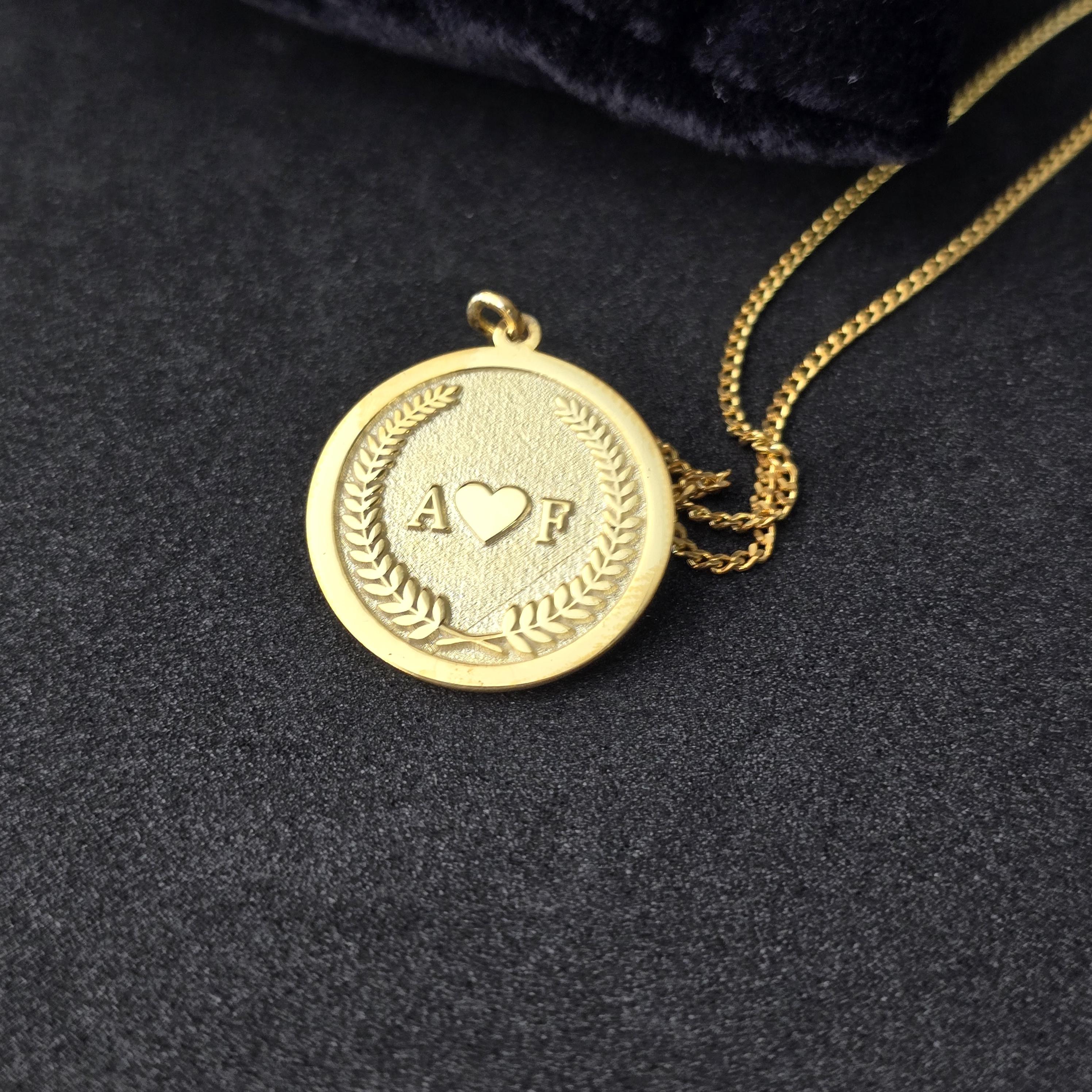 Celebrate your story with this Custom Initial Necklace ✨—a handcrafted laurel coin pendant featuring two initials with a heart in the center. Cast on a 925 sterling silver base and finished in luminous gold plating (also available in vermeil or solid 10k/14k/18k gold), this piece blends heirloom quality with everyday wearability. The face showcases a textured field framed by a laurel wreath 🌿, symbolizing victory, commitment, and lasting love. Raised letters and a crisp heart icon create a clean, high-contrast monogram that reads beautifully in person and on camera.