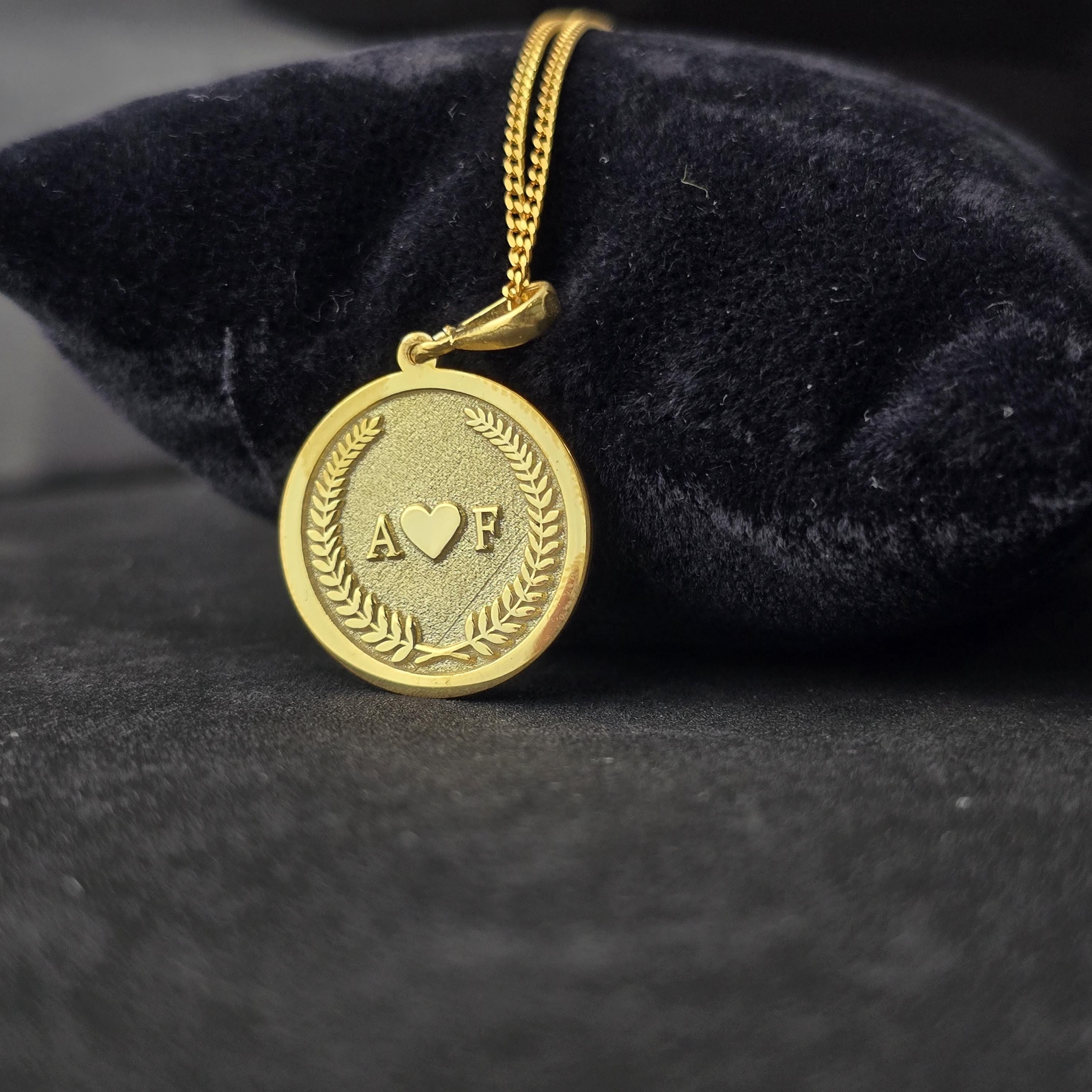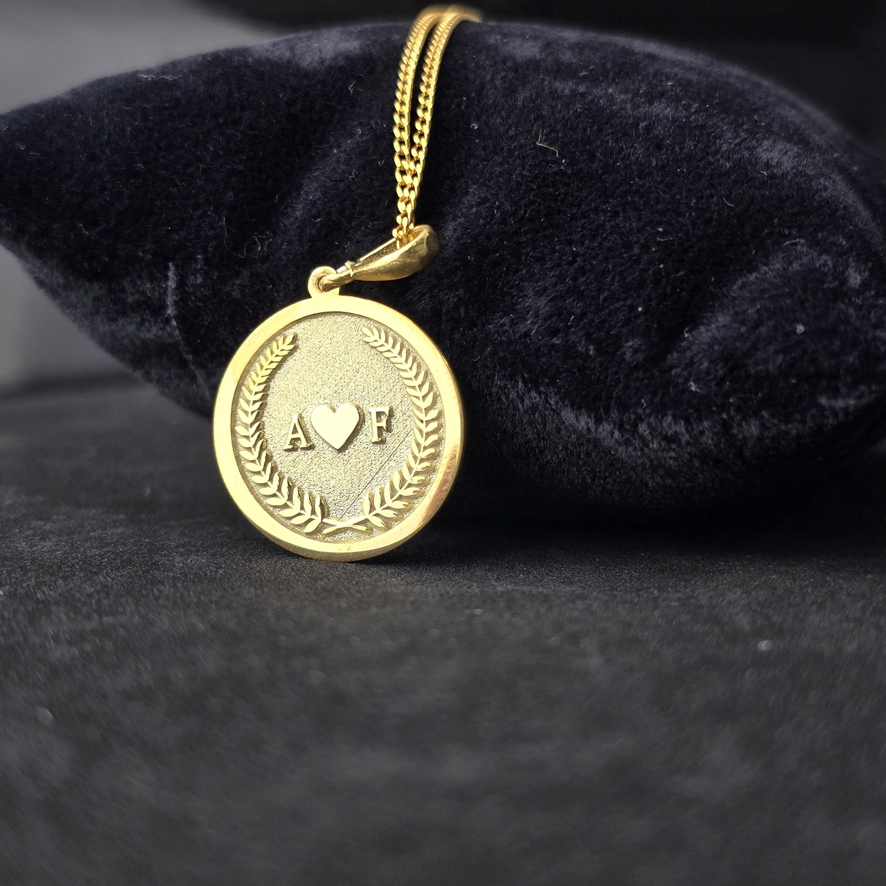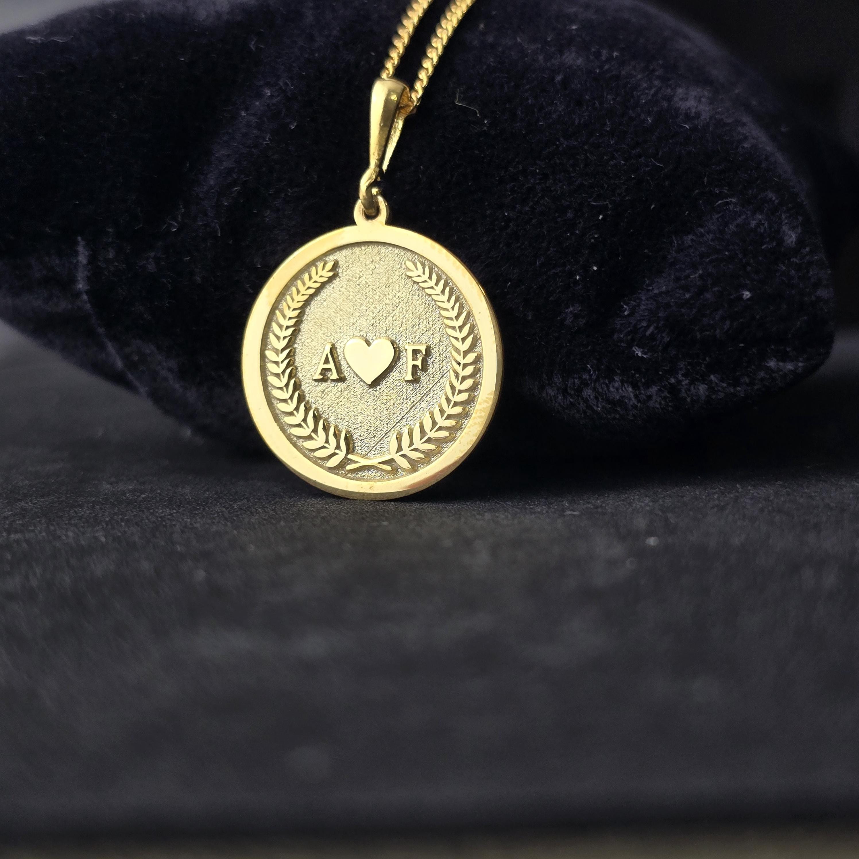 Celebrate your story with this Custom Initial Necklace ✨—a handcrafted laurel coin pendant featuring two initials with a heart in the center. Cast on a 925 sterling silver base and finished in luminous gold plating (also available in vermeil or solid 10k/14k/18k gold), this piece blends heirloom quality with everyday wearability. The face showcases a textured field framed by a laurel wreath 🌿, symbolizing victory, commitment, and lasting love. Raised letters and a crisp heart icon create a clean, high-contrast monogram that reads beautifully in person and on camera.