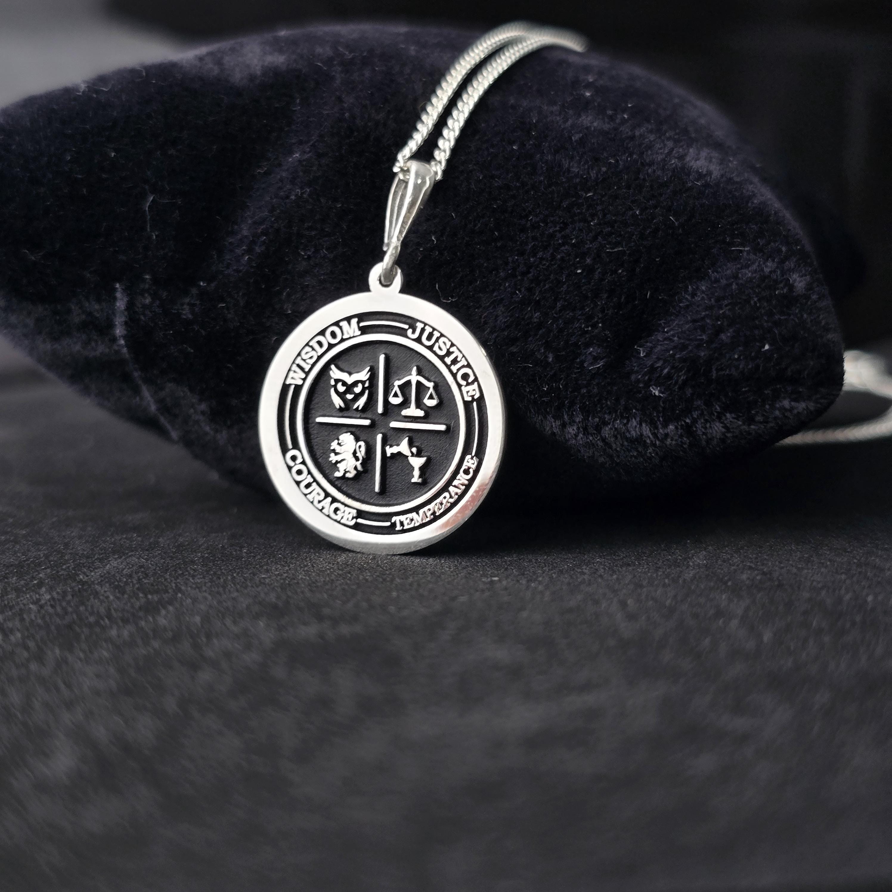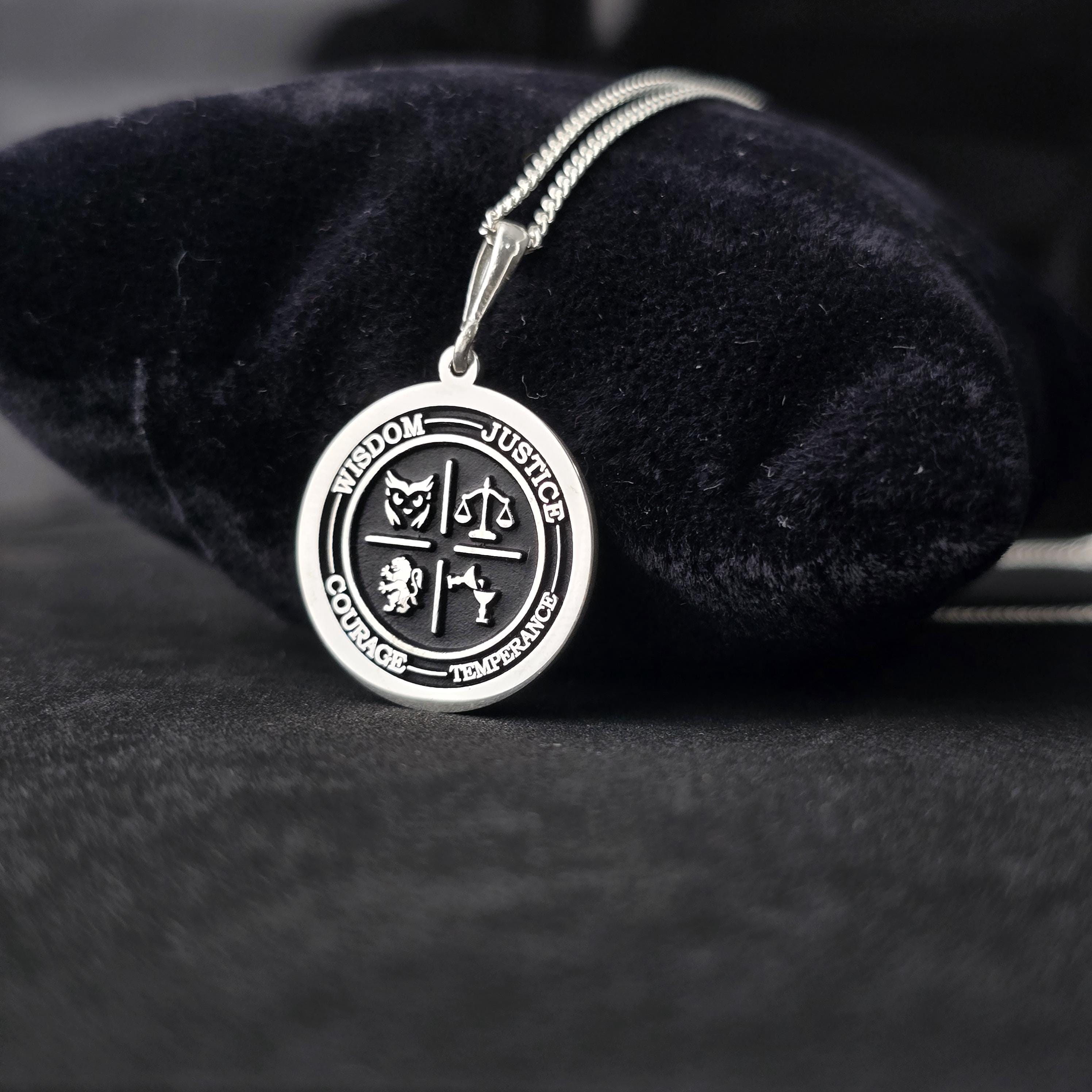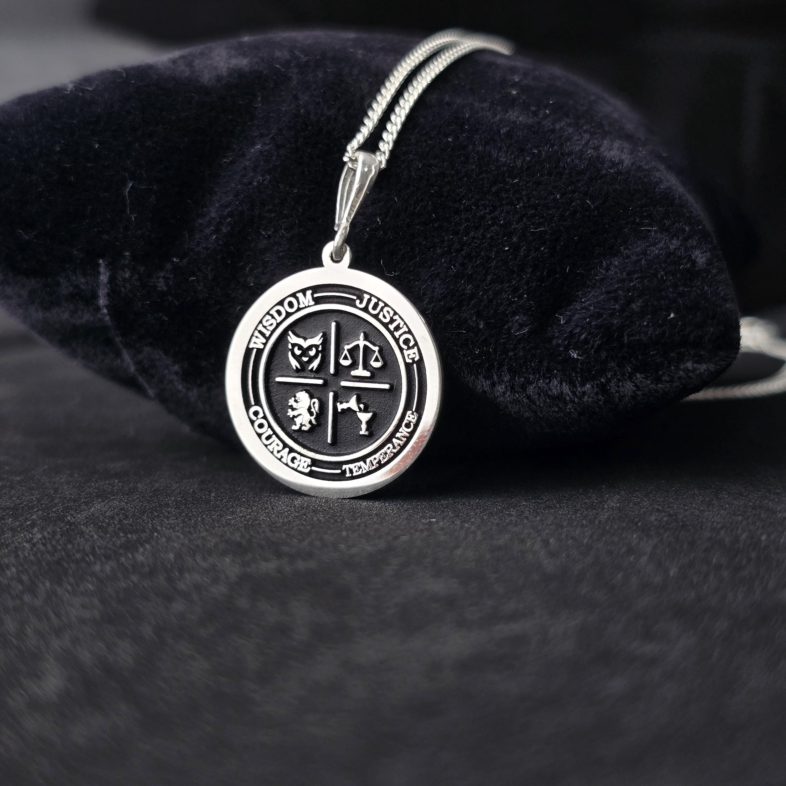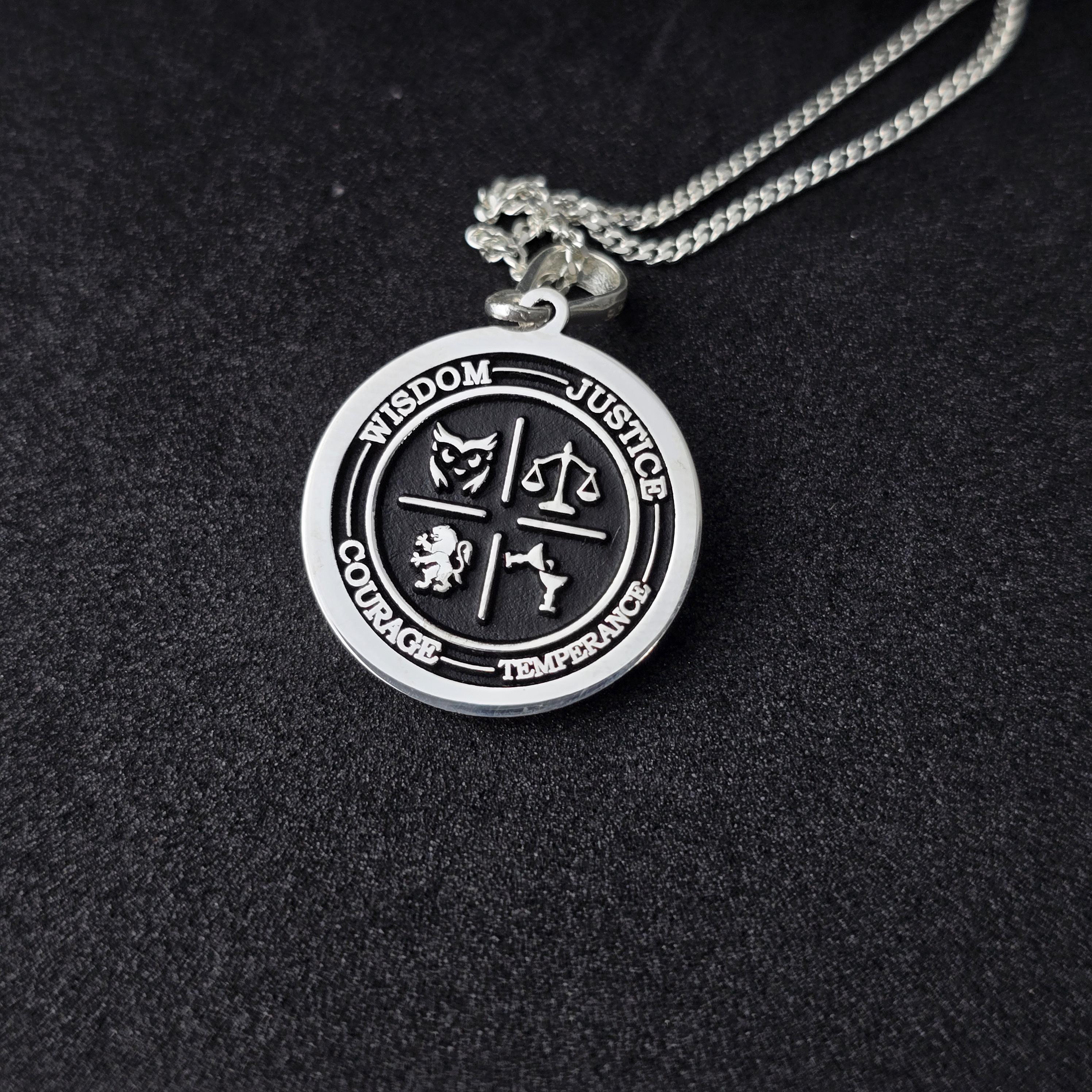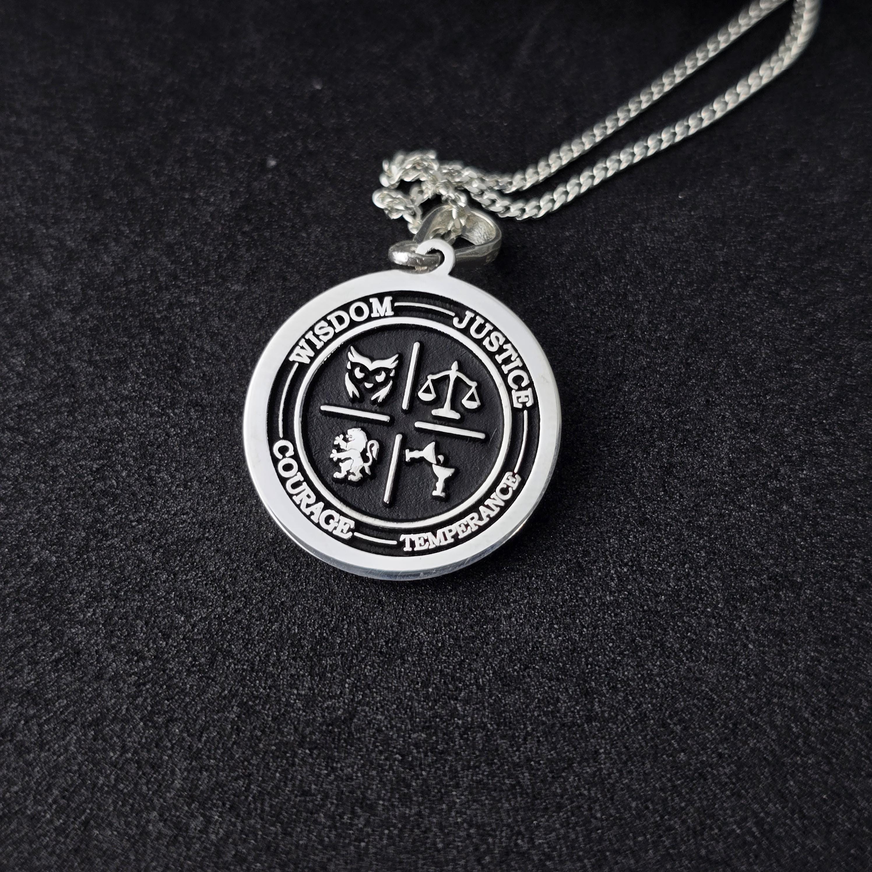 Cardinal Virtues Stoic Pendant Necklace, Wisdom Temperance Courage Justice