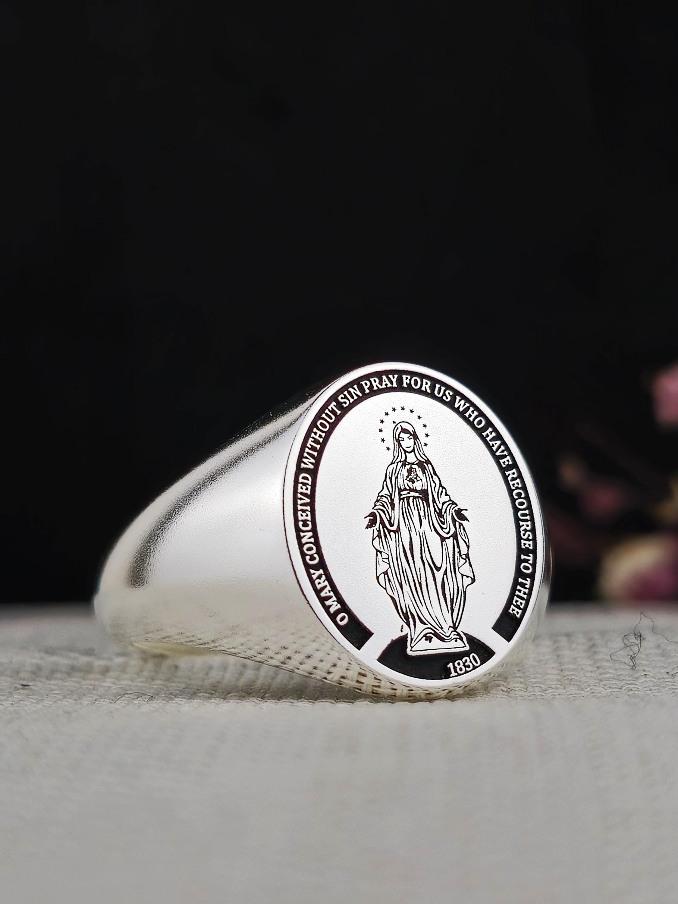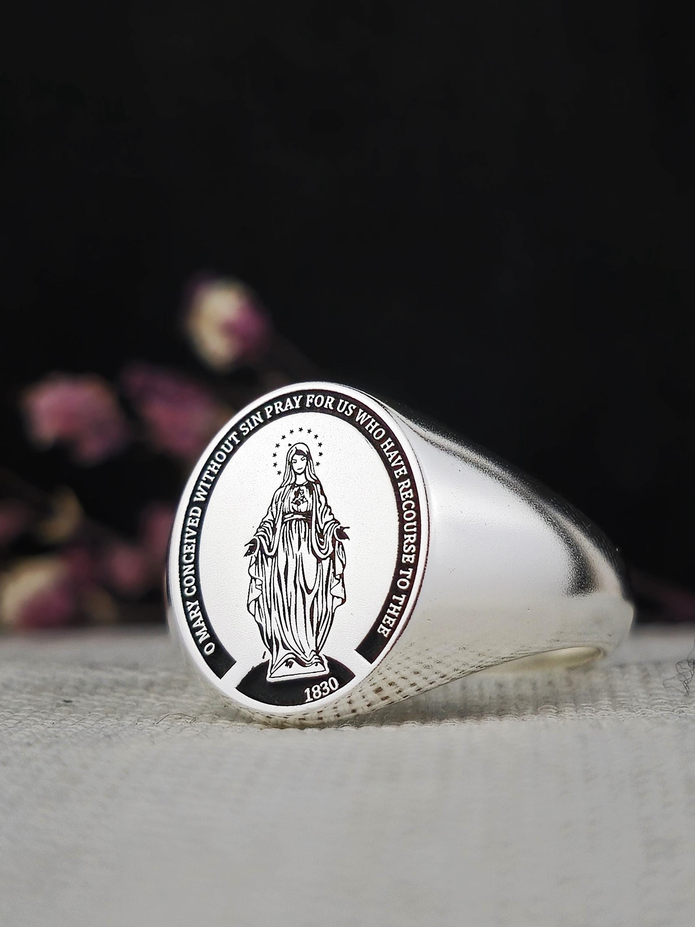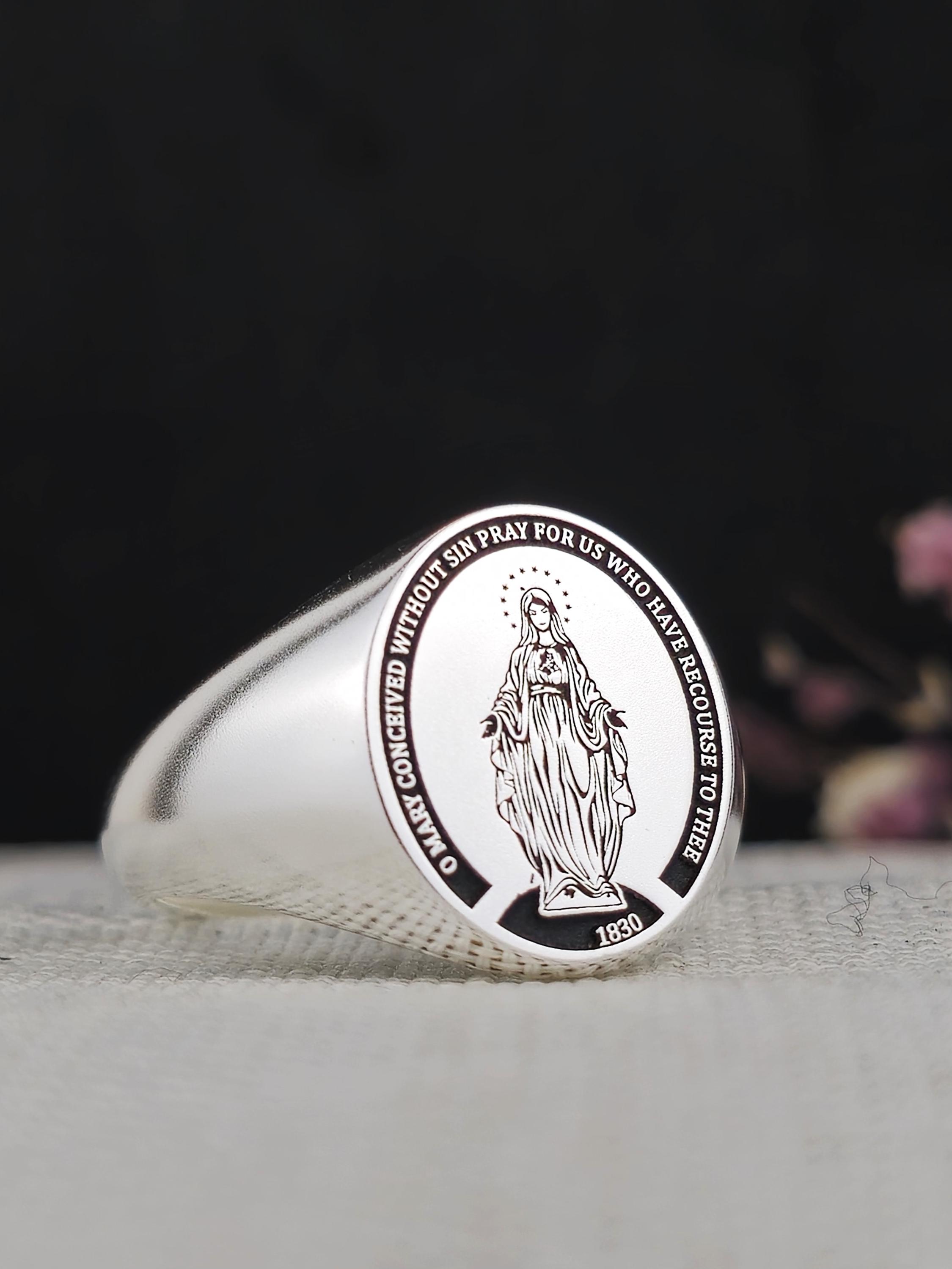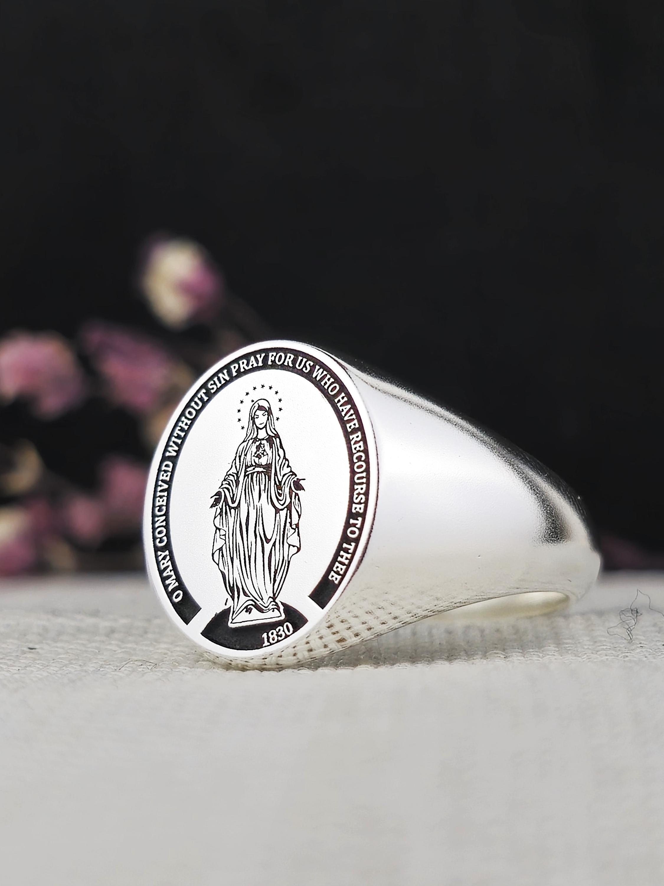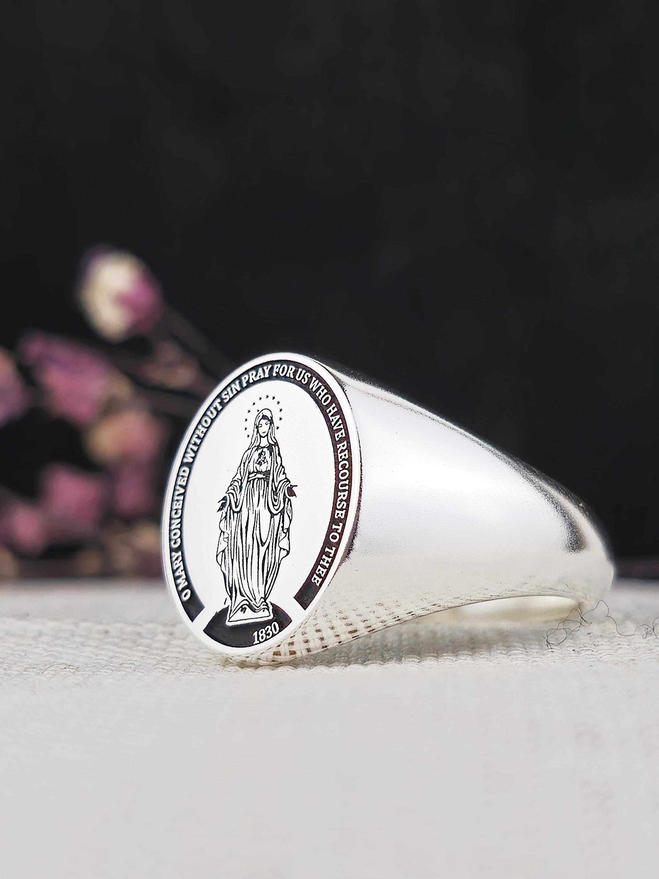 This elegant 925 sterling silver signet ring features the image of the Blessed Virgin Mary, surrounded by the inscription "O Mary, conceived without sin, pray for us who have recourse to thee." A powerful symbol of faith, devotion, and protection, this ring is a meaningful piece for those who honor the Virgin Mary and the Immaculate Conception.