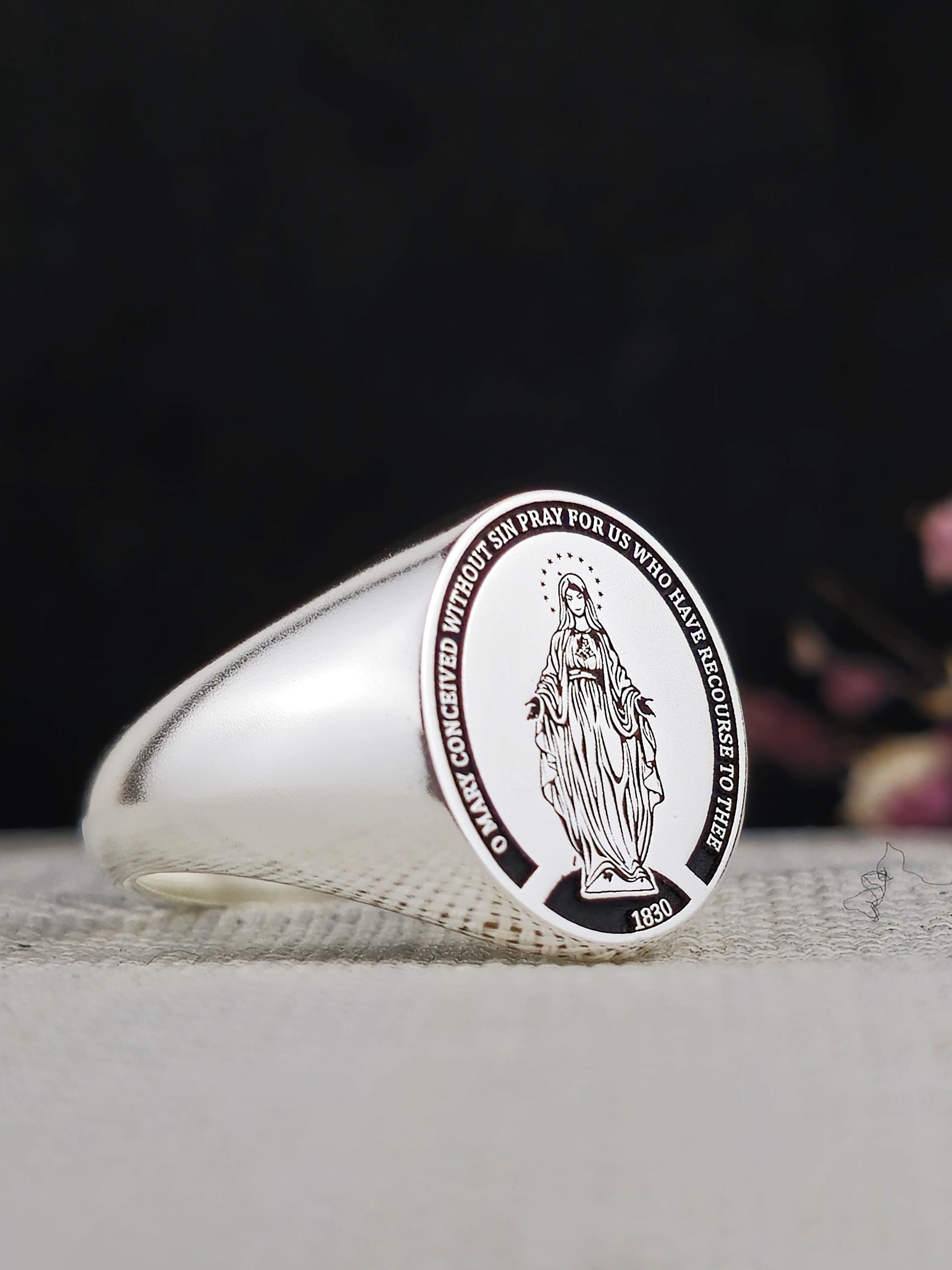 Sterling Silver Mary Mother Signet Ring: Religious Prayer Jewelry