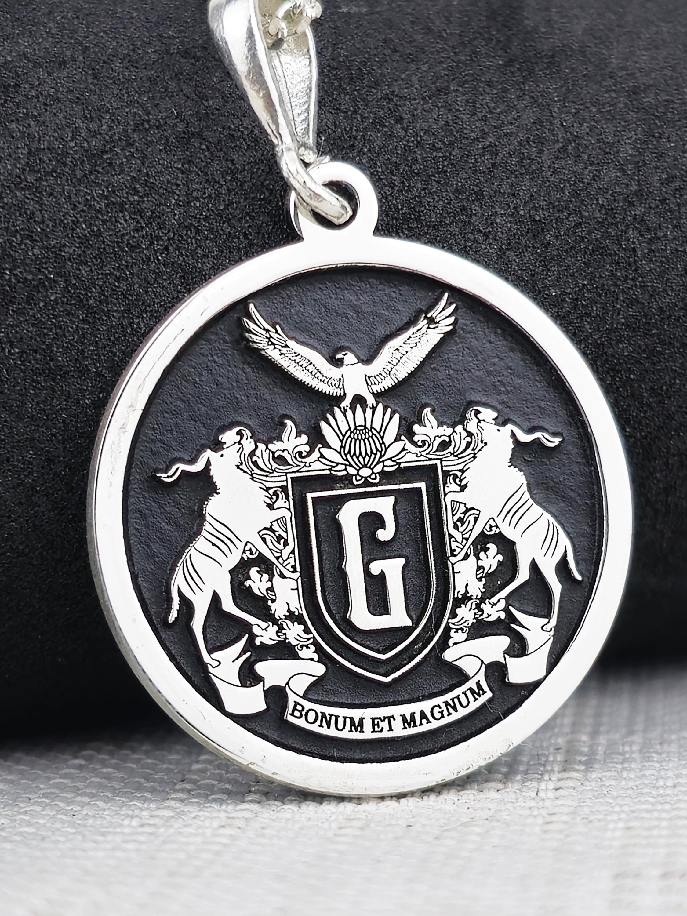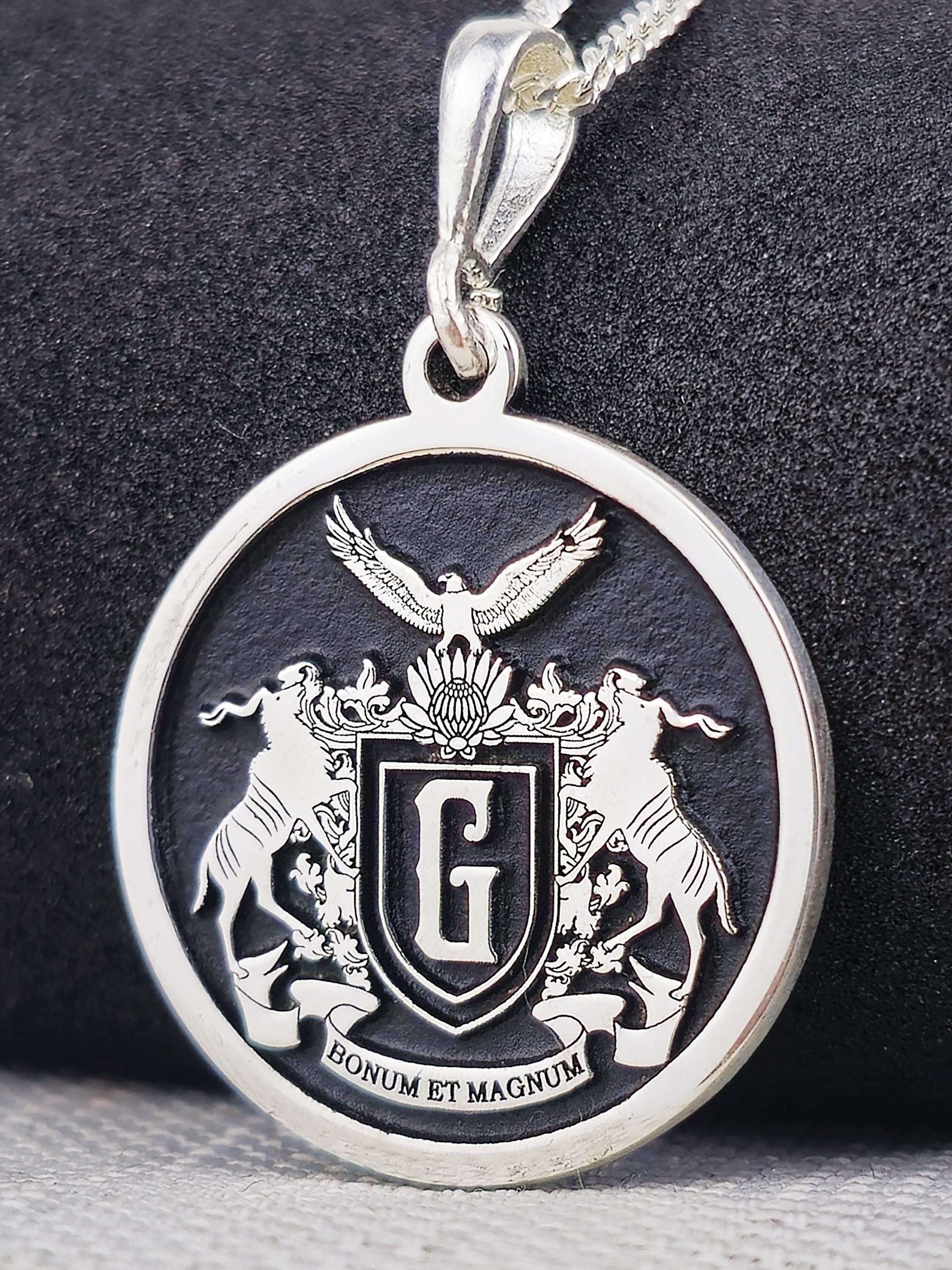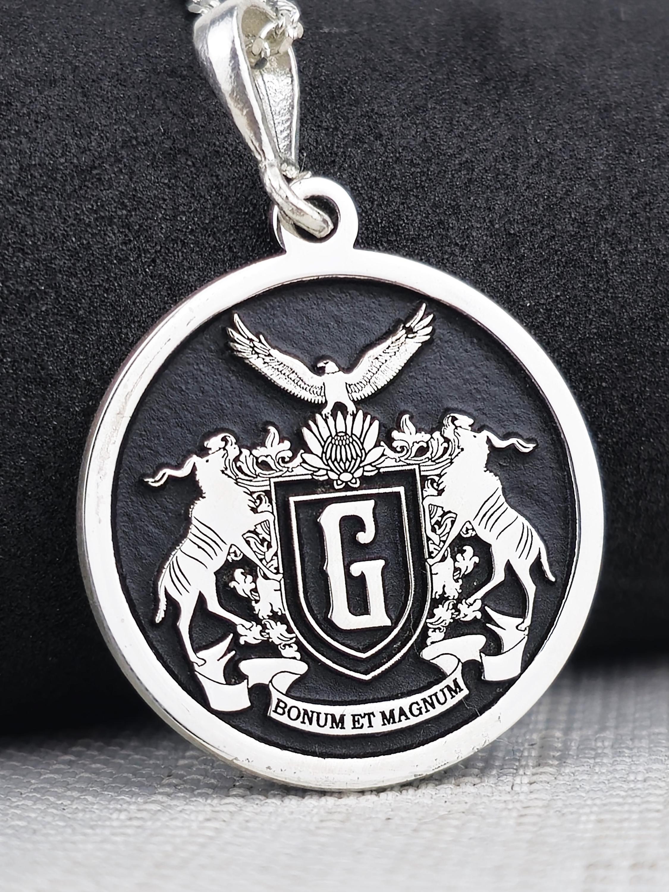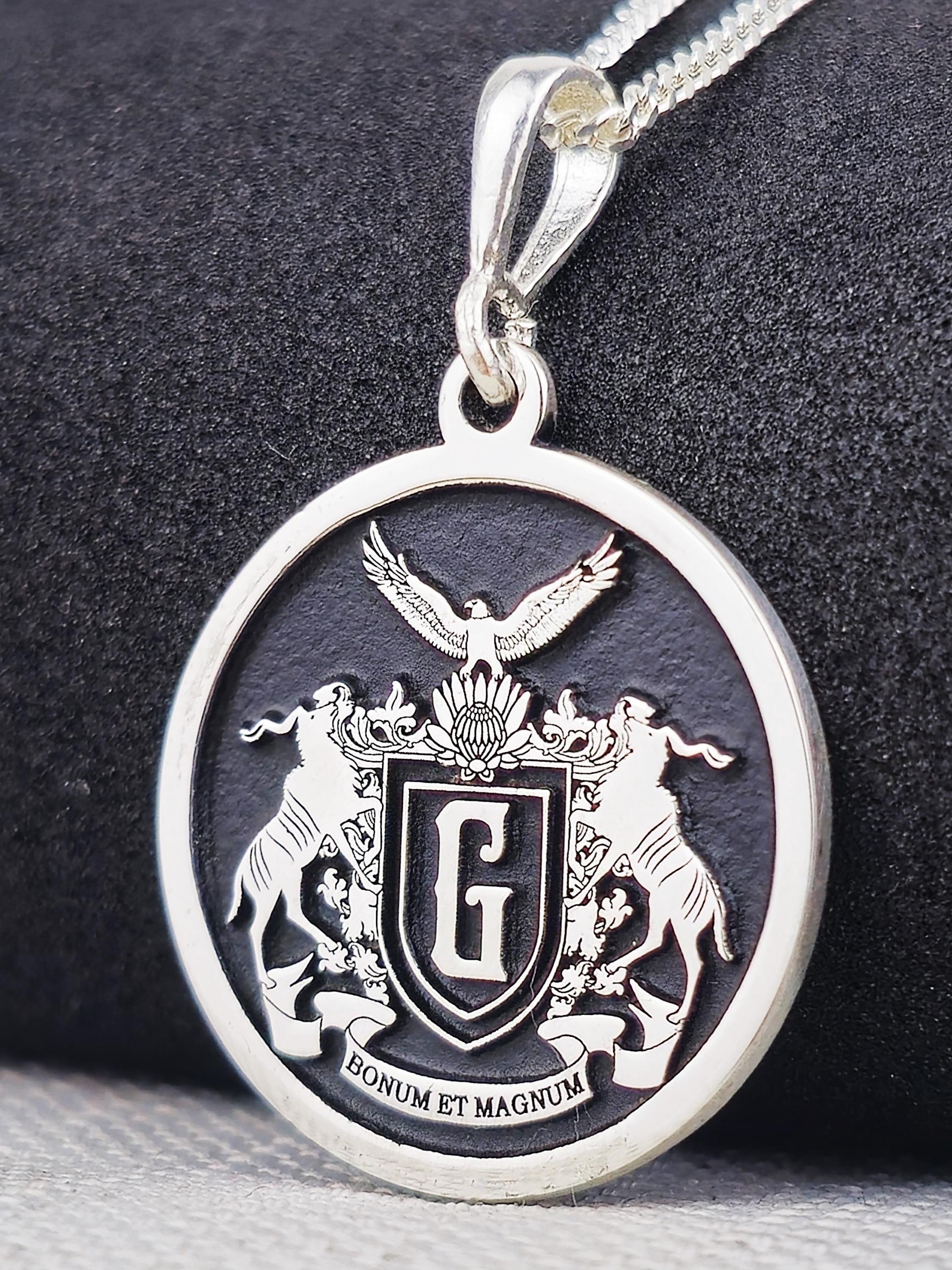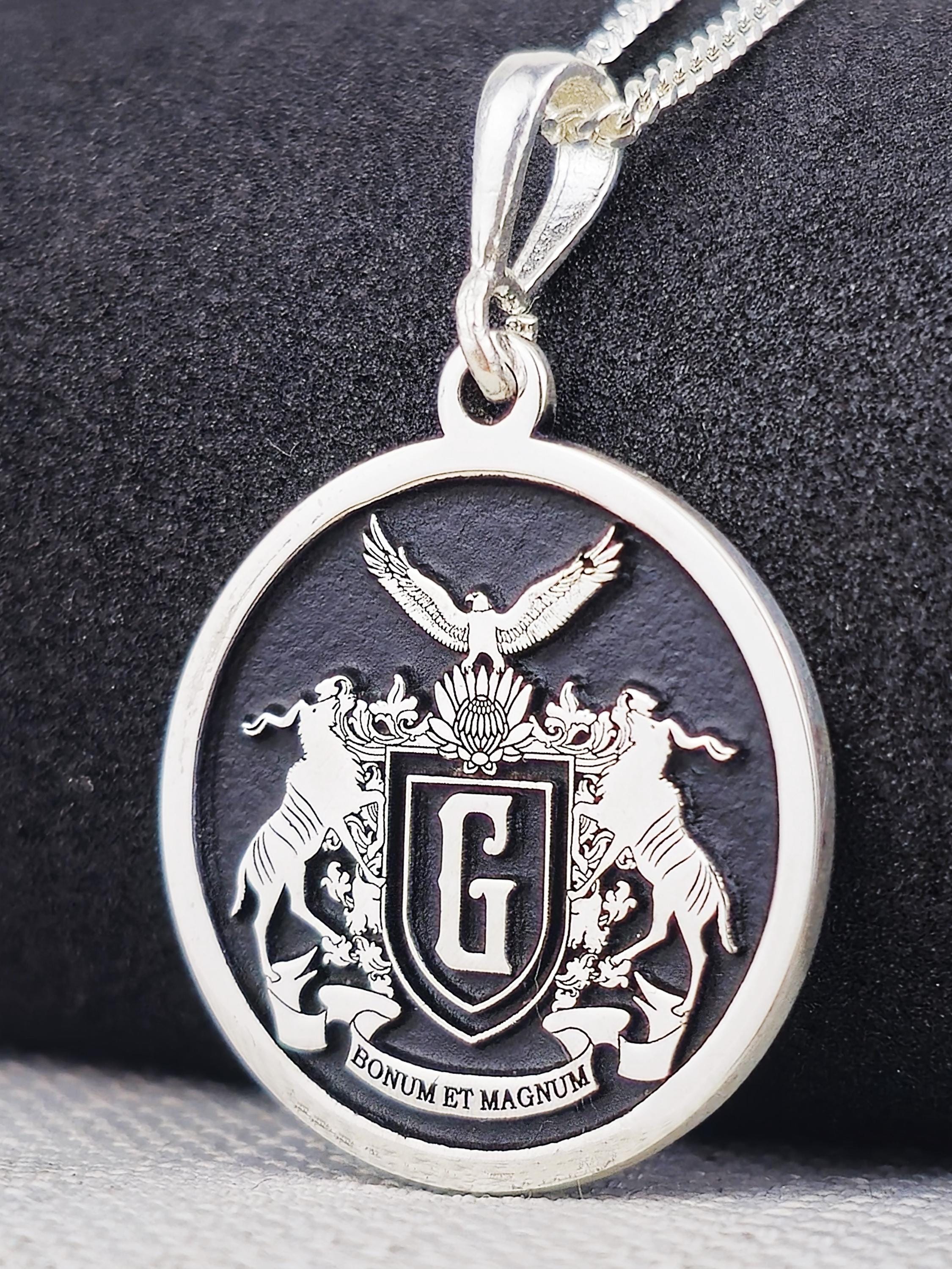 Celebrate your family’s rich history with this exquisite custom family crest necklace, made from 925 sterling silver. The round pendant showcases your family’s coat of arms in intricate detail, along with the Latin inscription "Bonum et Magnum," symbolizing goodness and greatness. This necklace is a meaningful piece of jewelry that honors family heritage and tradition, making it the perfect heirloom to pass down through generations.