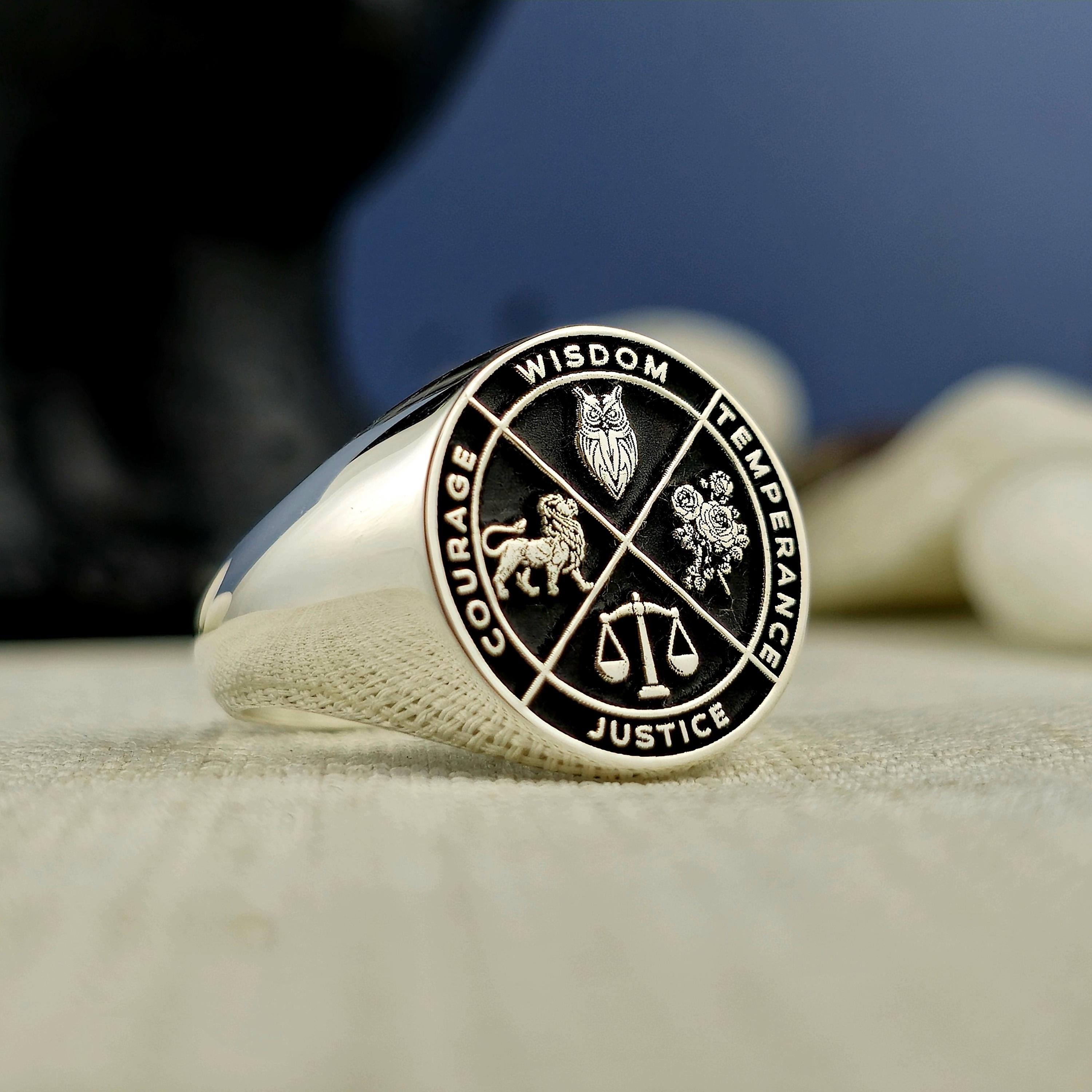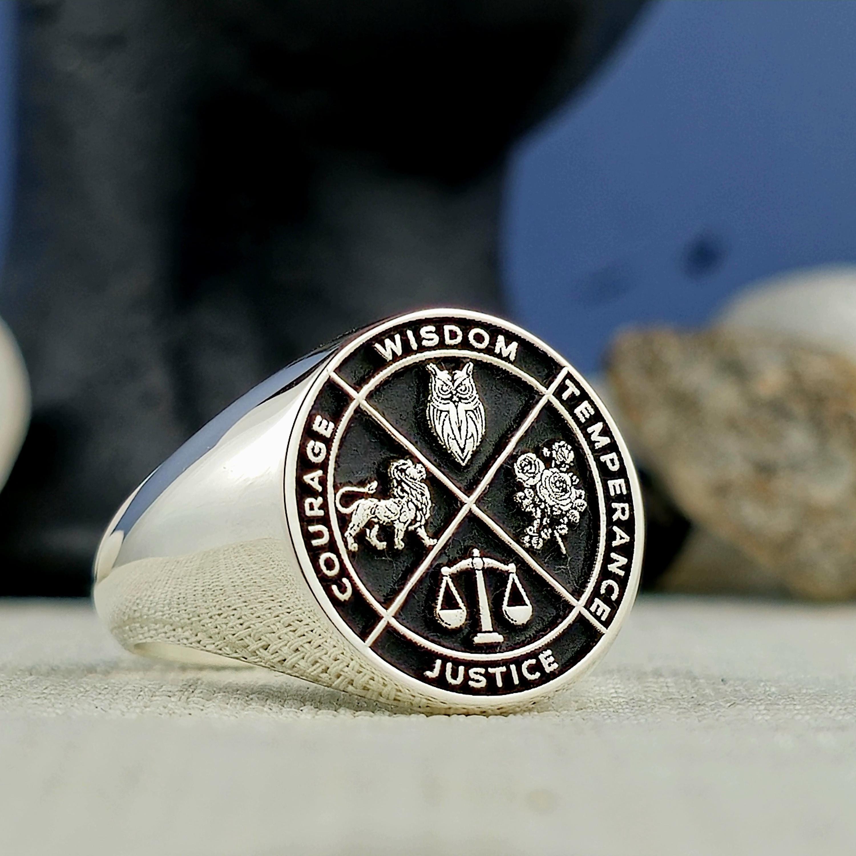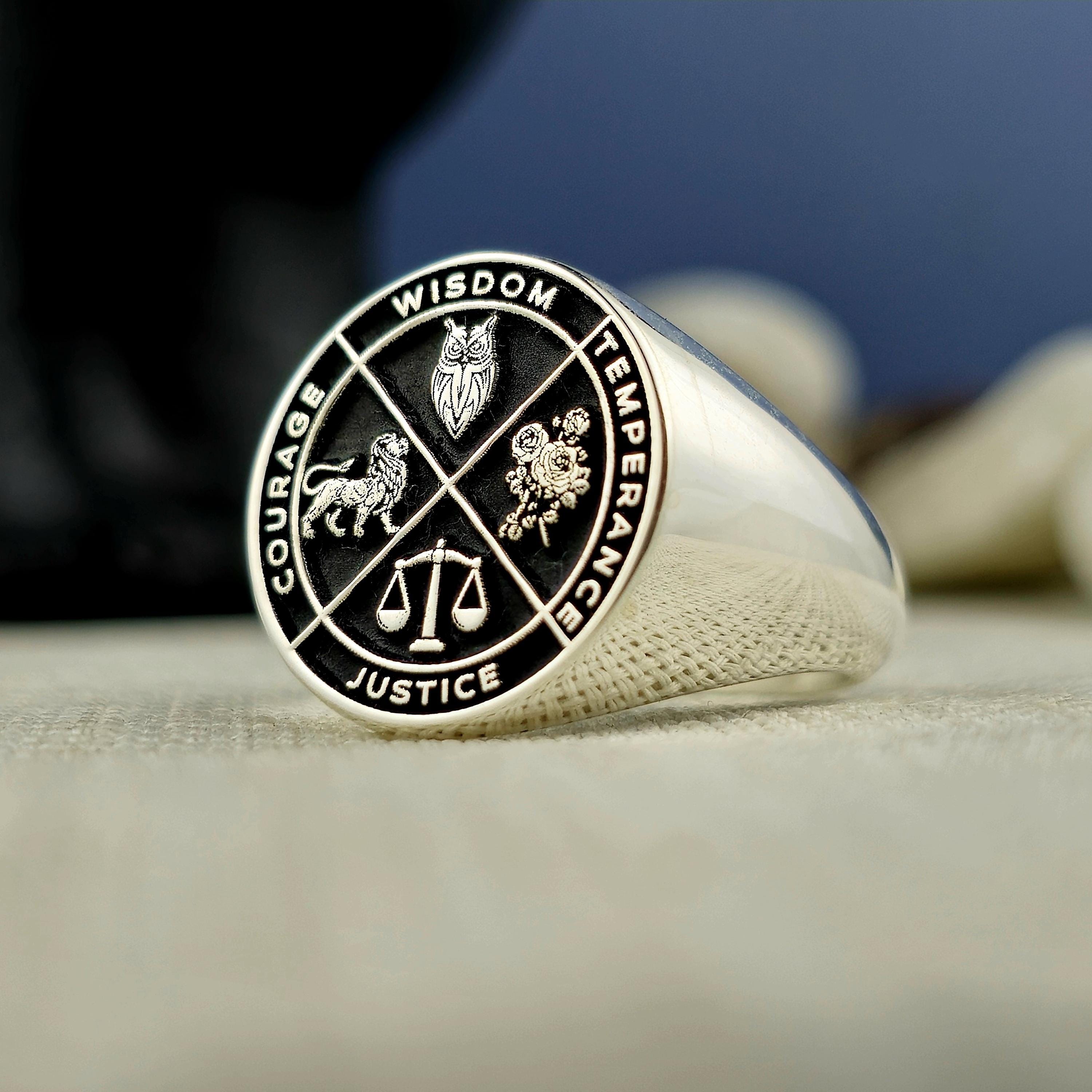 Wisdom Signet Ring: Courage, Temperance, Justice - Sterling Silver or Gold Plated