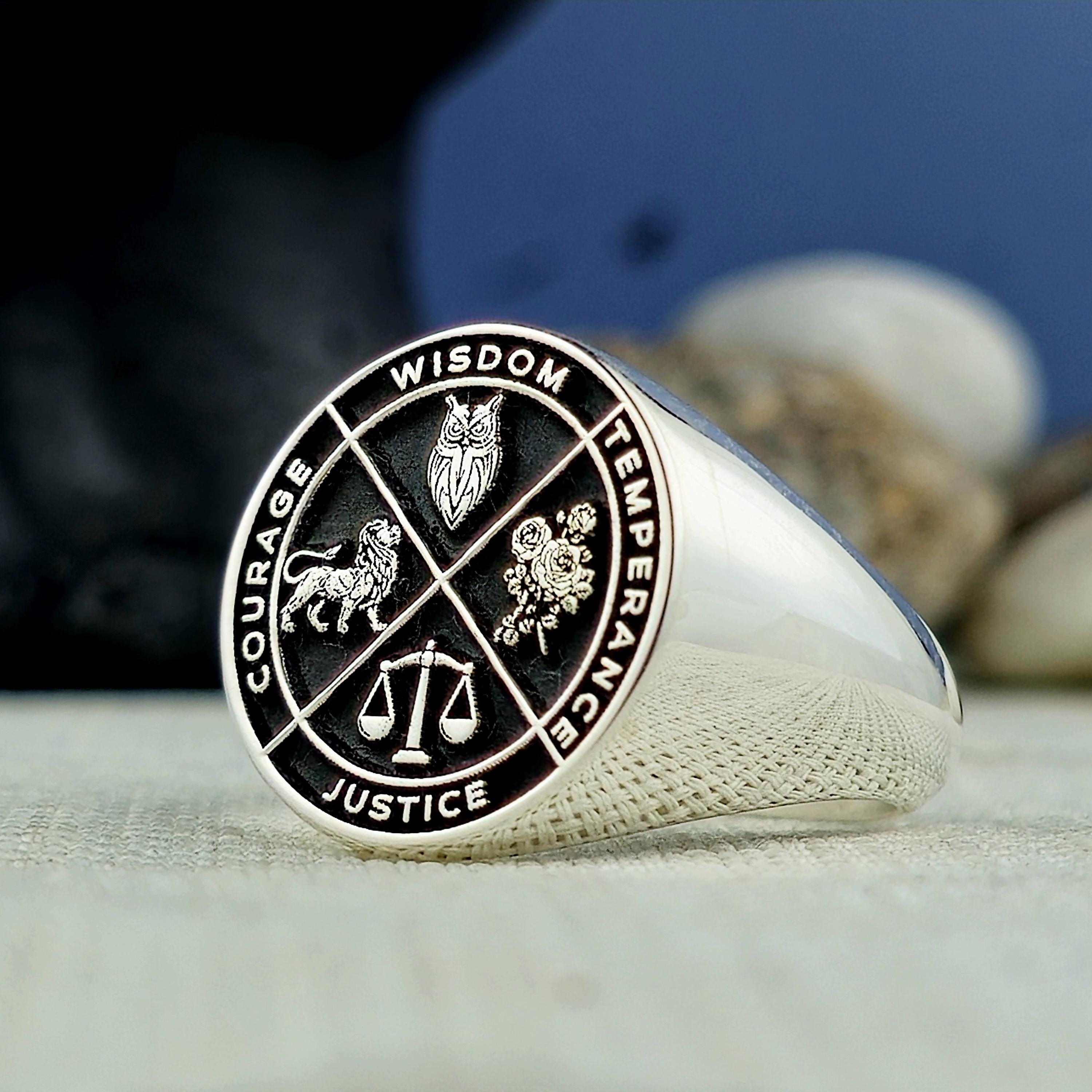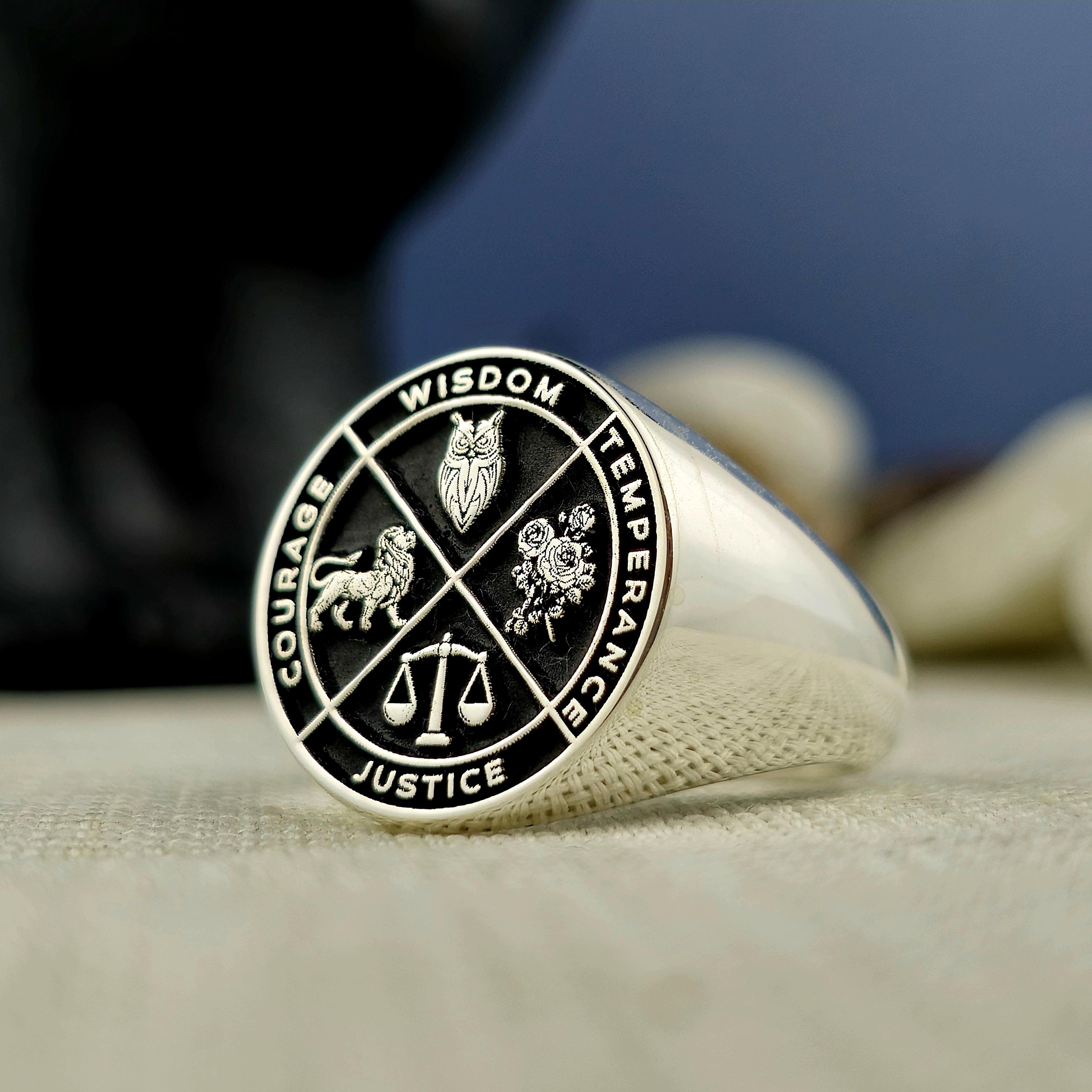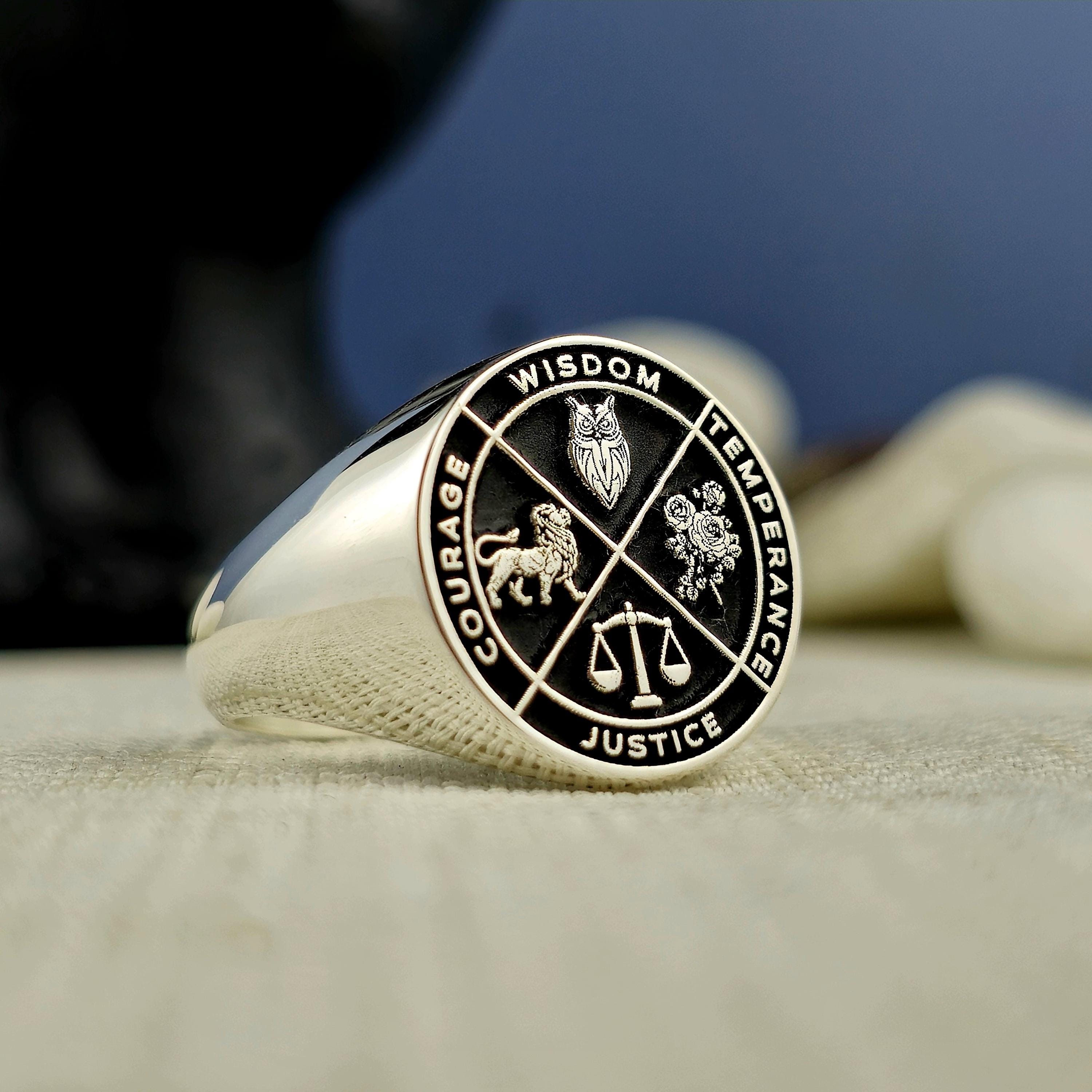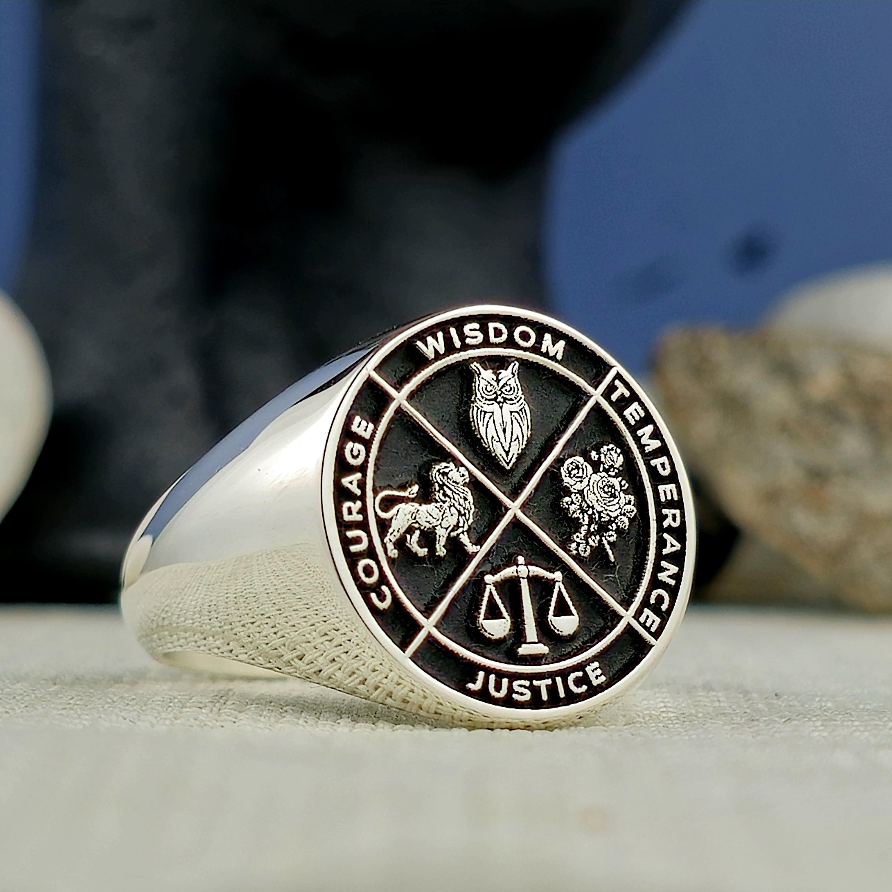 Wisdom Signet Ring: Courage, Temperance, Justice - Sterling Silver or Gold Plated