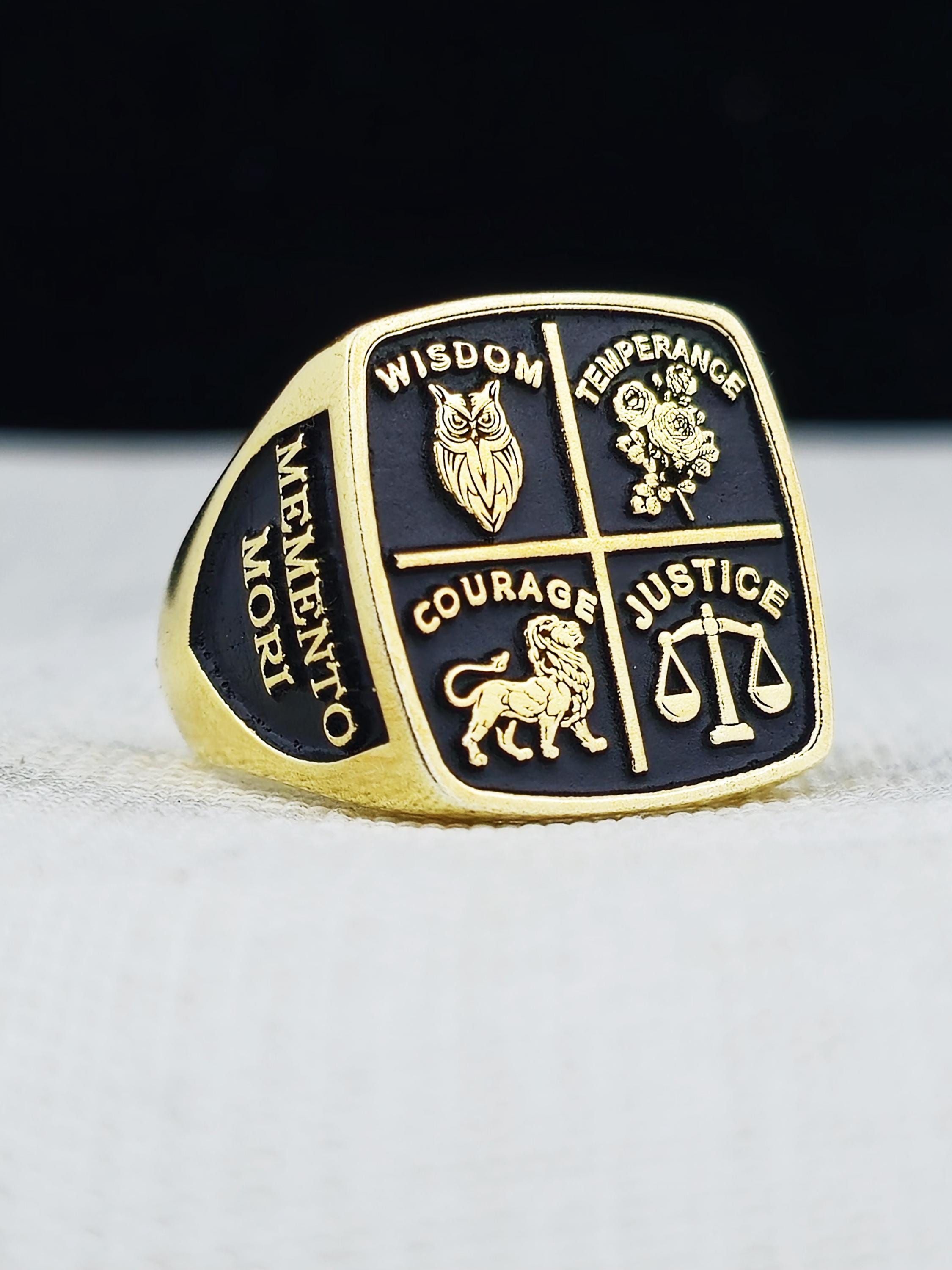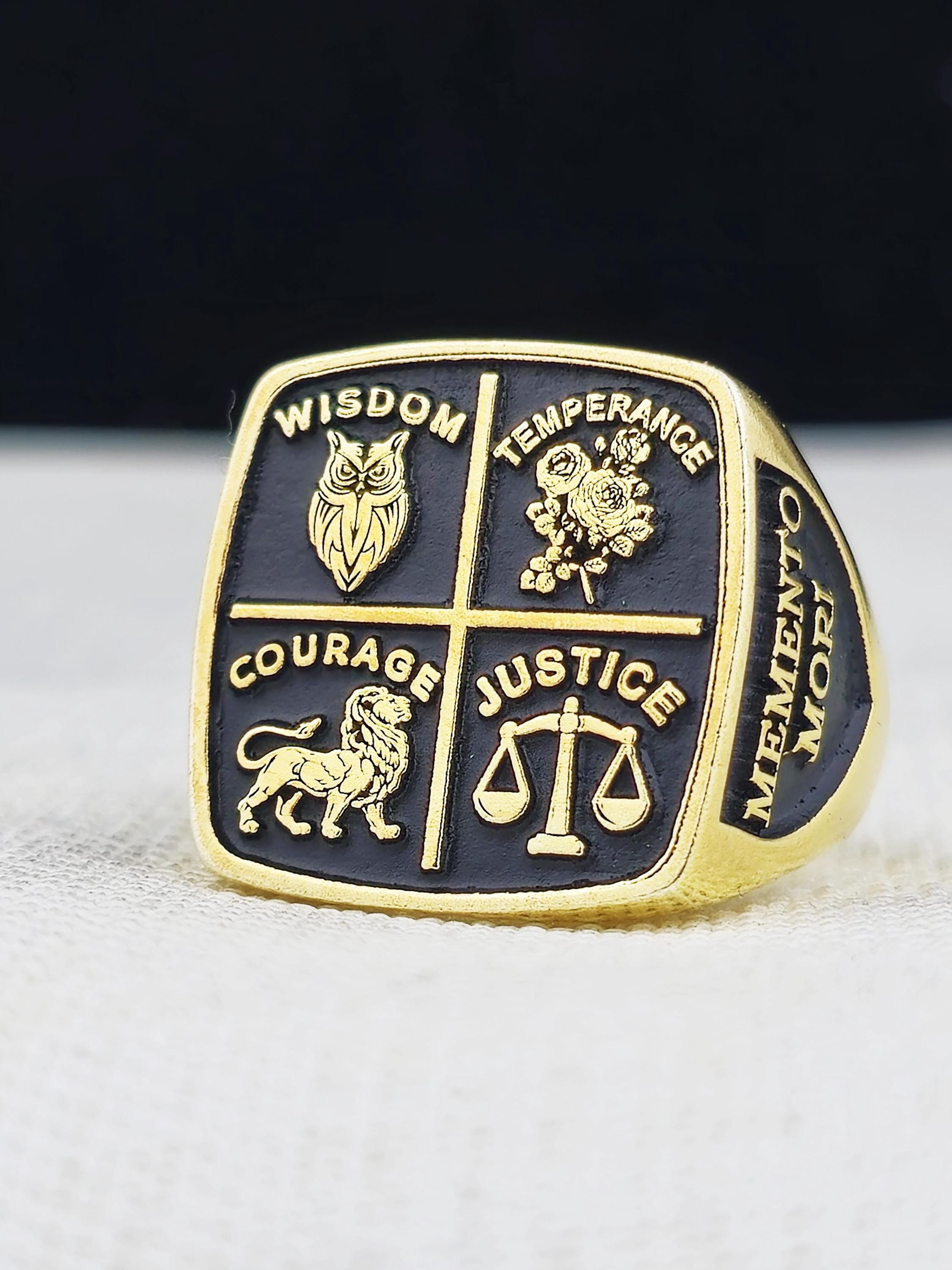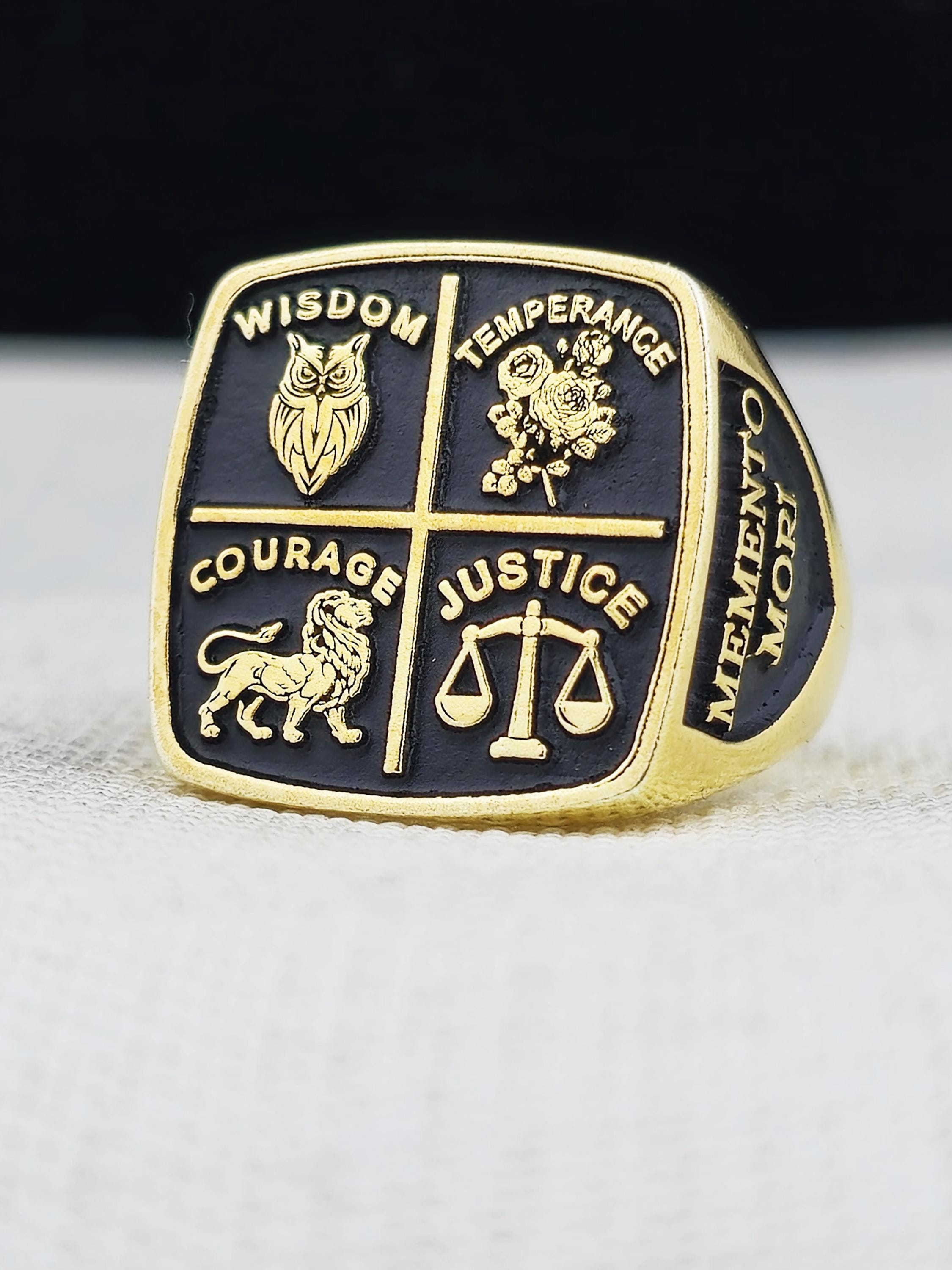 This stunning gold-plated wisdom-themed signet ring is a powerful statement piece that blends timeless symbols with modern craftsmanship. Inspired by the virtues of Wisdom, Justice, Courage, and Temperance, this ring is perfect for those who cherish meaning in their accessories.