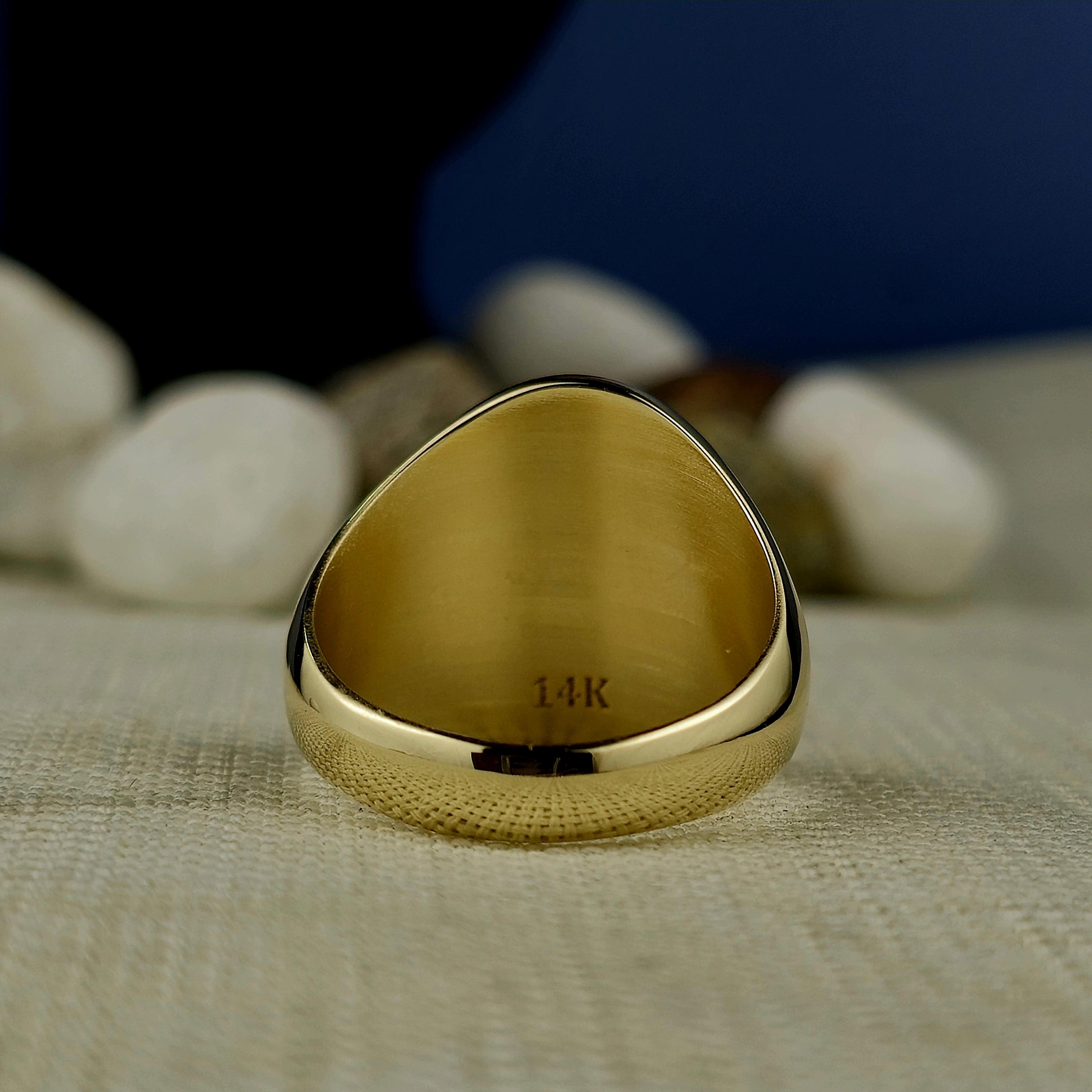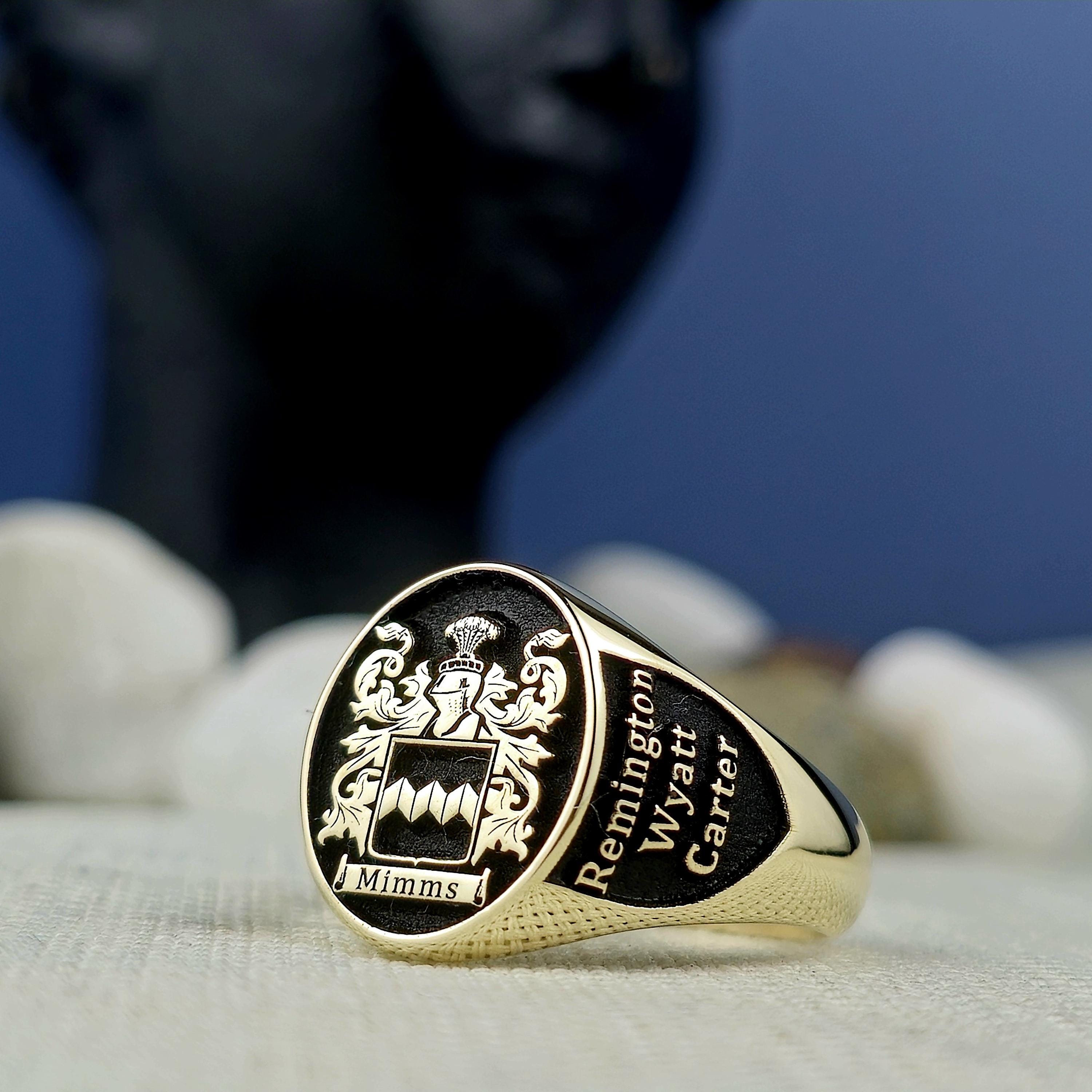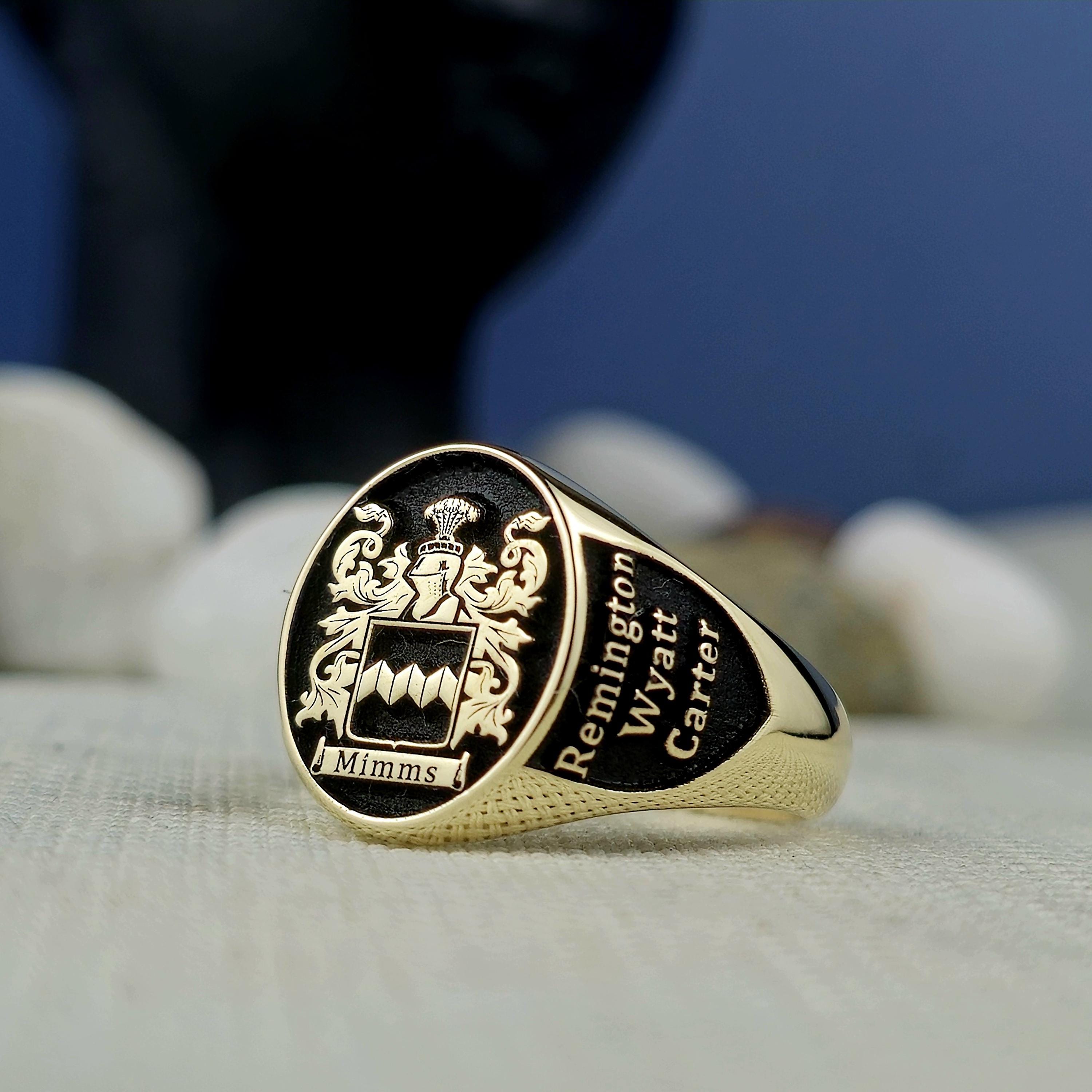 This signet ring features intricate detailing of your custom family crest, engraved with precision on the front face. The oval-shaped ring face brings focus to the intricate coat of arms, ensuring that each design element is highlighted. The sides of the ring can be further personalized with meaningful engravings, such as initials, a special year, or symbols that carry significance for your family.