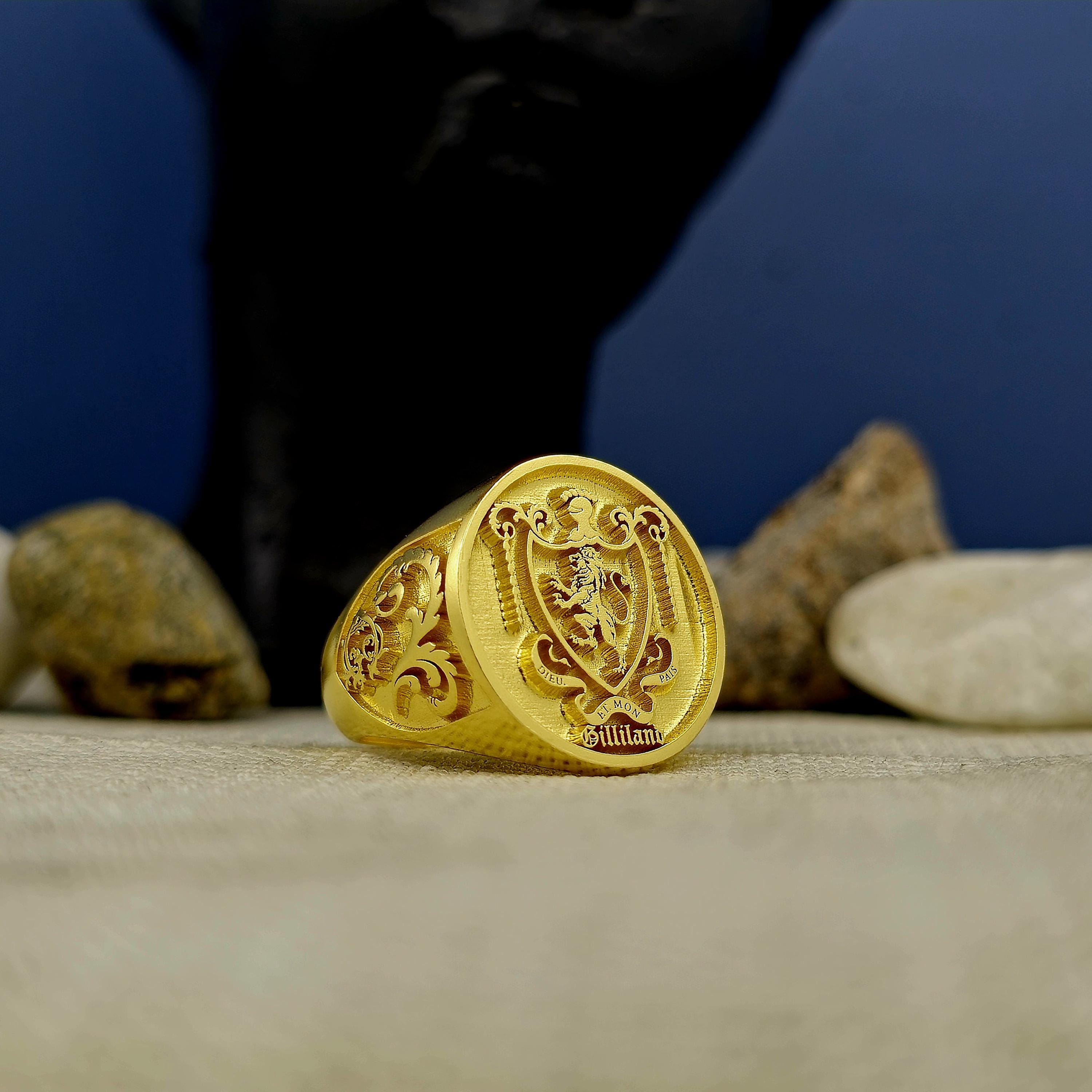 This signet ring features intricate detailing of your custom family crest, engraved with precision on the front face. The oval-shaped ring face brings focus to the intricate coat of arms, ensuring that each design element is highlighted. The sides of the ring can be further personalized with meaningful engravings, such as initials, a special year, or symbols that carry significance for your family.