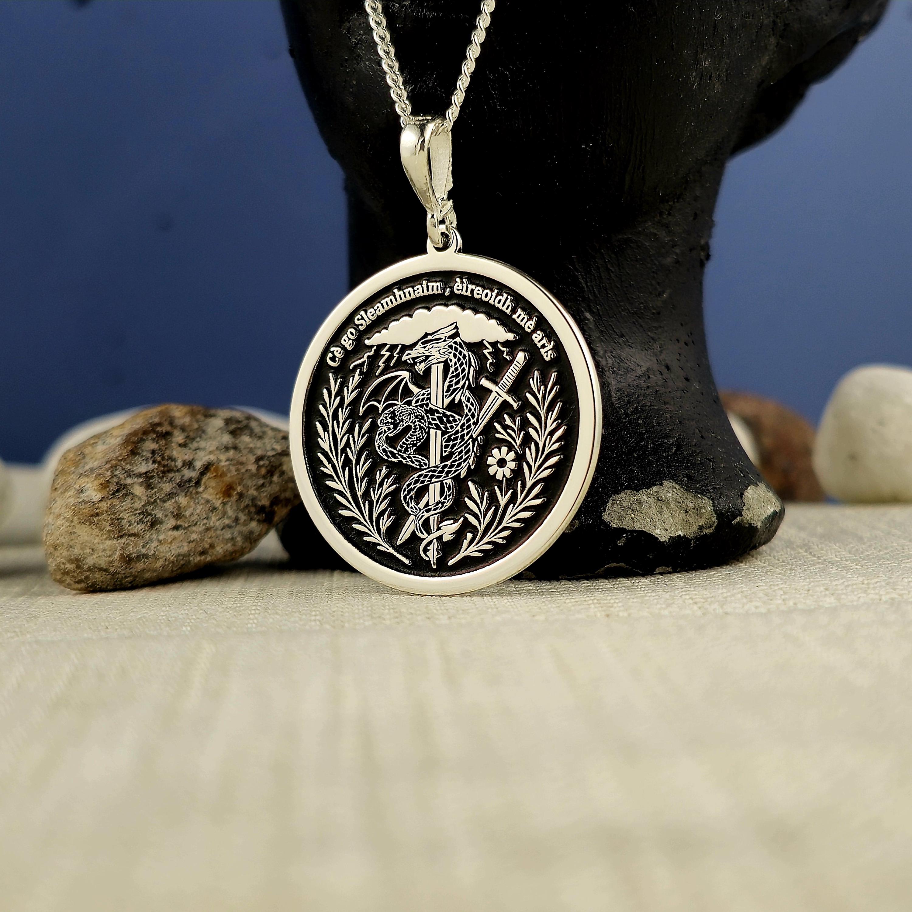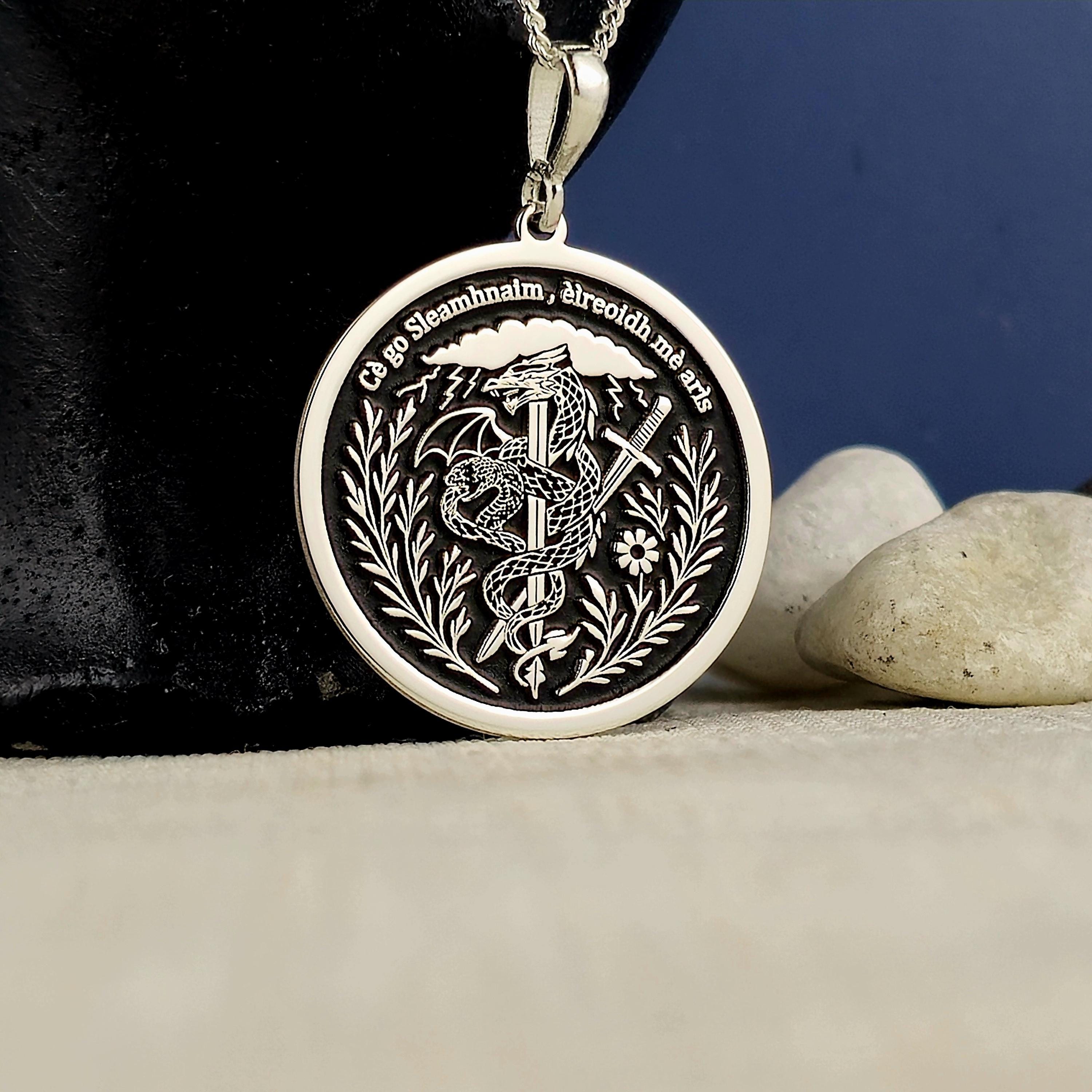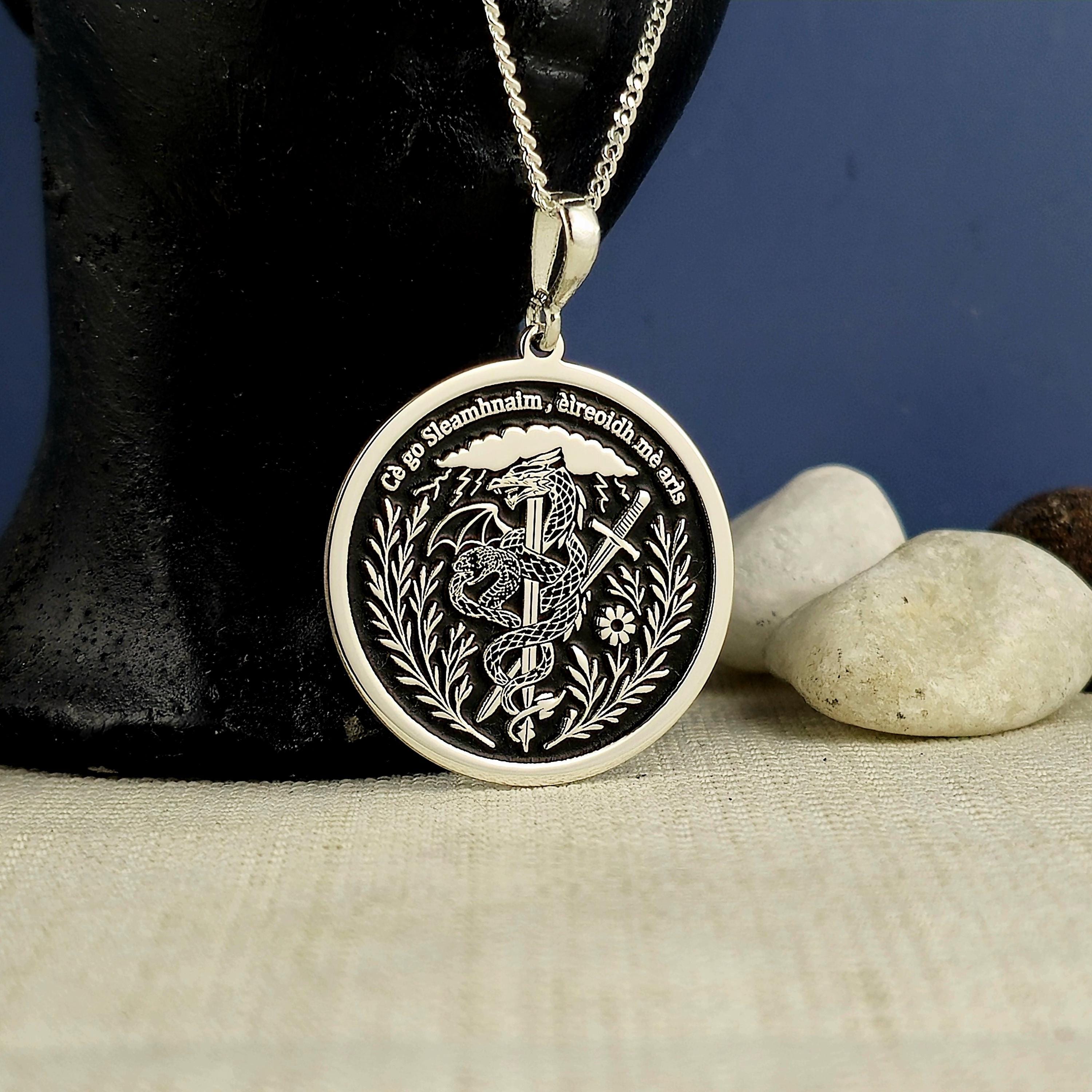 Sterling Silver Dragon Sword Pendant: Irish Motto Necklace