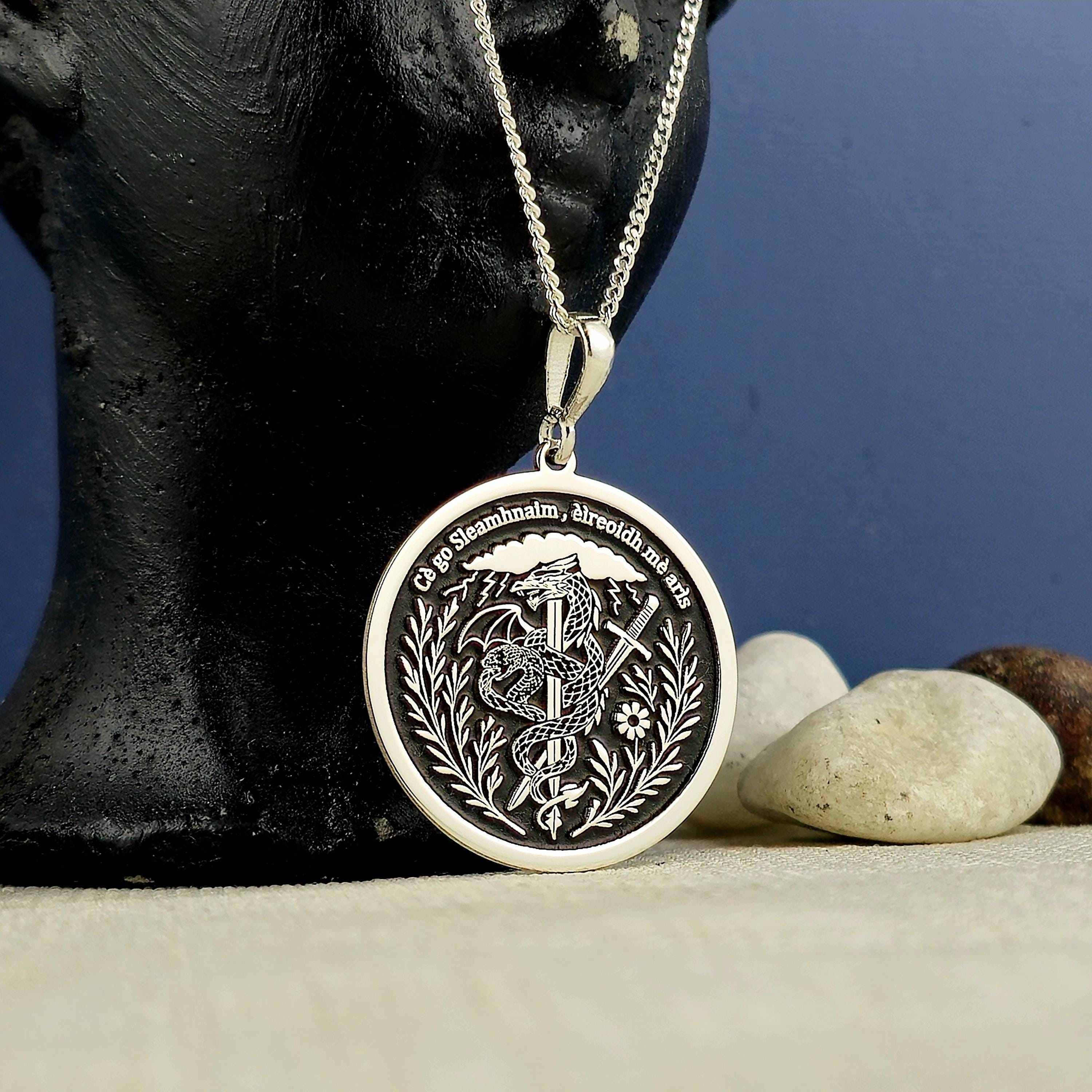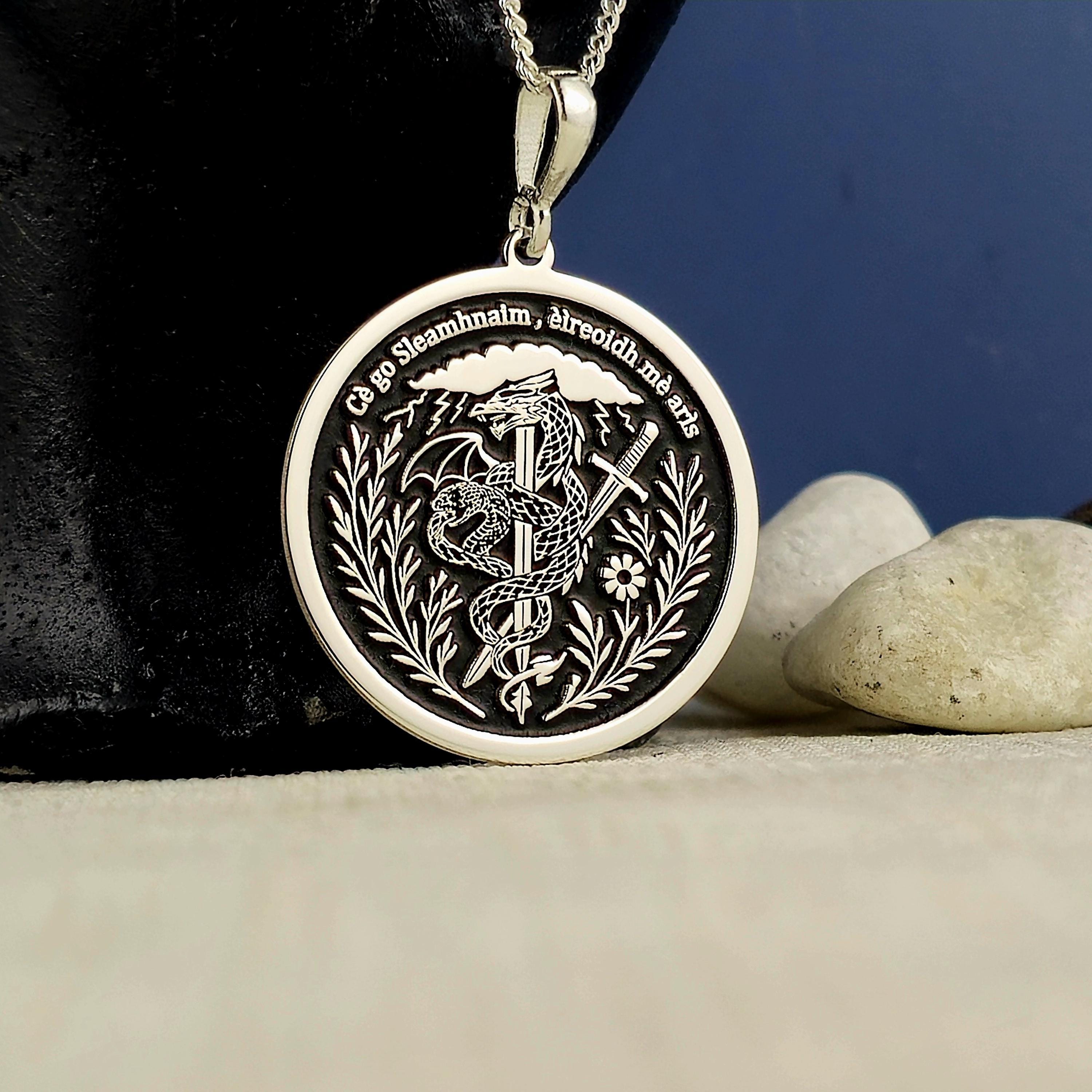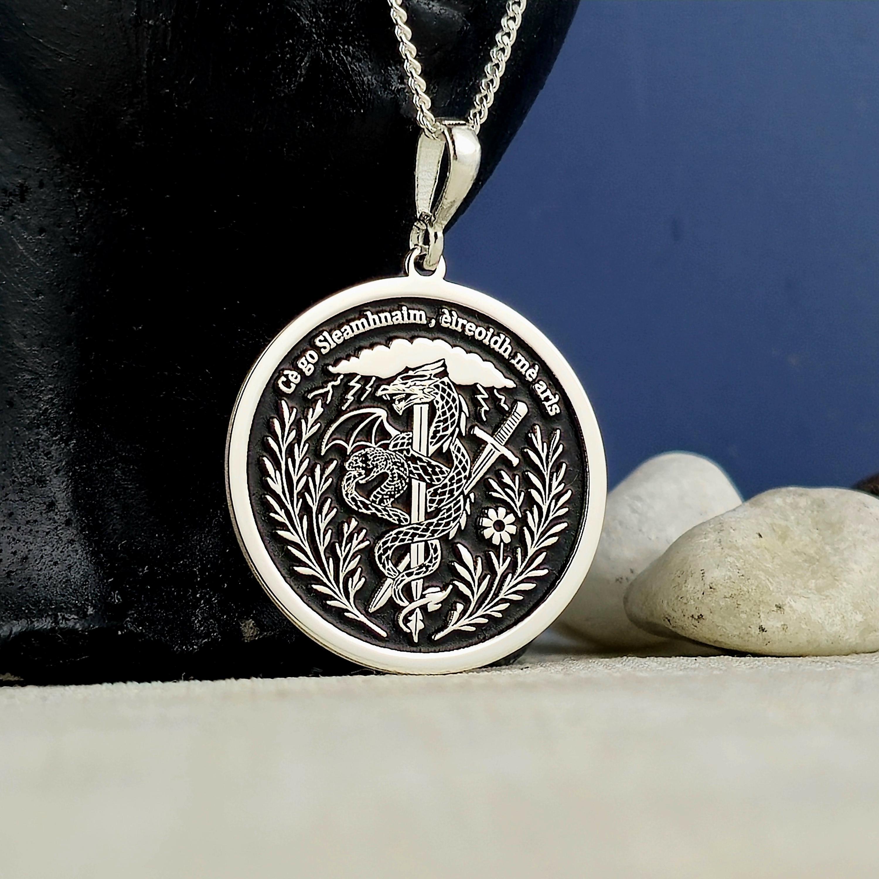 Sterling Silver Dragon Sword Pendant: Irish Motto Necklace