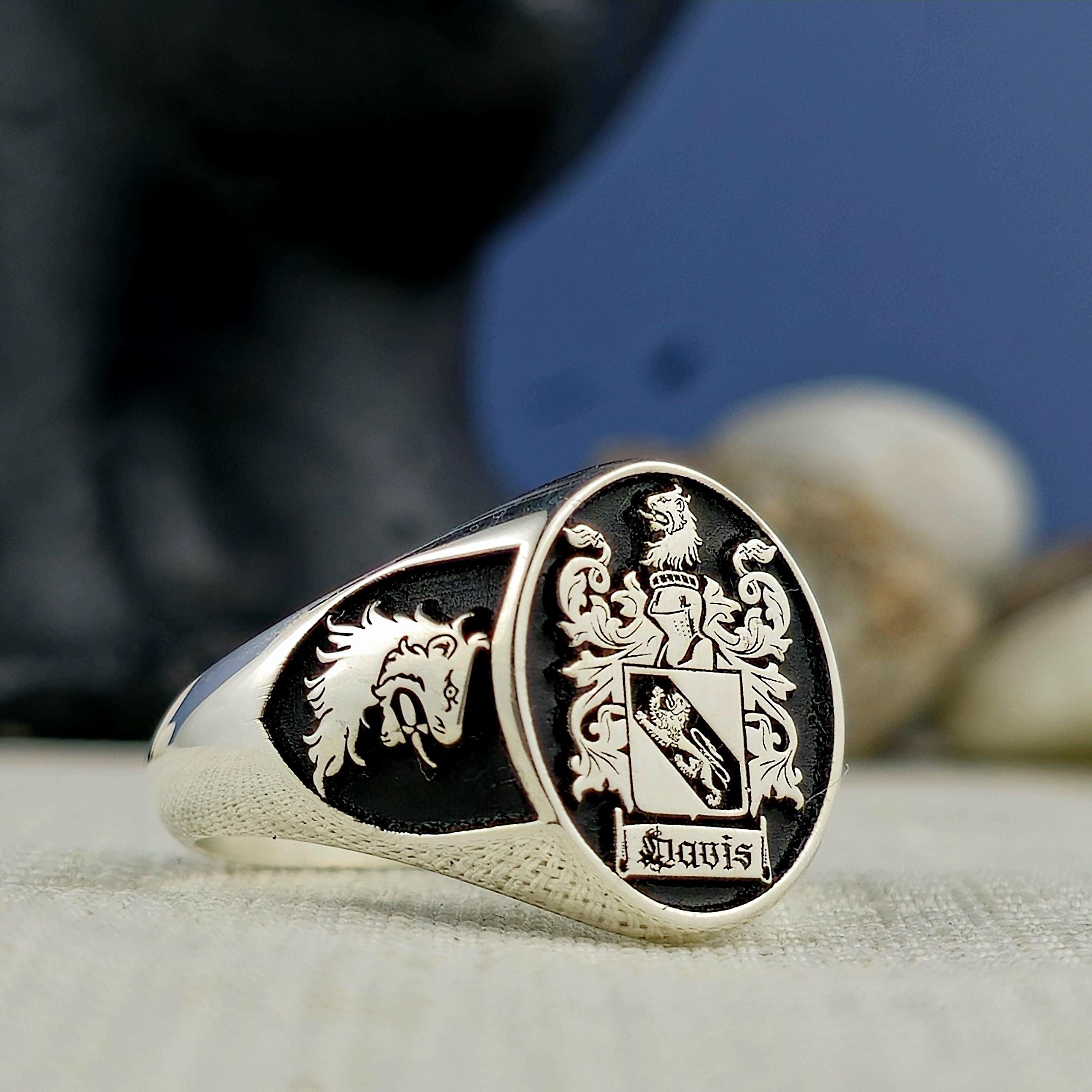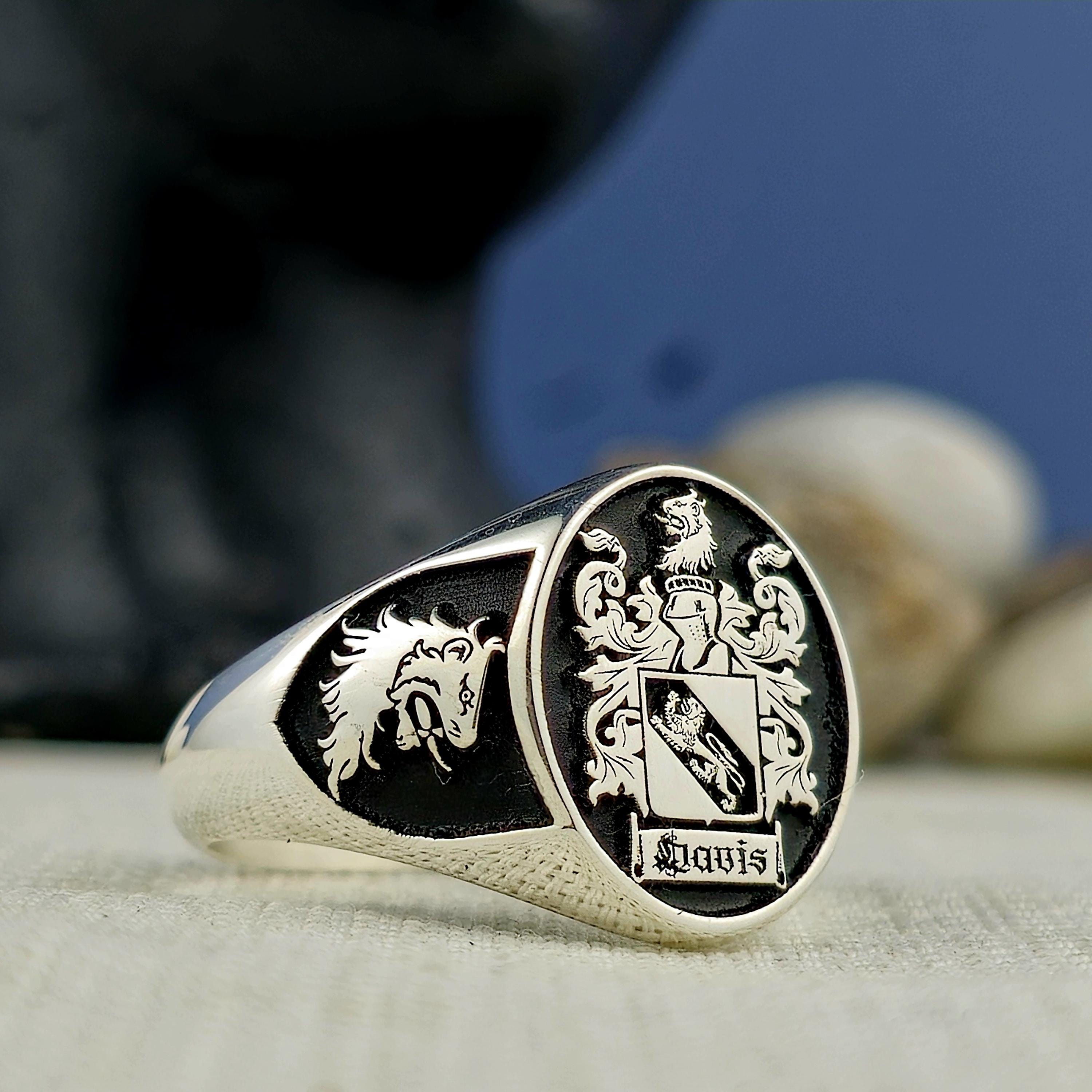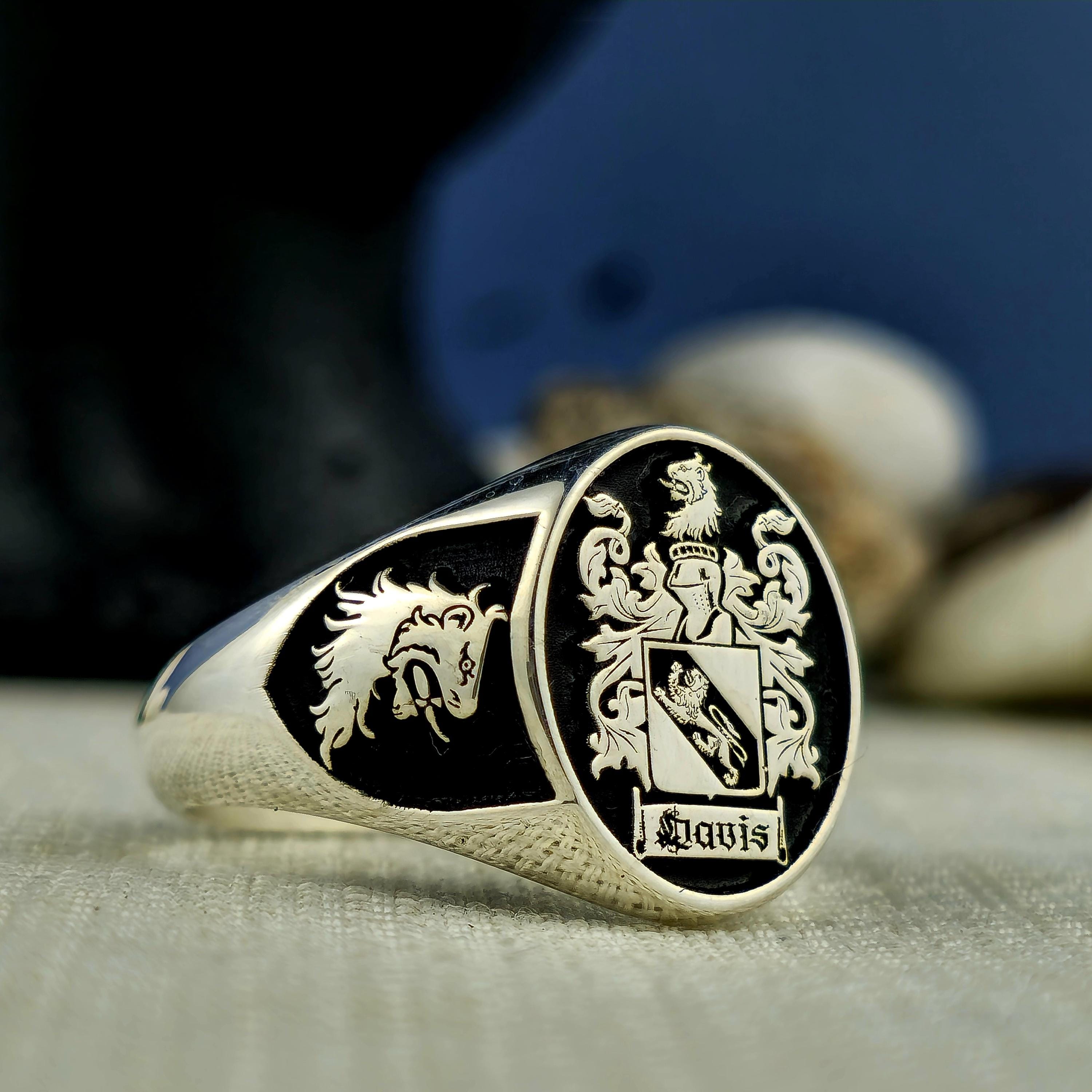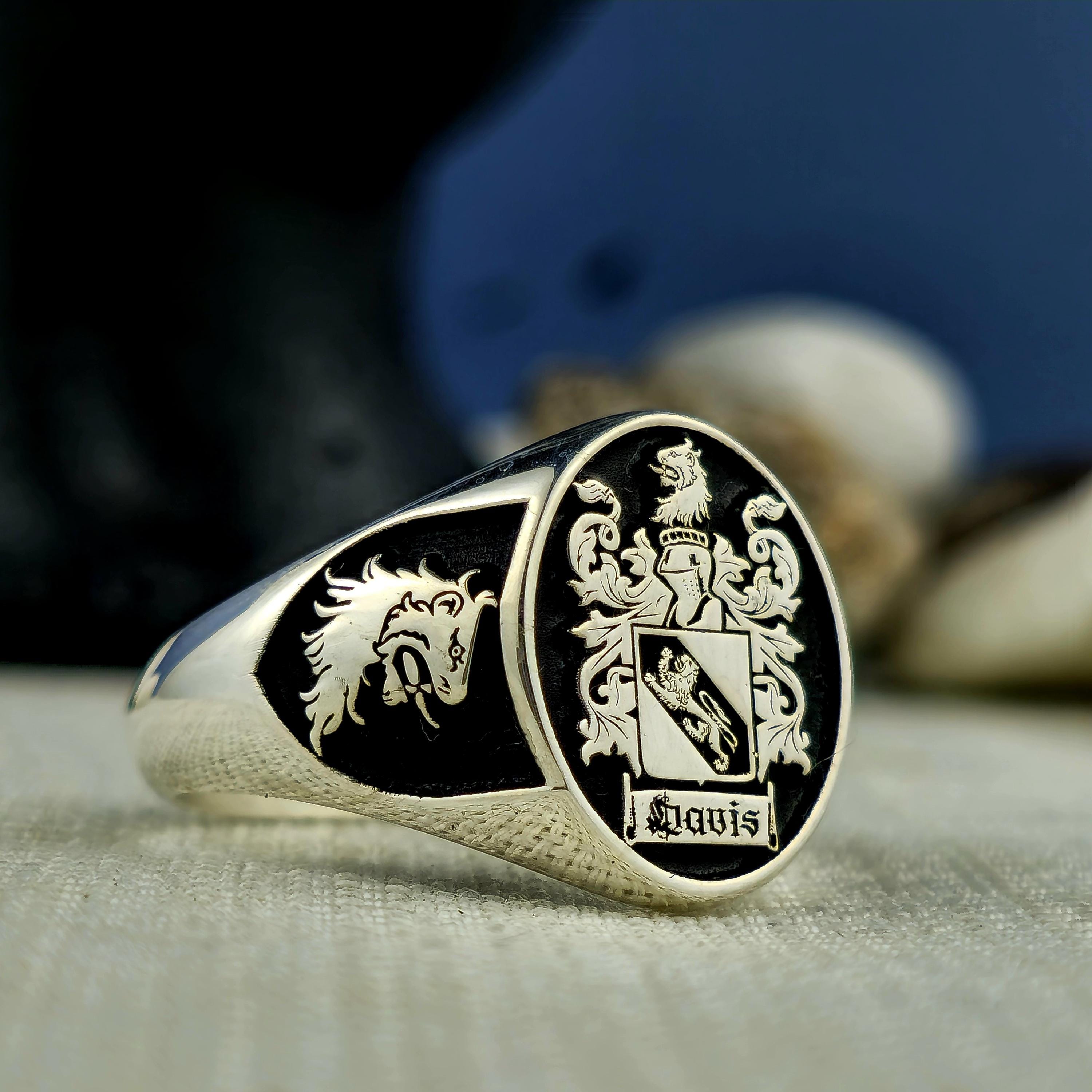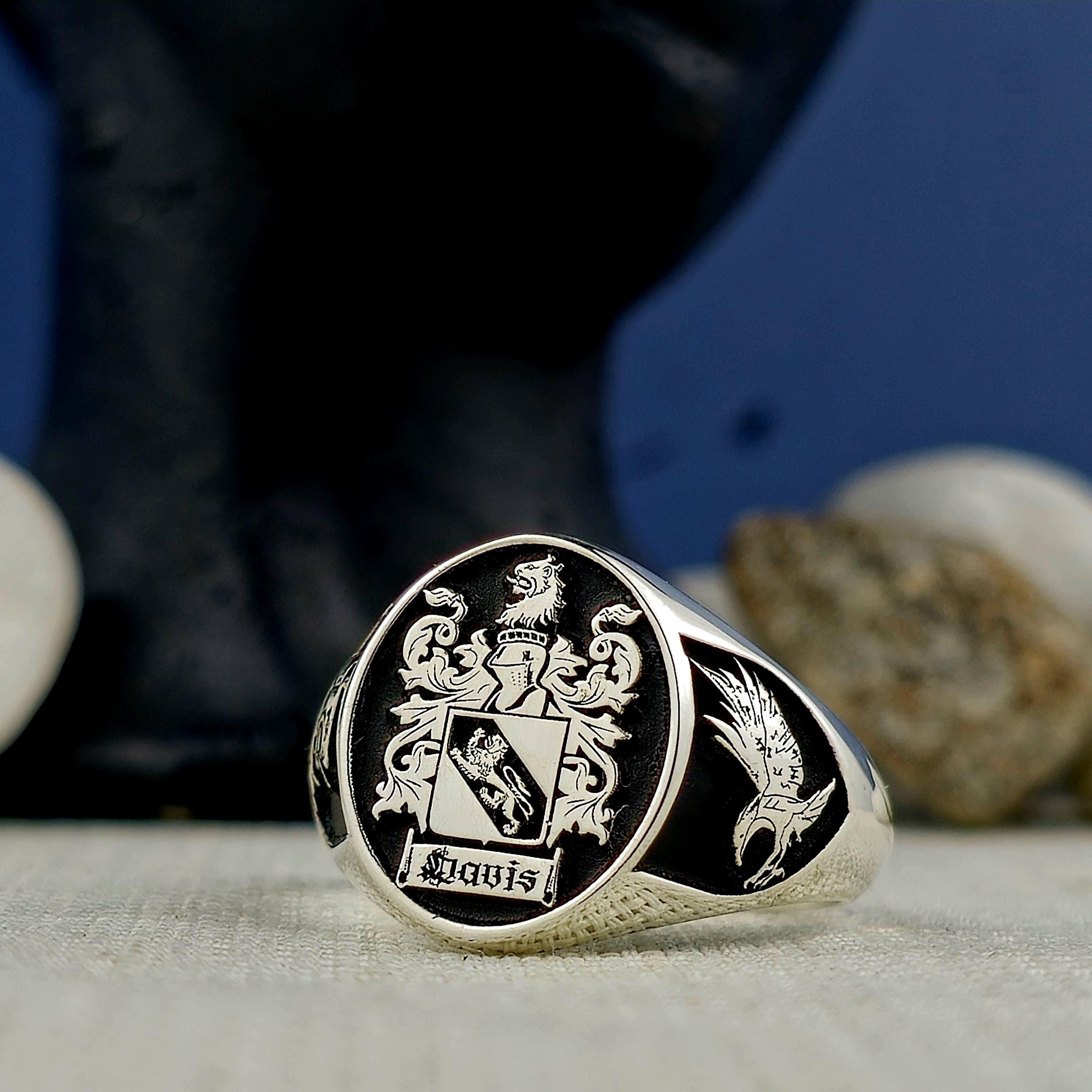 Custom Family Crest Signet Ring: Sterling Silver Black Enamel, Personalized Heraldic Jewelry