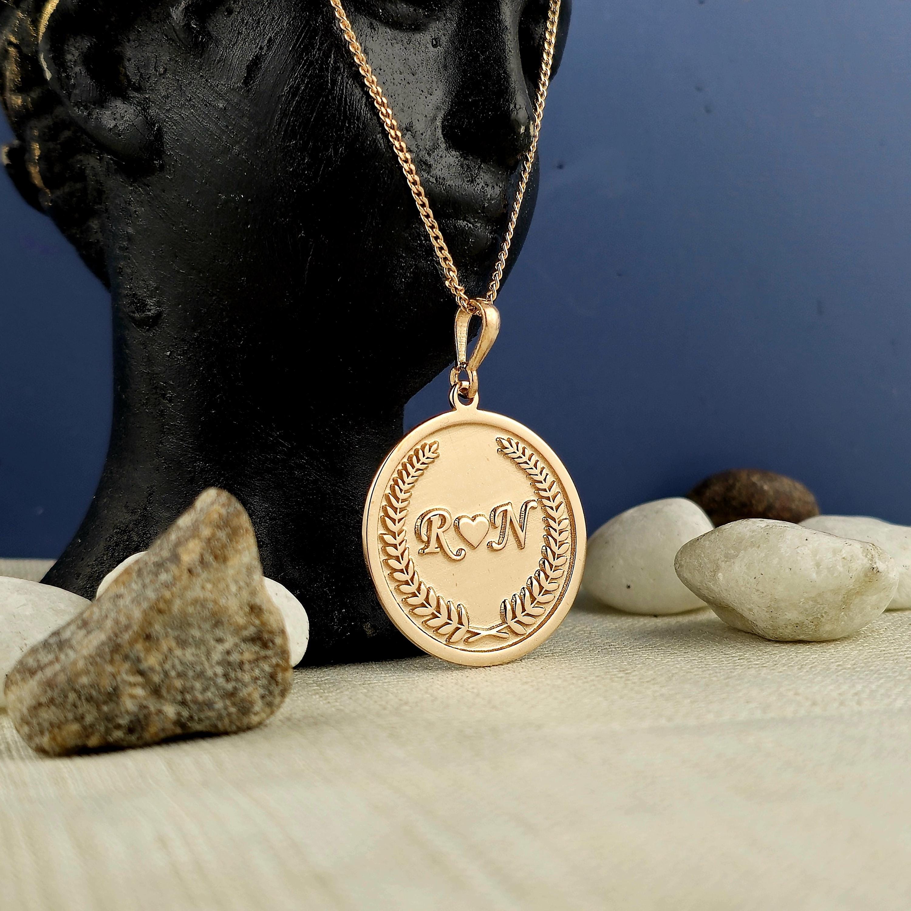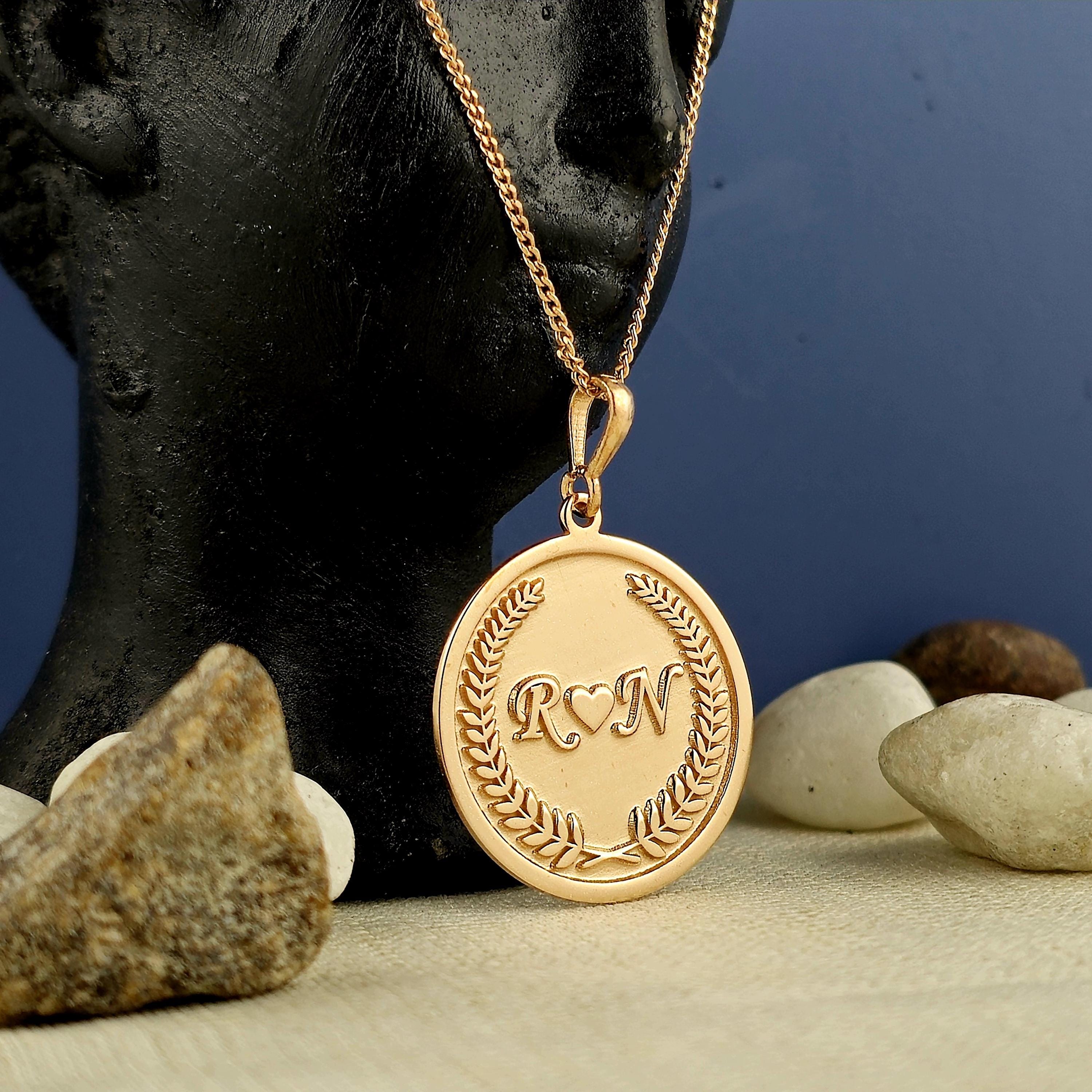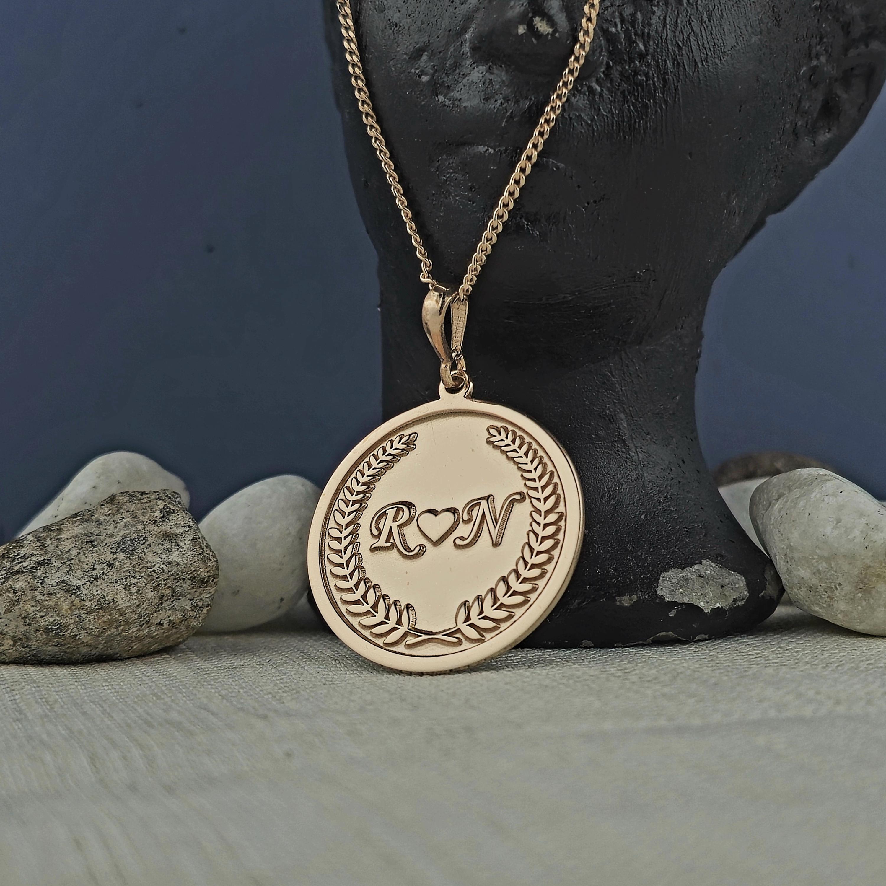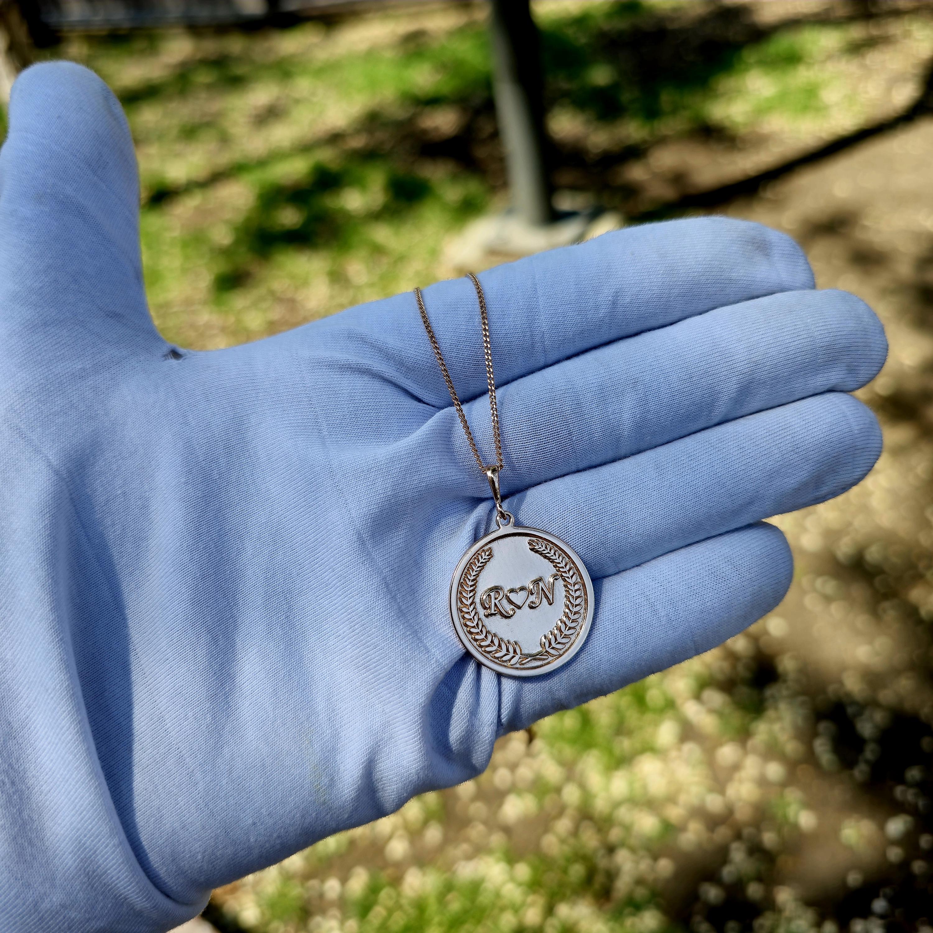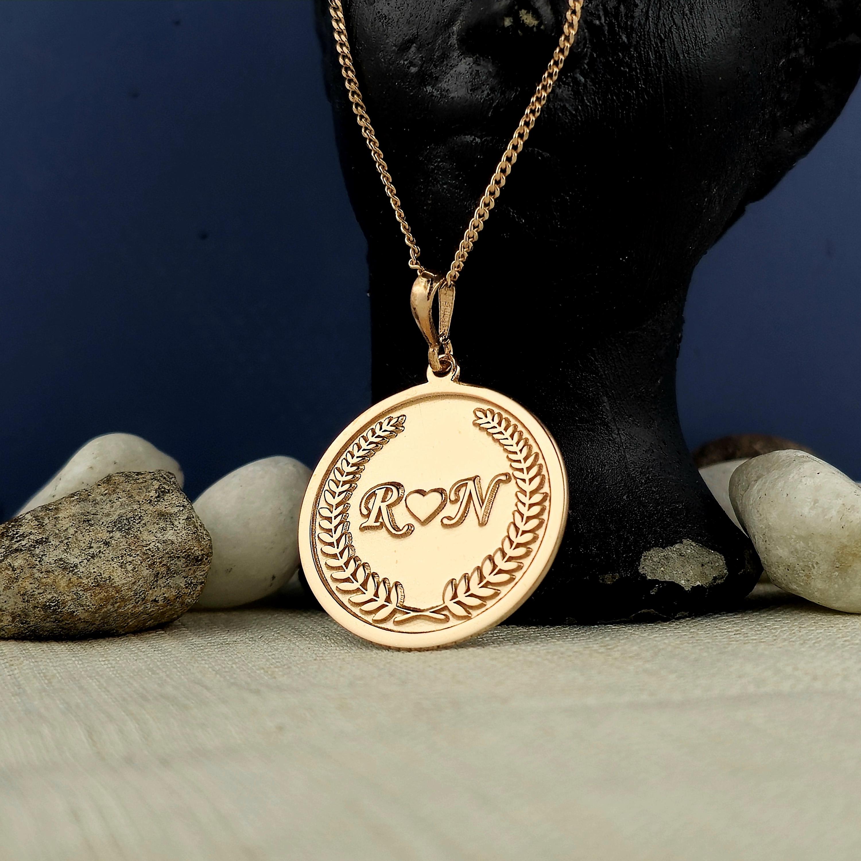 At the center of the round pendant lie two finely engraved initials, separated by a minimalist heart symbolβrepresenting unity, affection, and lasting connection. Surrounding them is a laurel wreath engraving, a timeless emblem of loyalty, achievement, and honor. This classic motif elevates the emotional power of the piece, making it not only a gift but a celebration of loveβs endurance.