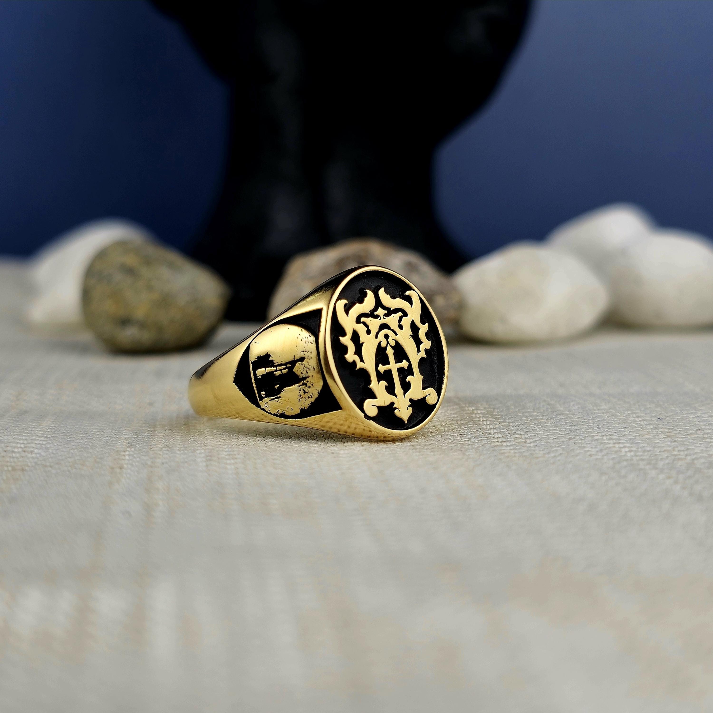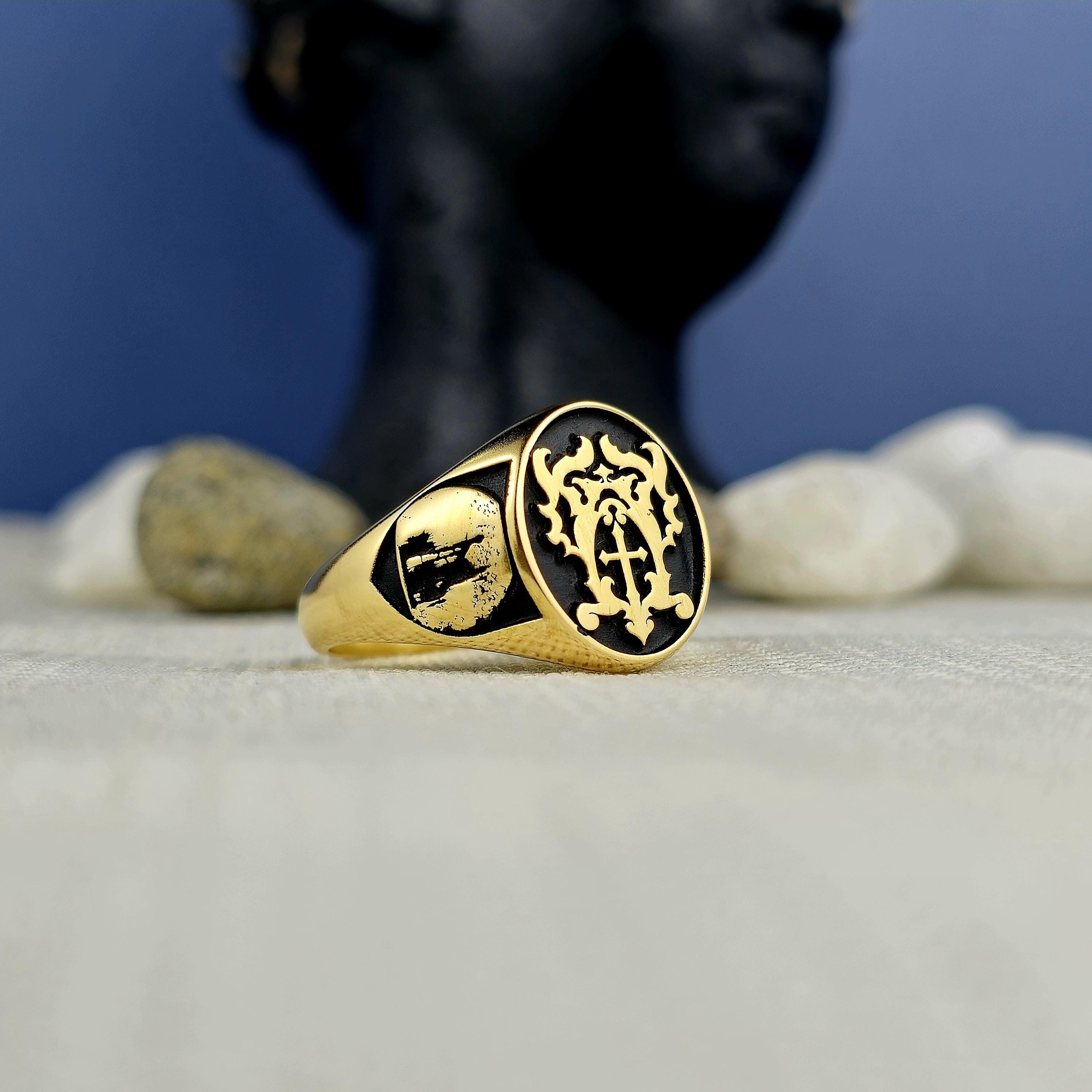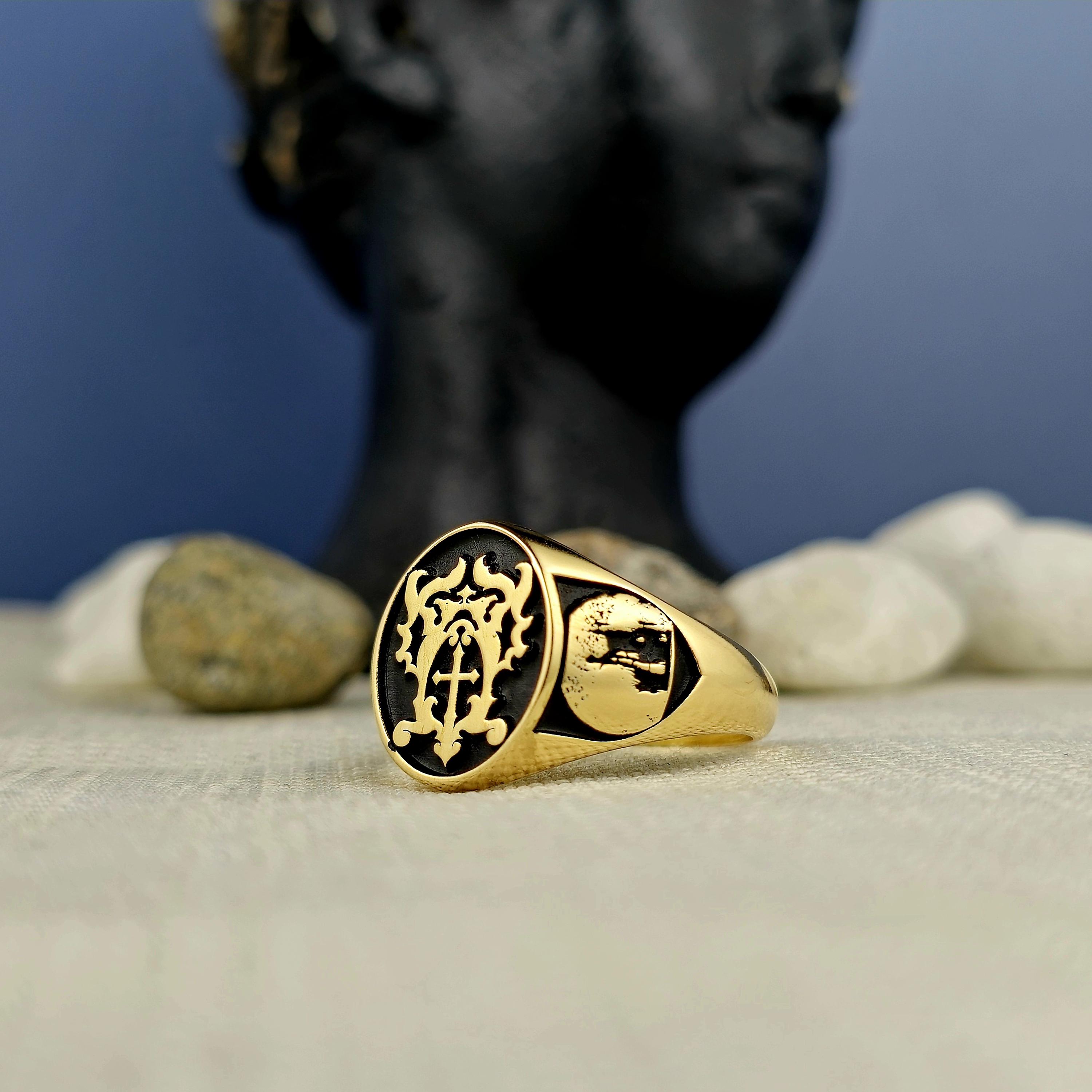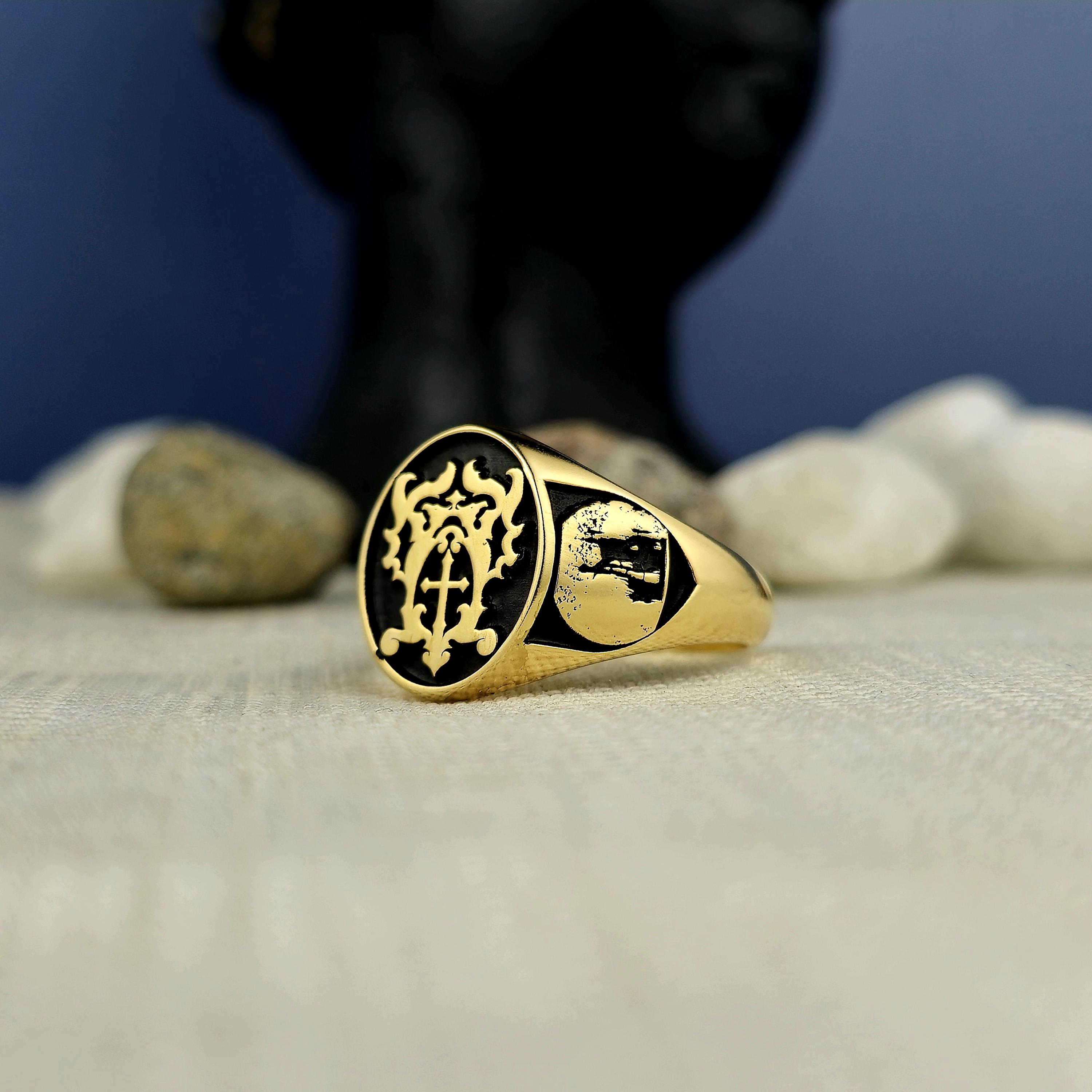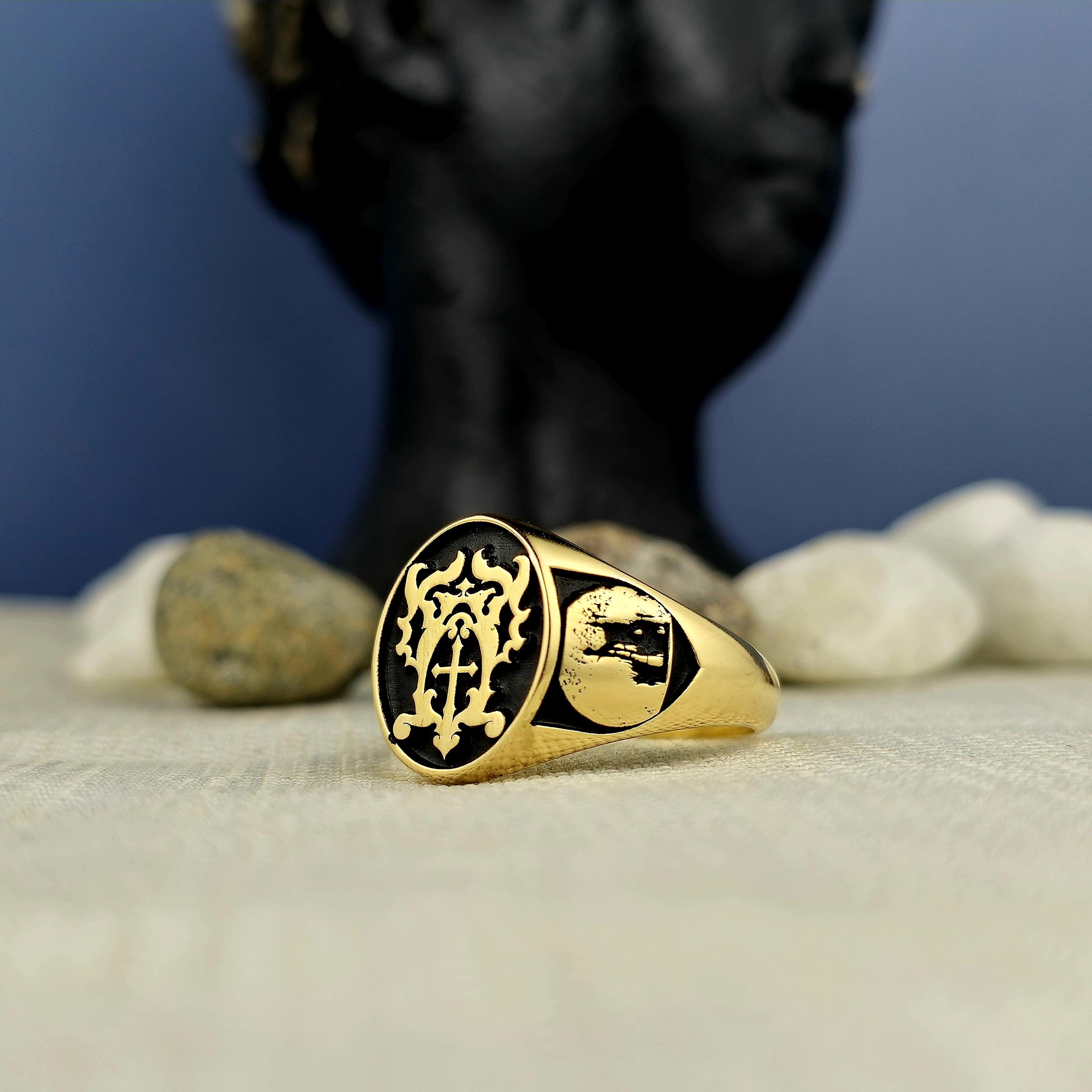 Personalized Silver Signet Ring: Cross & Gothic Symbol Engraved