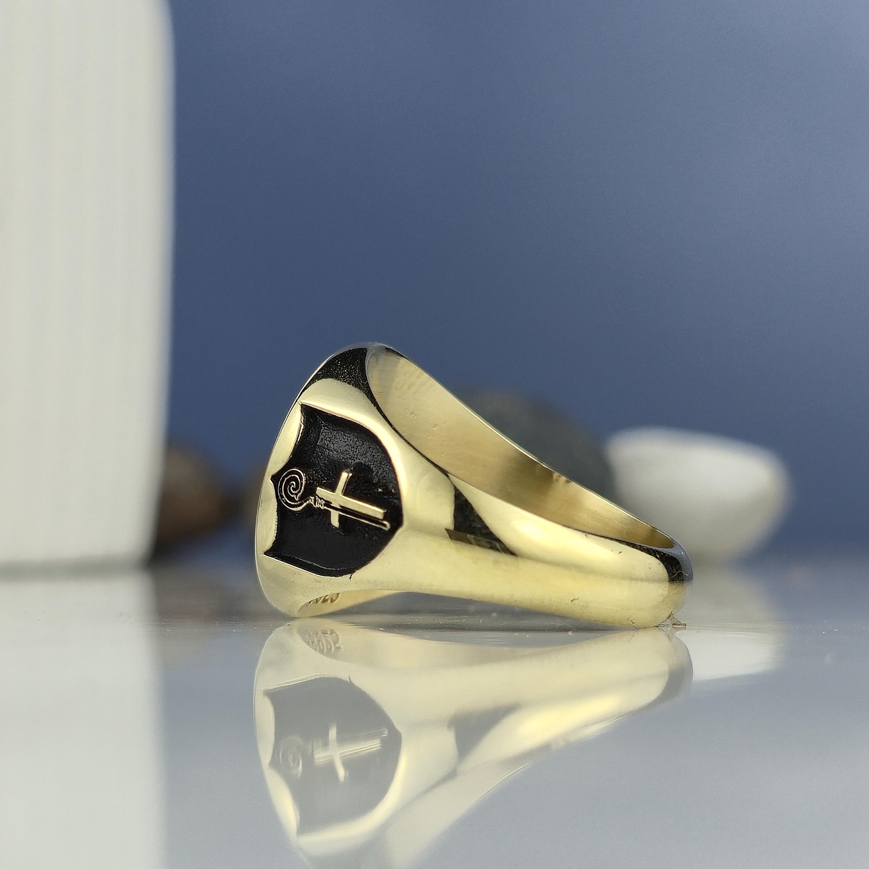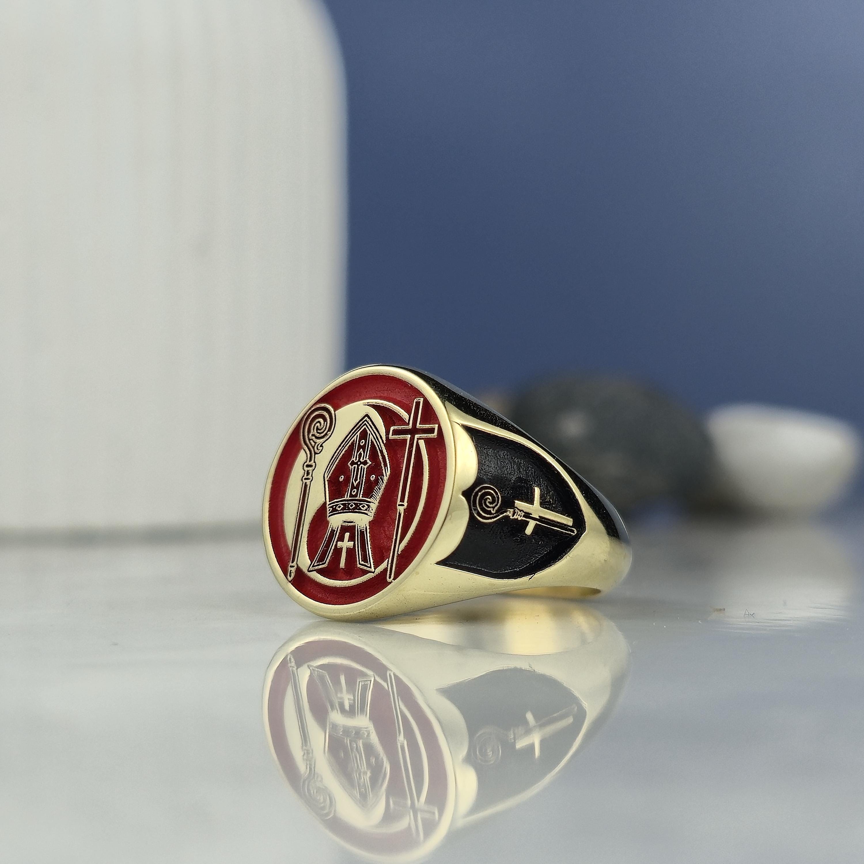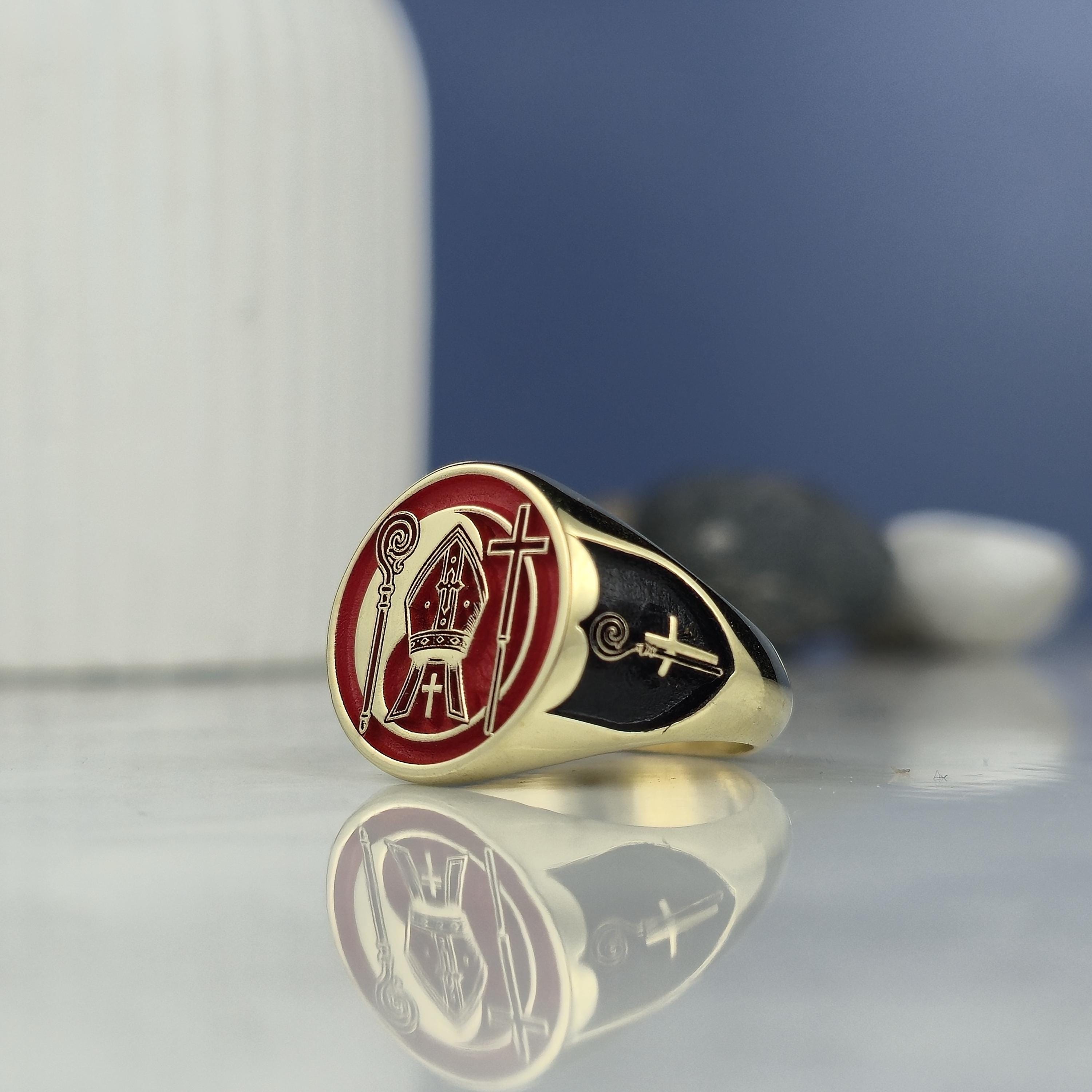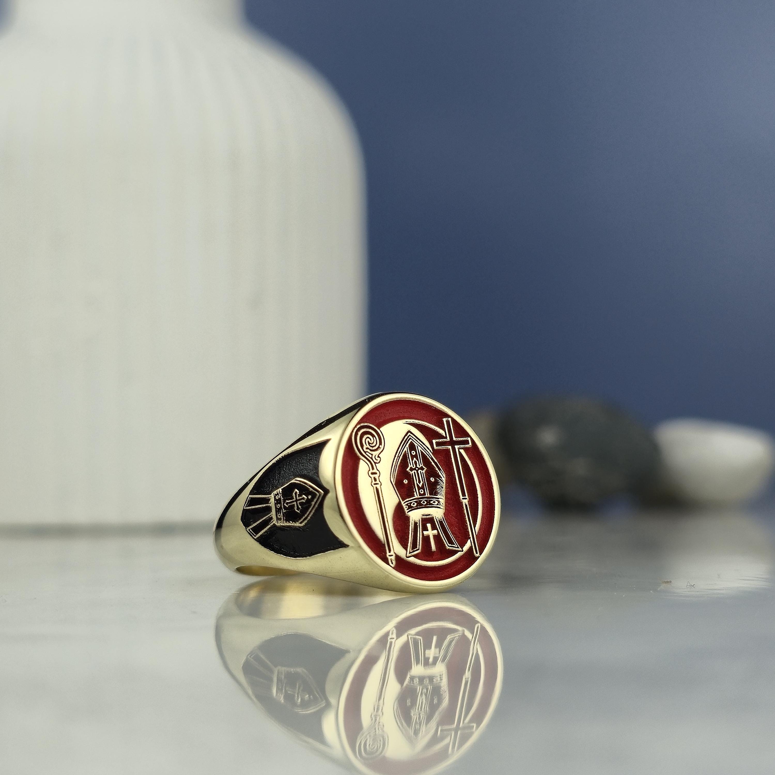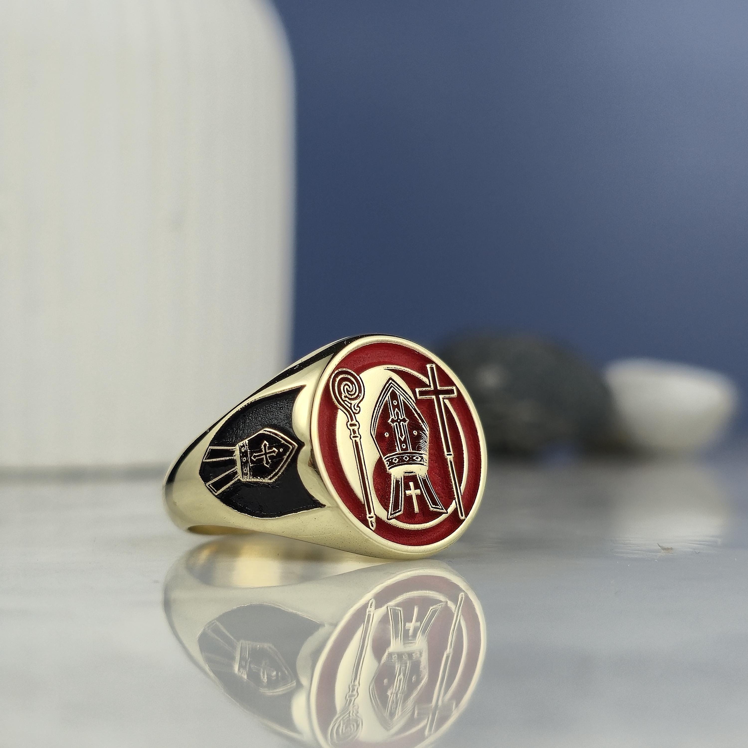 Introduce a bold expression of faith and craftsmanship with this handcrafted bishop-themed signet ring, made from 925 sterling silver and enriched with luxurious gold plating and vivid red and black enamel. Designed to honor the traditional symbols of the Church, this ring is more than jewelry—it's a spiritual emblem worn with pride and dignity.