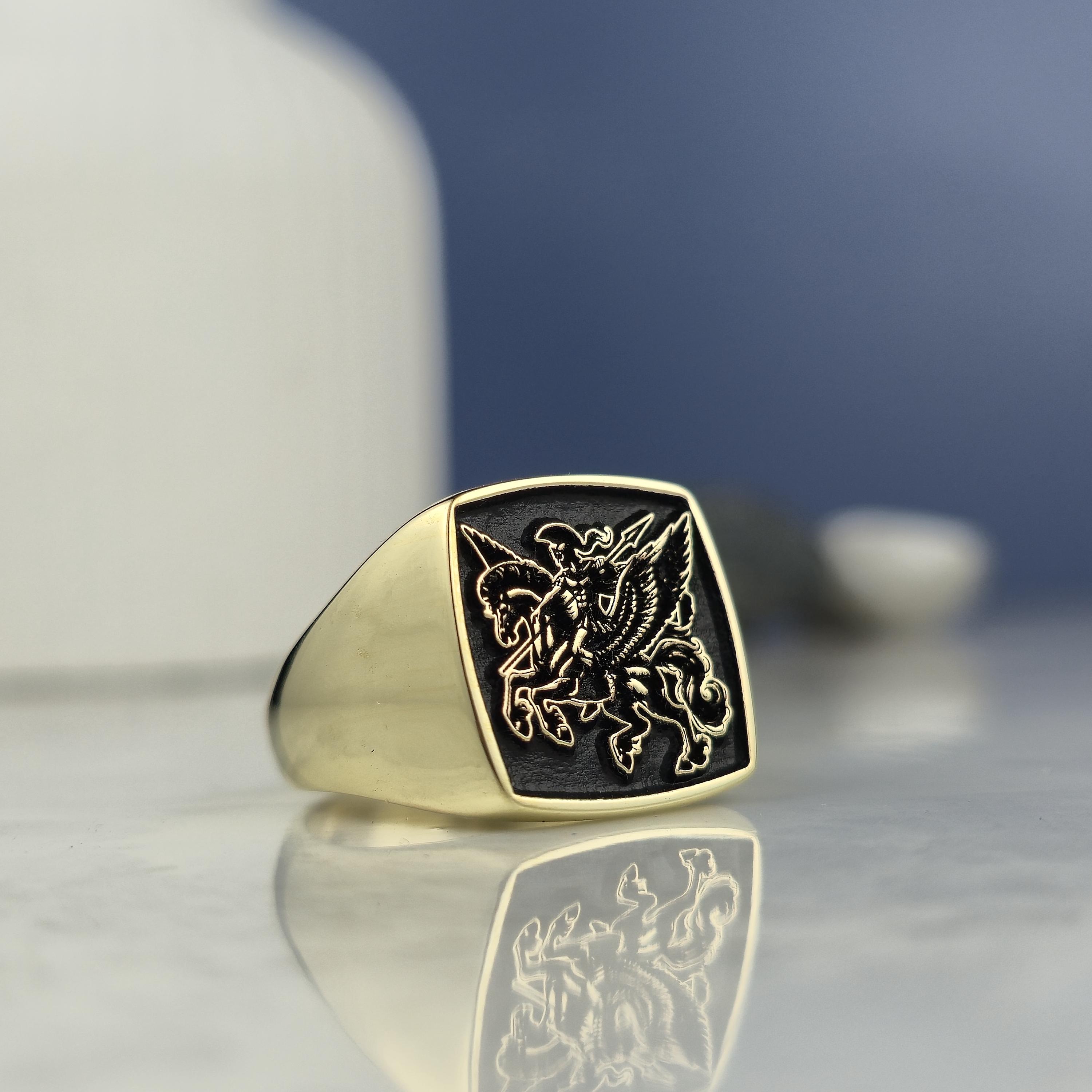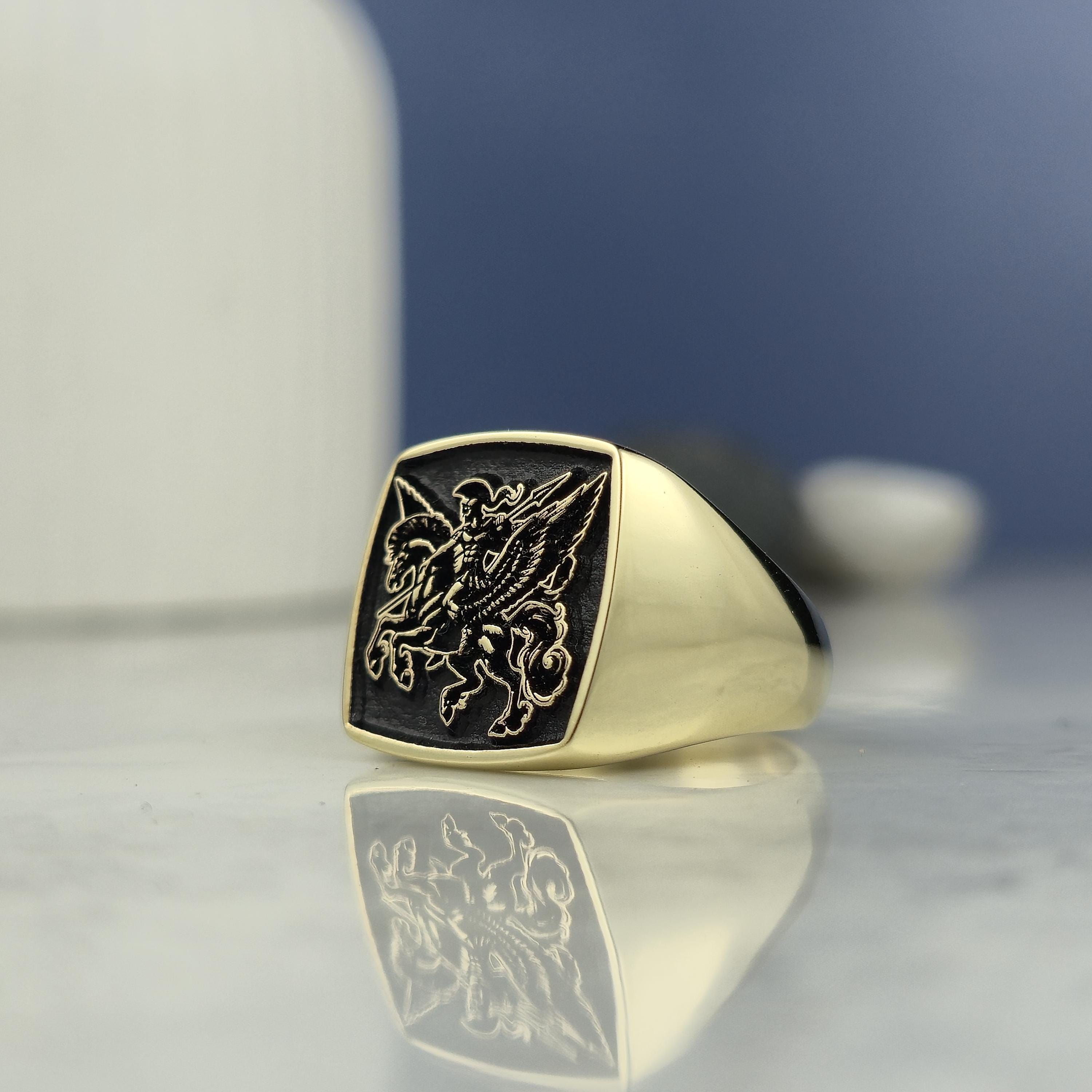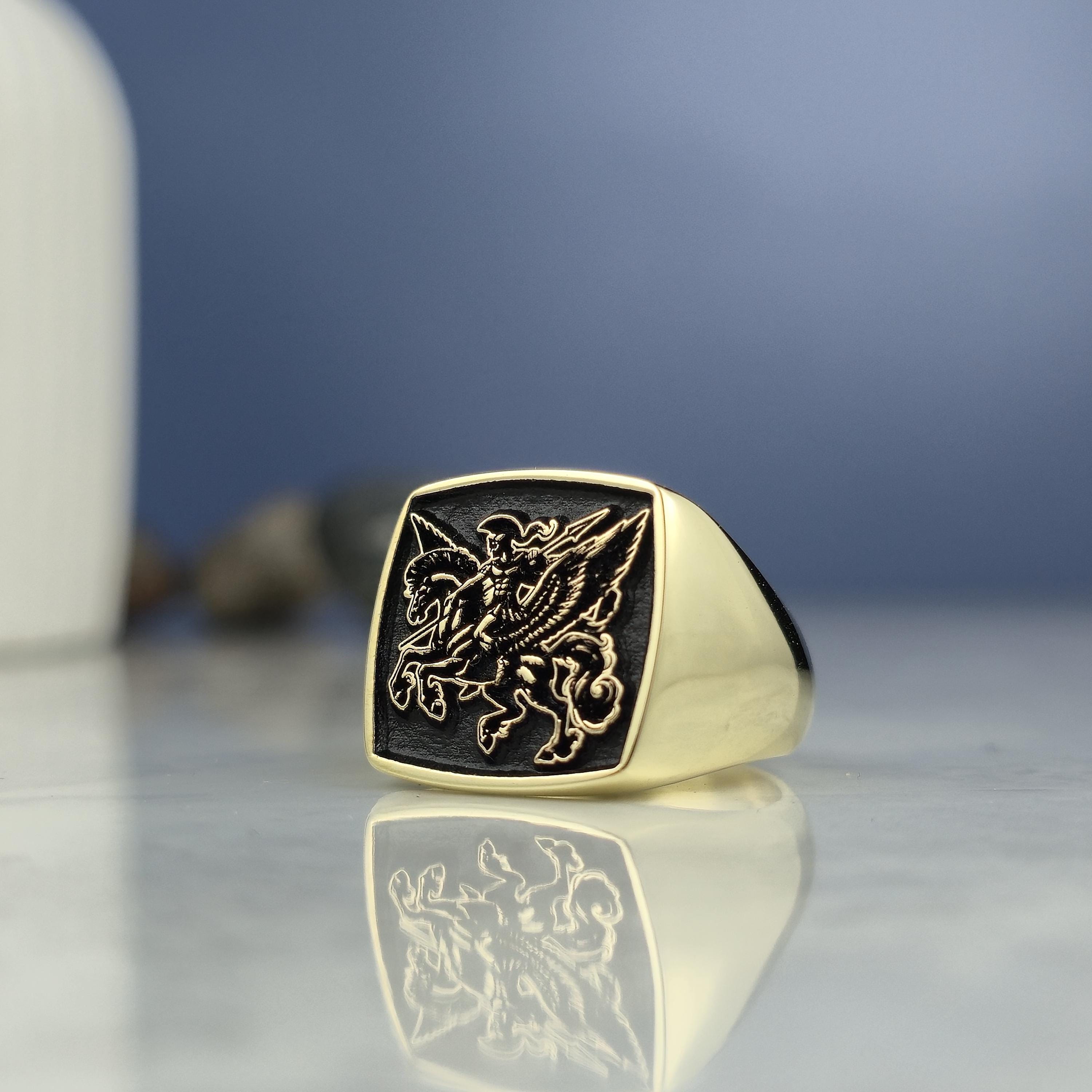 Design Theme: This striking square signet ring showcases a powerful mythological warrior riding Pegasus, the legendary winged horse. The deep black background highlights the exquisite gold-plated engraving for a bold and regal look.