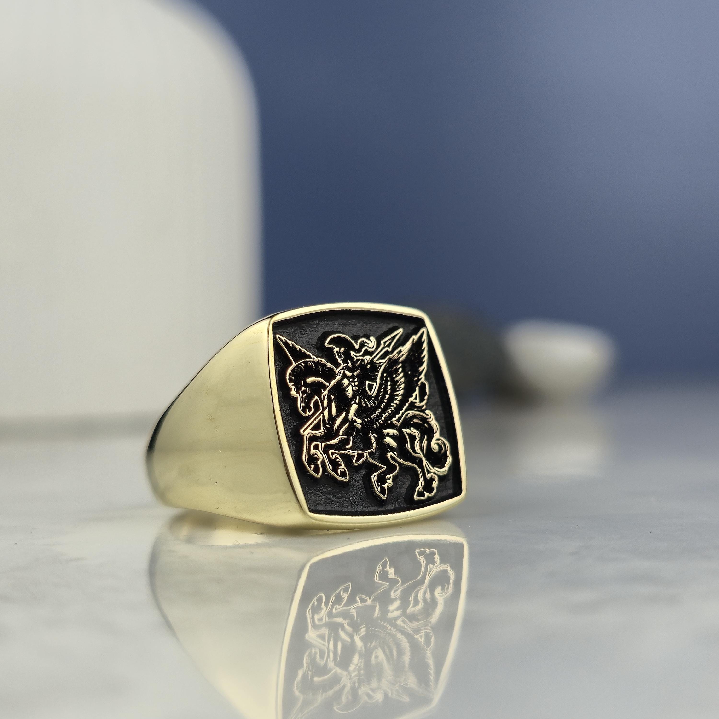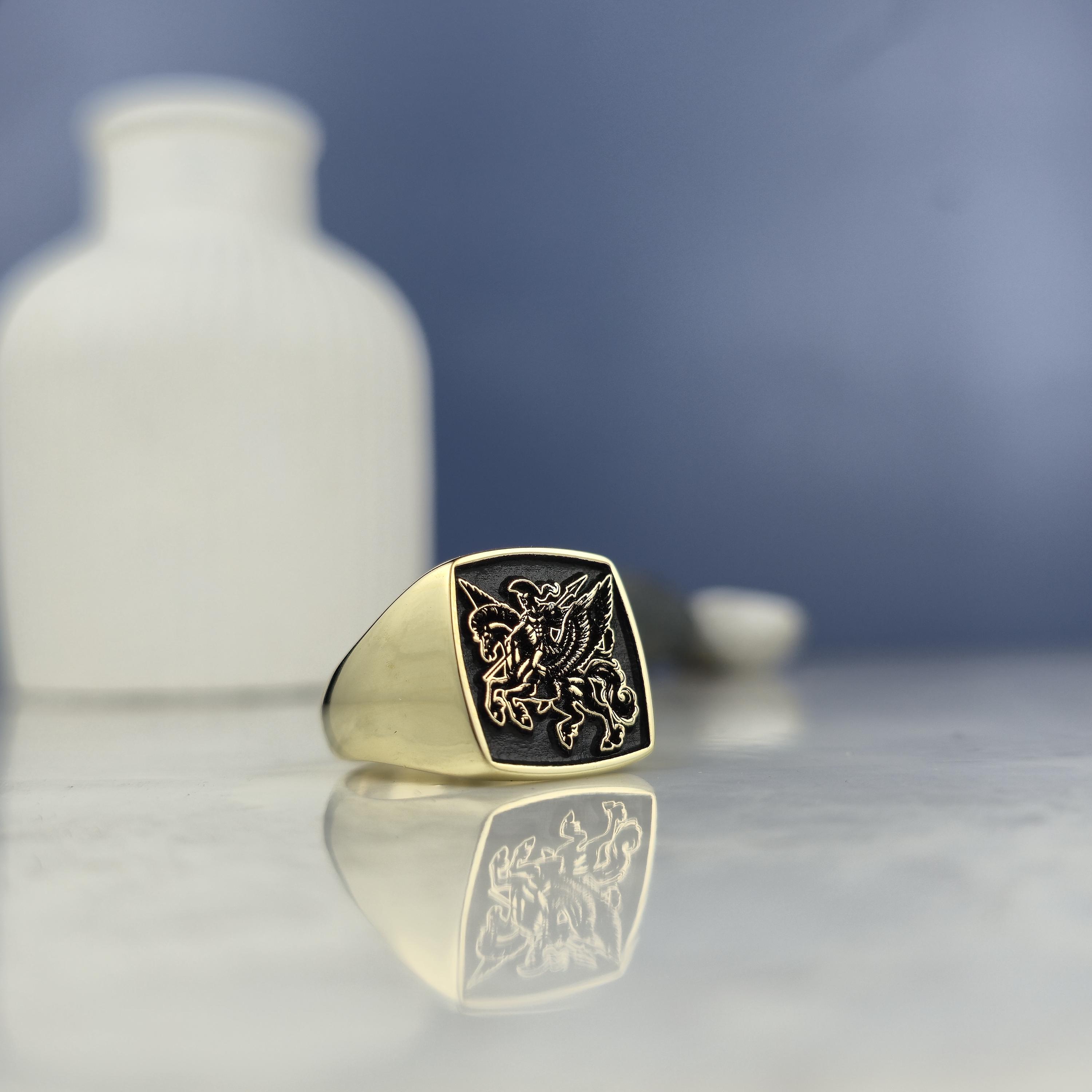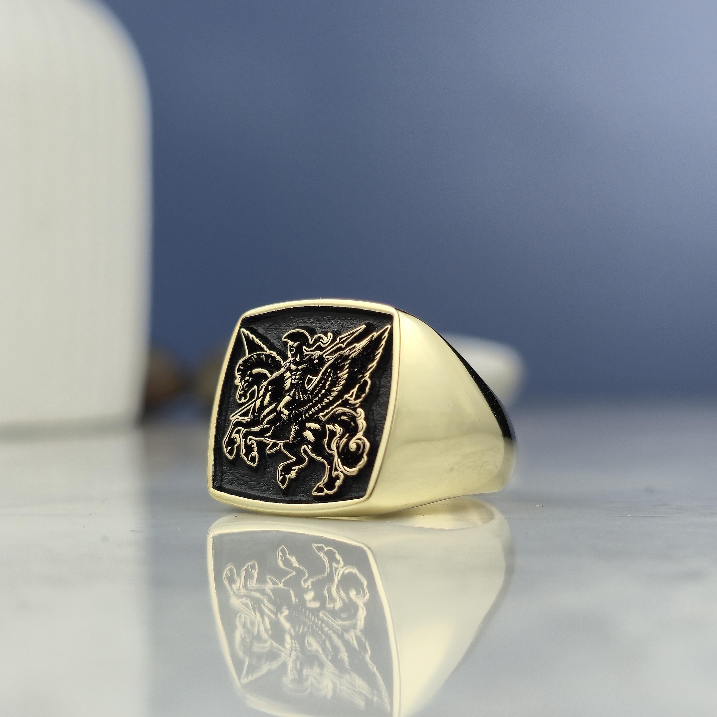 Design Theme: This striking square signet ring showcases a powerful mythological warrior riding Pegasus, the legendary winged horse. The deep black background highlights the exquisite gold-plated engraving for a bold and regal look.