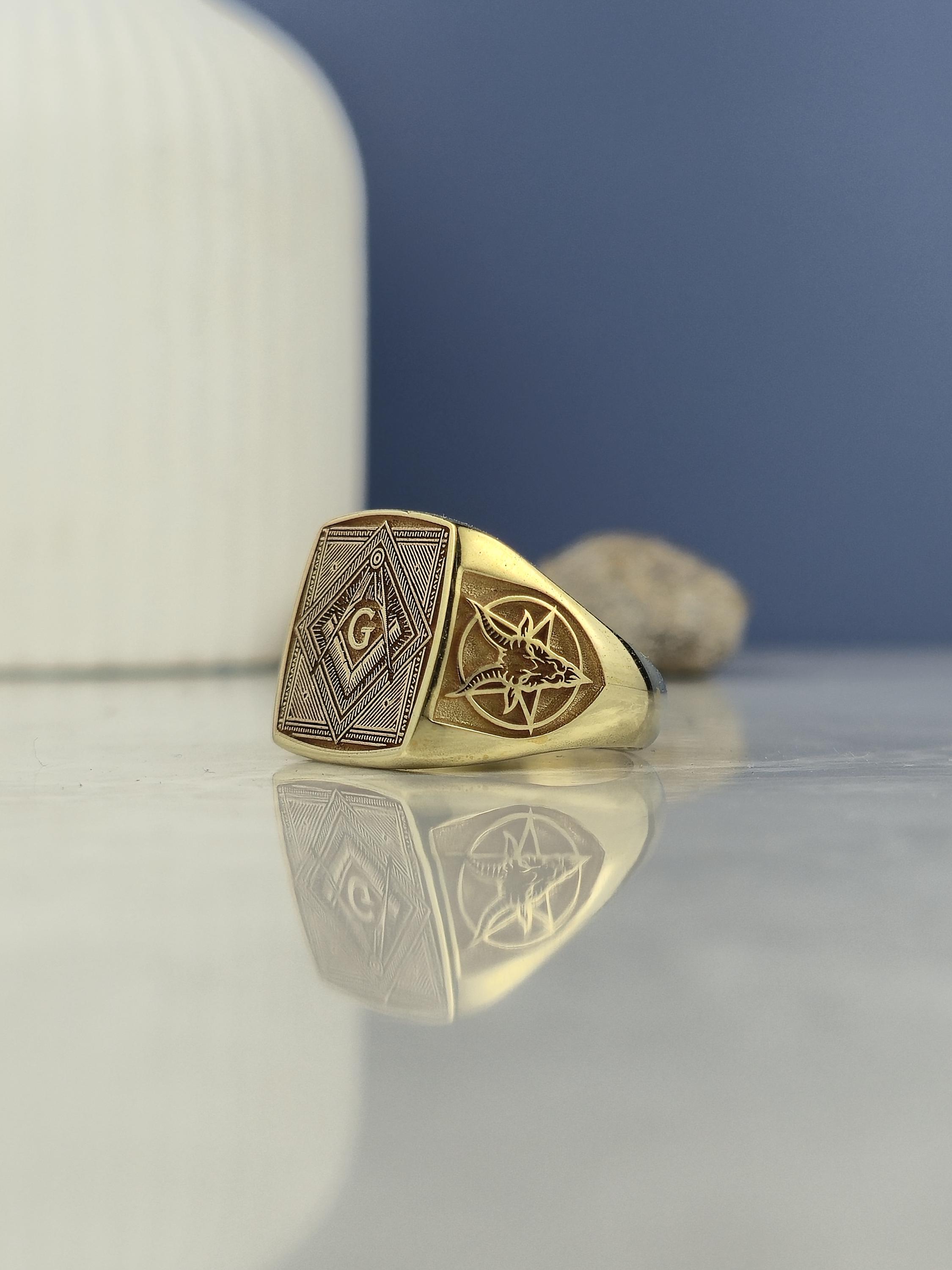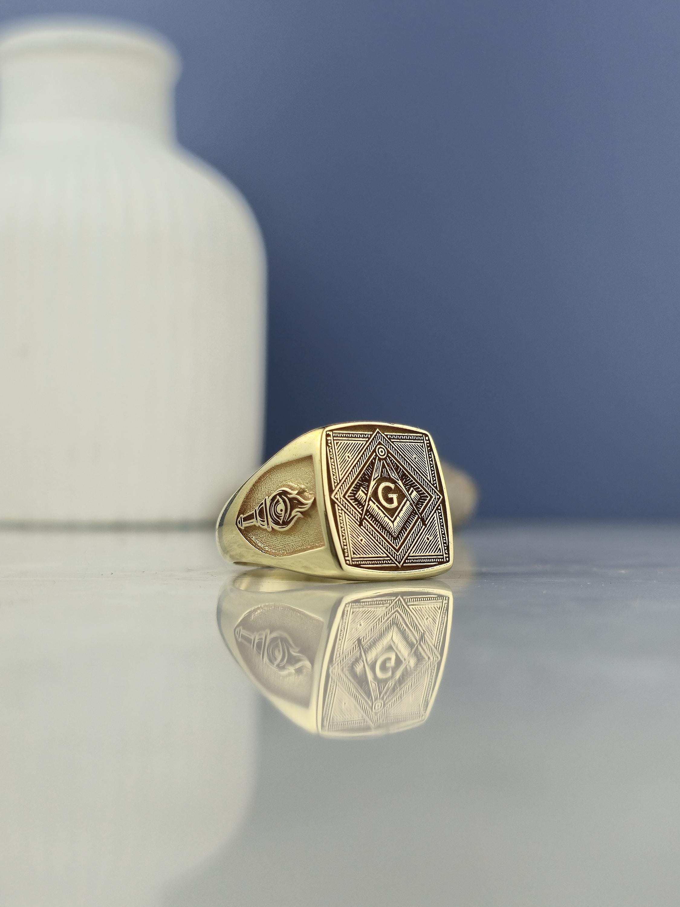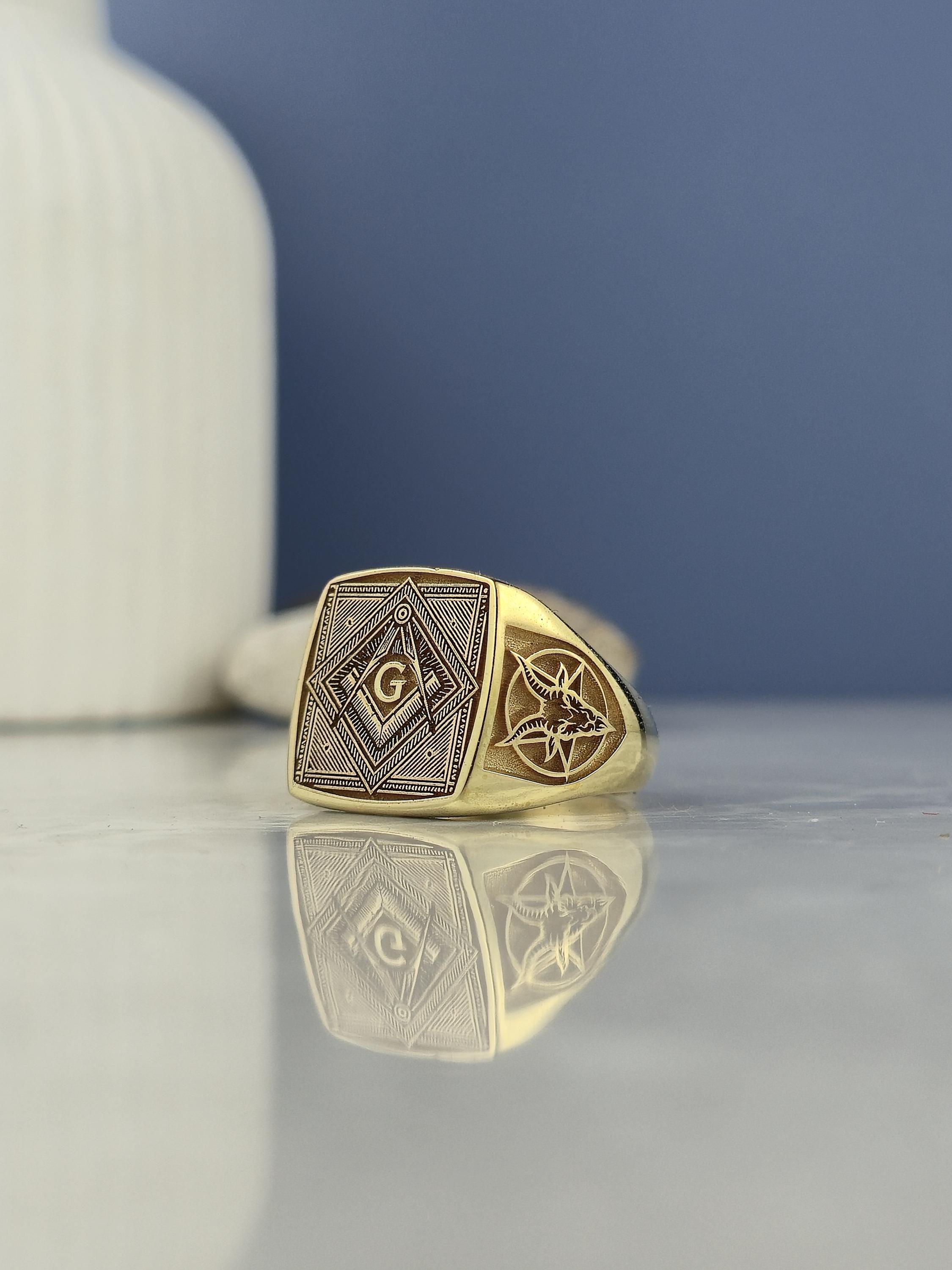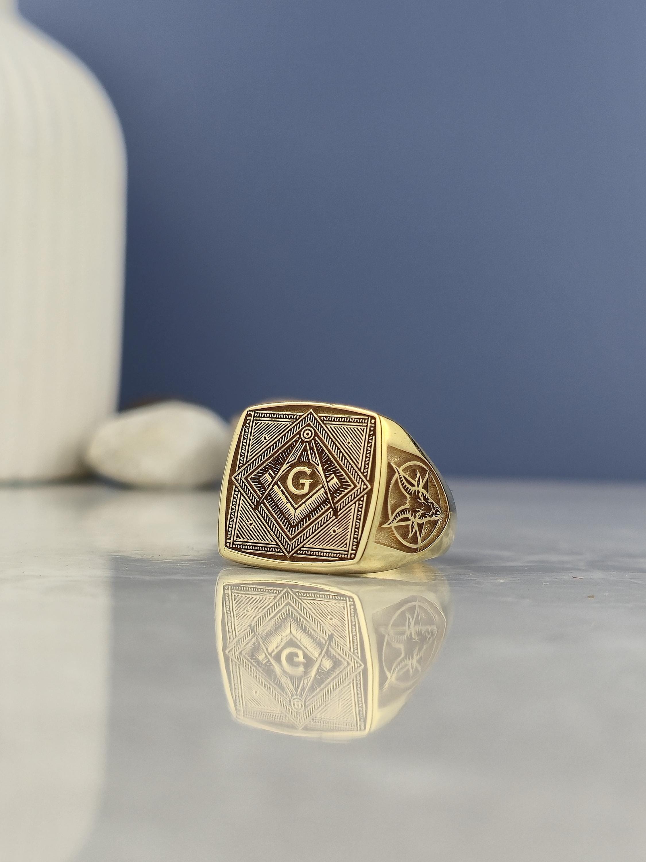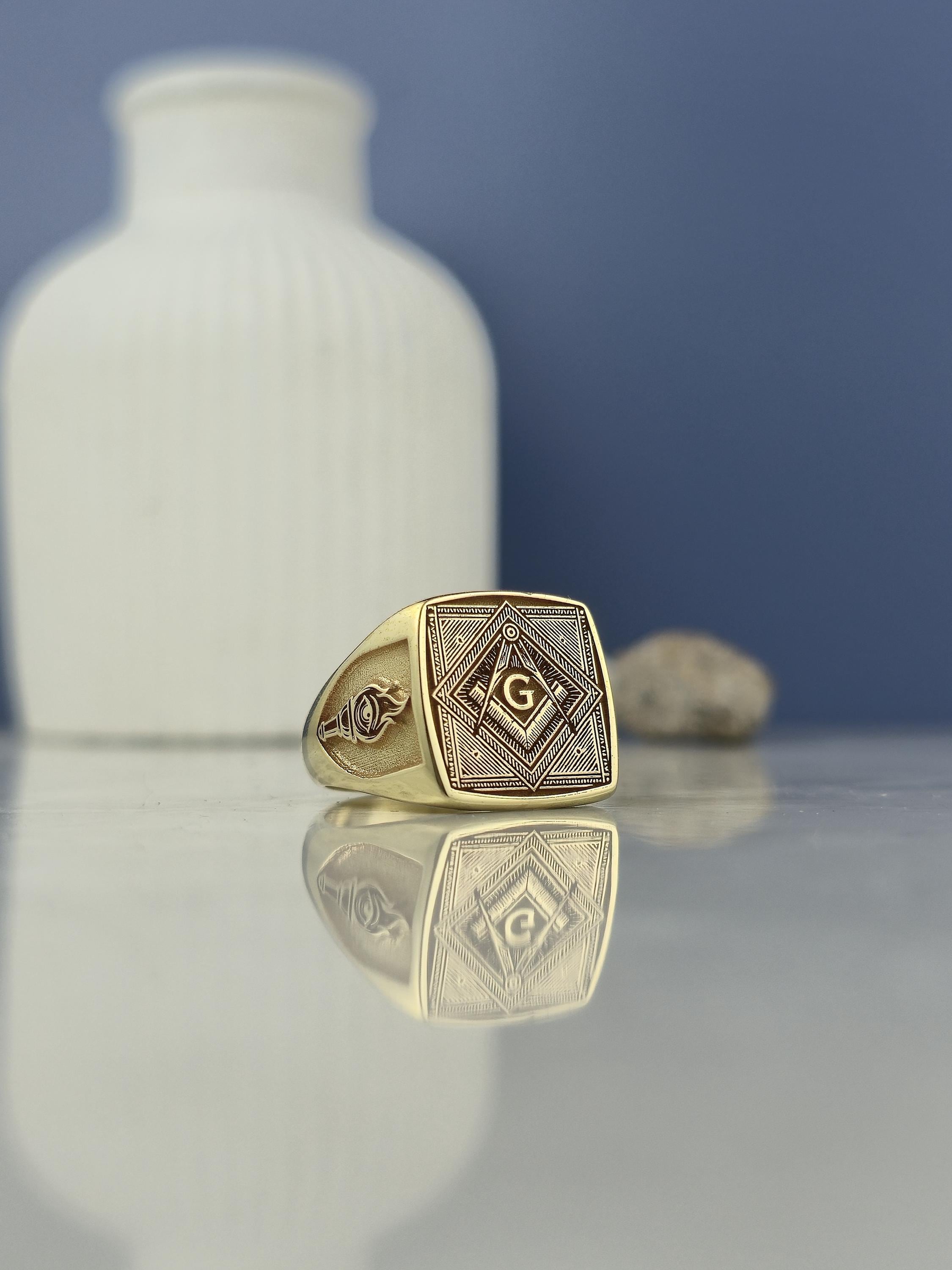Discover the timeless spirit of Freemasonry with this square-faced Masonic signet ring – a unique blend of symbolism and craftsmanship.