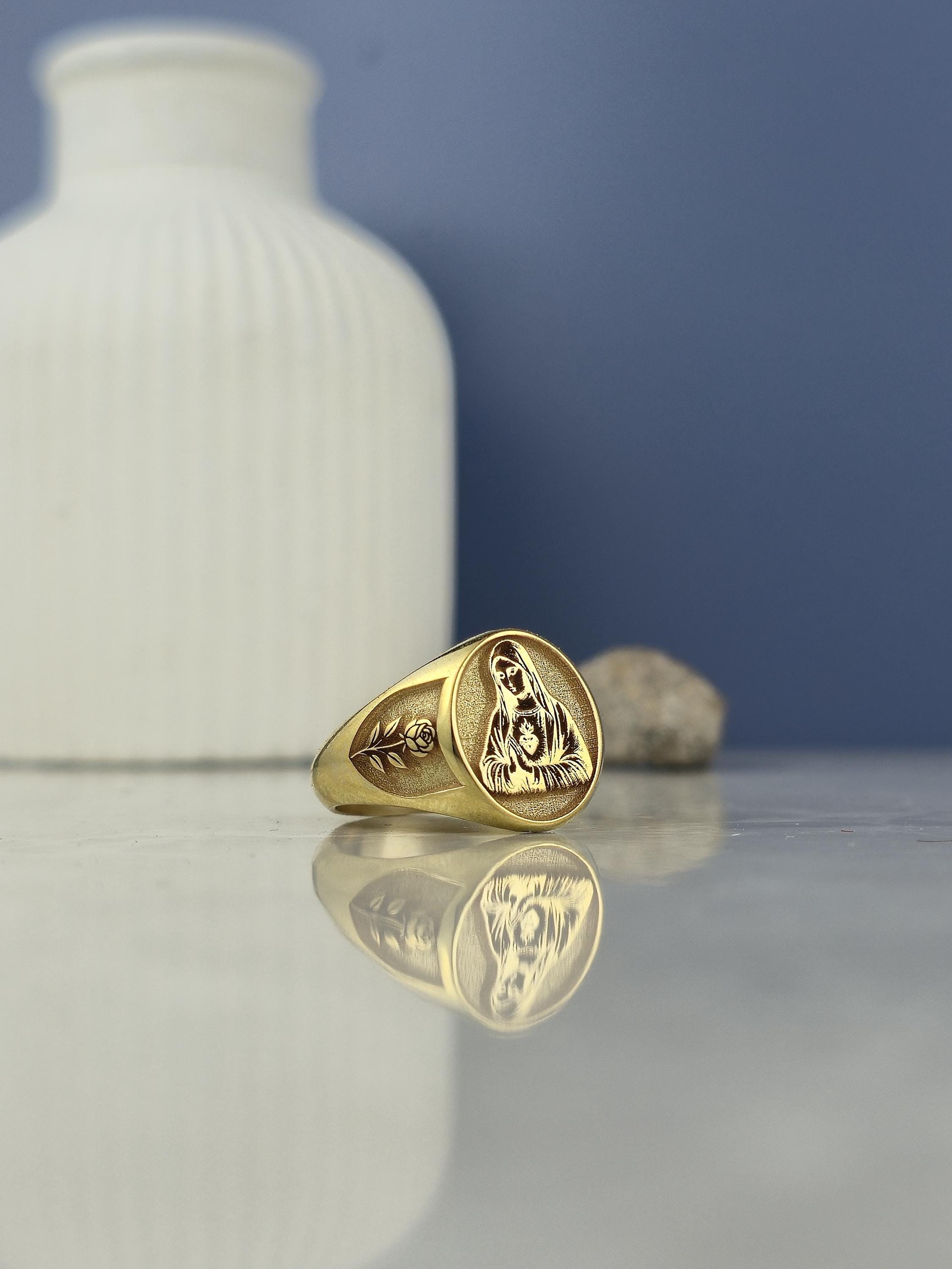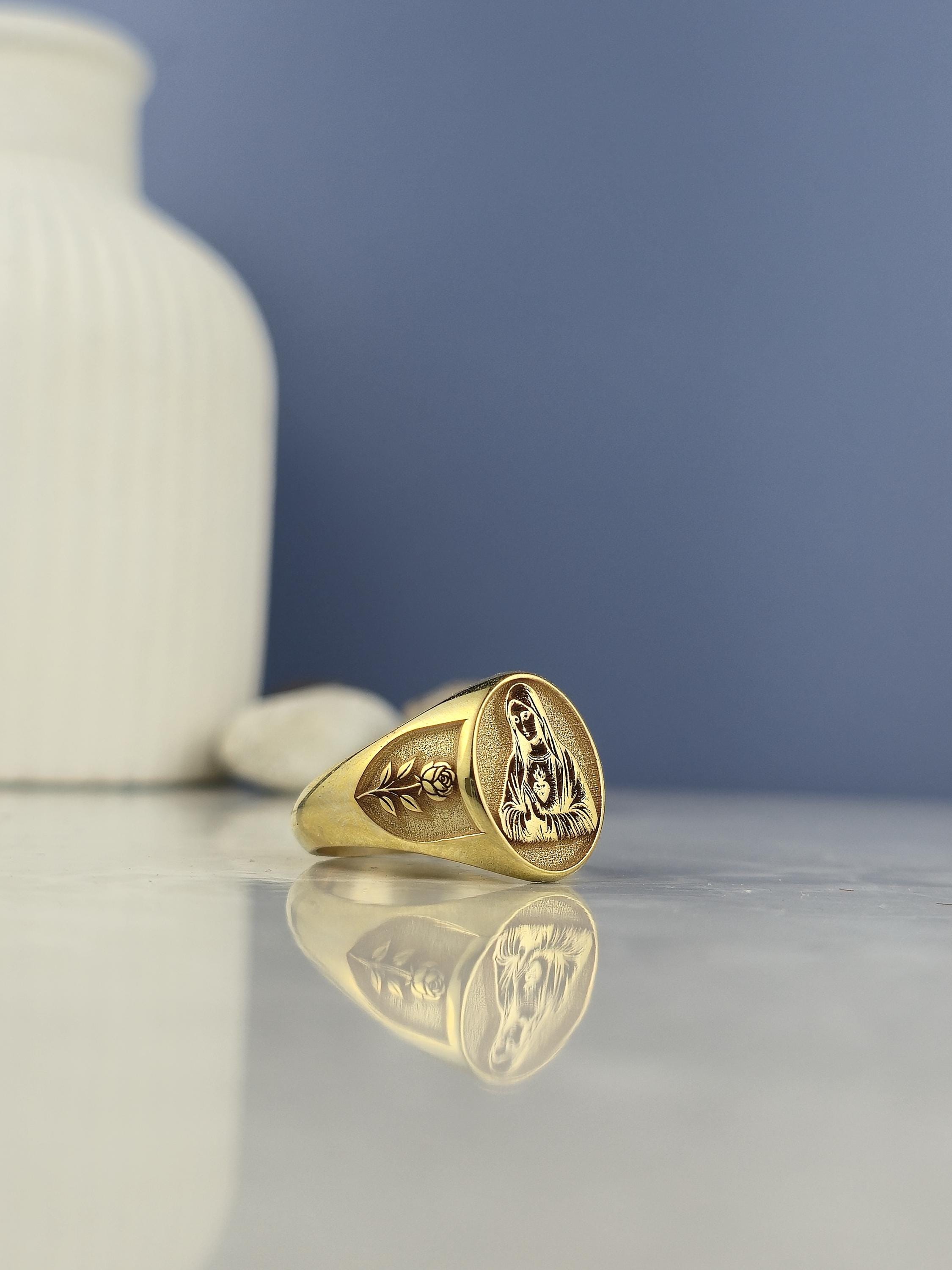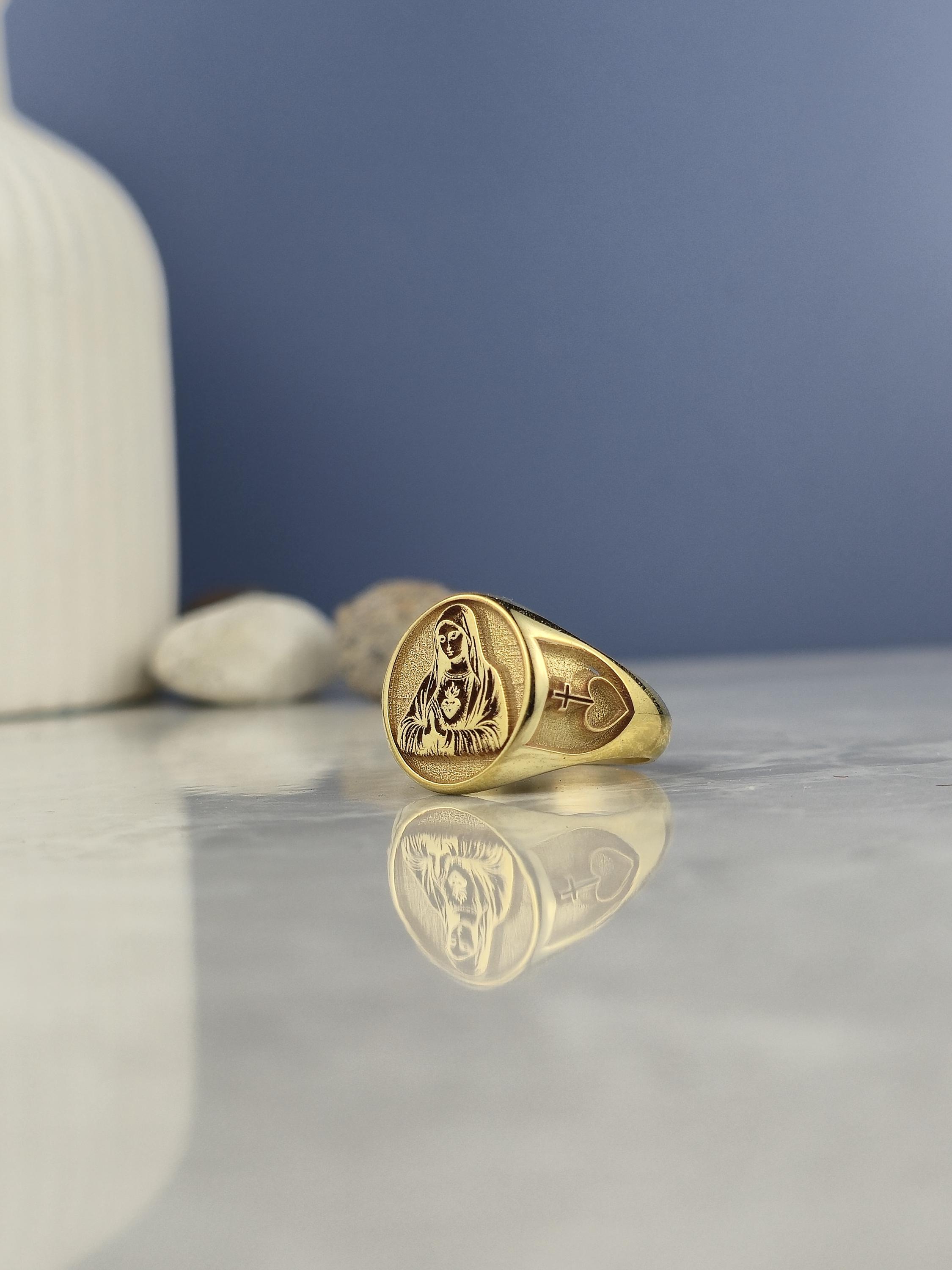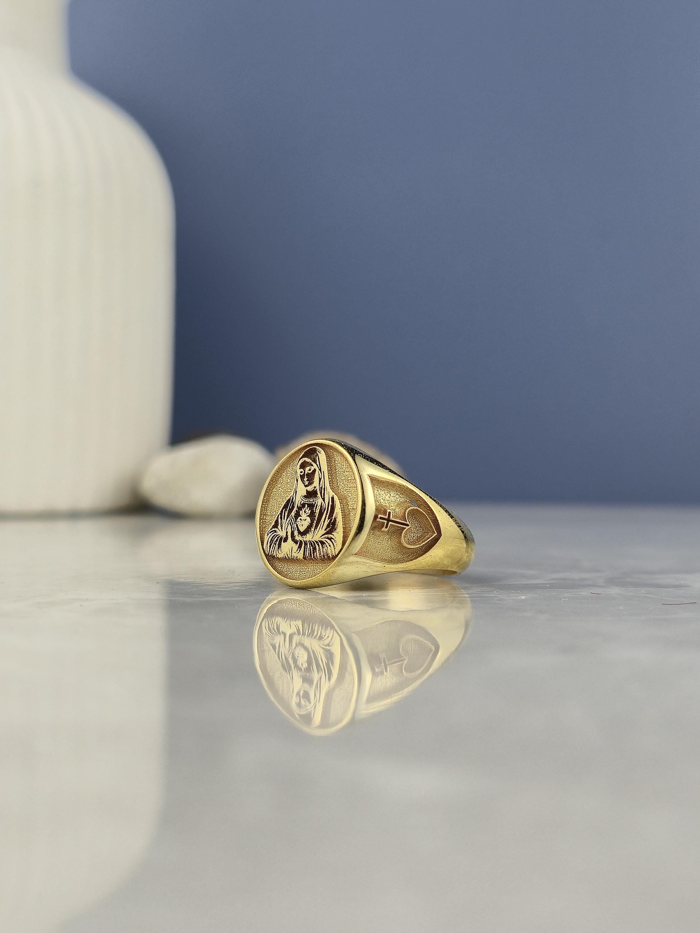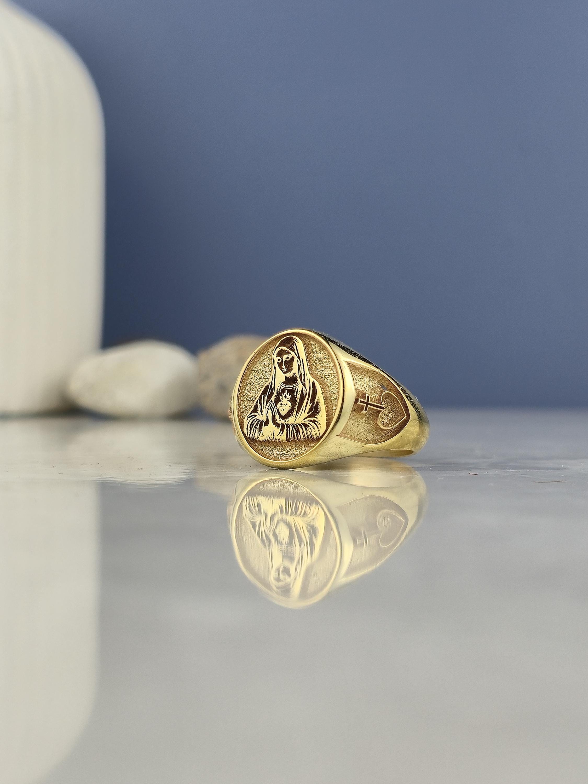 ✨ This stunning gold-plated signet ring honors the Virgin Mary with an engraving of the Sacred Heart on the face, beautifully accented with symbolic side engravings — a cross and heart on one side, and a delicate rose on the other. Crafted from solid 925 sterling silver, this ring merges spiritual reverence with artisan craftsmanship, offering a unique piece for those who seek meaning in every detail.