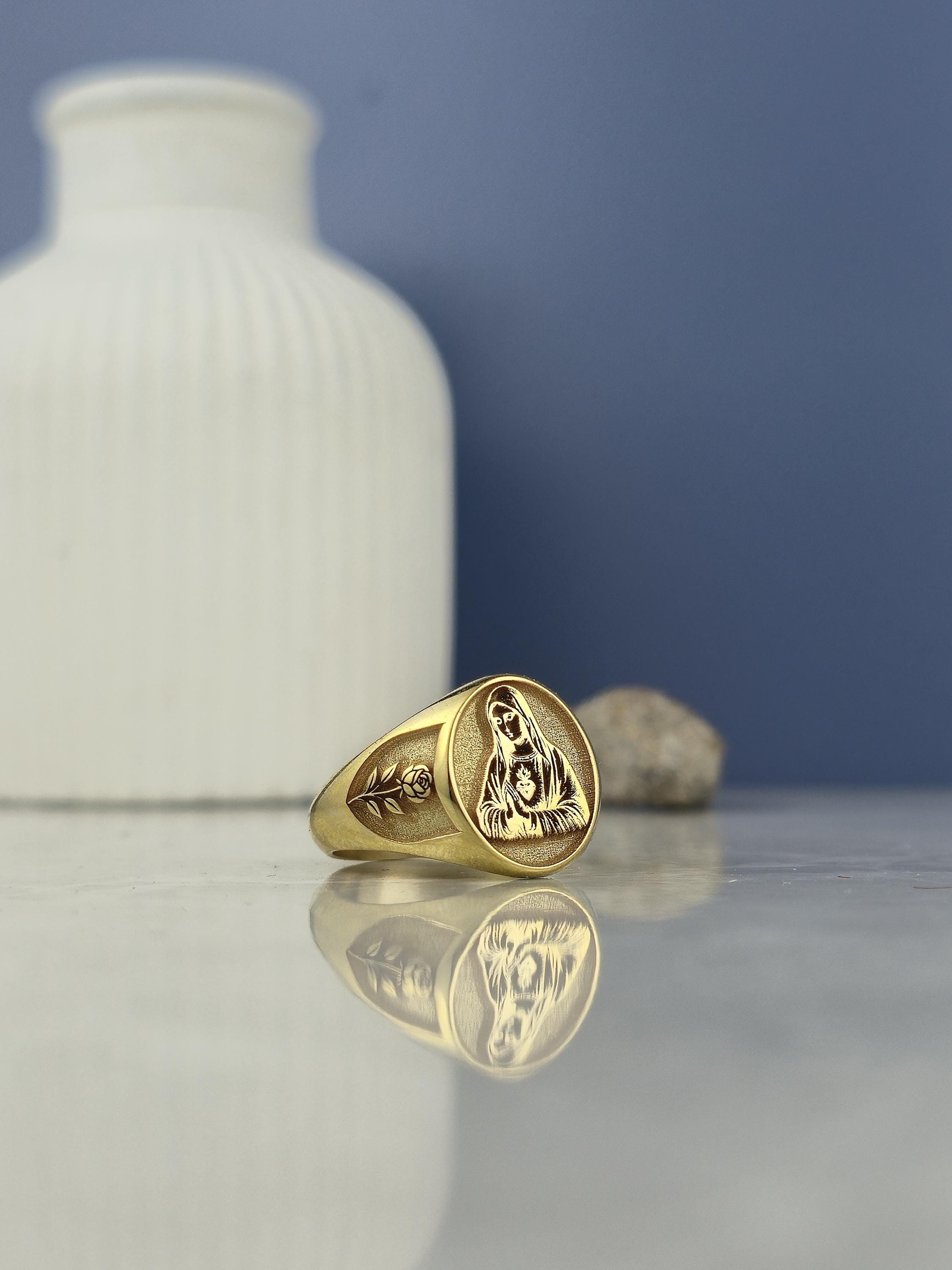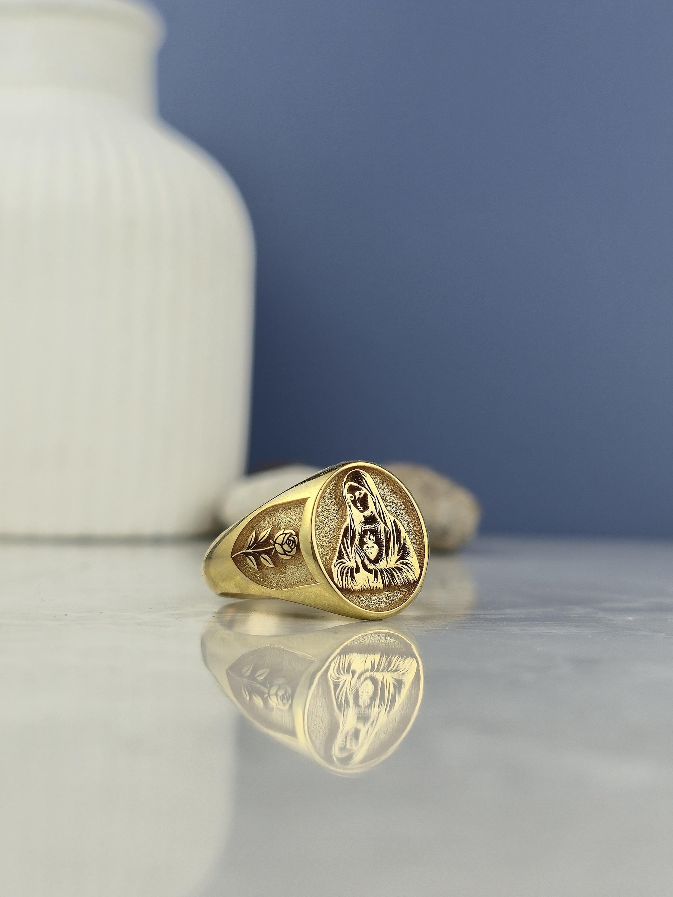Gold-Plated Sterling Silver Virgin Mary Signet Ring: Sacred Heart, Cross & Rose