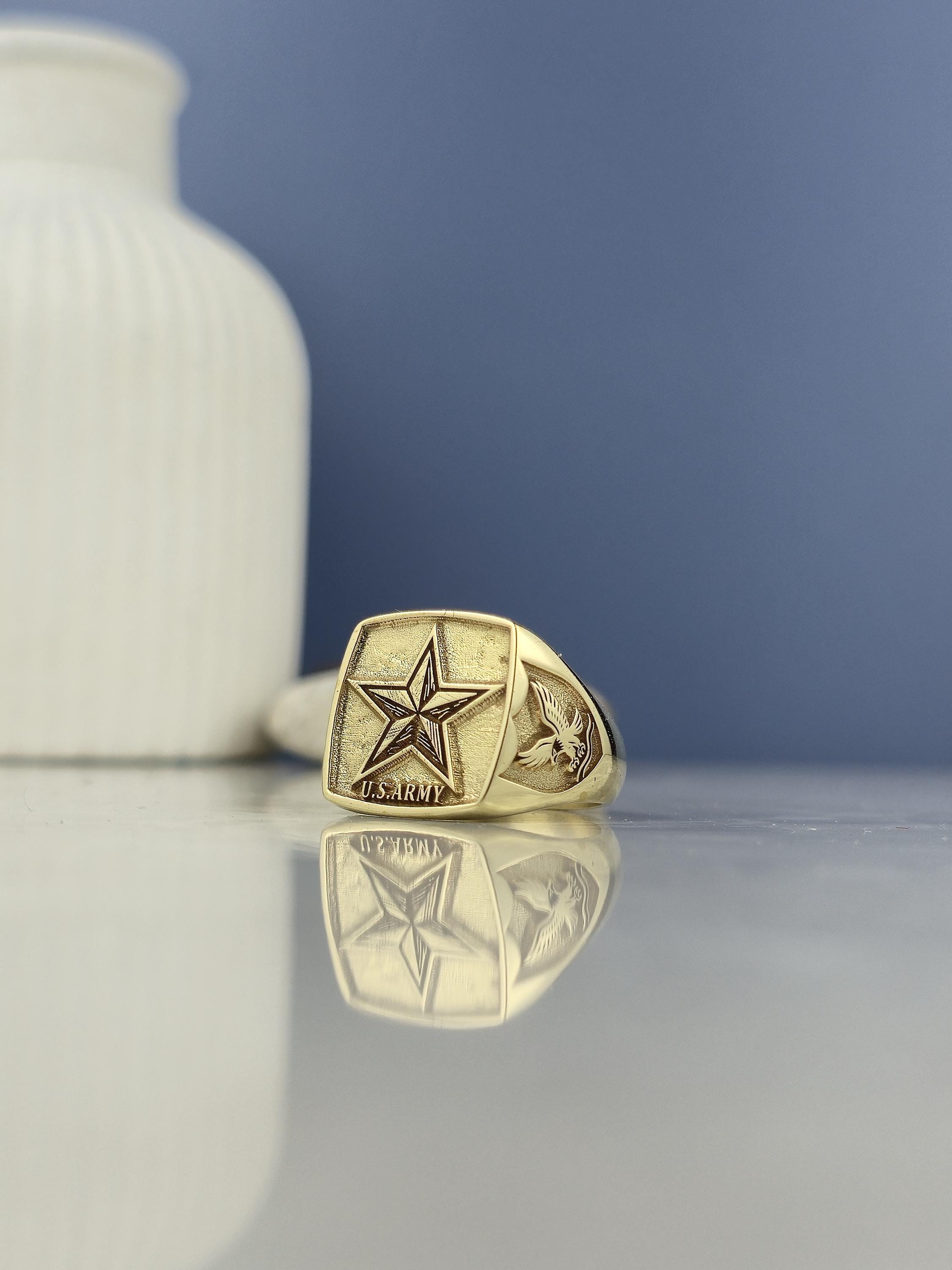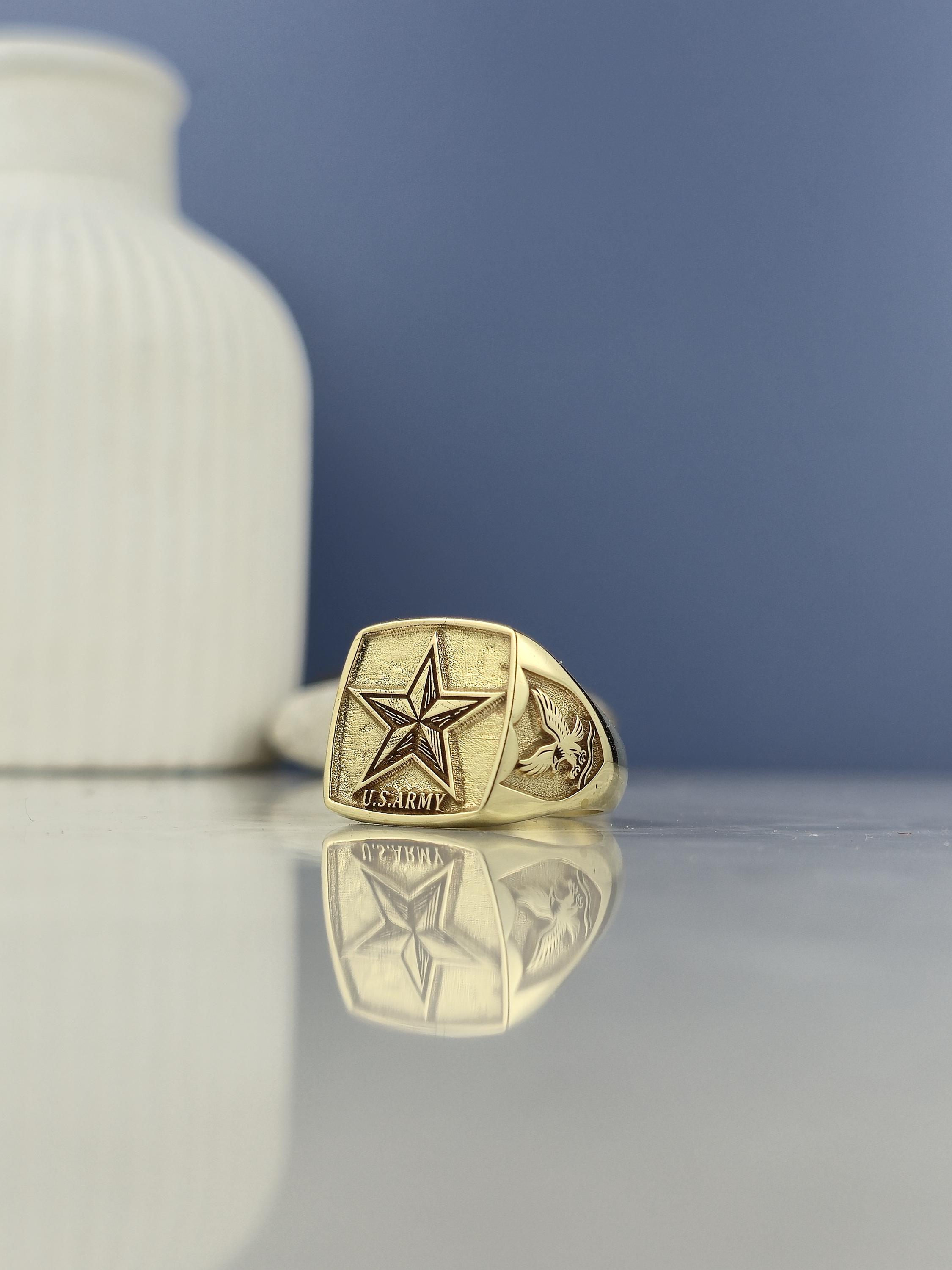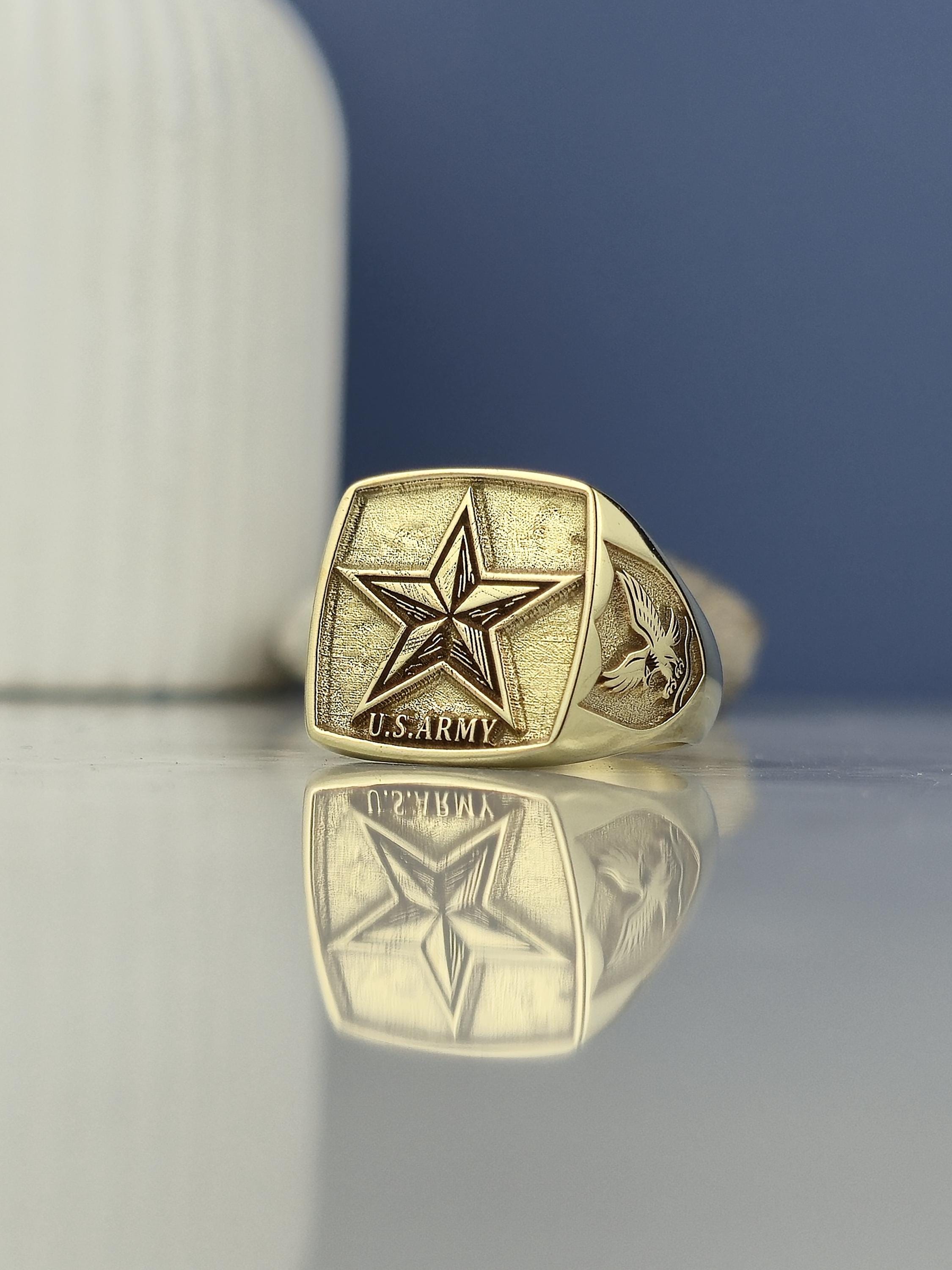 Honor your service or gift a proud veteran with this stunning square-shaped U.S. Army signet ring. Featuring the iconic U.S. ARMY star and engraved eagle and cross-sword insignias on the sides, this handcrafted ring is crafted from 925 sterling silver and finished in radiant gold plating. Perfectly balanced between symbolism and elegance, this ring makes a strong statement of honor, duty, and patriotism.