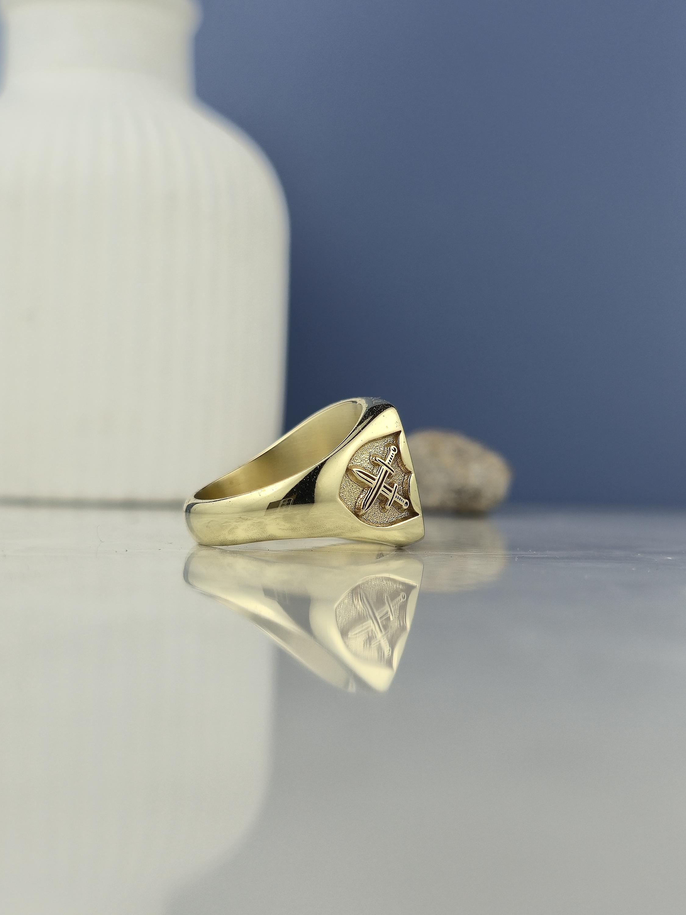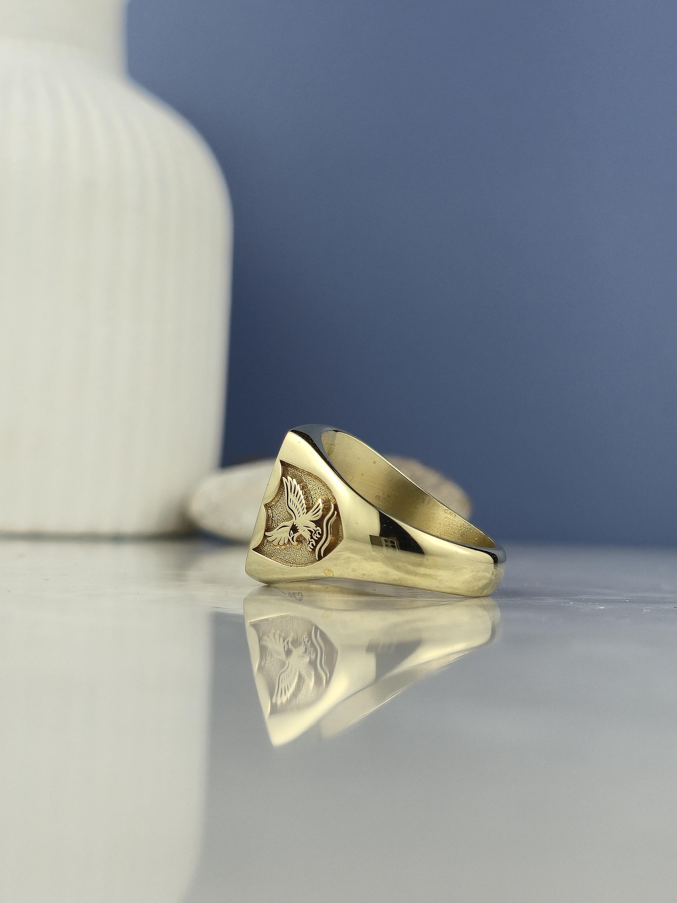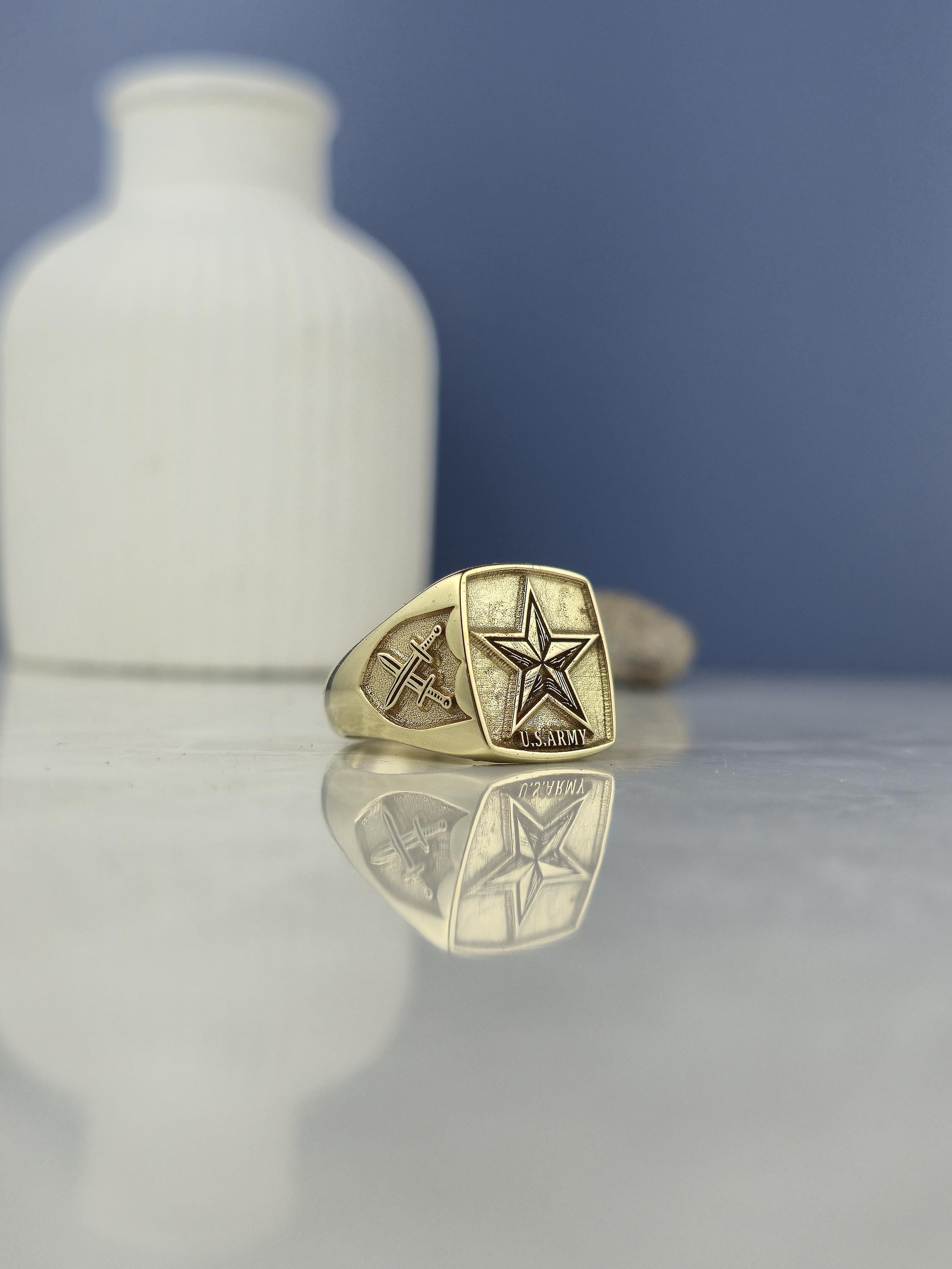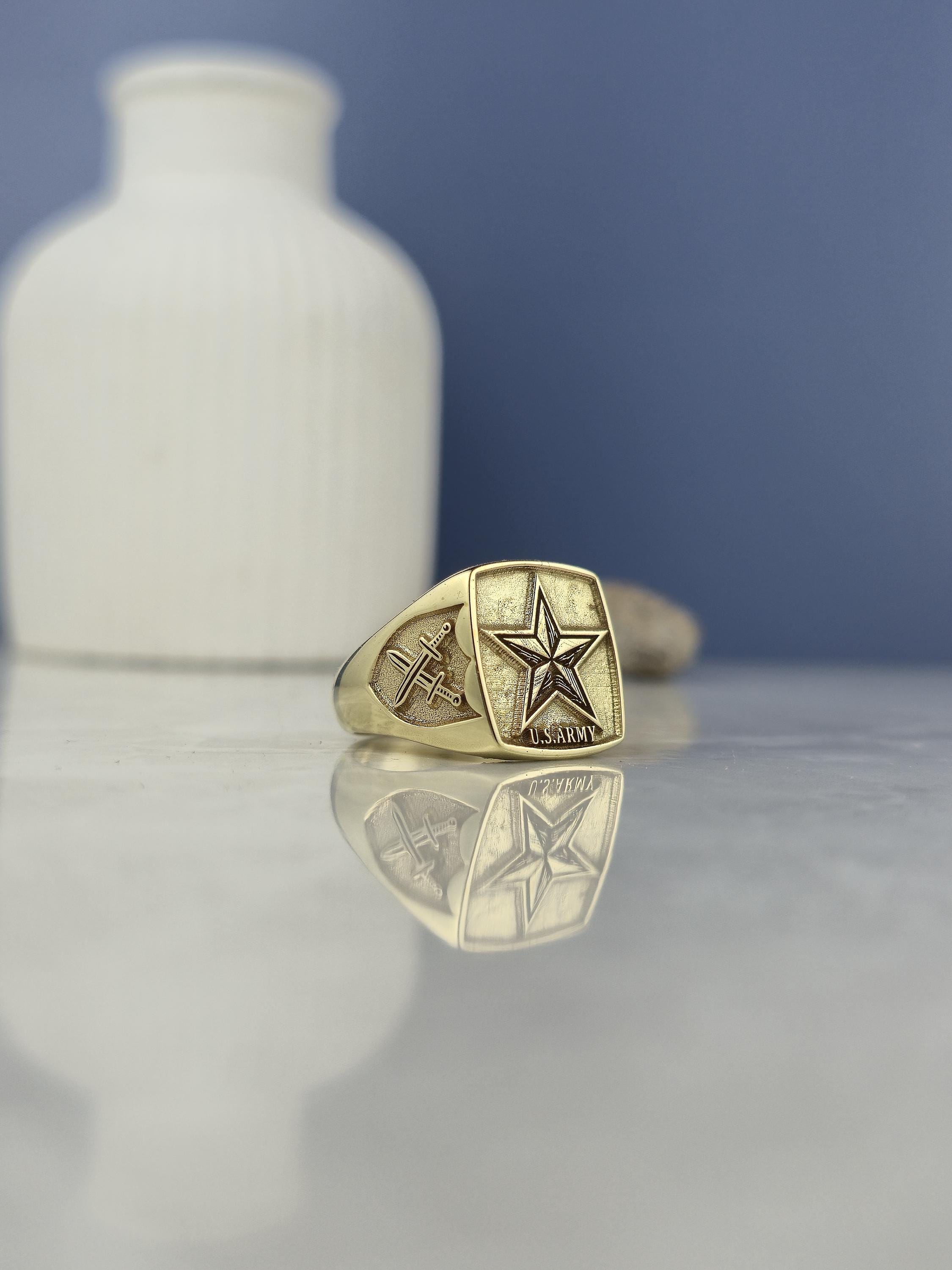 Honor your service or gift a proud veteran with this stunning square-shaped U.S. Army signet ring. Featuring the iconic U.S. ARMY star and engraved eagle and cross-sword insignias on the sides, this handcrafted ring is crafted from 925 sterling silver and finished in radiant gold plating. Perfectly balanced between symbolism and elegance, this ring makes a strong statement of honor, duty, and patriotism.