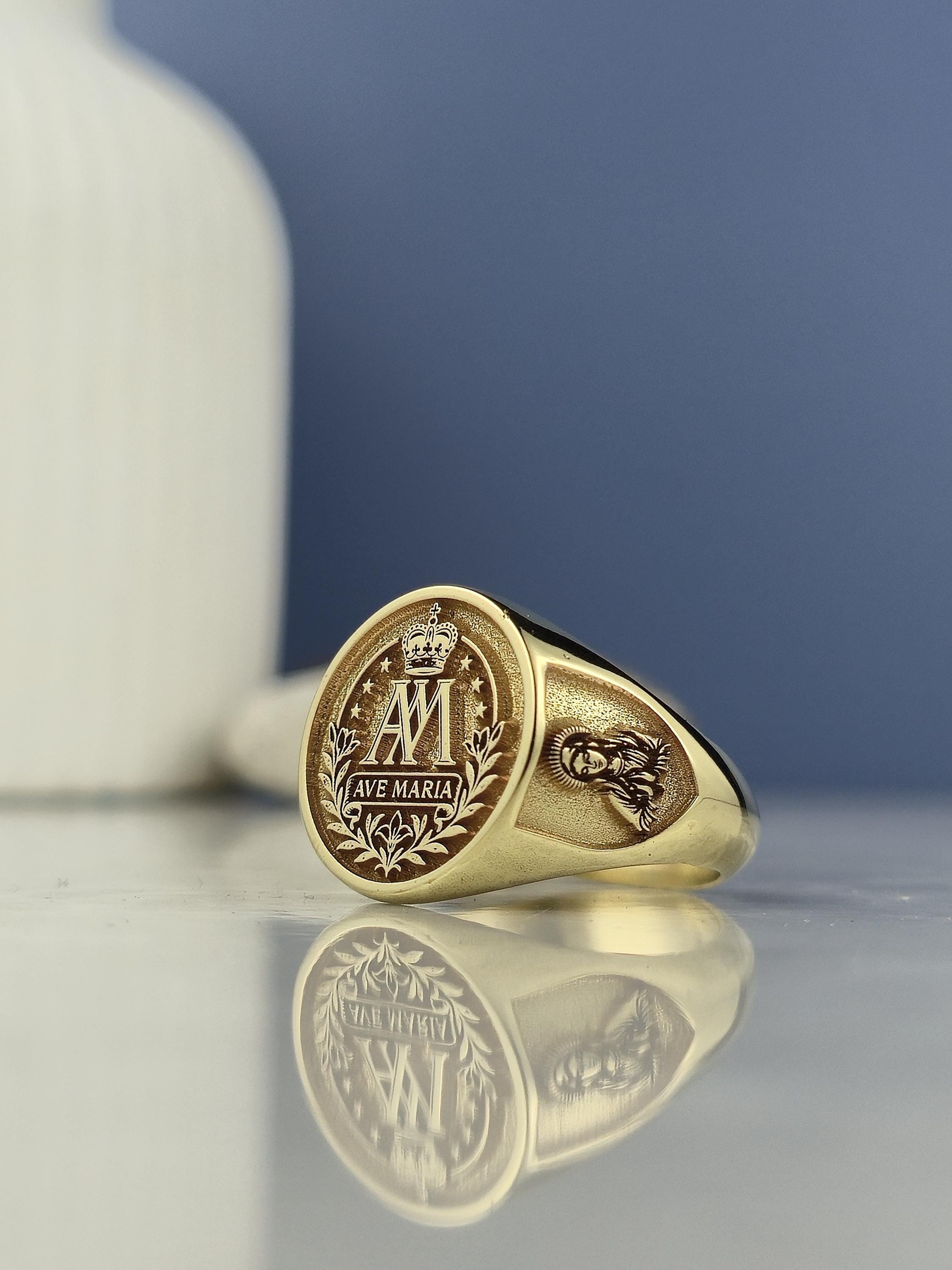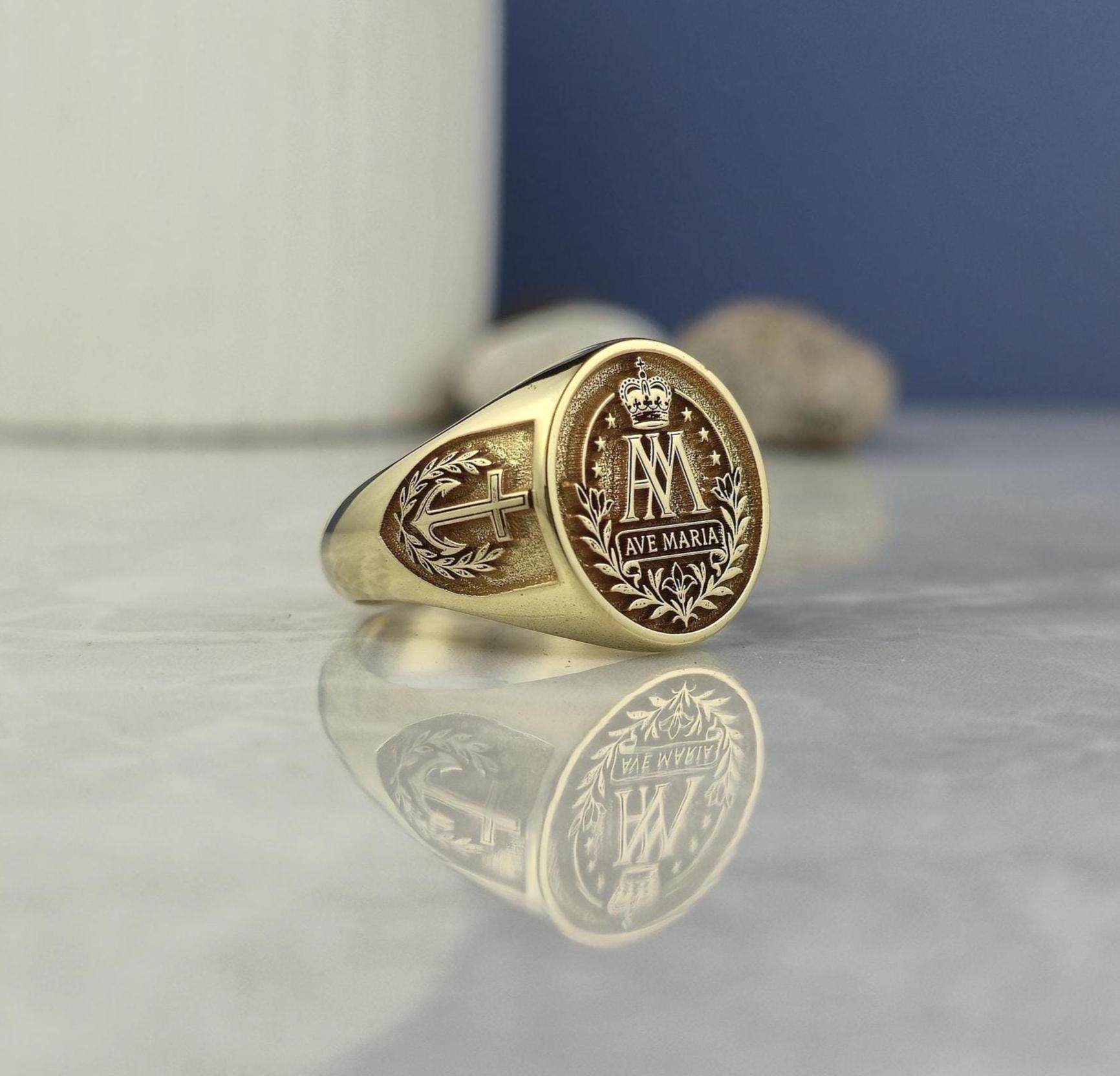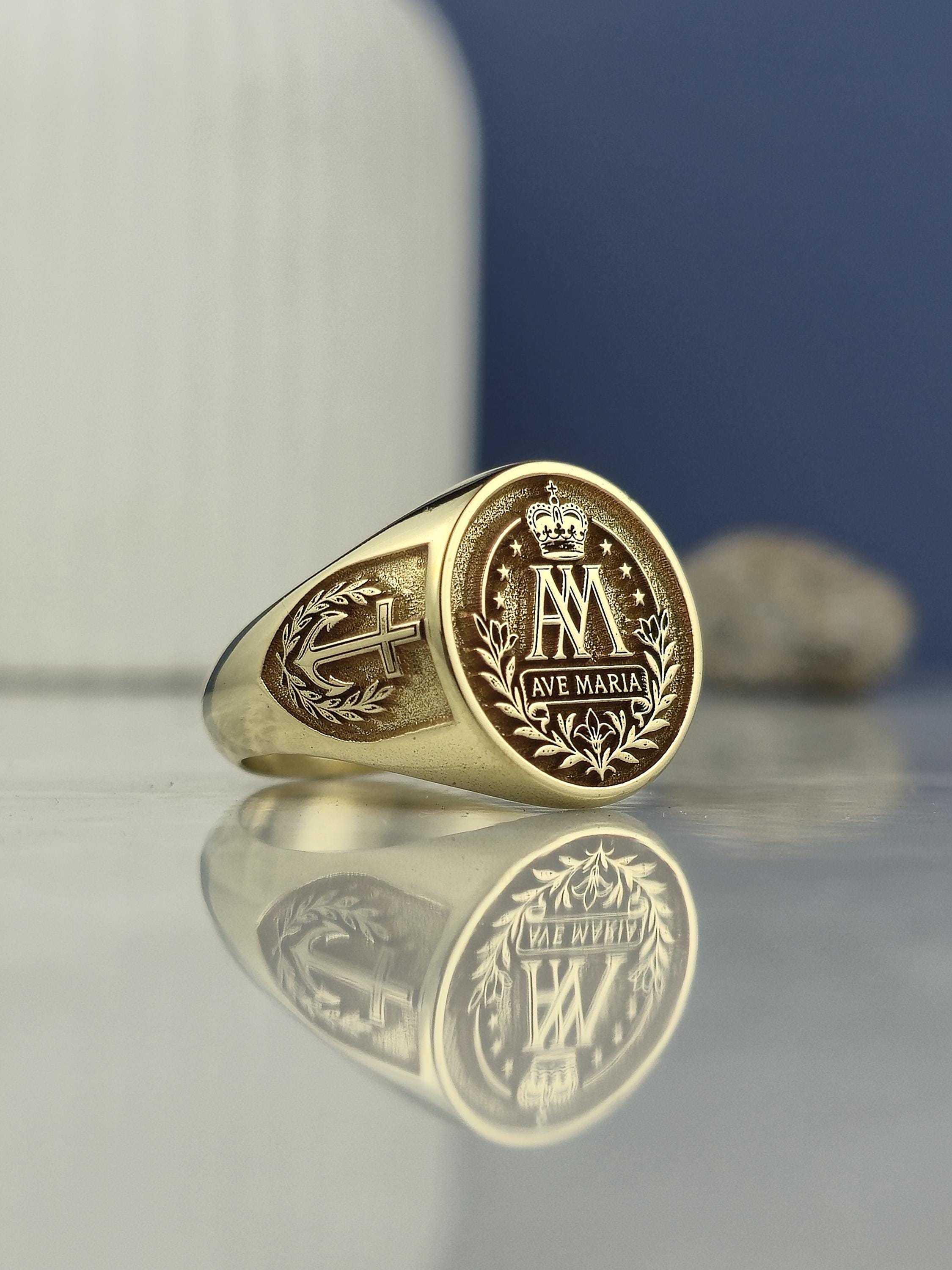 This meaningful ring is carefully designed with one of the most sacred Christian symbolsโthe Ave Maria emblem. The face features crowned "AM" initials and the "Ave Maria" inscription. The sides of the ring are adorned with the Virgin Mary figure and an anchor motif, representing unwavering faith. With exquisite handcrafting and a radiant gold-plated finish, it stands as a timeless symbol of devotion and belief.