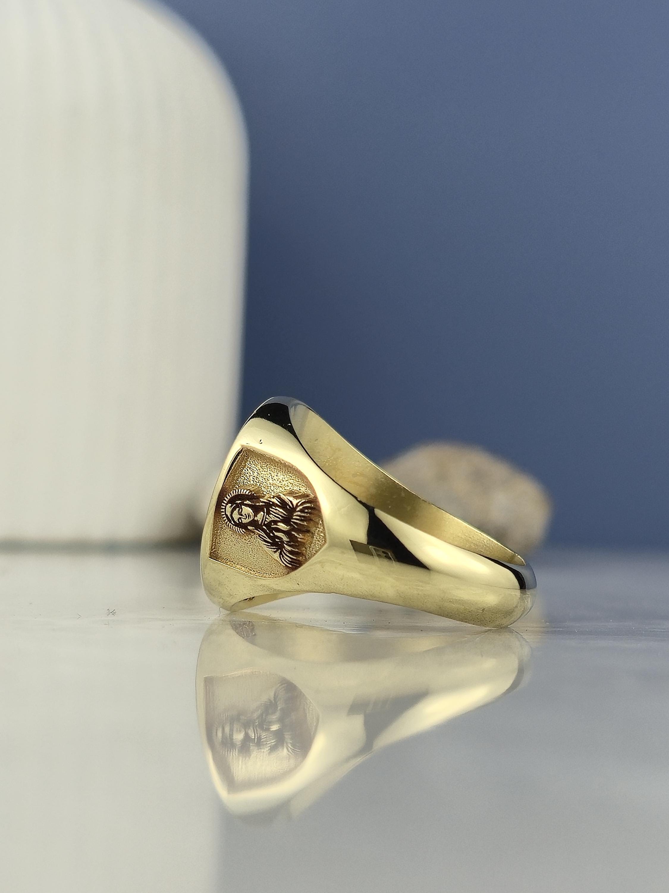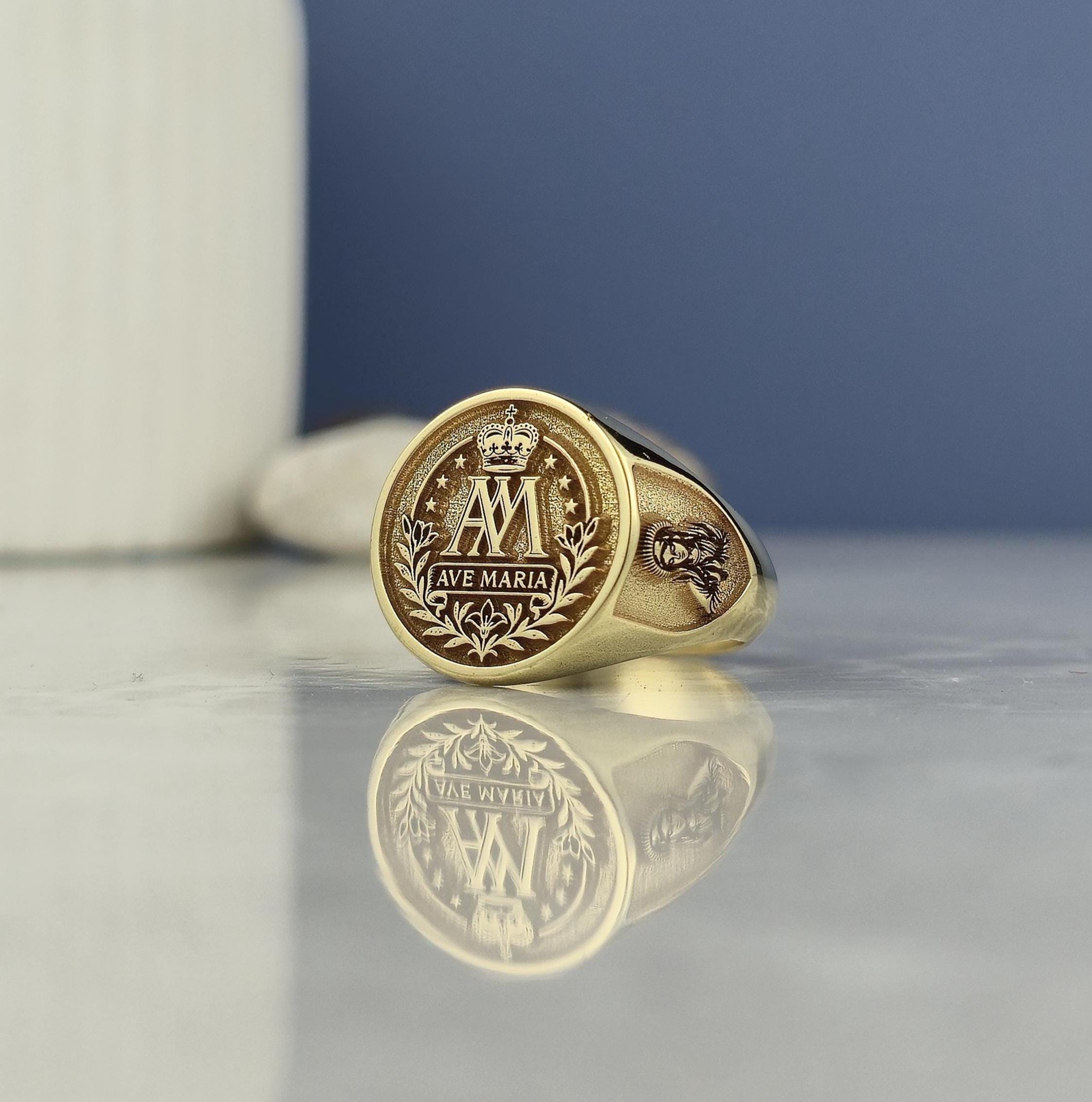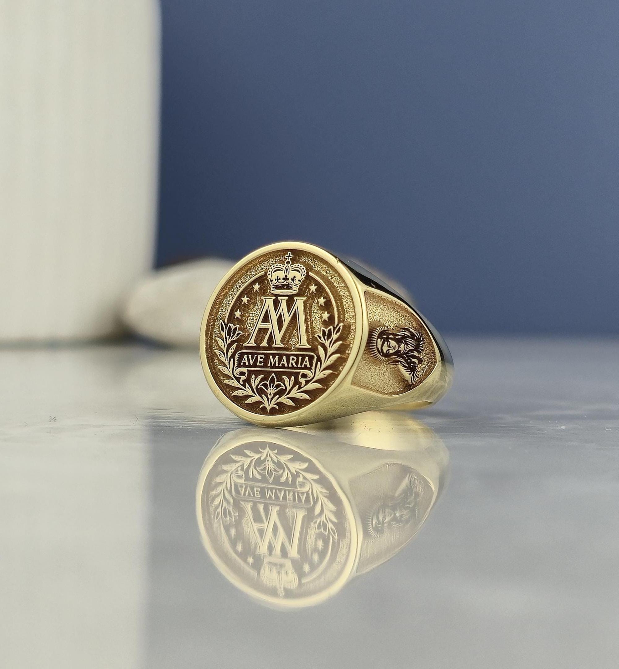 This meaningful ring is carefully designed with one of the most sacred Christian symbolsโthe Ave Maria emblem. The face features crowned "AM" initials and the "Ave Maria" inscription. The sides of the ring are adorned with the Virgin Mary figure and an anchor motif, representing unwavering faith. With exquisite handcrafting and a radiant gold-plated finish, it stands as a timeless symbol of devotion and belief.