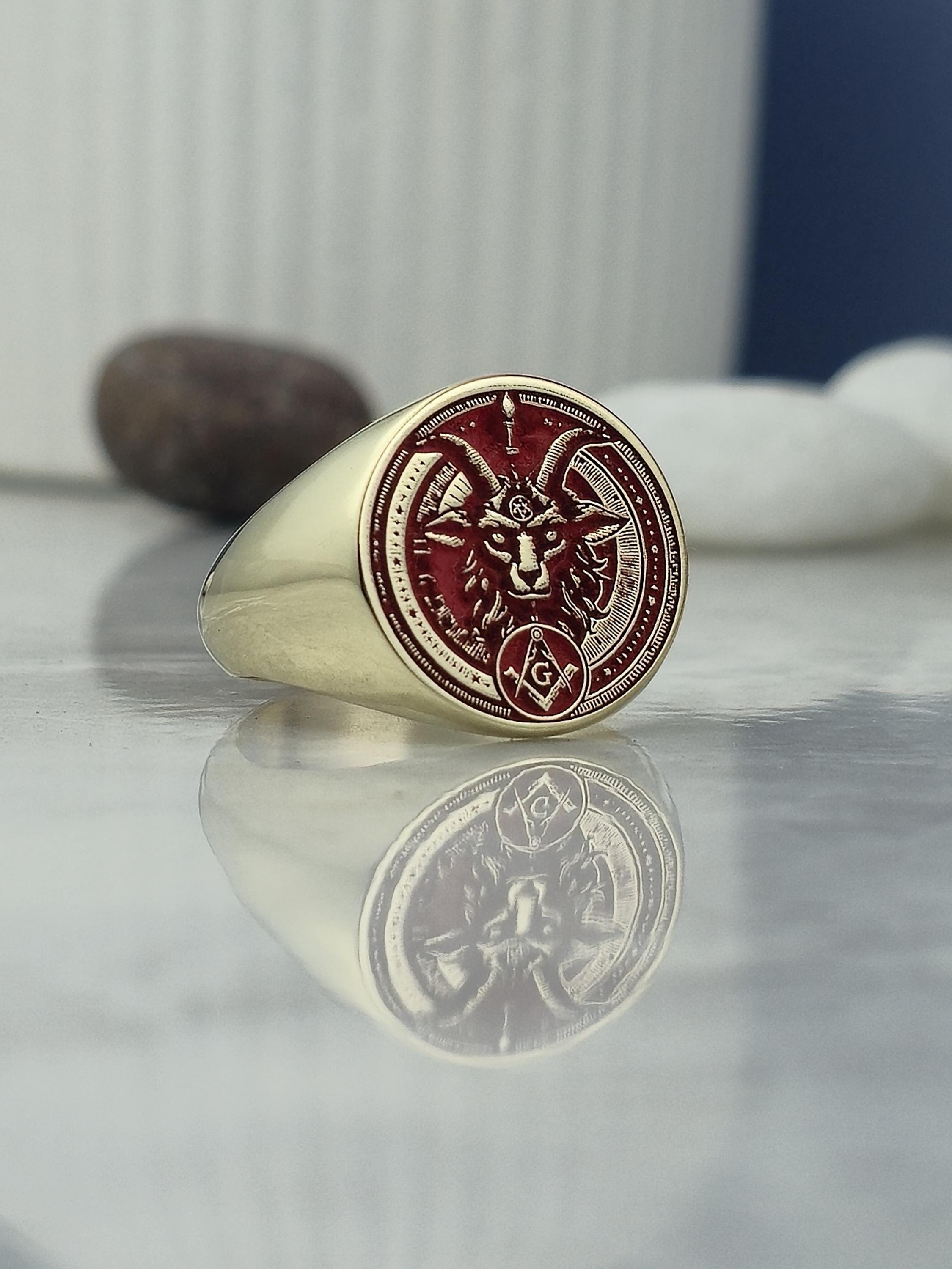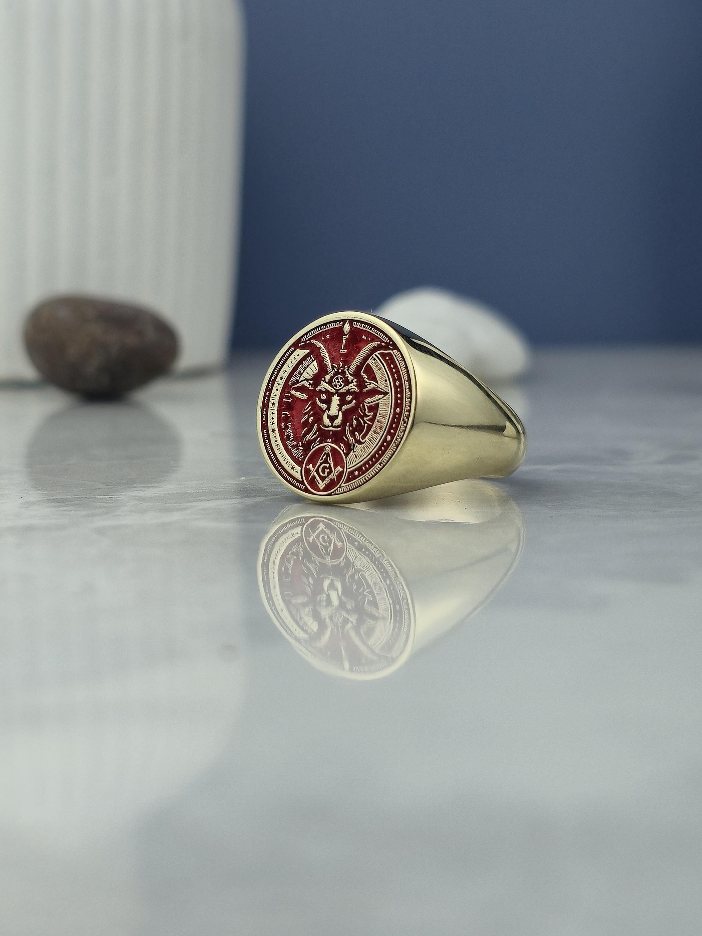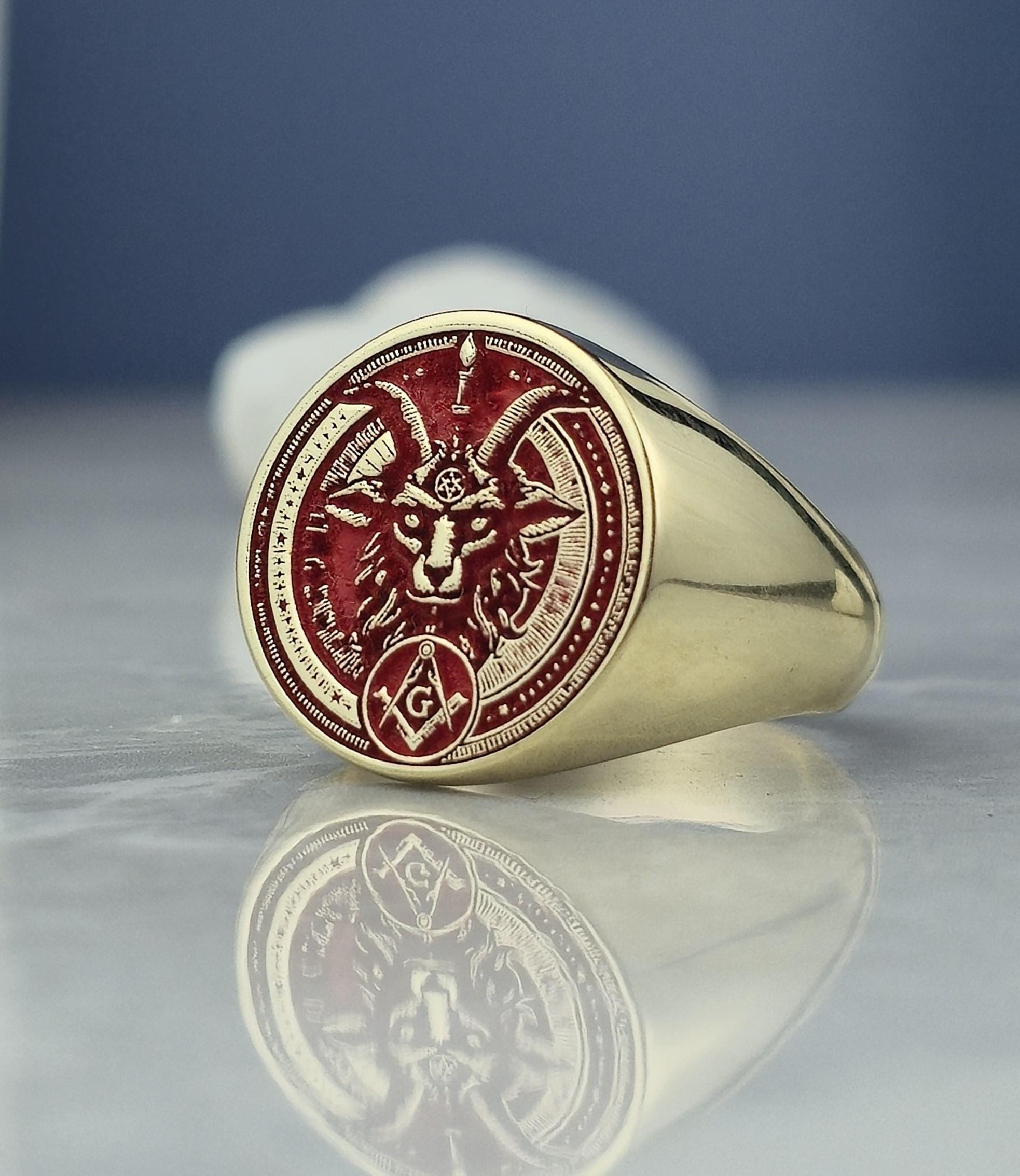 This bold and mystical ring features a red enamel inlay with a meticulously engraved Baphomet head β a symbolic figure deeply rooted in occult philosophy and esoteric traditions. The face also displays Masonic emblems including the square and compass with the letter "G", framed within a round setting filled with symbolic geometric patterns. Crafted from 925 sterling silver and plated with radiant 18K gold, this ring speaks to those who walk the path of spiritual duality and ancient knowledge.