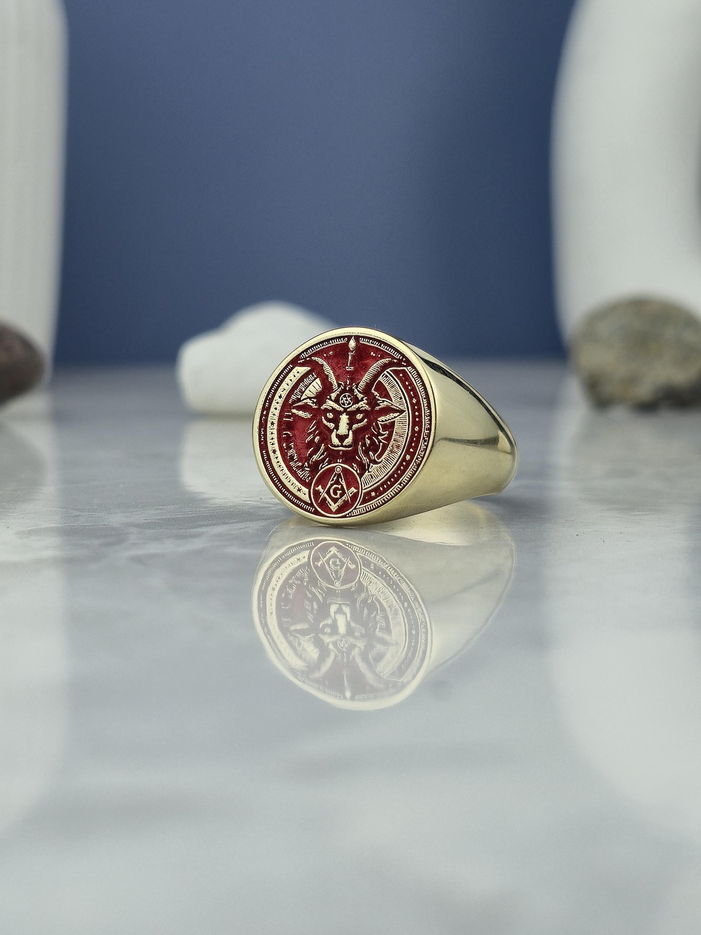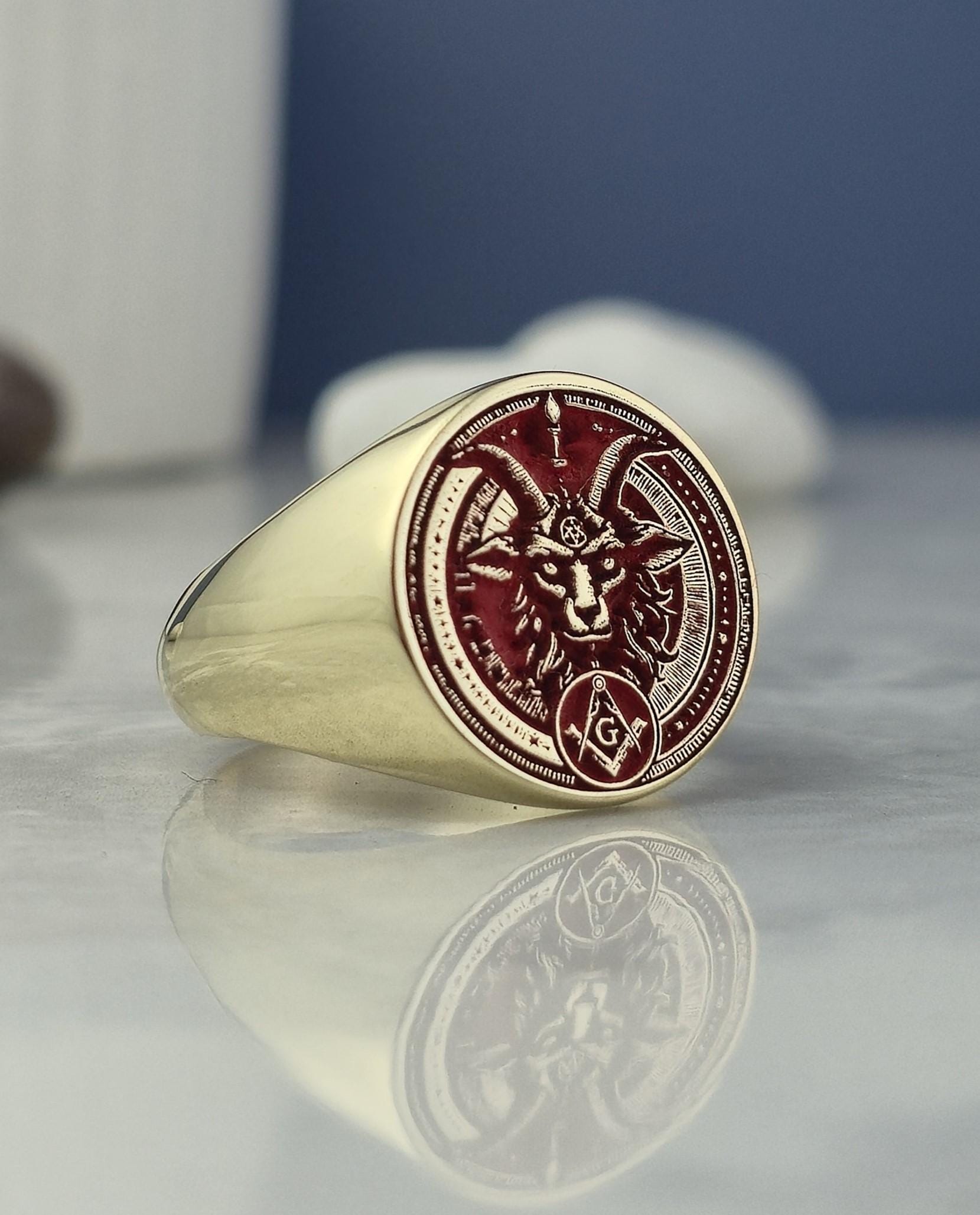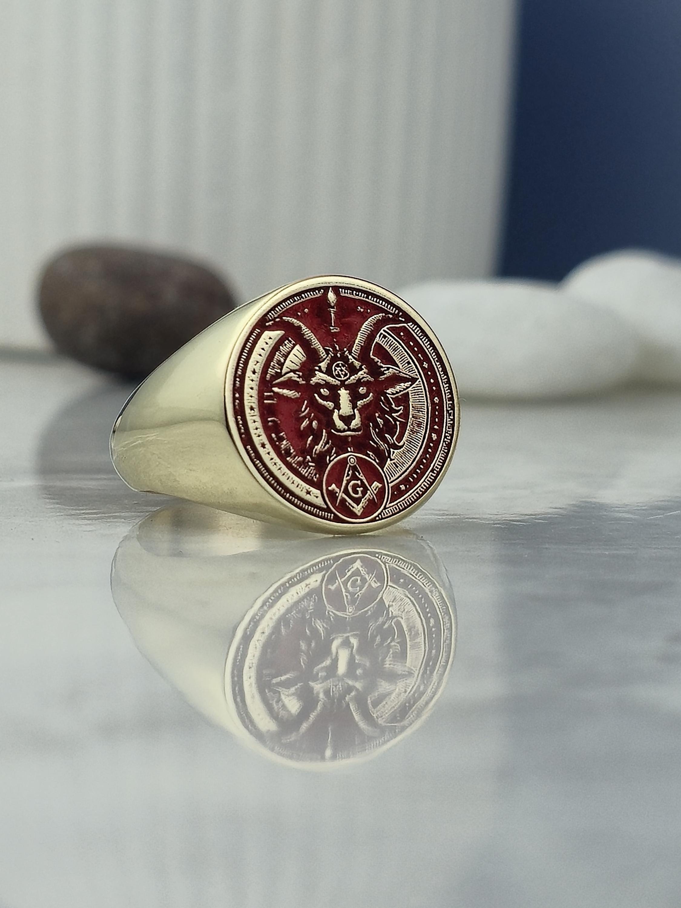 This bold and mystical ring features a red enamel inlay with a meticulously engraved Baphomet head β a symbolic figure deeply rooted in occult philosophy and esoteric traditions. The face also displays Masonic emblems including the square and compass with the letter "G", framed within a round setting filled with symbolic geometric patterns. Crafted from 925 sterling silver and plated with radiant 18K gold, this ring speaks to those who walk the path of spiritual duality and ancient knowledge.