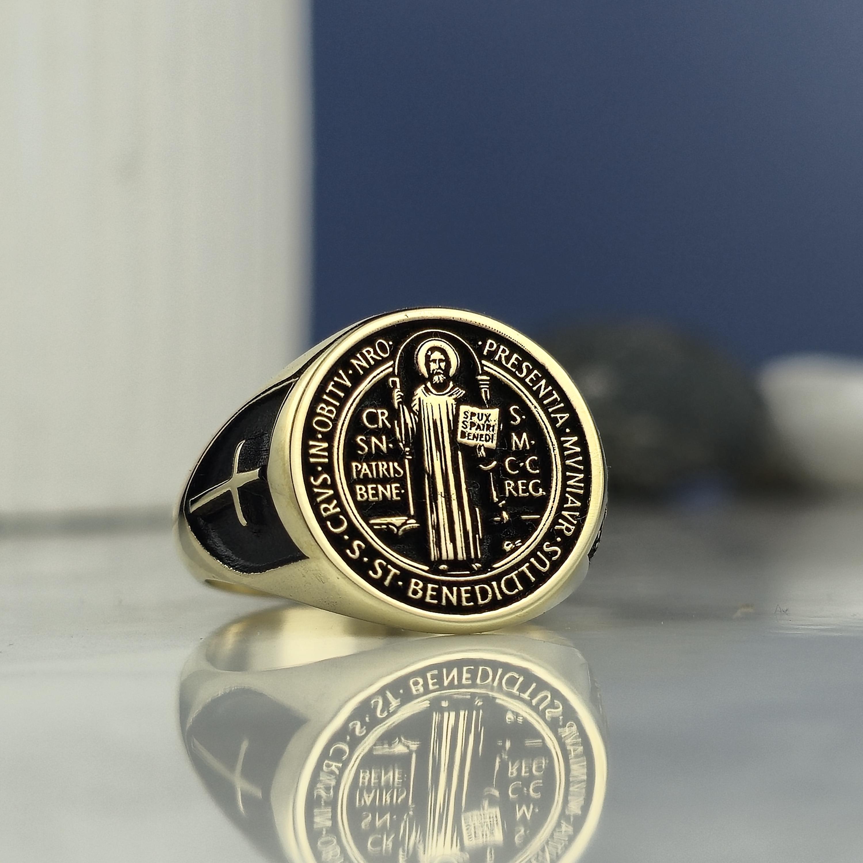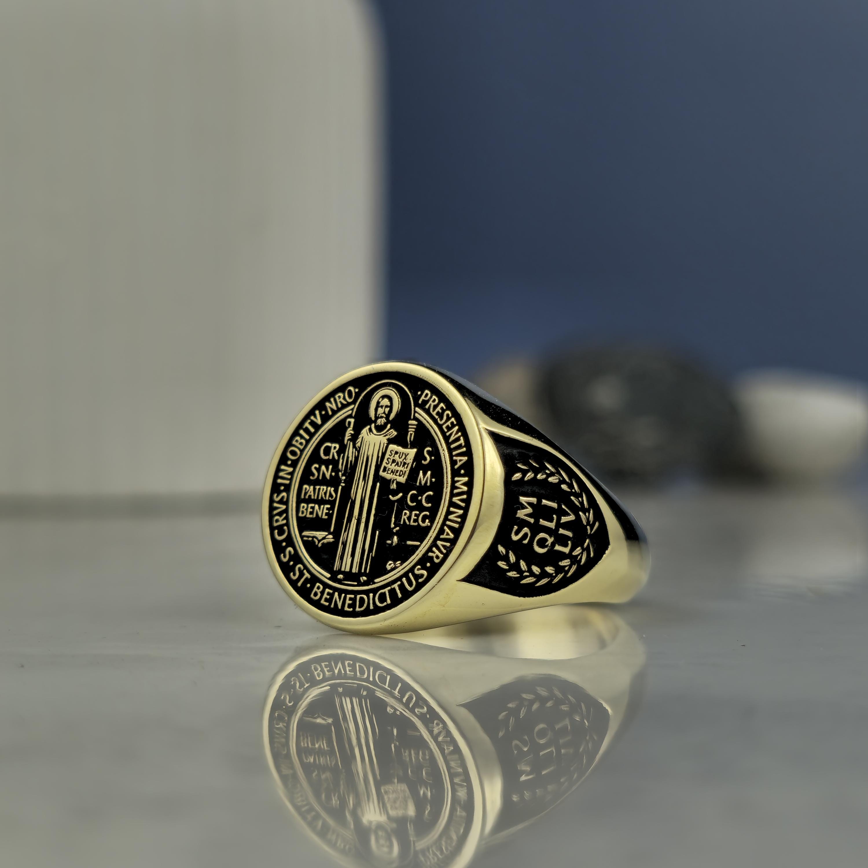 Gold Saint Benedict Signet Ring: Sterling Silver Catholic Medal, Unisex Religious Jewelry