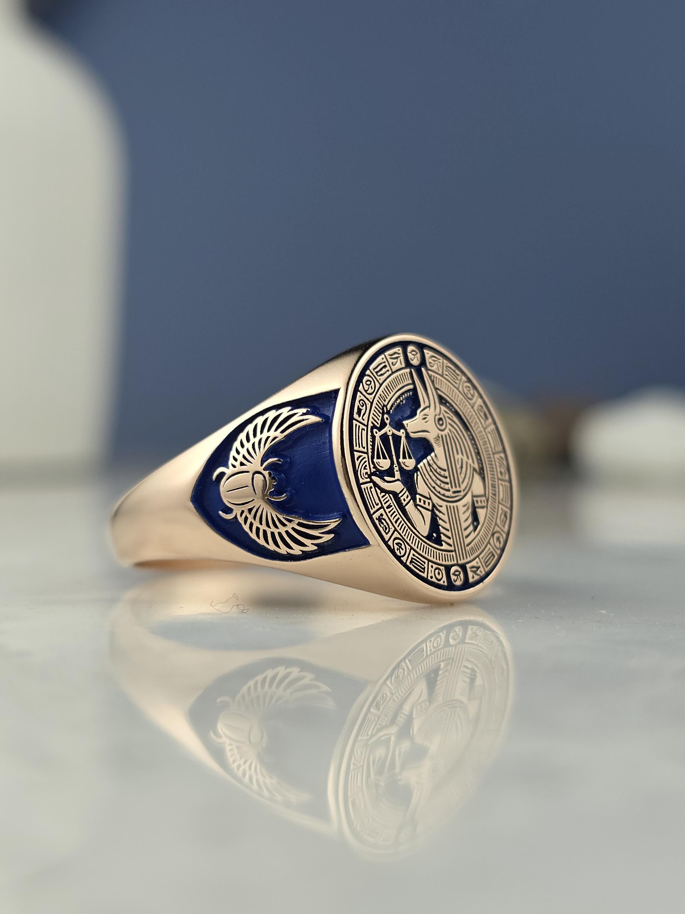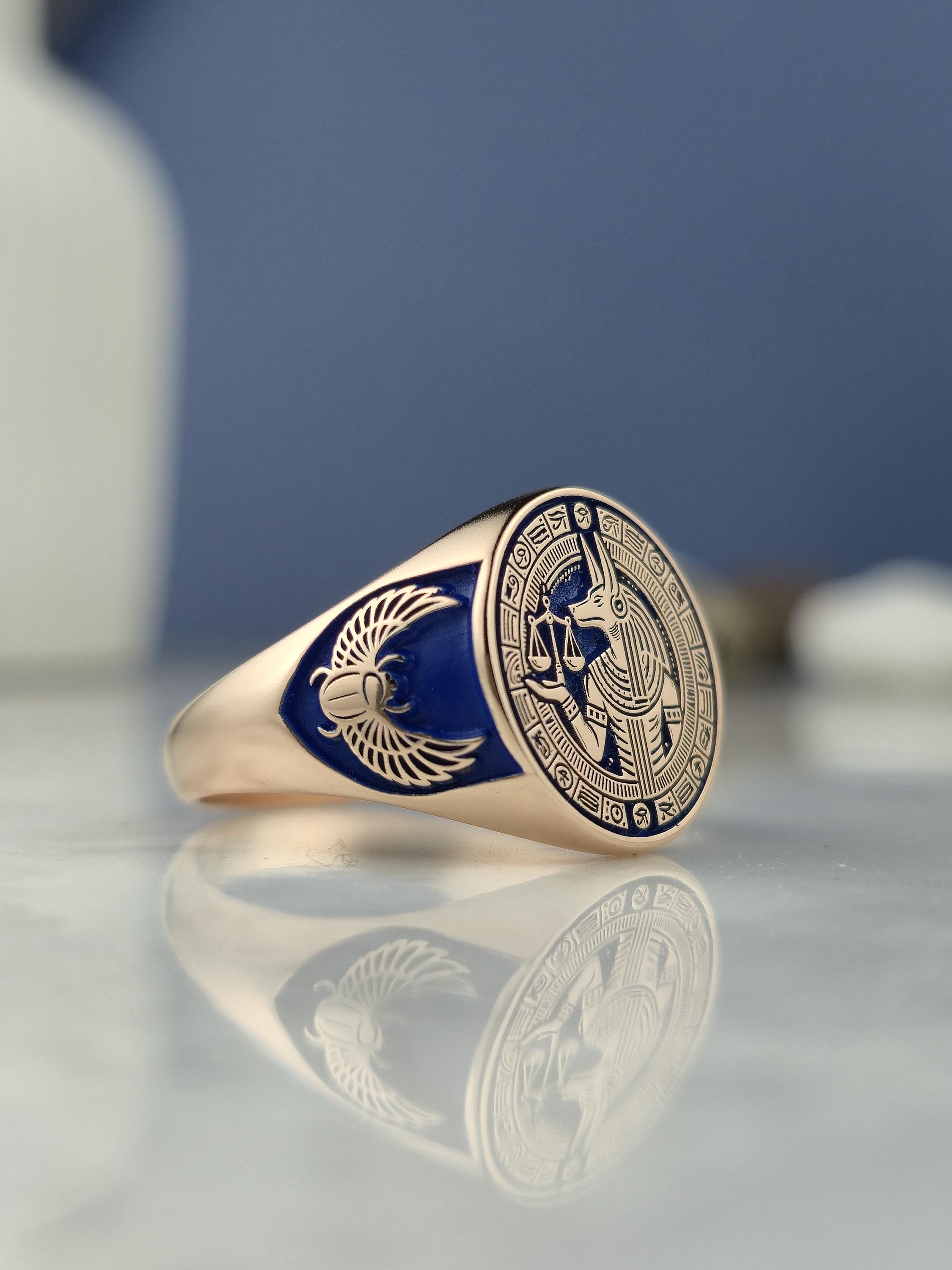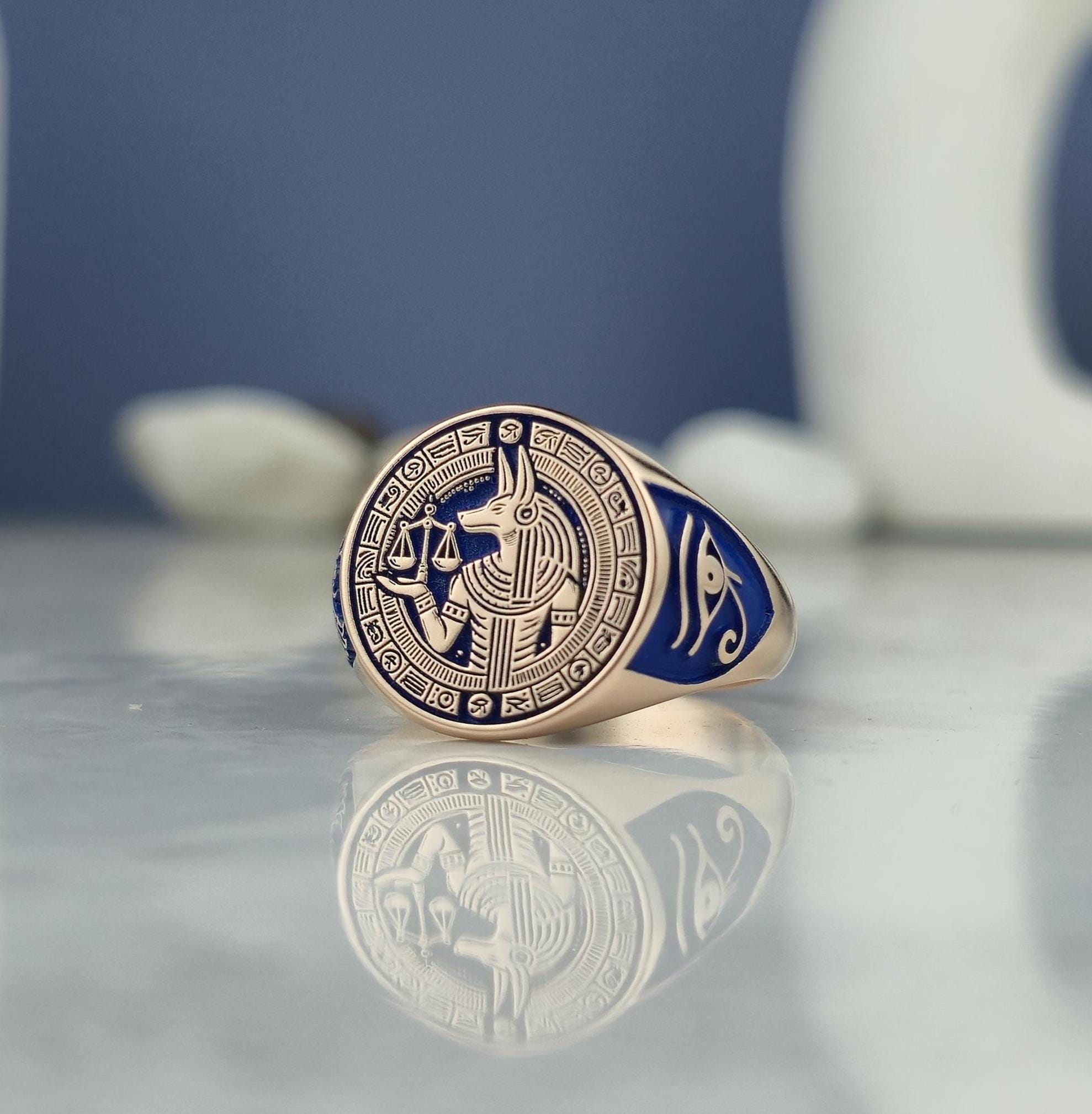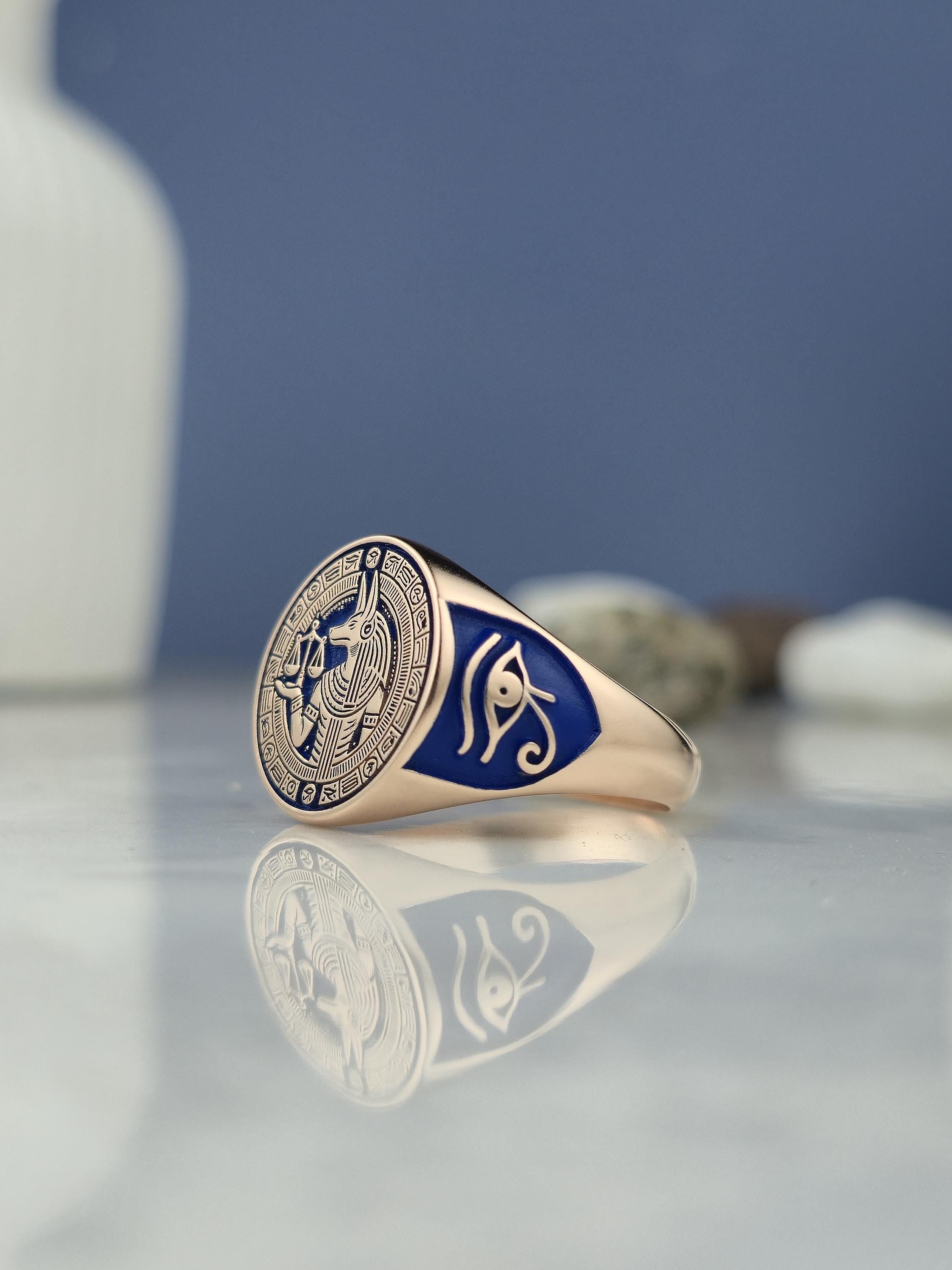 Rose Gold Anubis Signet Ring: Blue Enamel, Eye of Horus, Sterling Silver