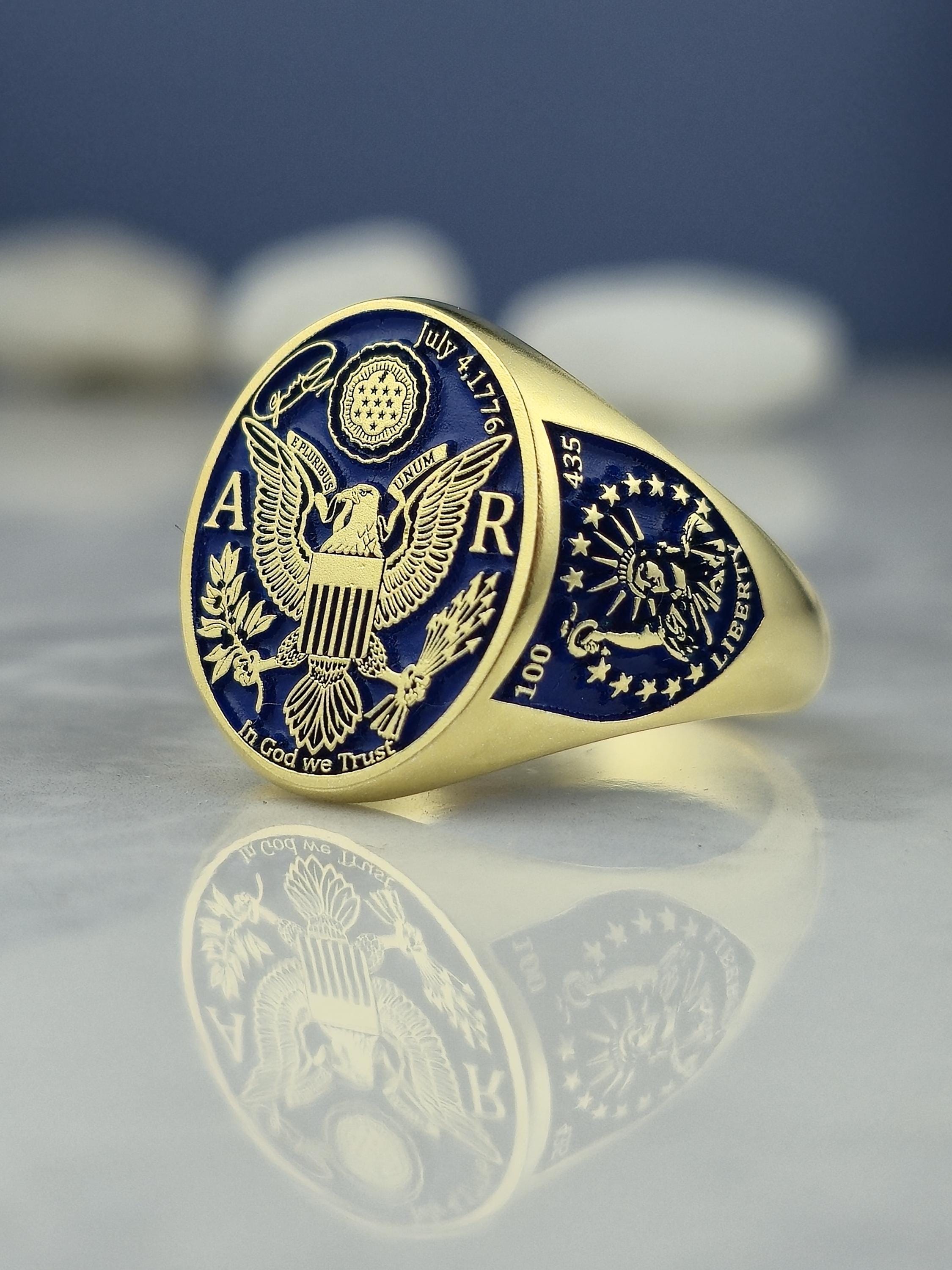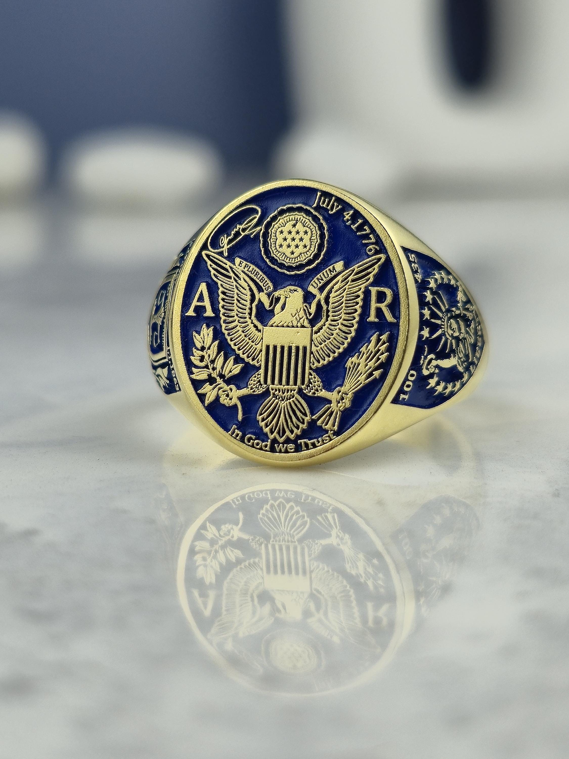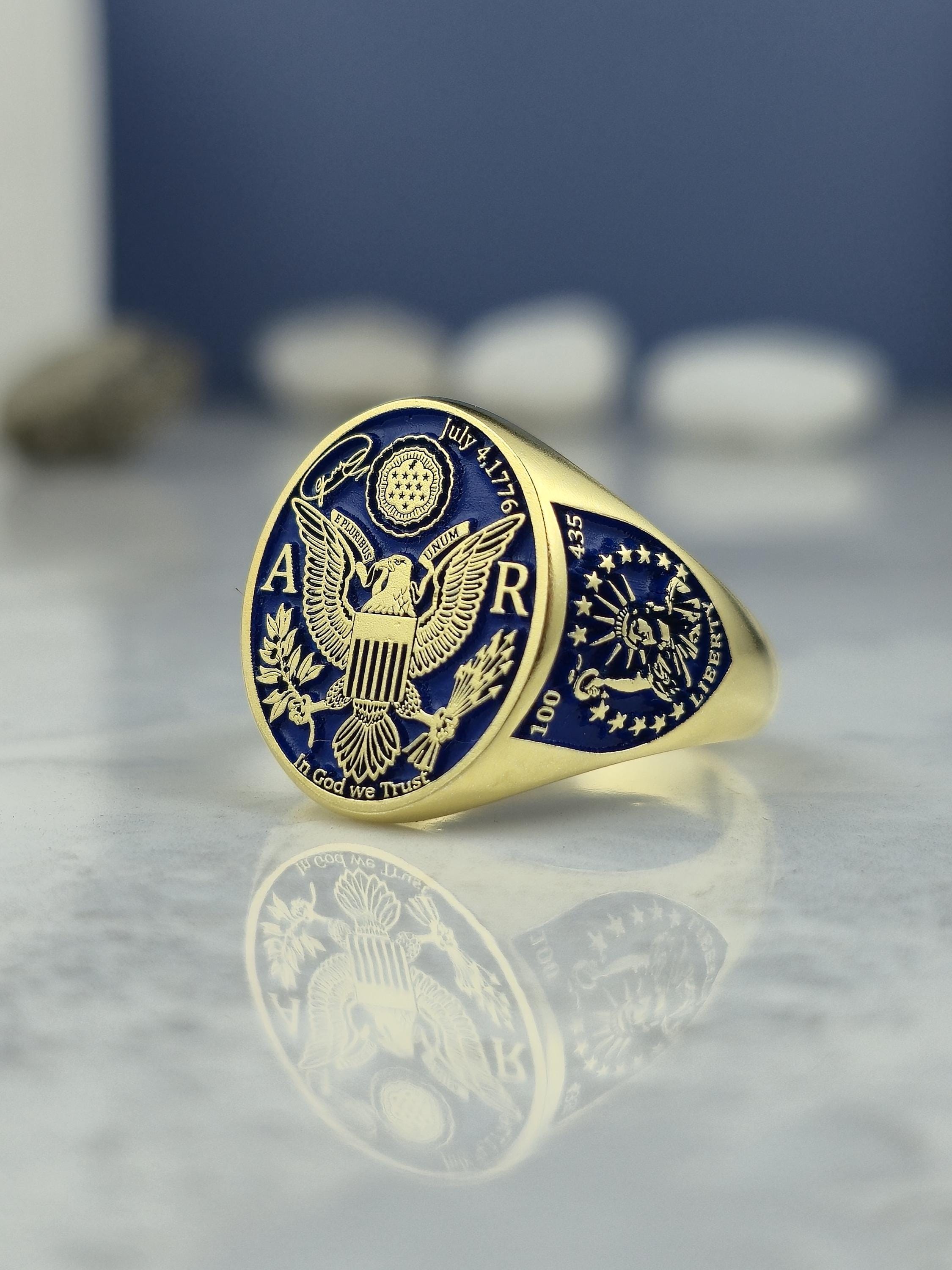 This exquisite ring is meticulously handcrafted from 925 sterling silver and finished with an opulent 18K gold plating, creating a luxurious base for its deep blue enamel detailing. At the center, it proudly features the iconic U.S. national emblem: the majestic bald eagle with wings spread wide, clutching the olive branch of peace in one talon and arrows of strength in the other. Framed above by thirteen radiant stars representing the original colonies and below with the national motto “In God We Trust,” this design is more than a ring—it's a wearable tribute to strength, faith, and unity.