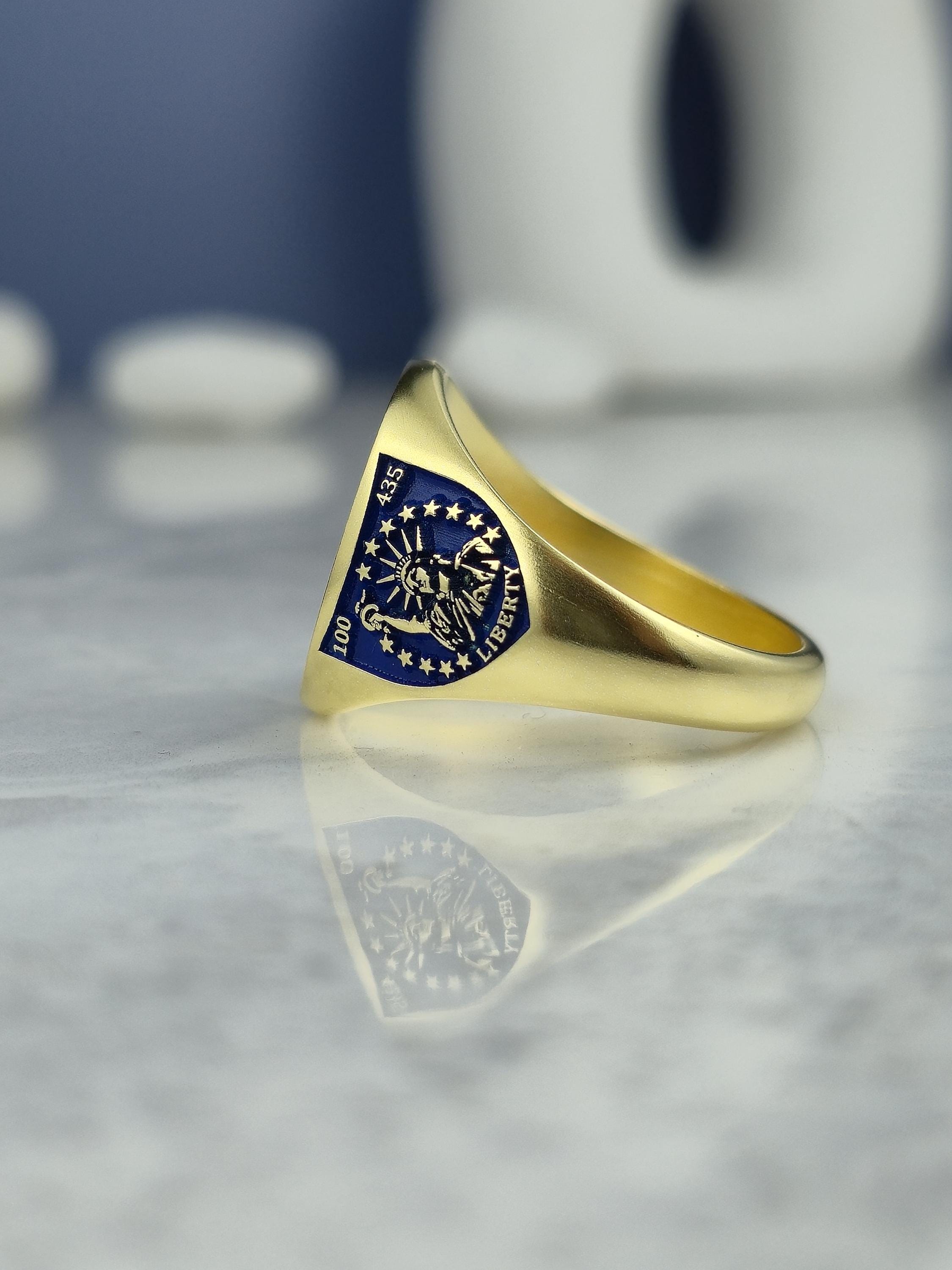 Embrace the power of legacy, symbolism, and craftsmanship with this magnificent gold-plated family crest ring, a truly meaningful piece of heraldic jewelry that blends tradition with bold American identity. 🦅💙⚜️
