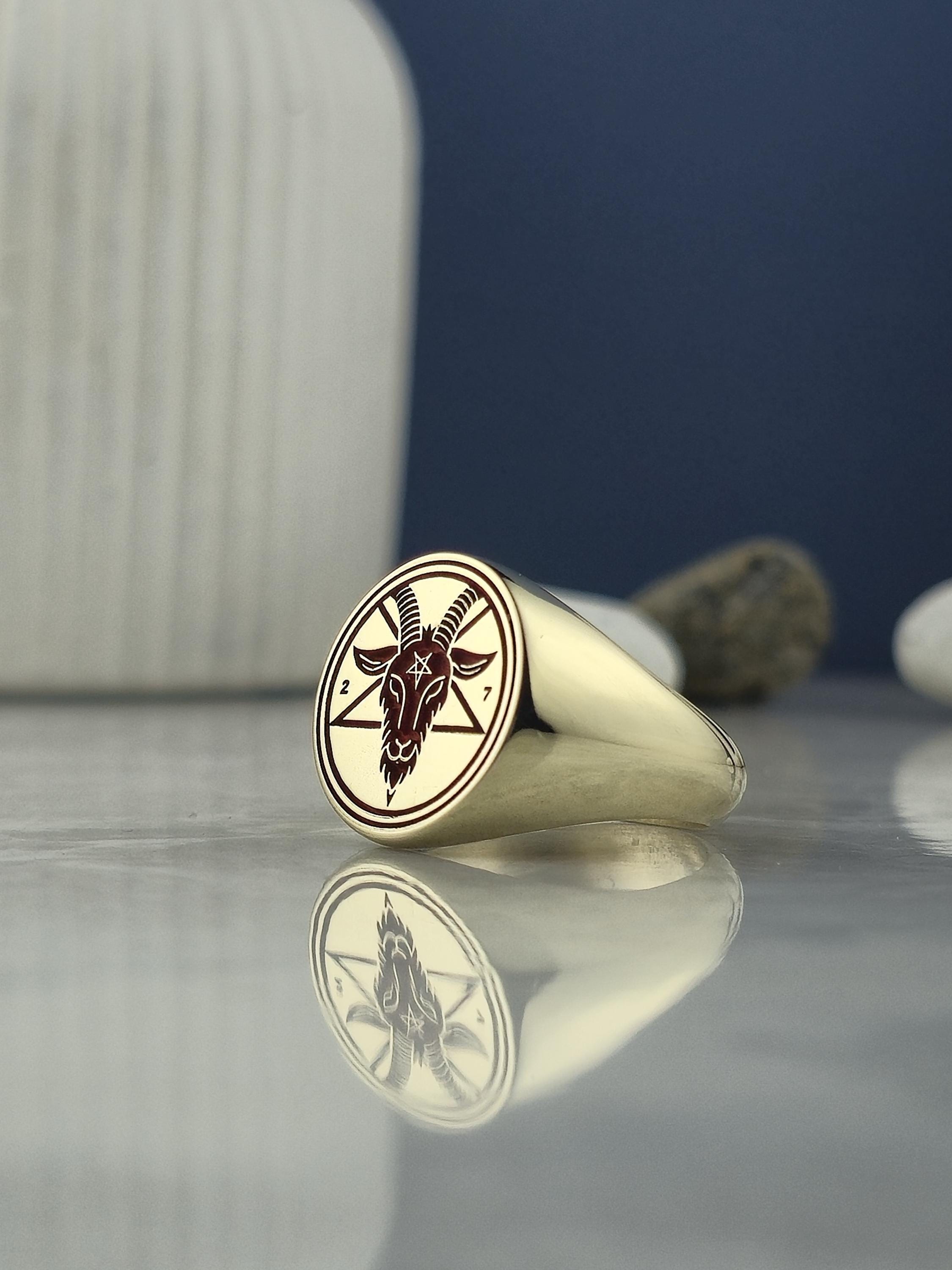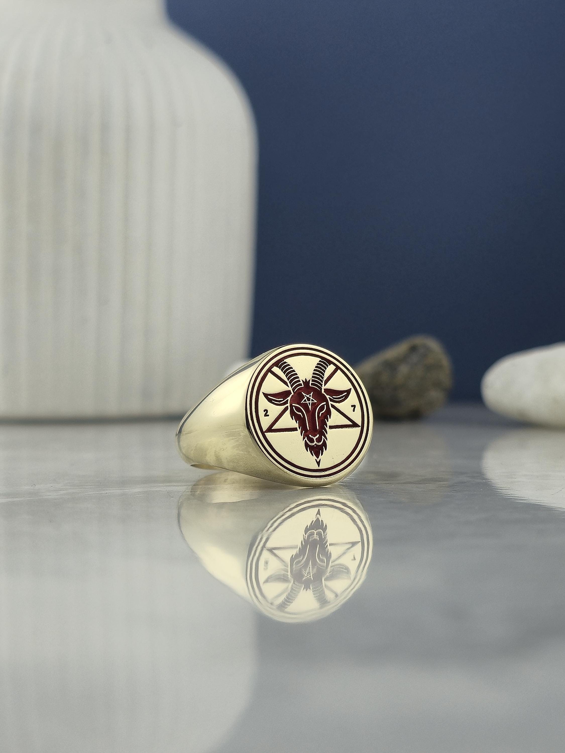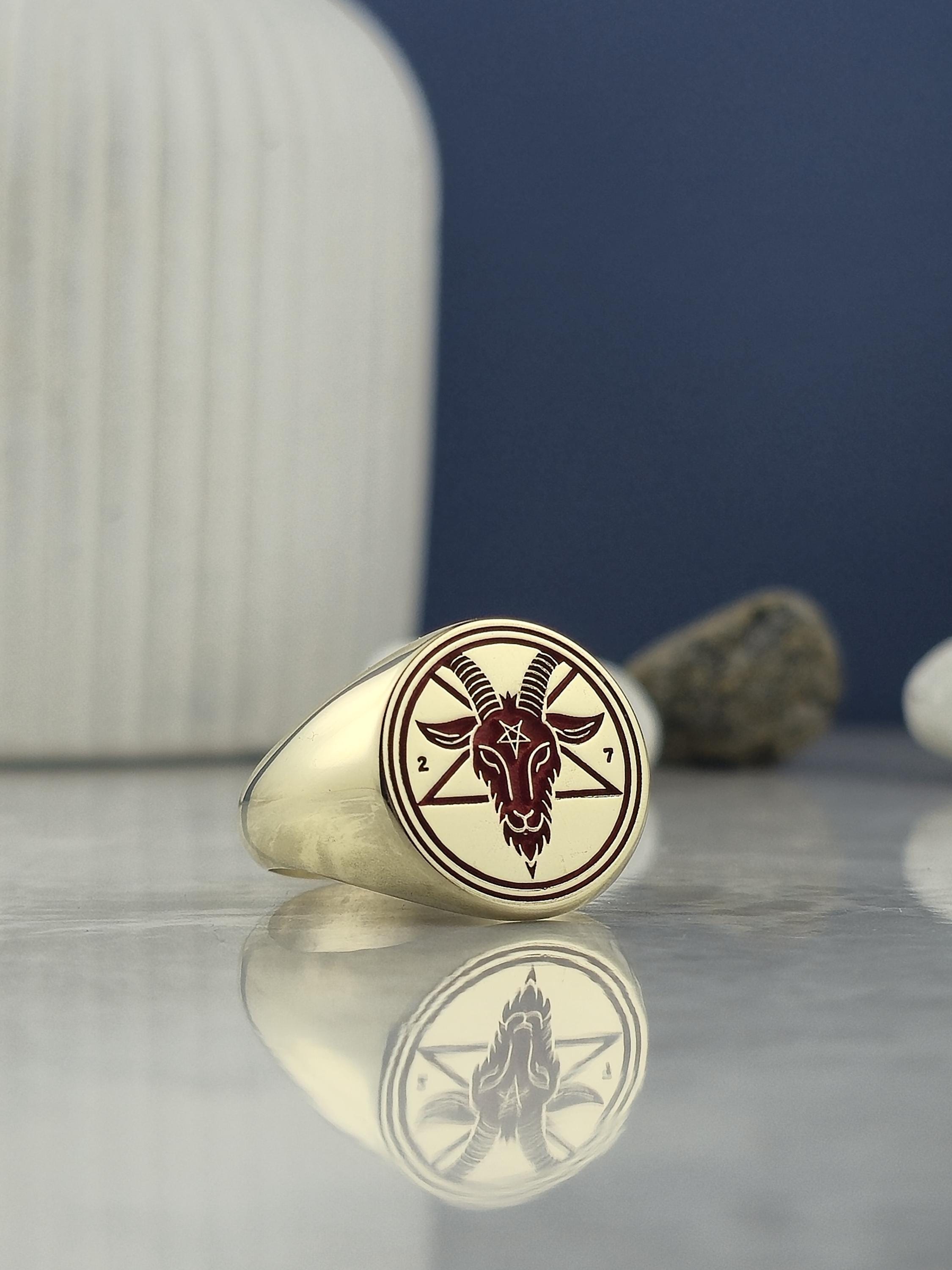 Design: The face of the ring features a red enameled Baphomet head, featuring an inverted pentagram and the symbols 2 and 7.