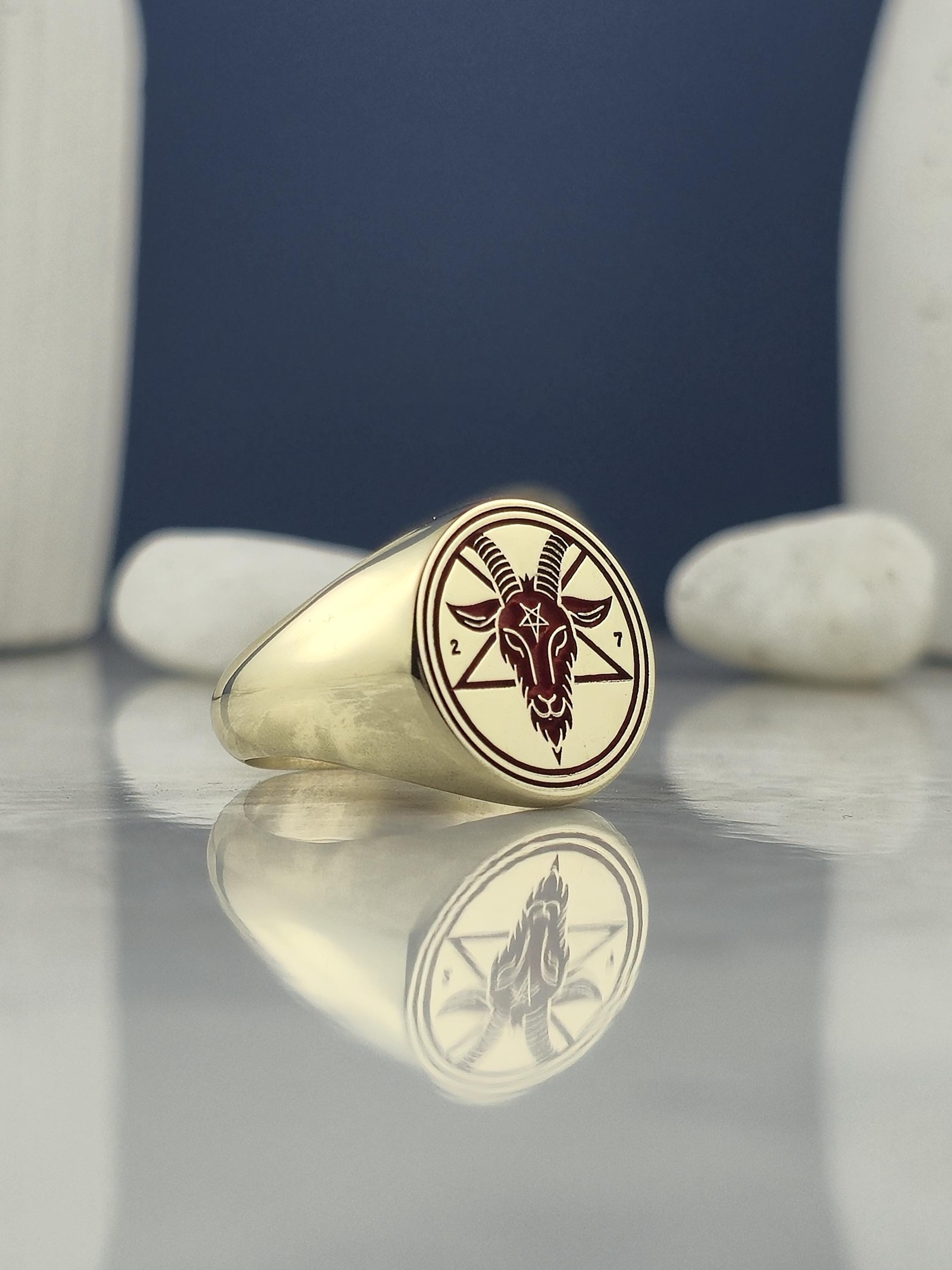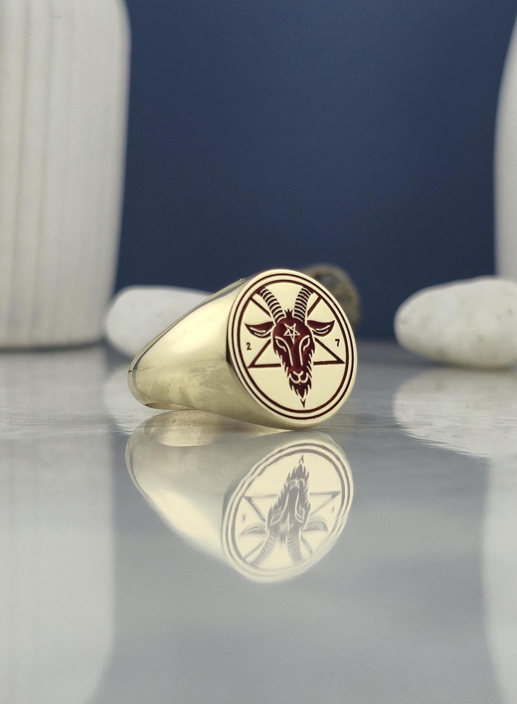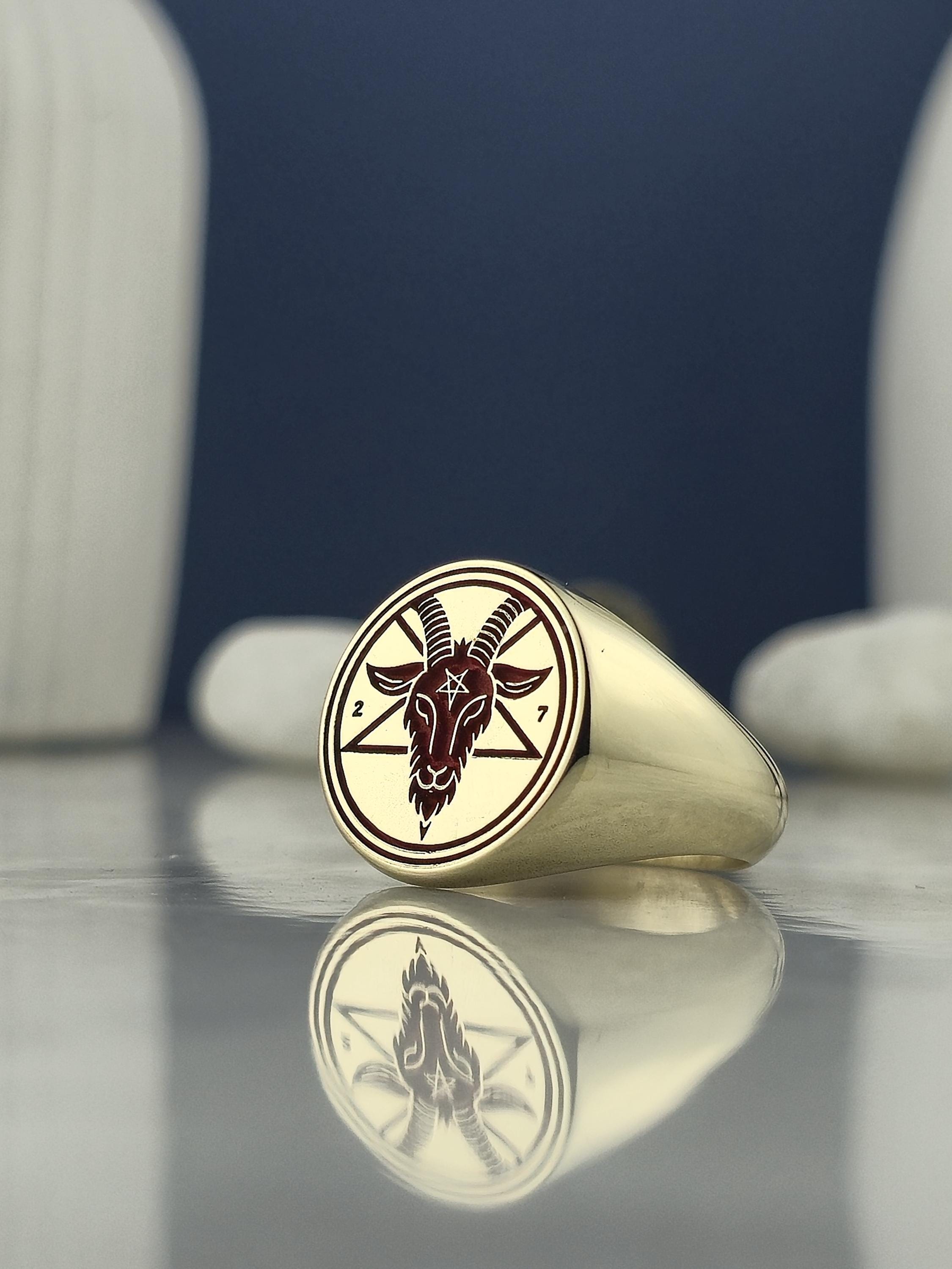 Design: The face of the ring features a red enameled Baphomet head, featuring an inverted pentagram and the symbols 2 and 7.