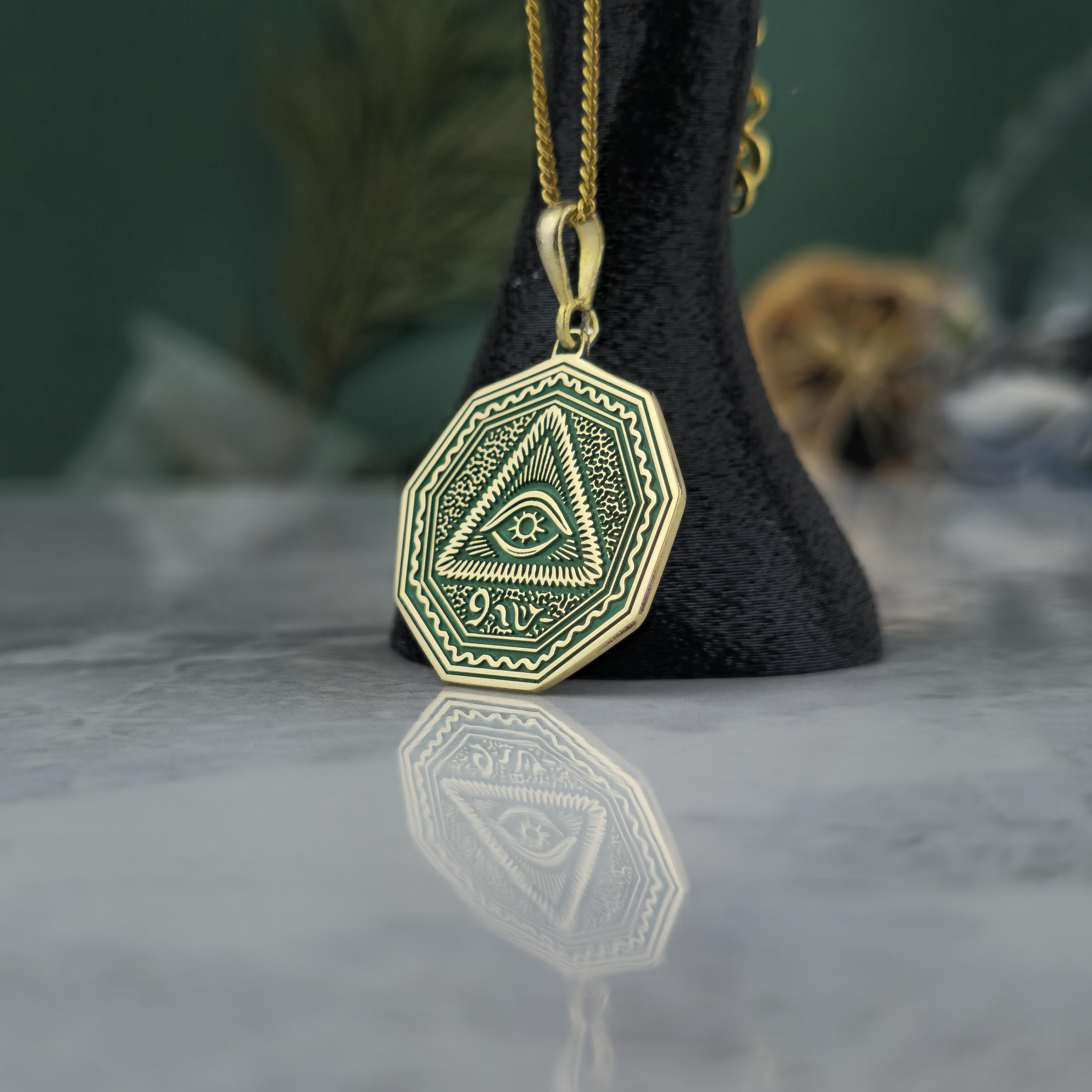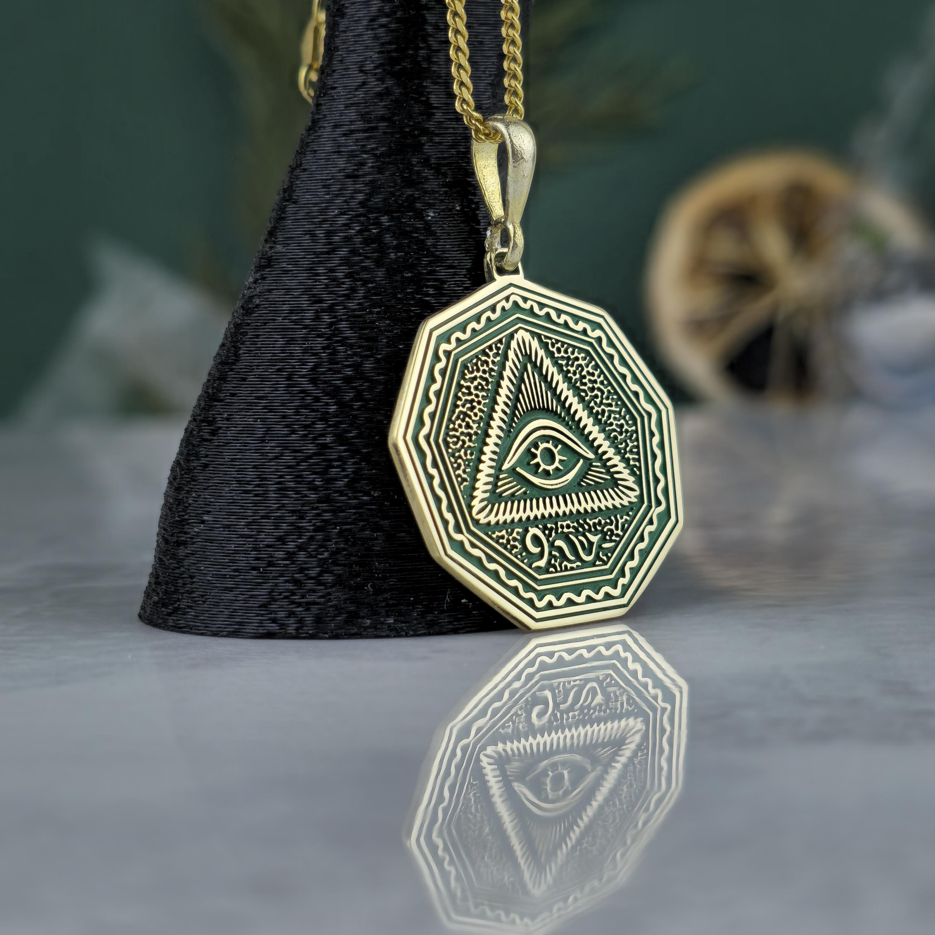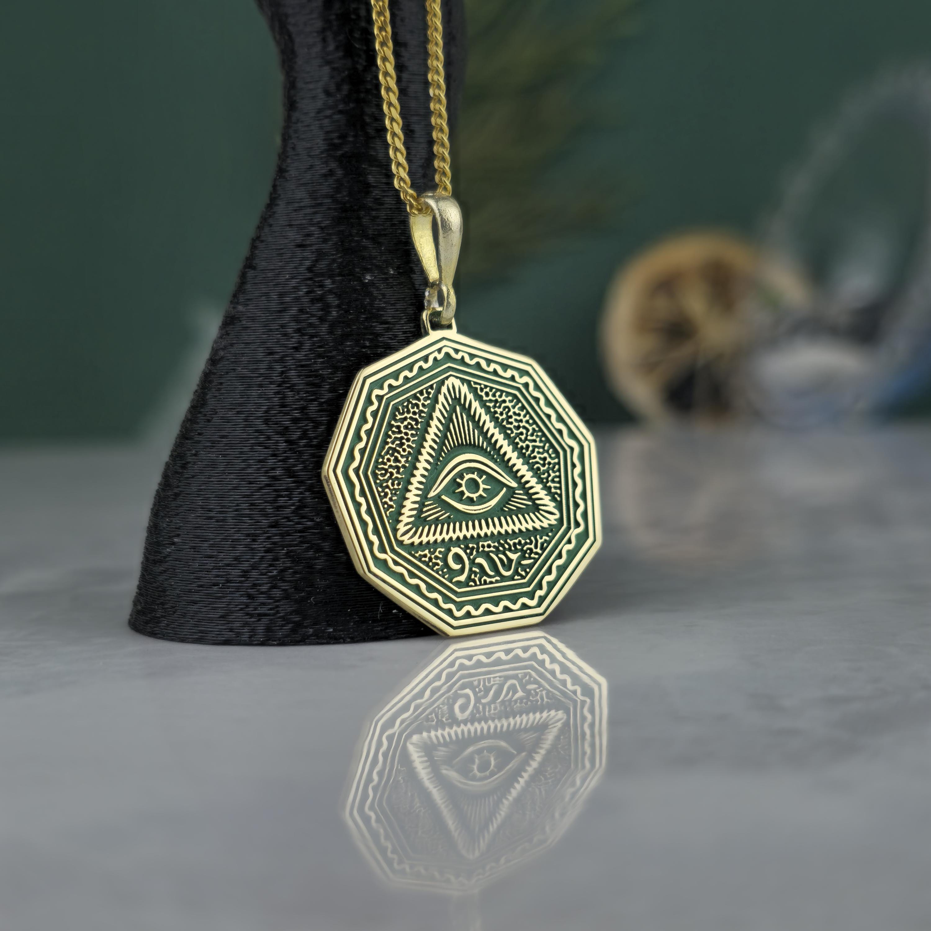🔺 Design: Octagon medallion with engraved All Seeing Eye triangle