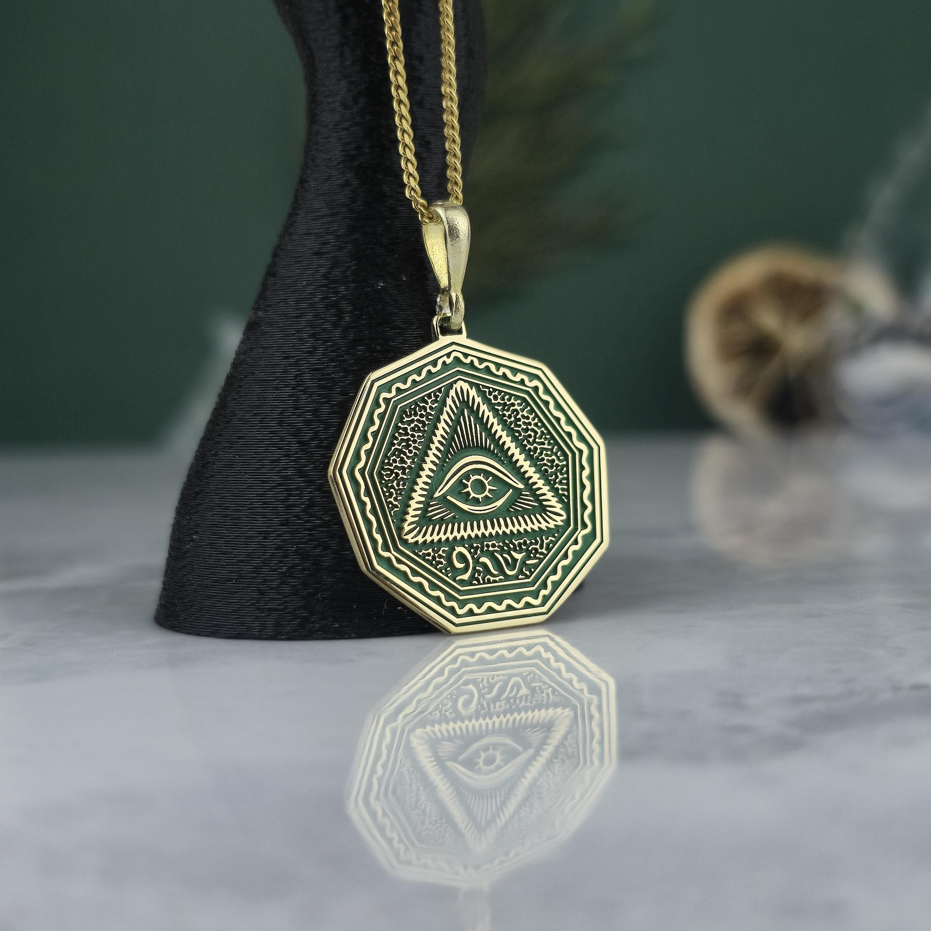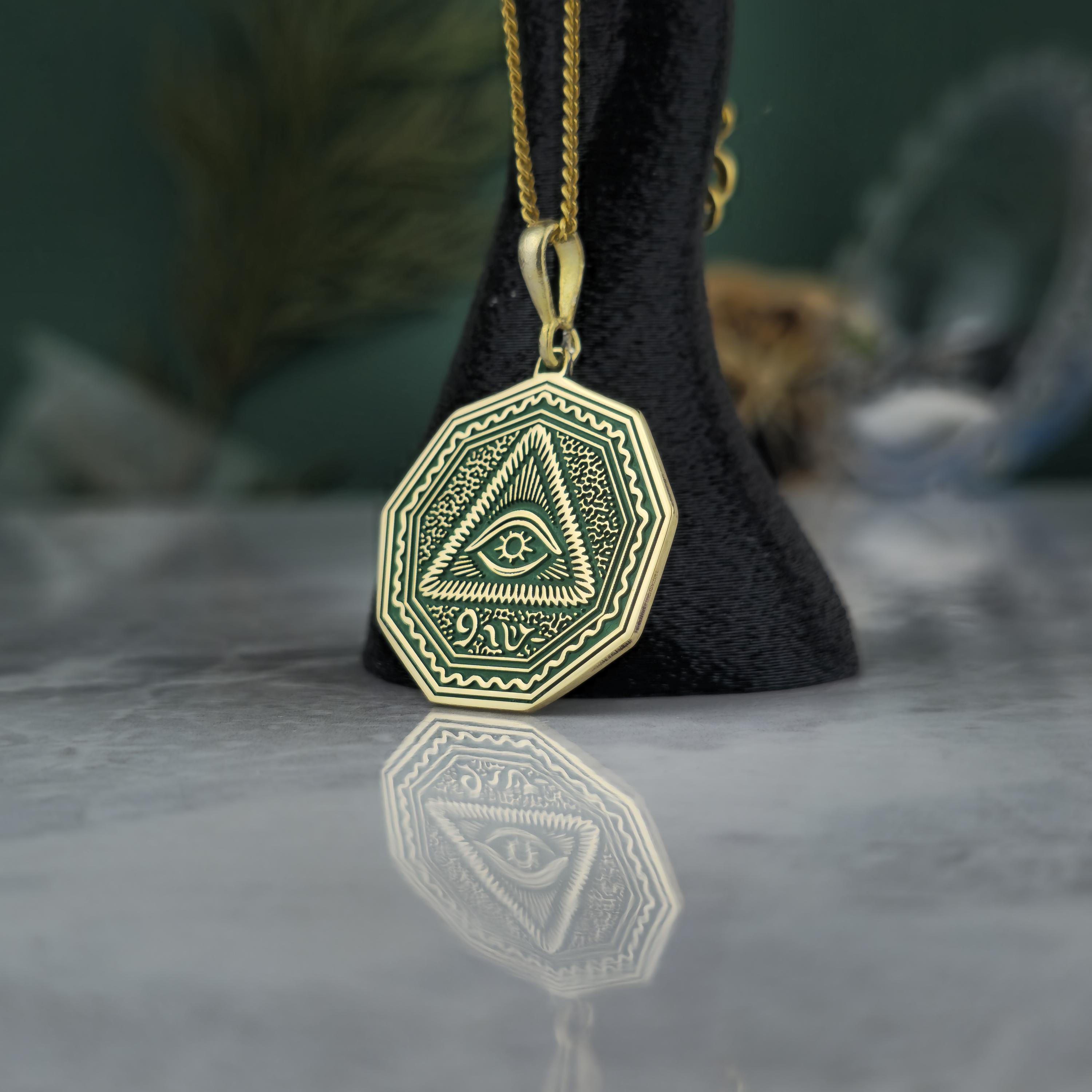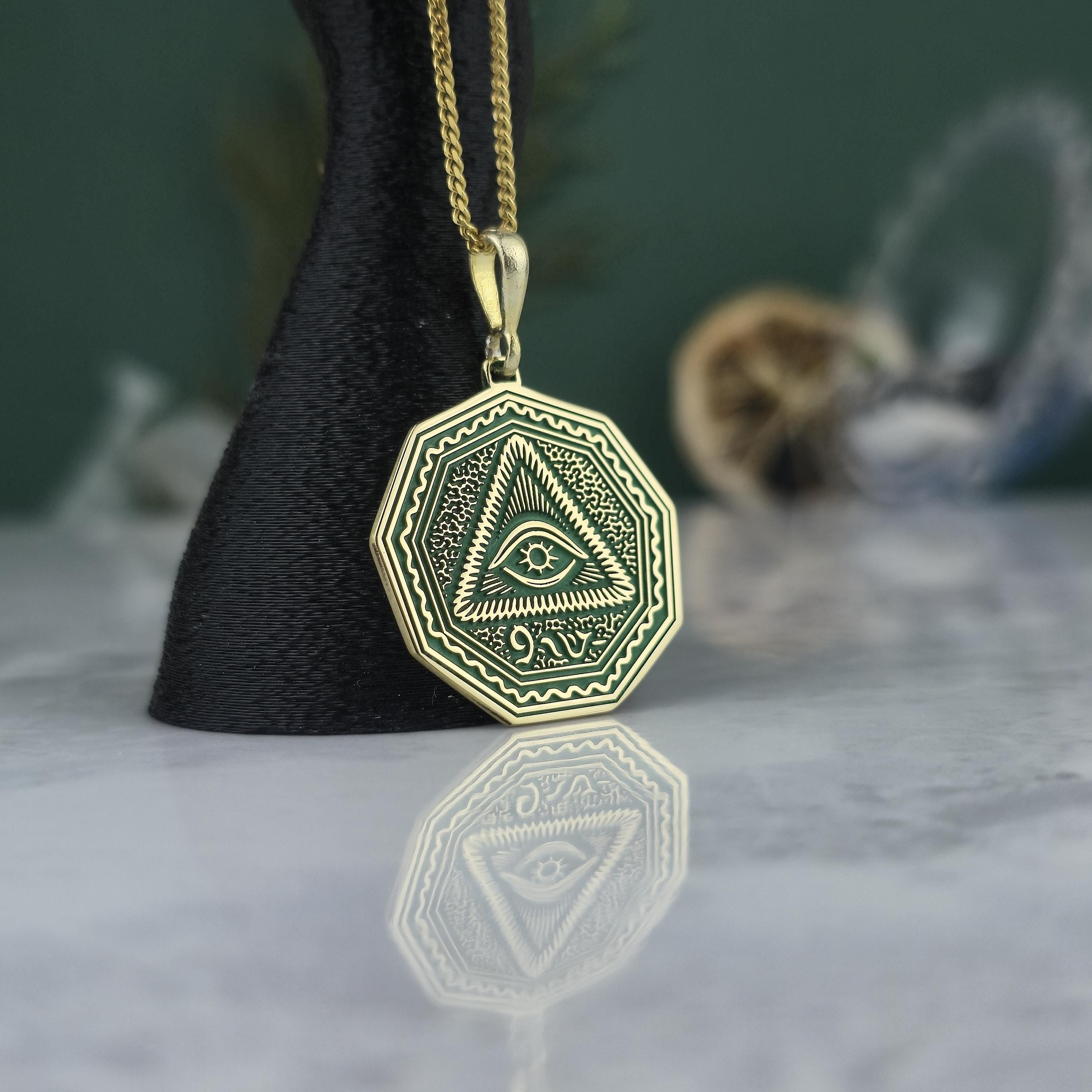 🔺 Design: Octagon medallion with engraved All Seeing Eye triangle