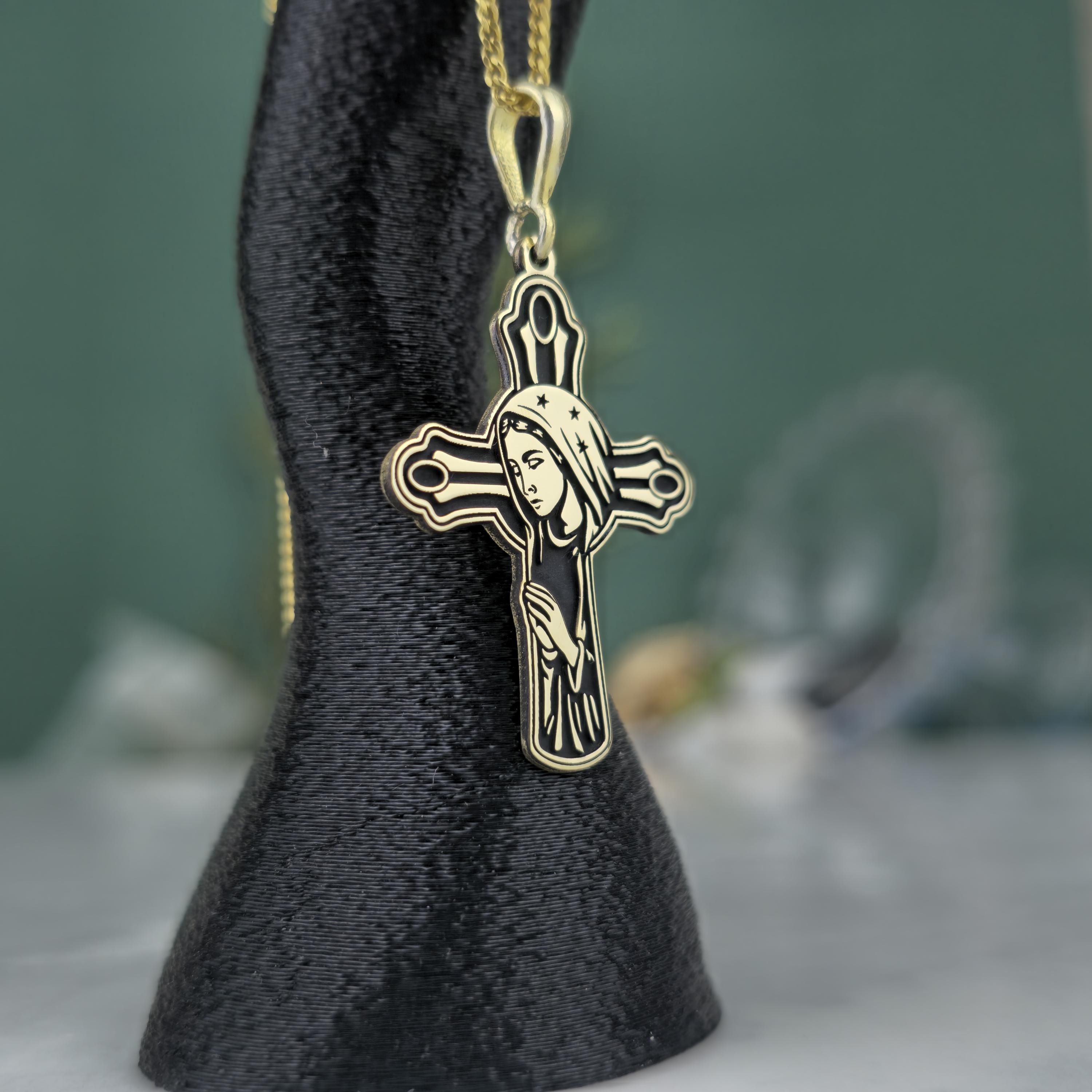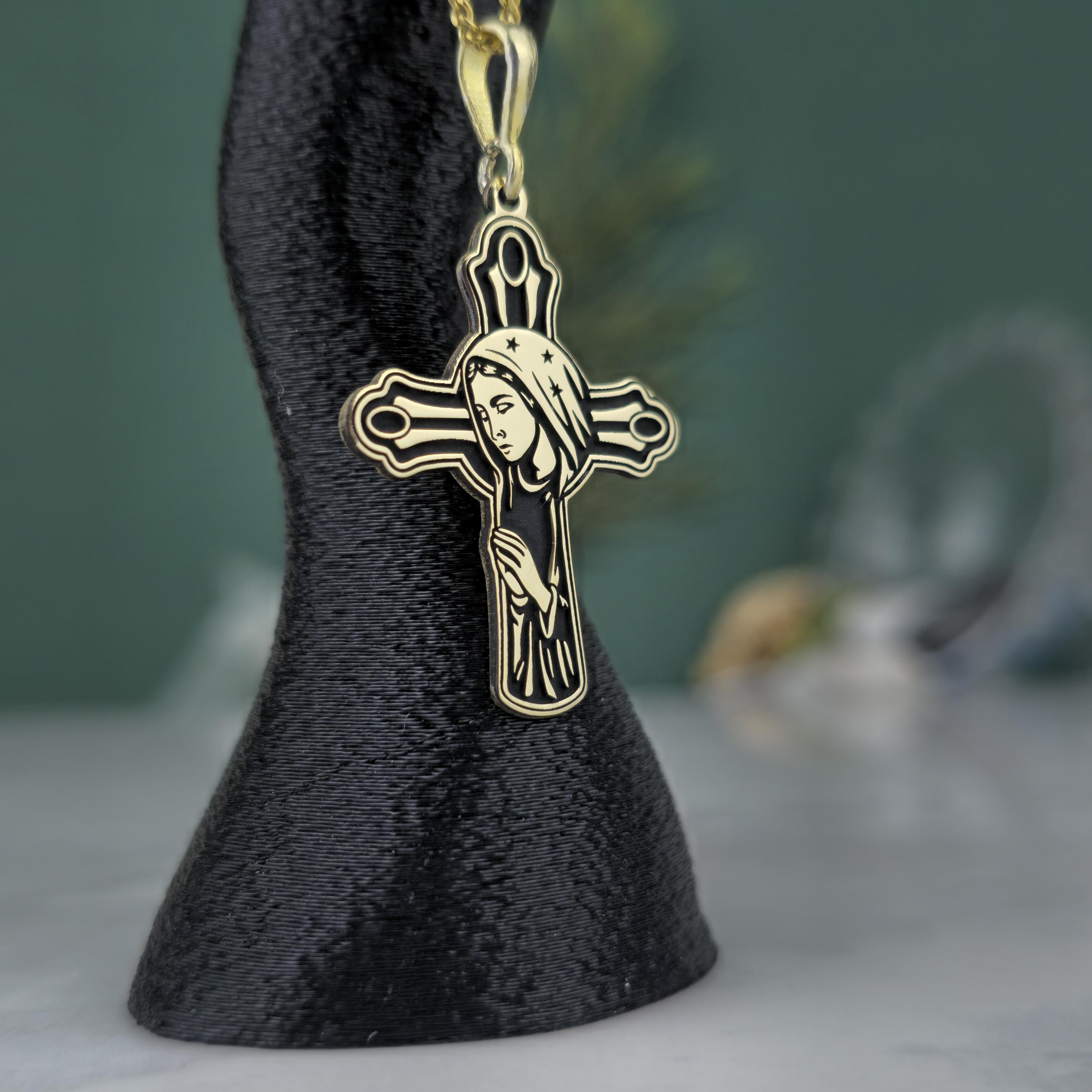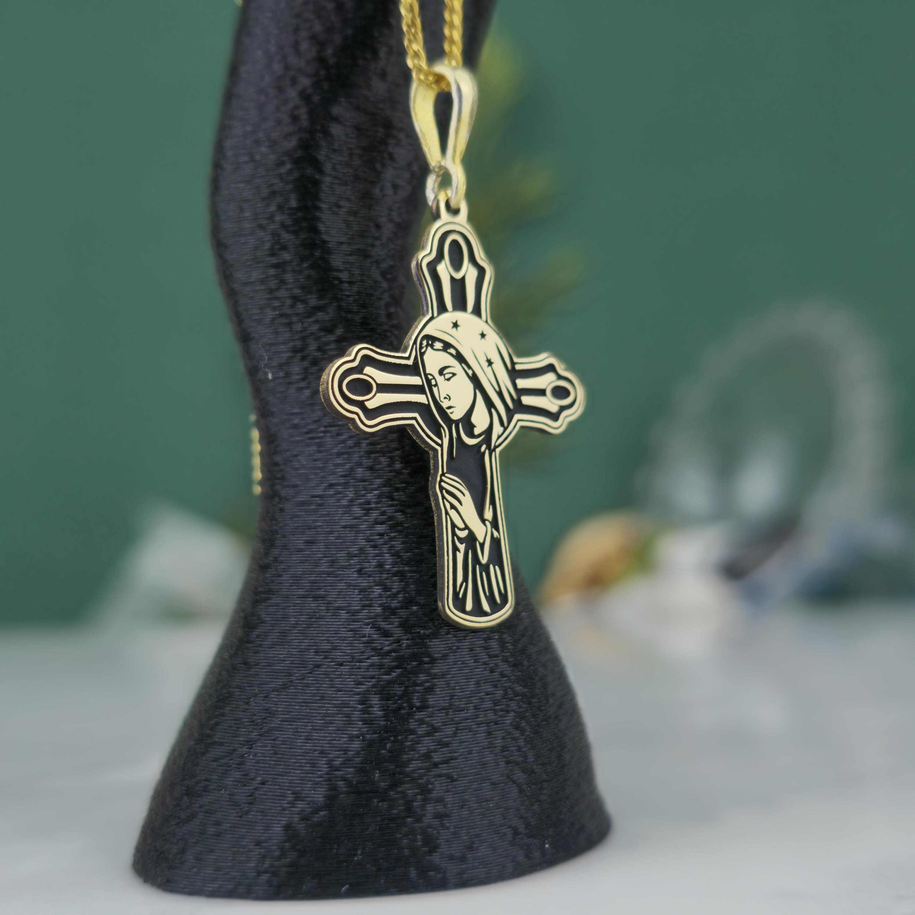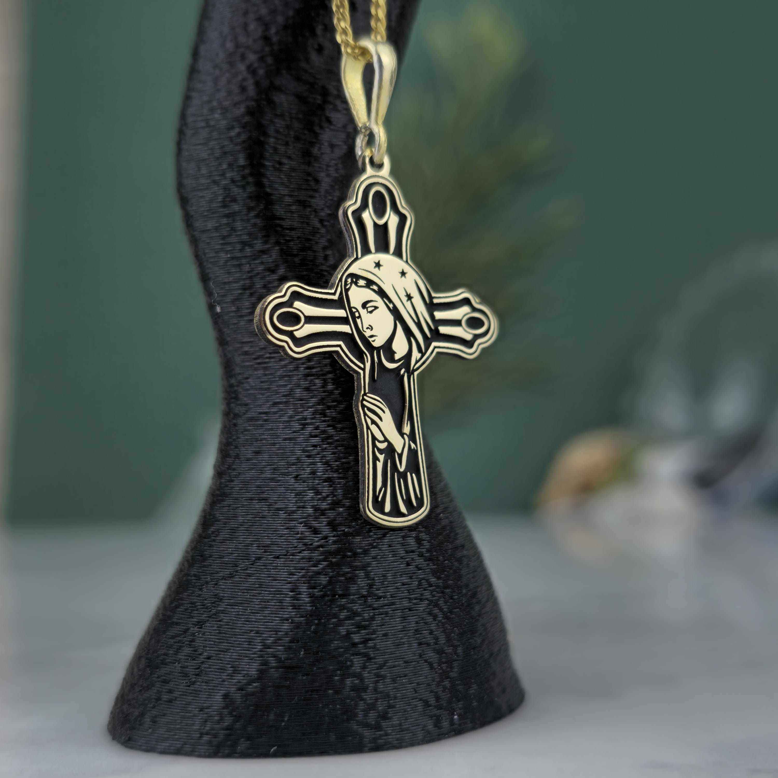 ✝️ Design: Cross-shaped pendant with the Virgin Mary engraving