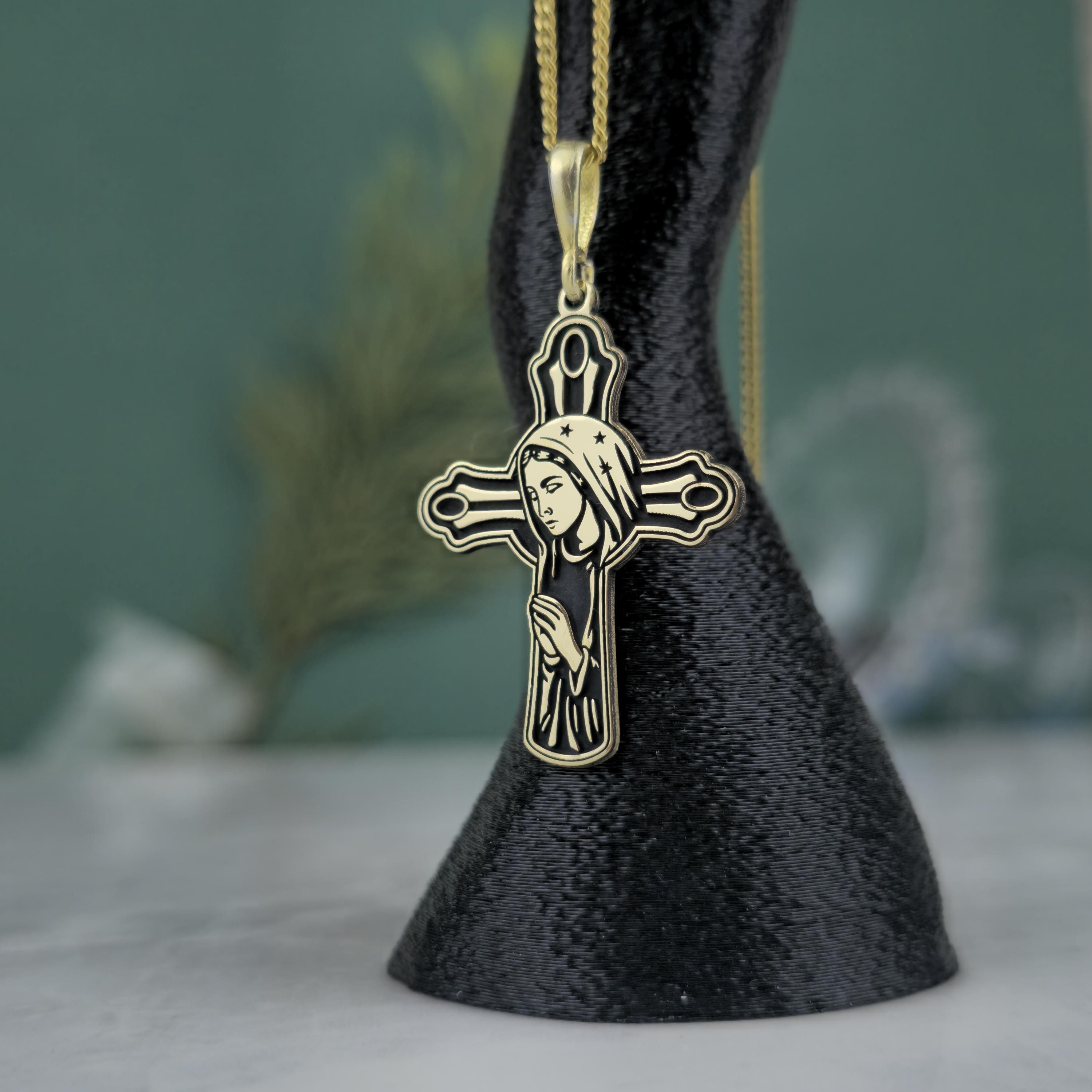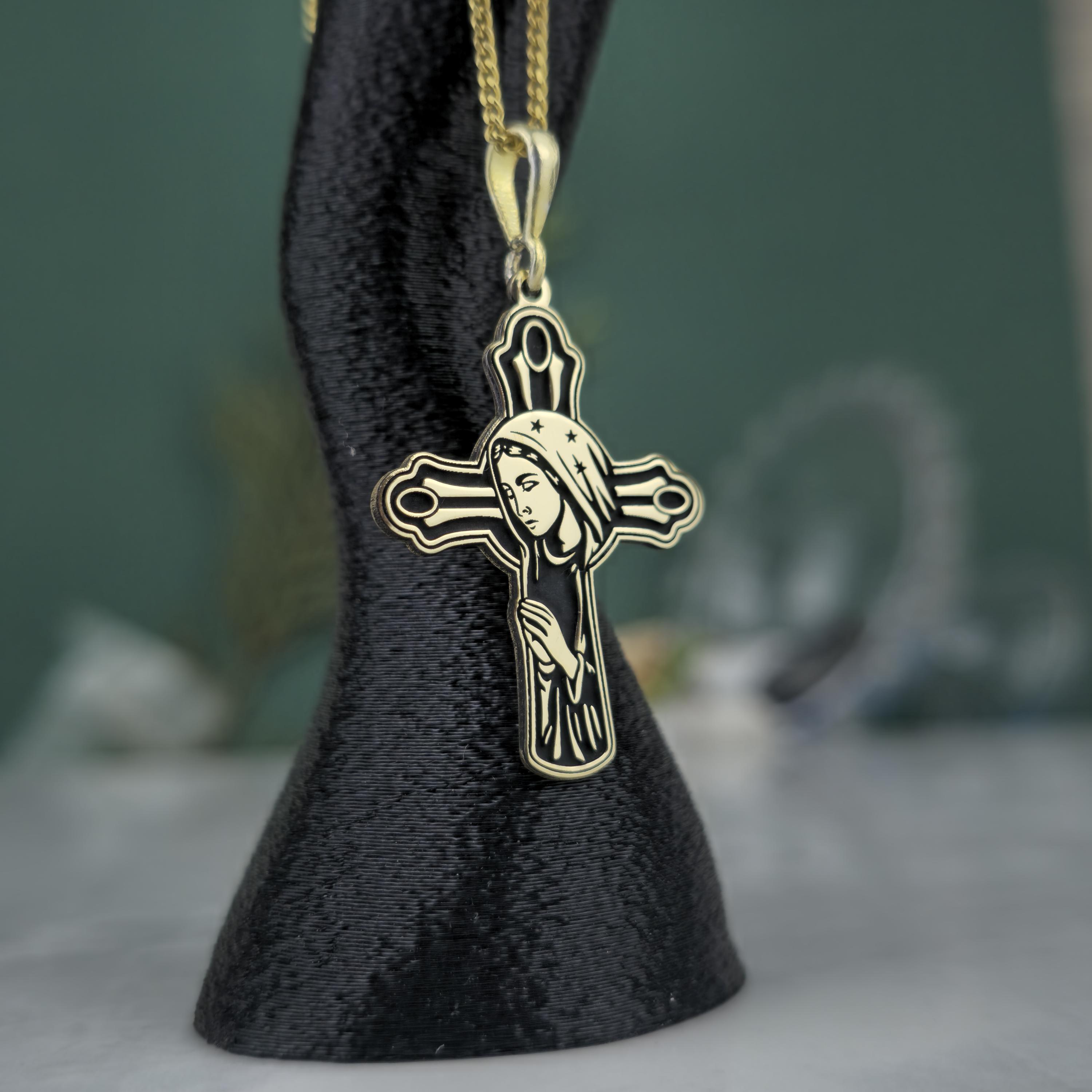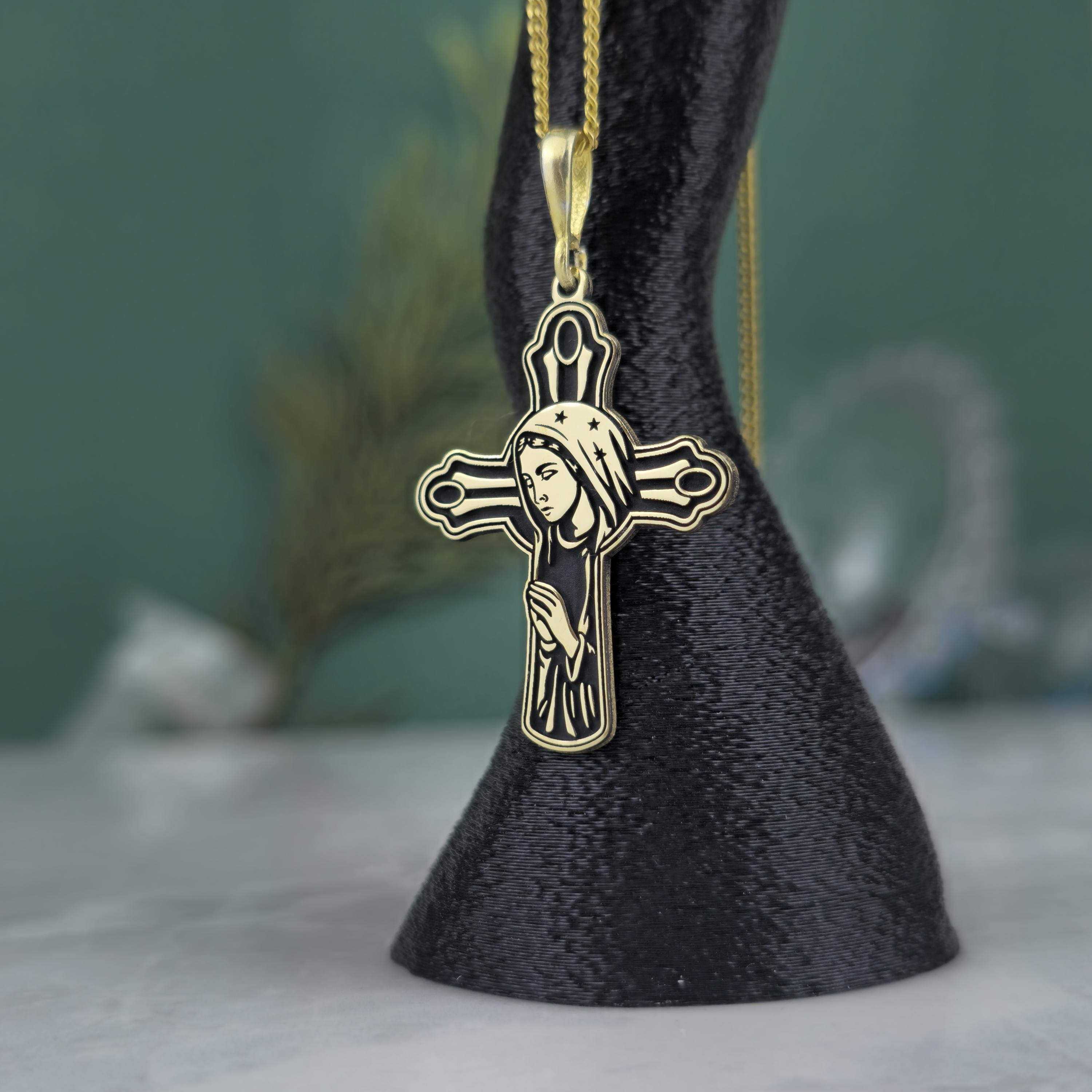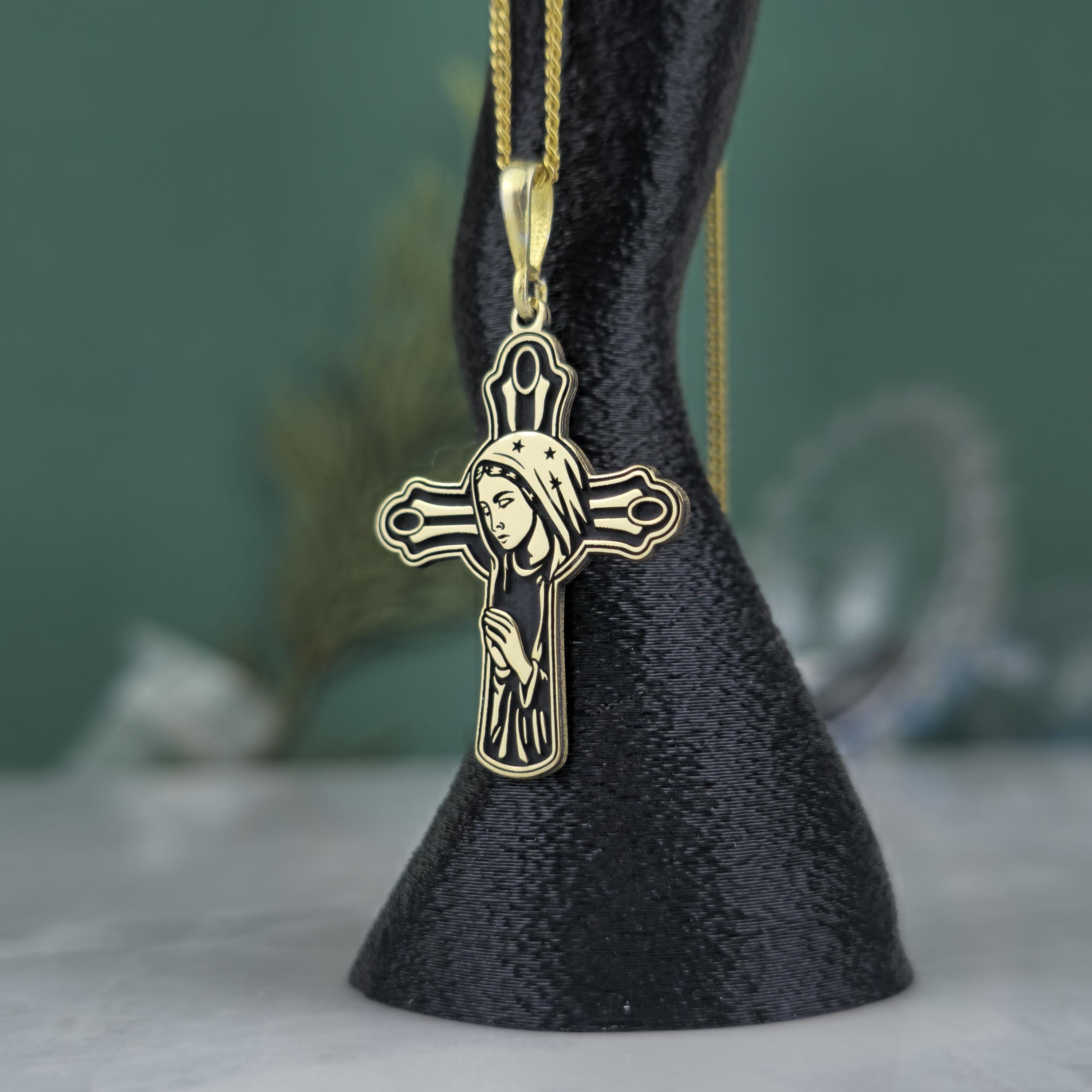 ✝️ Design: Cross-shaped pendant with the Virgin Mary engraving