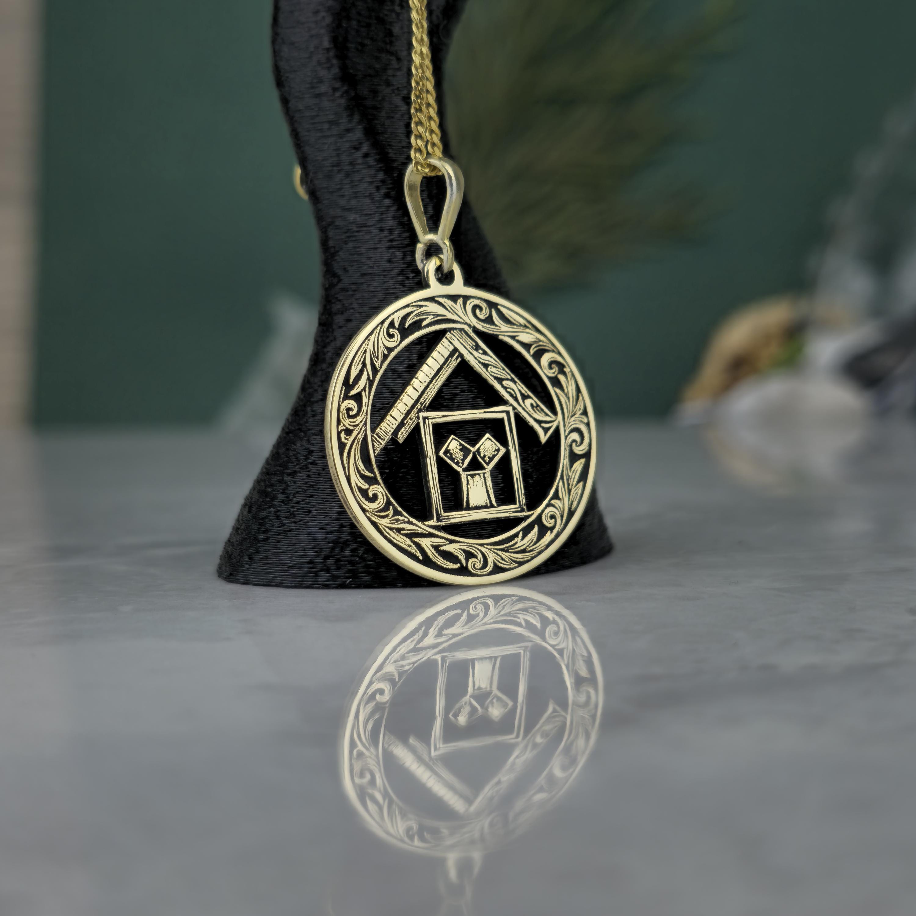 🧭 Design: Masonic square and compass engraved within an ornate circular frame