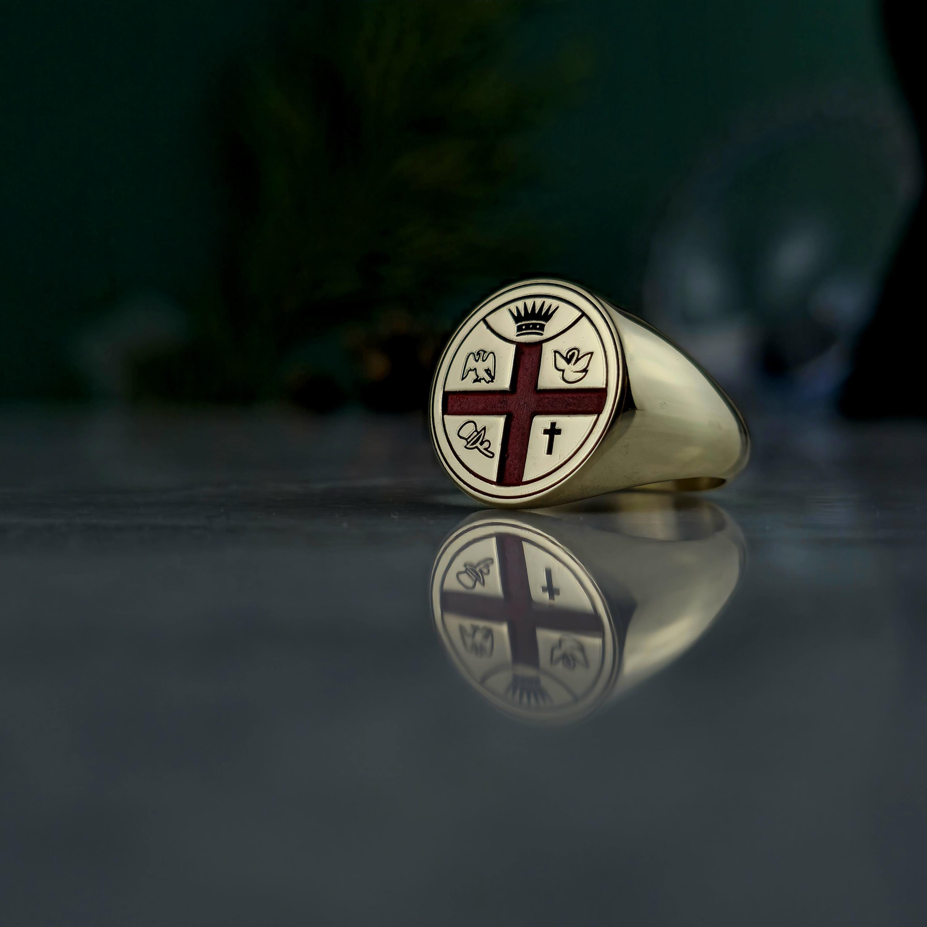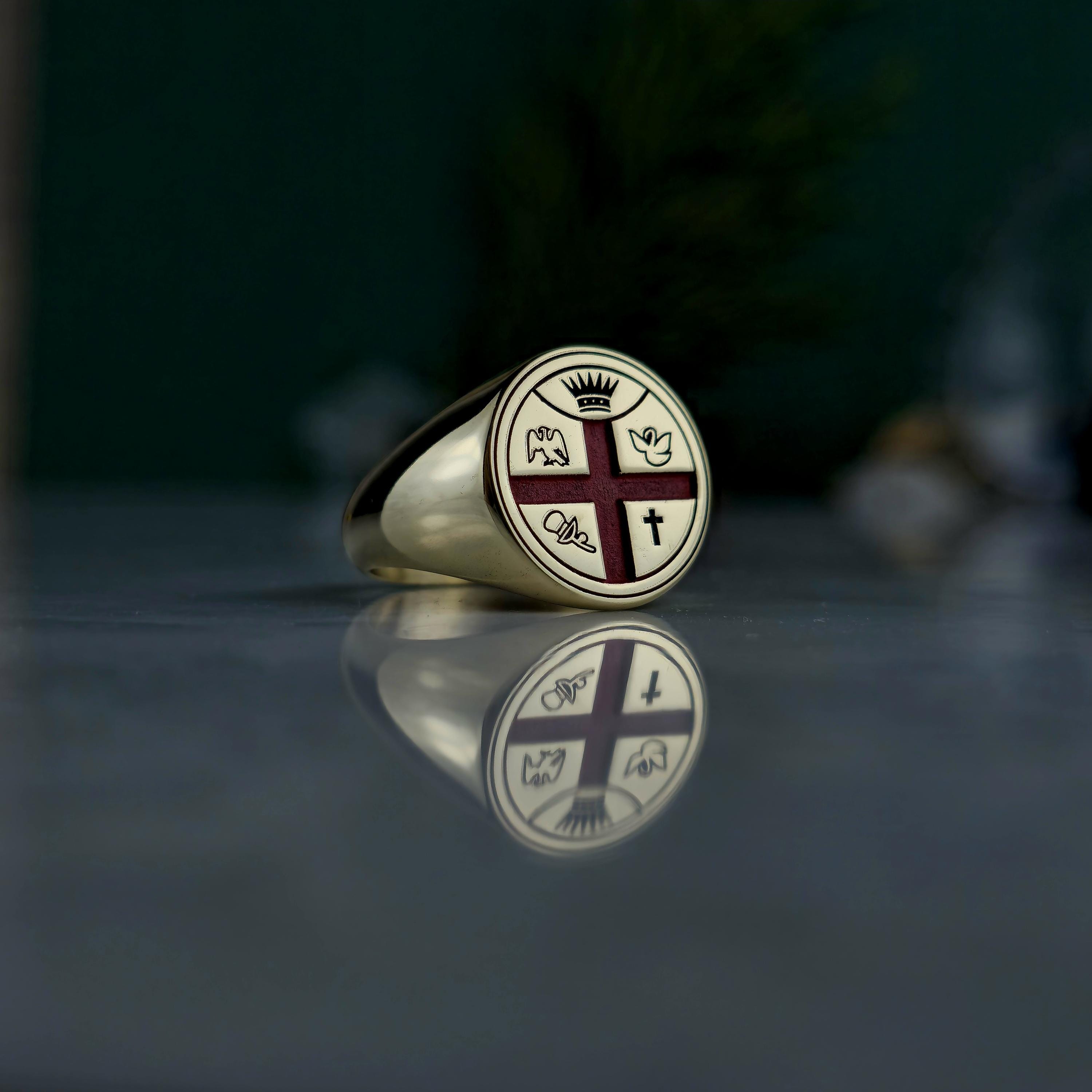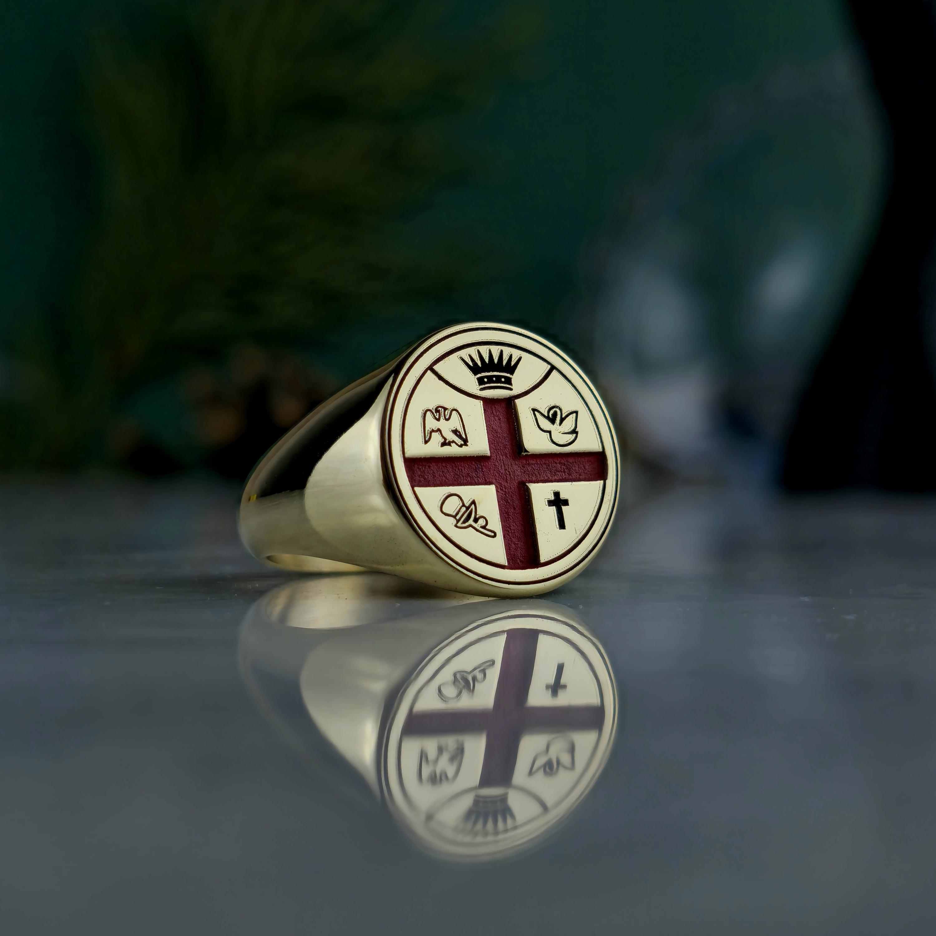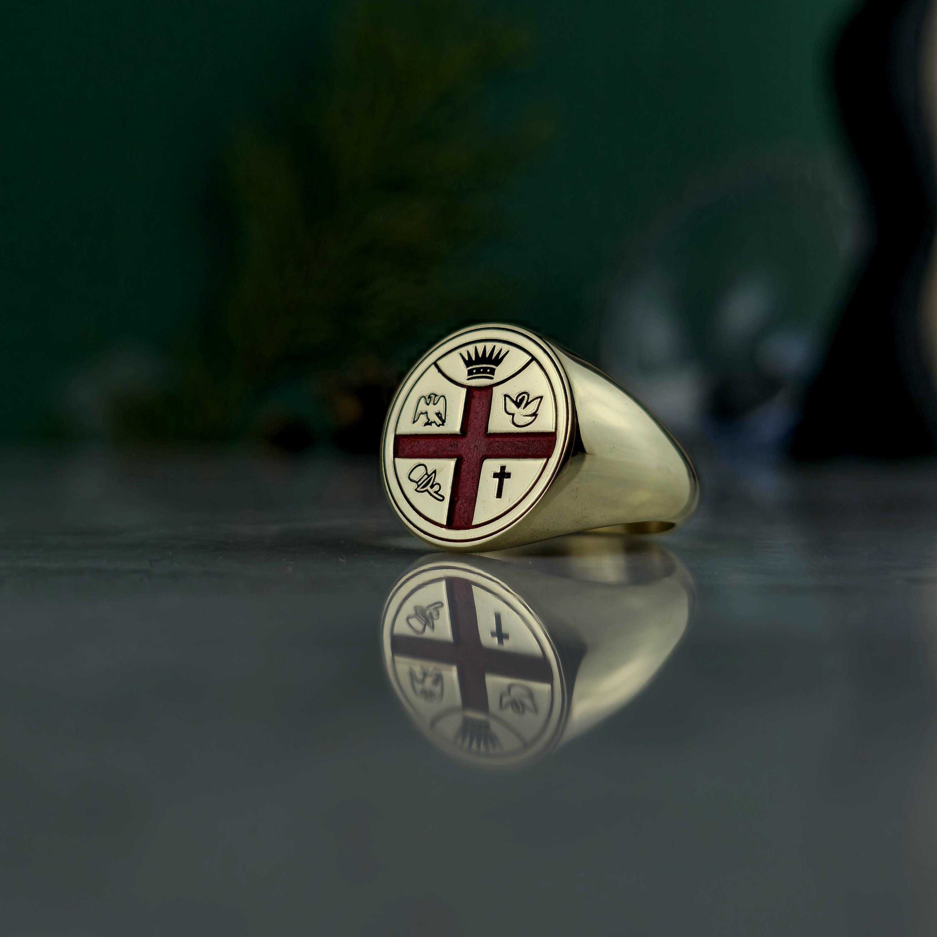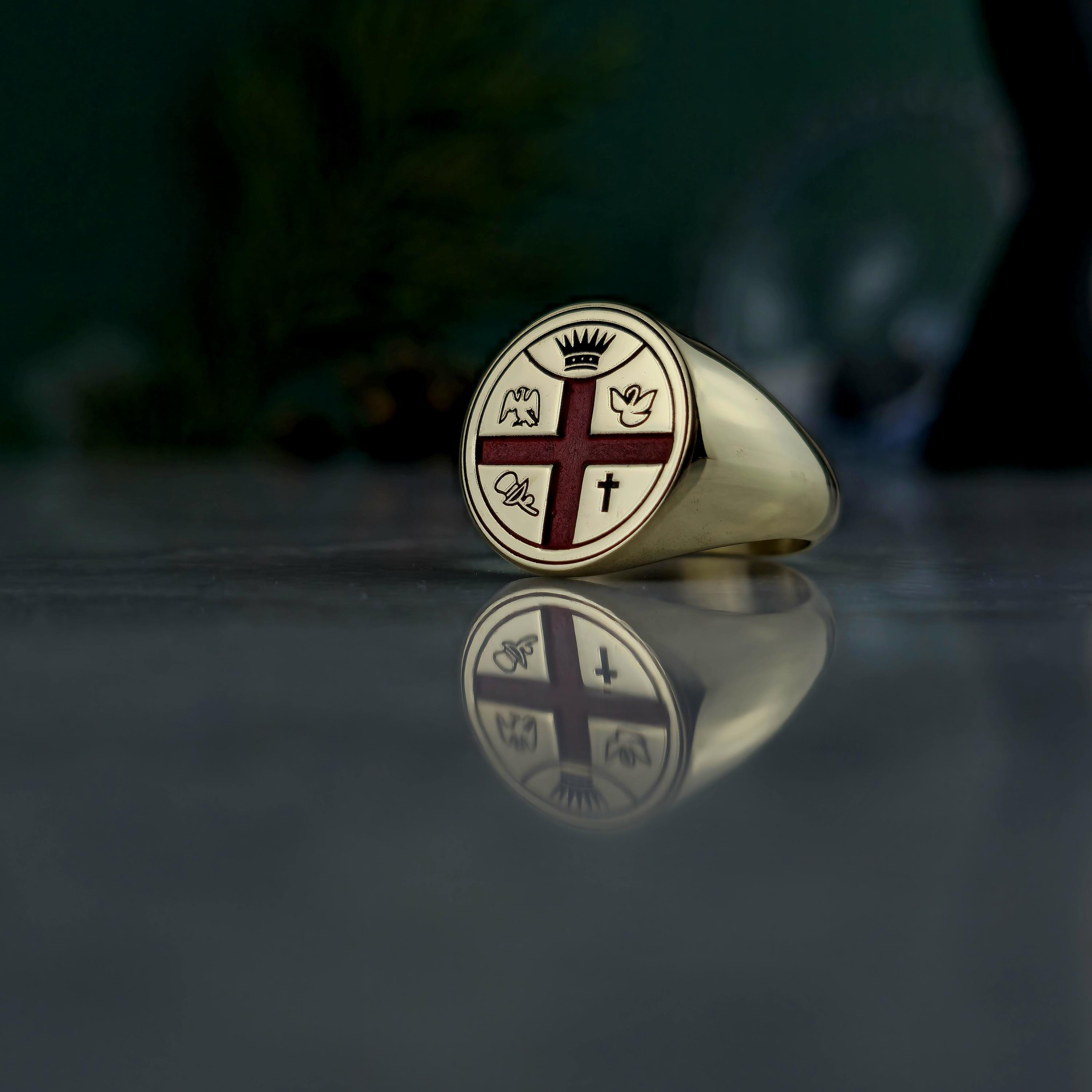 This handcrafted Masonic signet ring represents centuries of tradition and brotherhood. Made from 925 sterling silver and plated with 18K gold, it features a red enamel cross with detailed Masonic emblems symbolizing enlightenment, unity, and virtue.