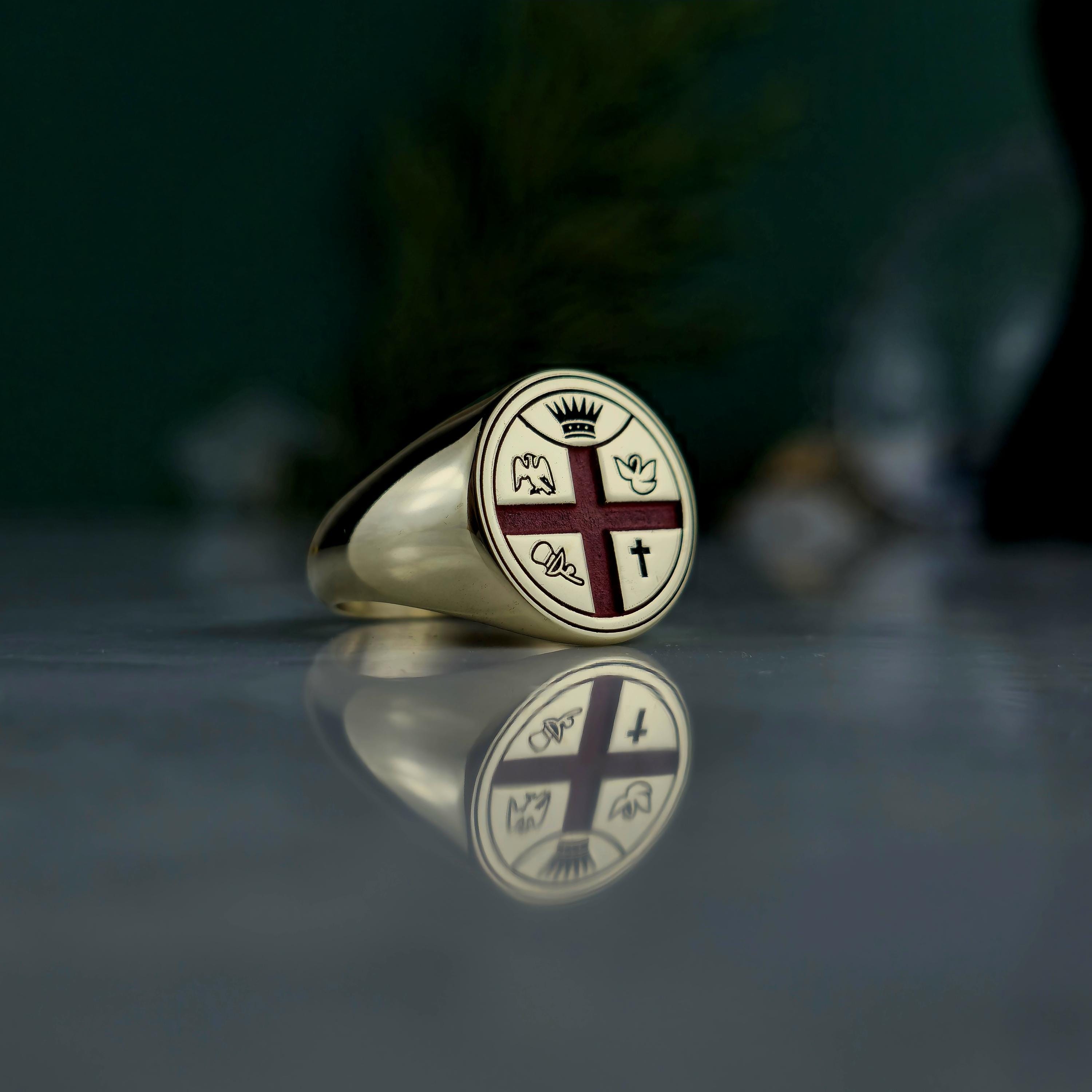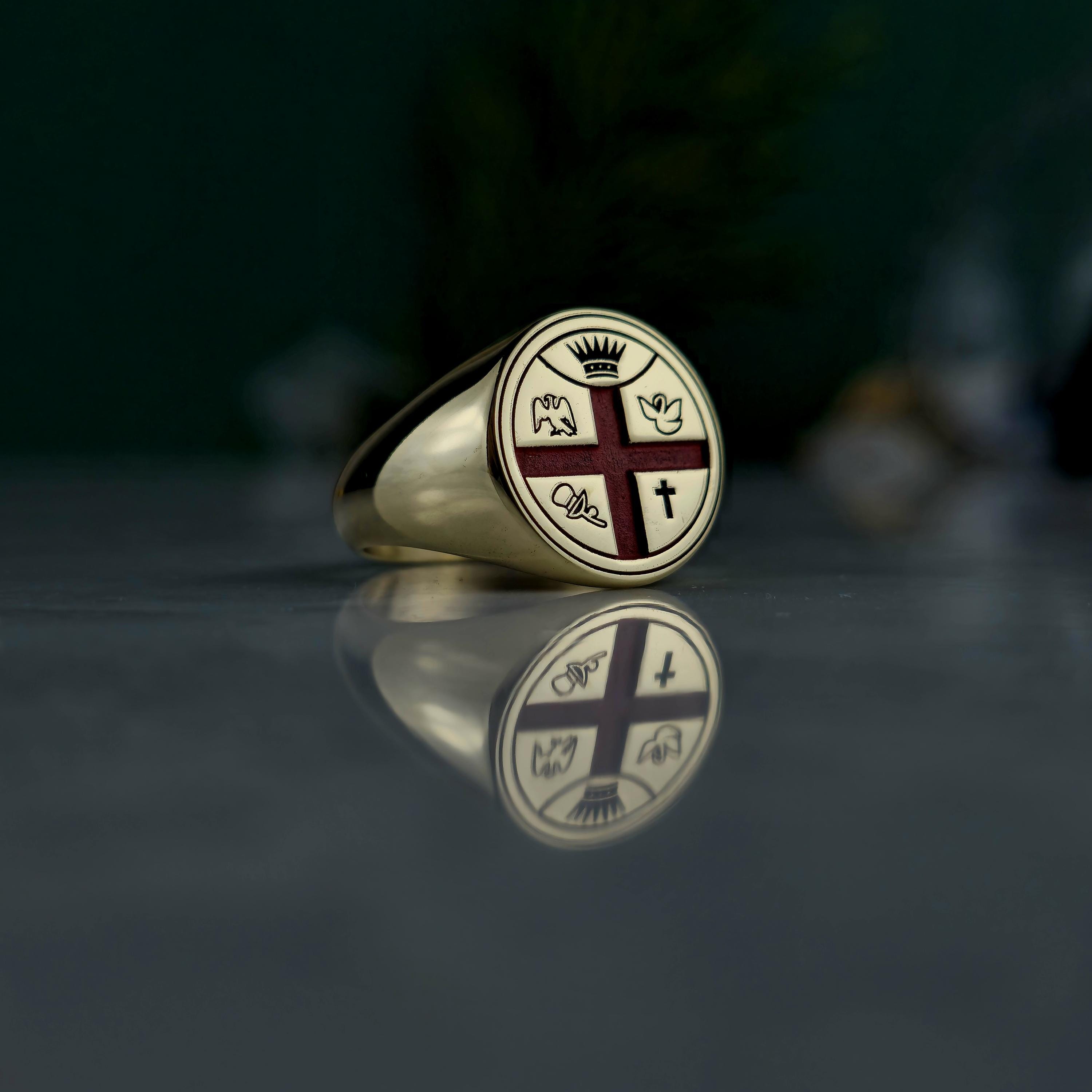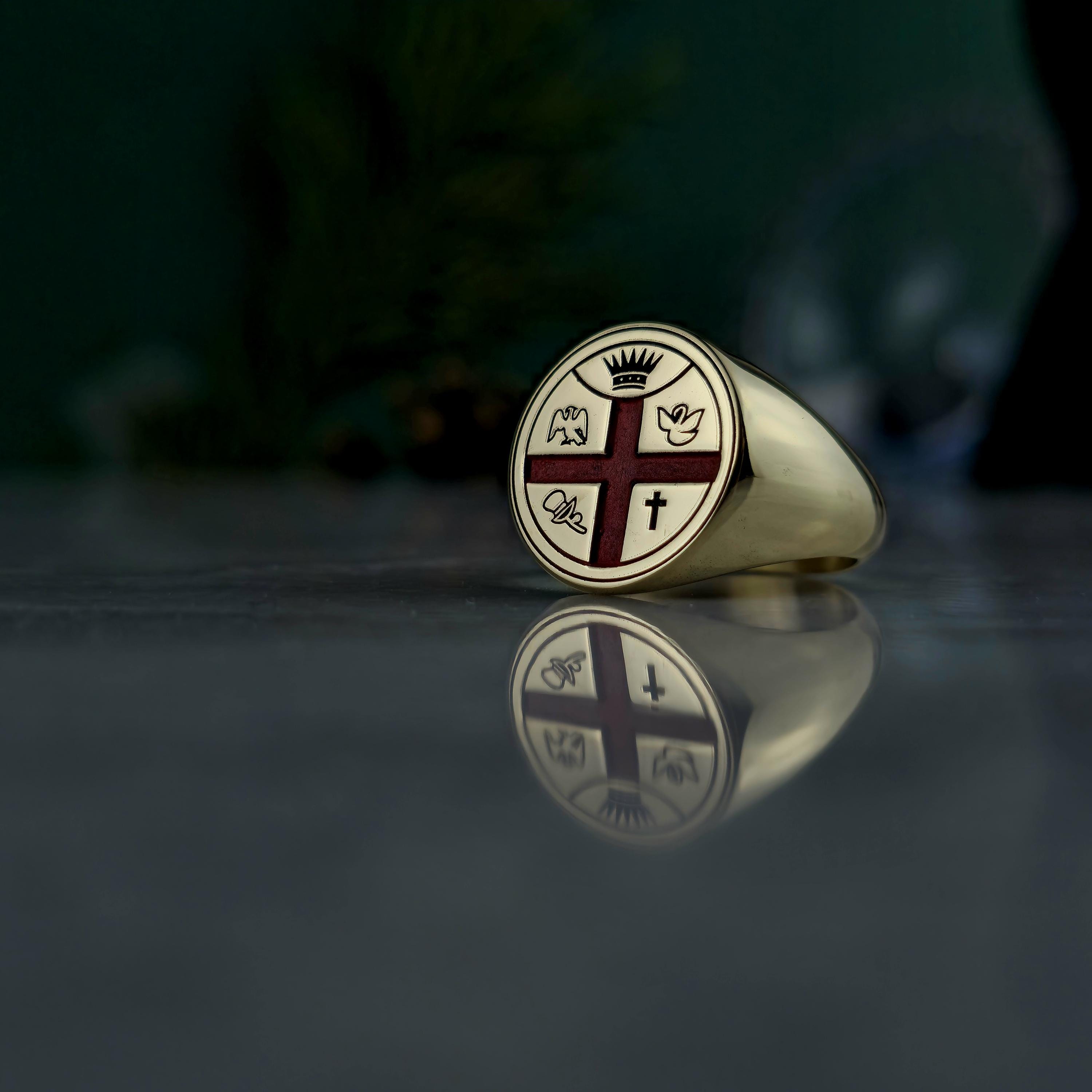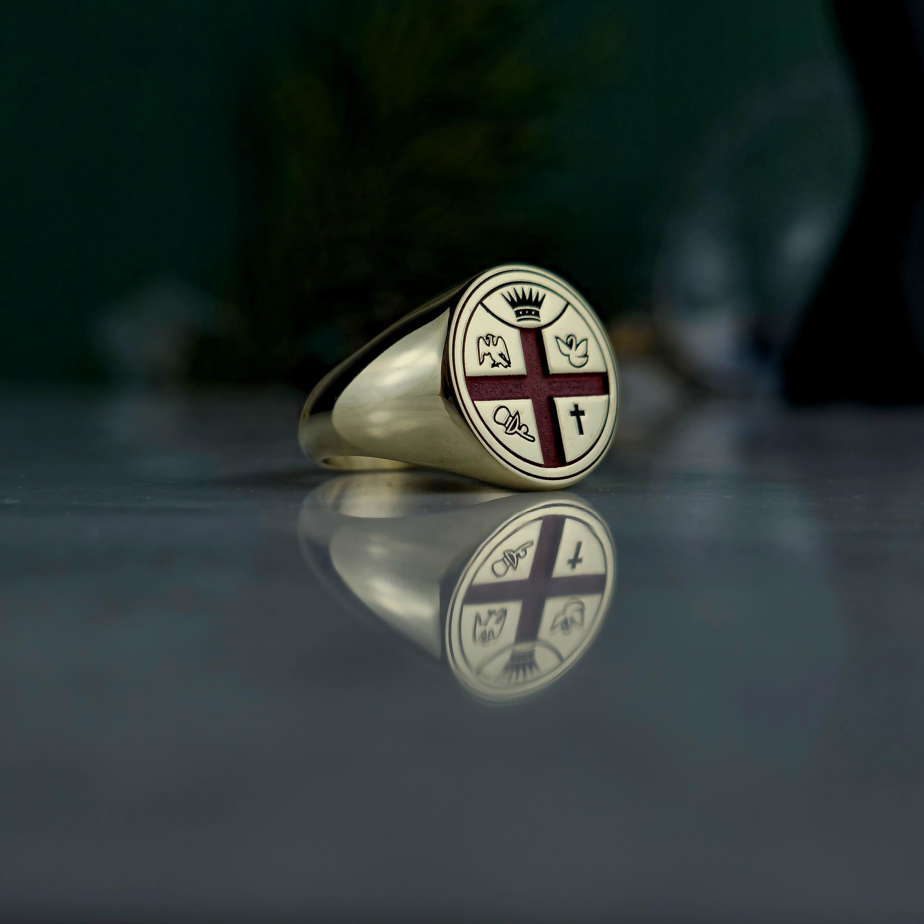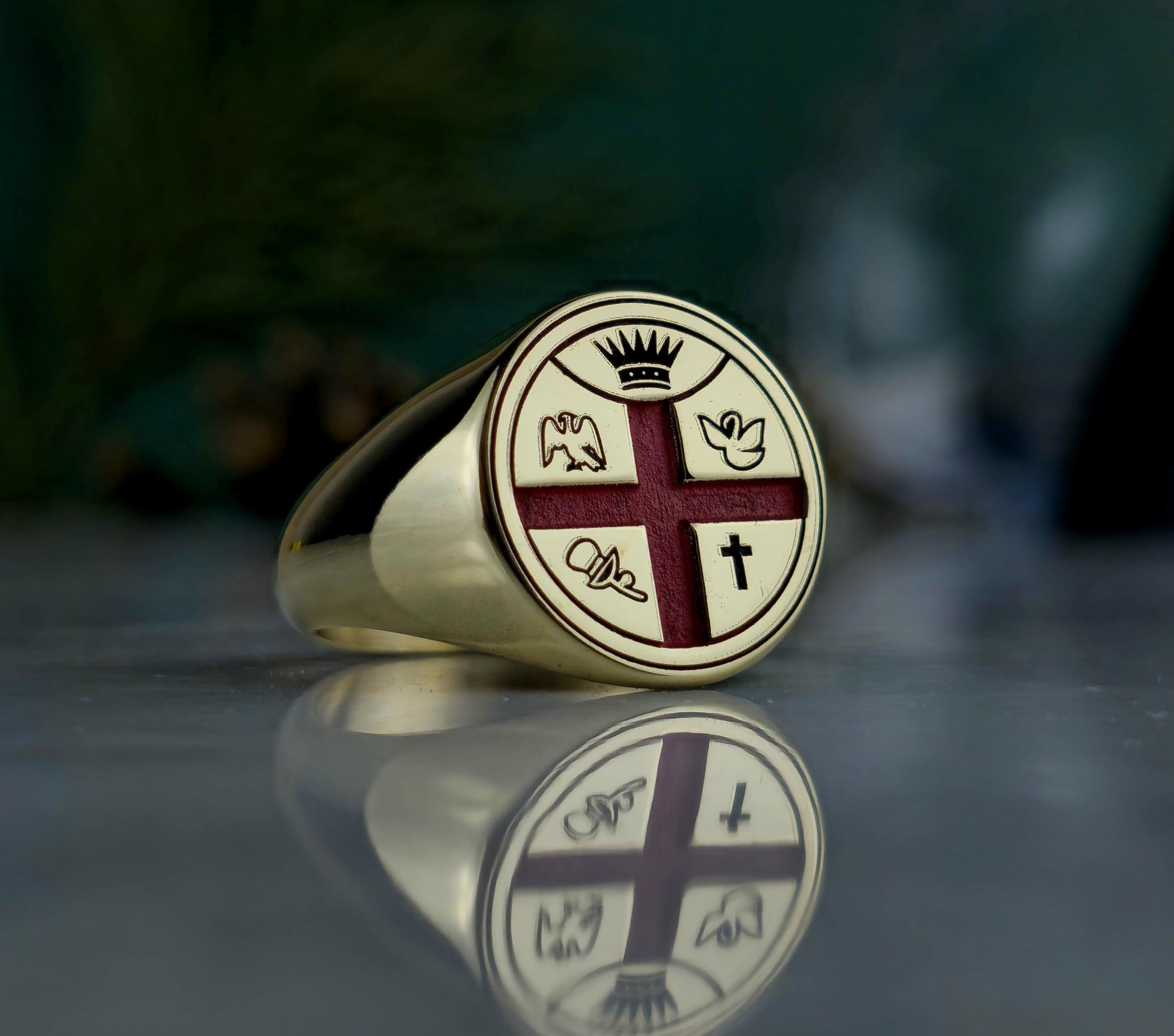 This handcrafted Masonic signet ring represents centuries of tradition and brotherhood. Made from 925 sterling silver and plated with 18K gold, it features a red enamel cross with detailed Masonic emblems symbolizing enlightenment, unity, and virtue.