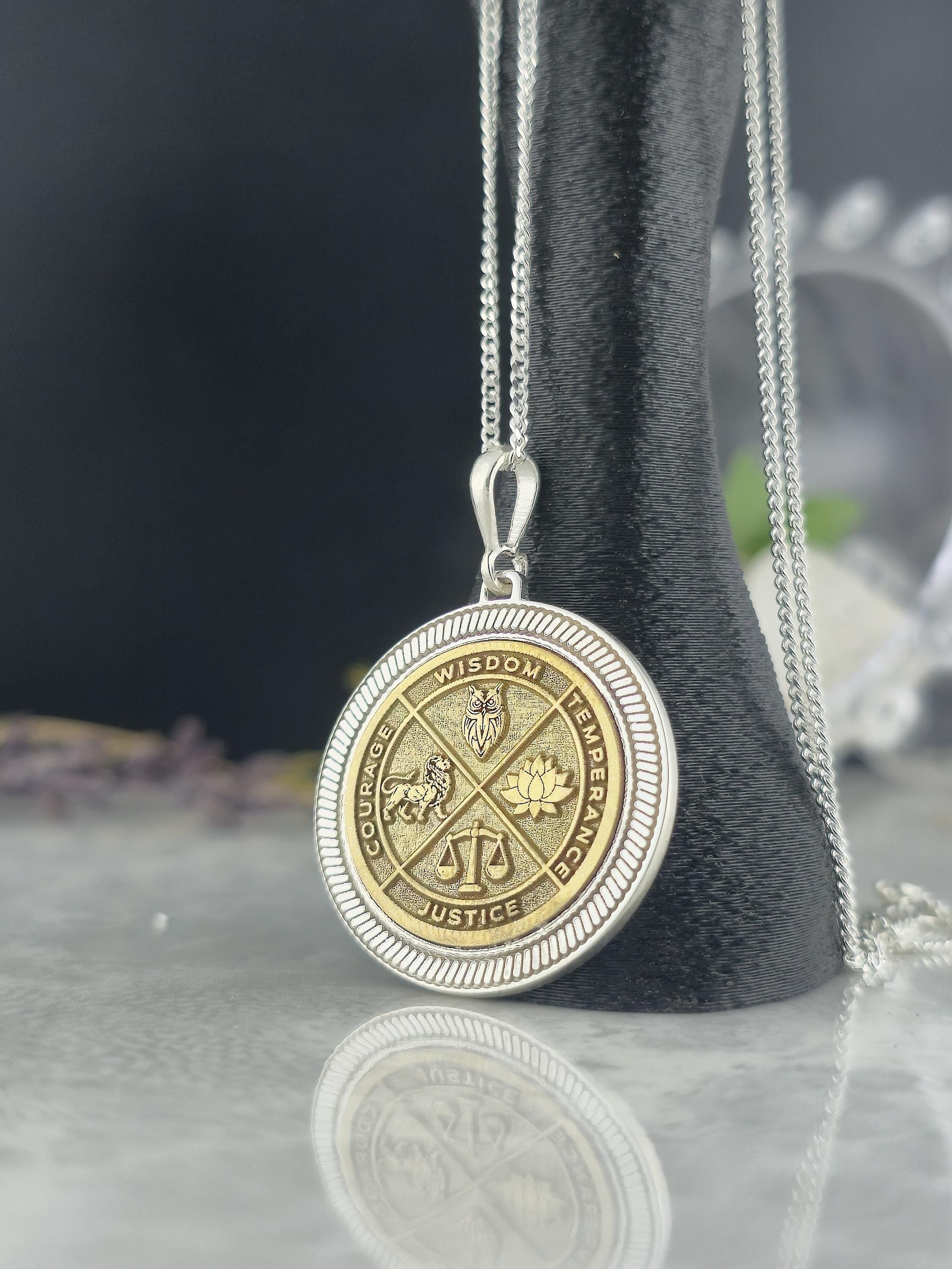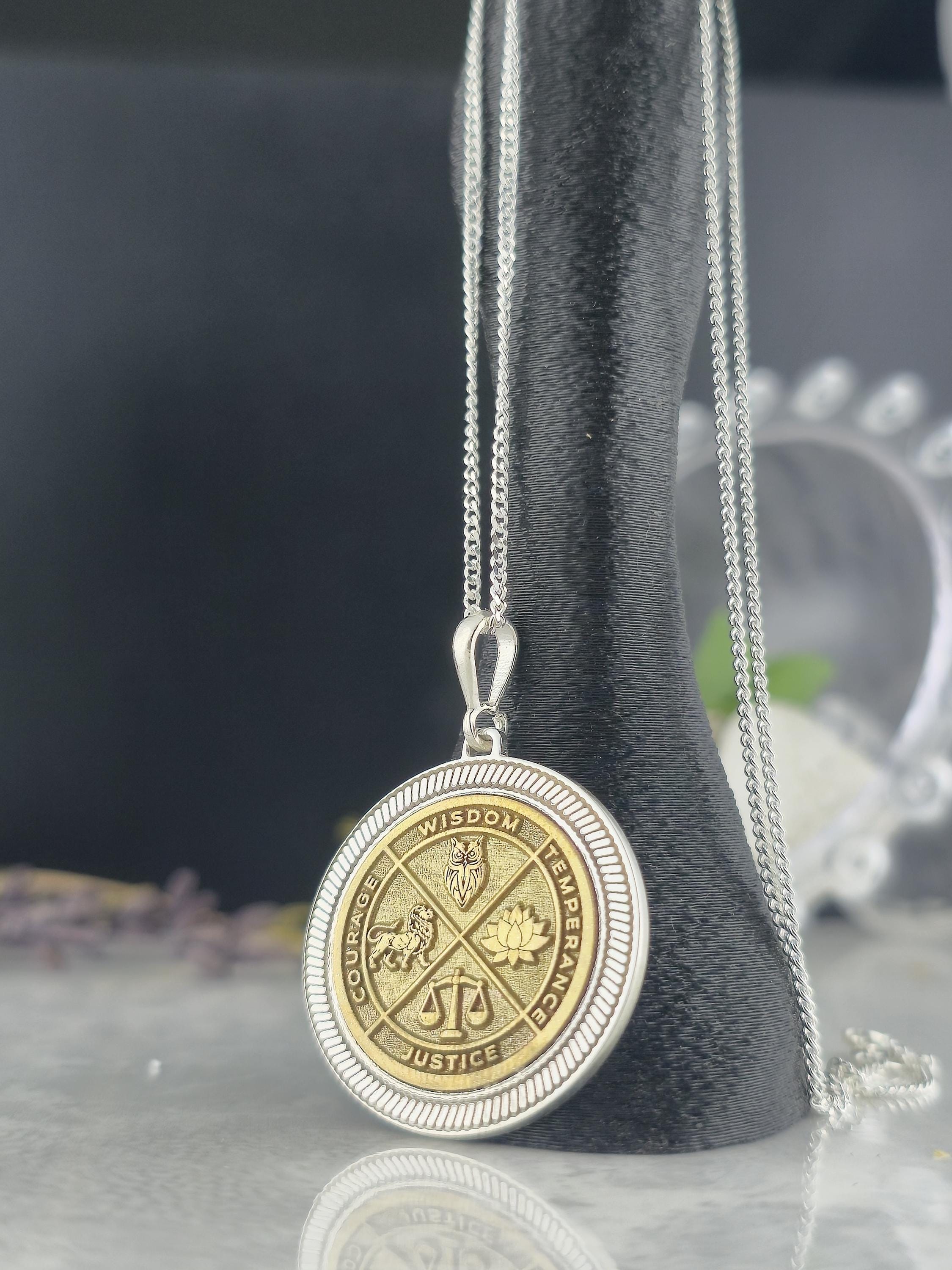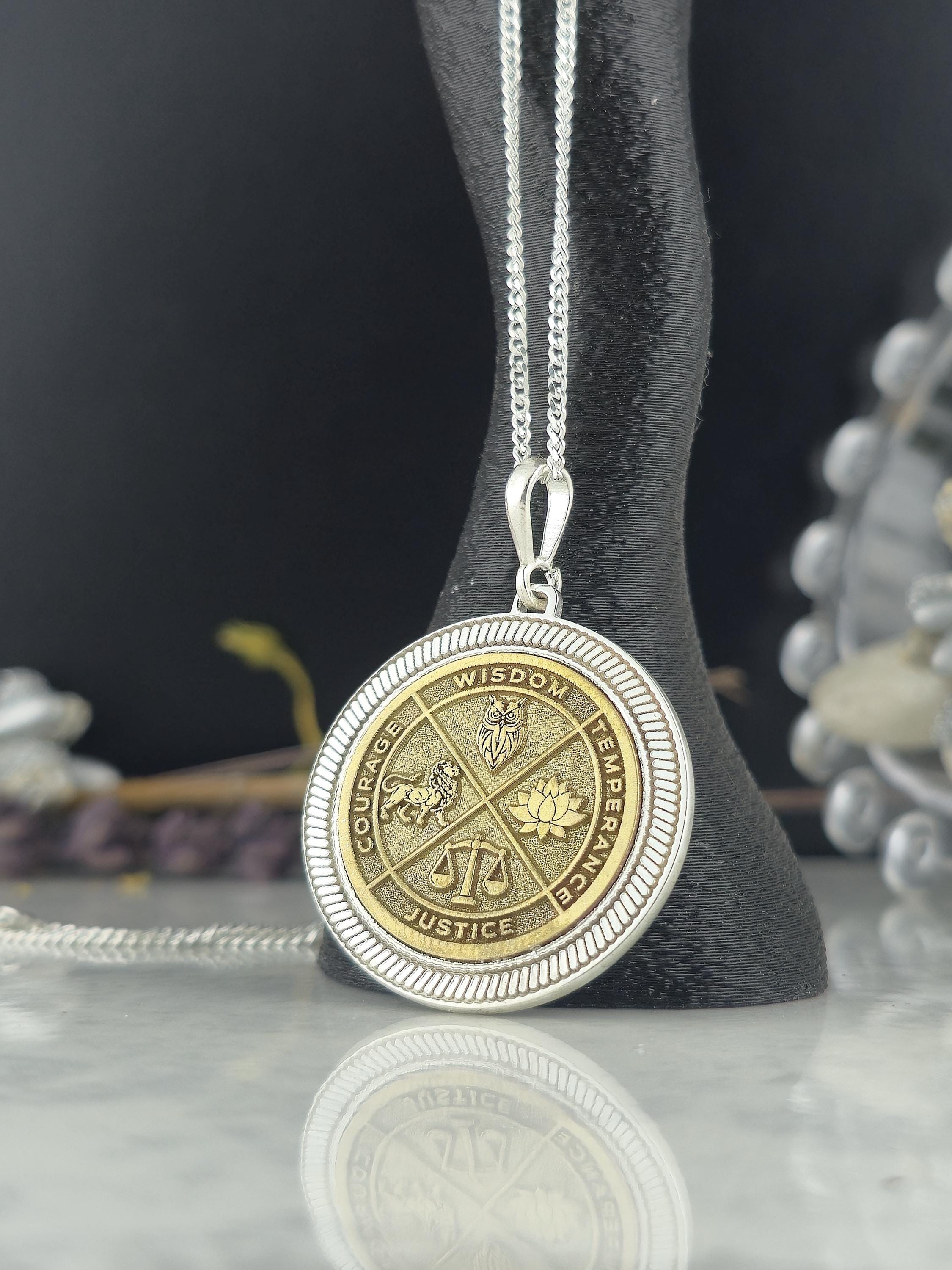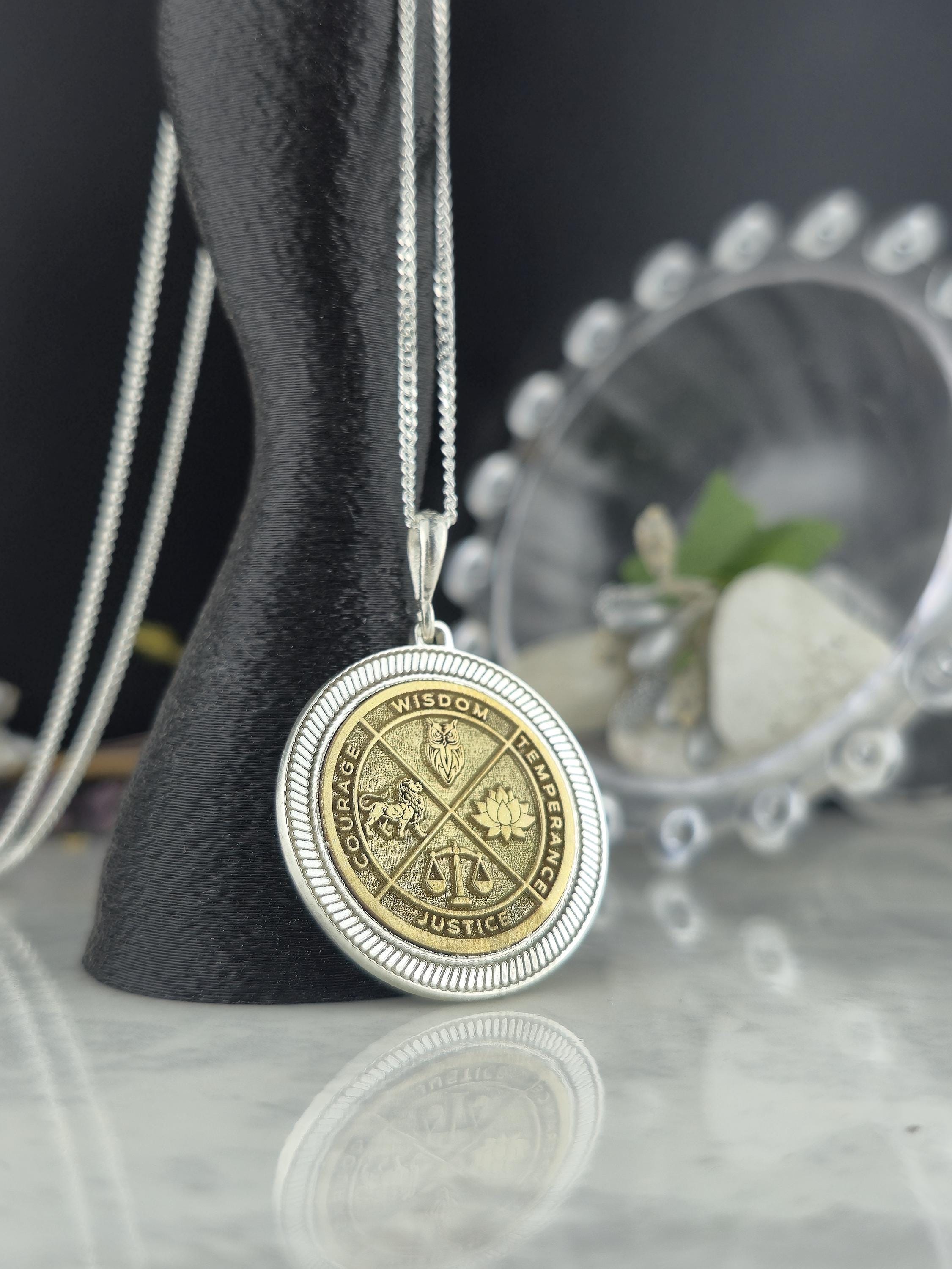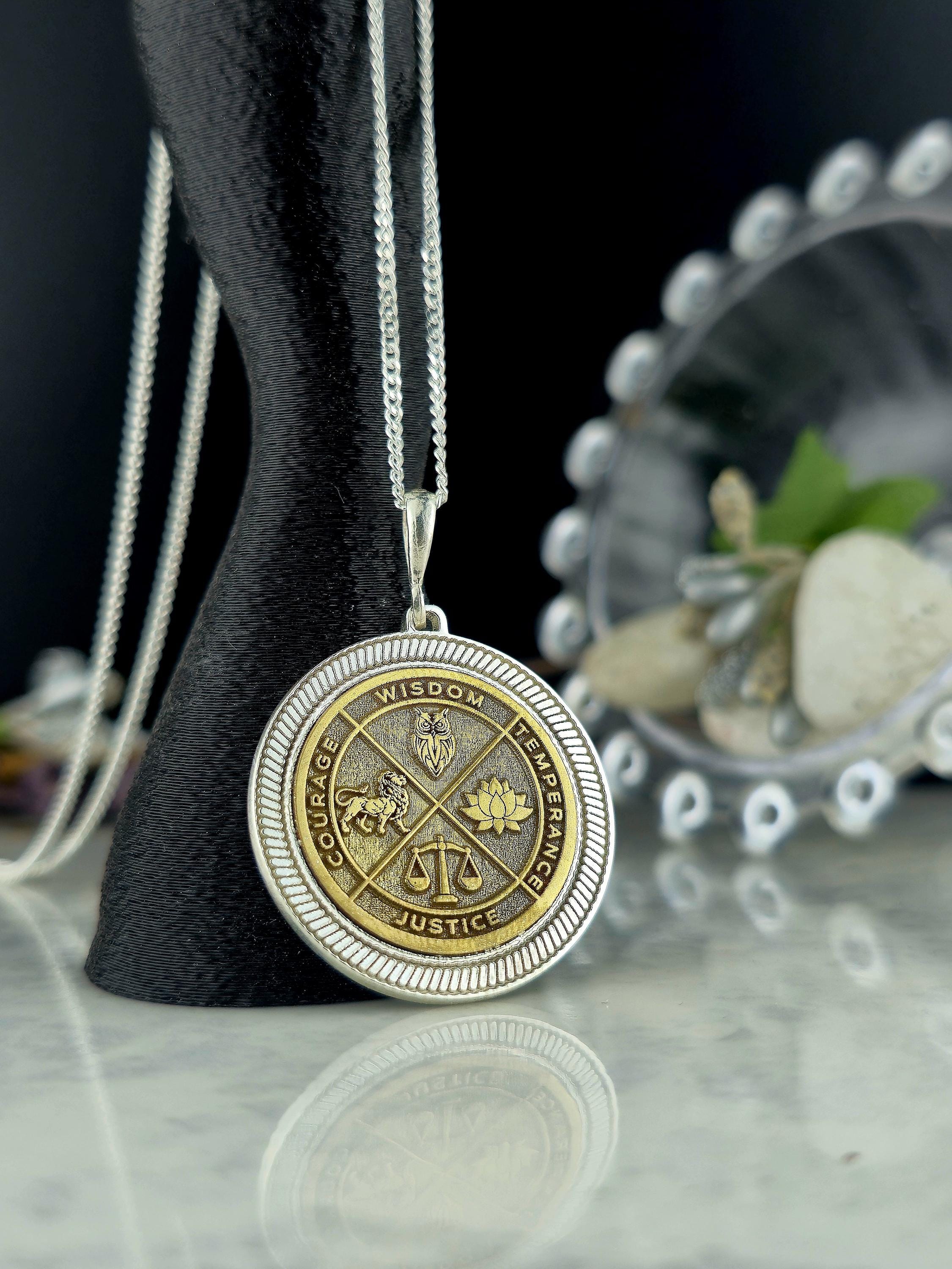 Wisdom Virtue Medallion Necklace 925 Sterling Silver – Courage, Temperance, Justice Pendant – Meaningful Philosophy Talisman Jewelry