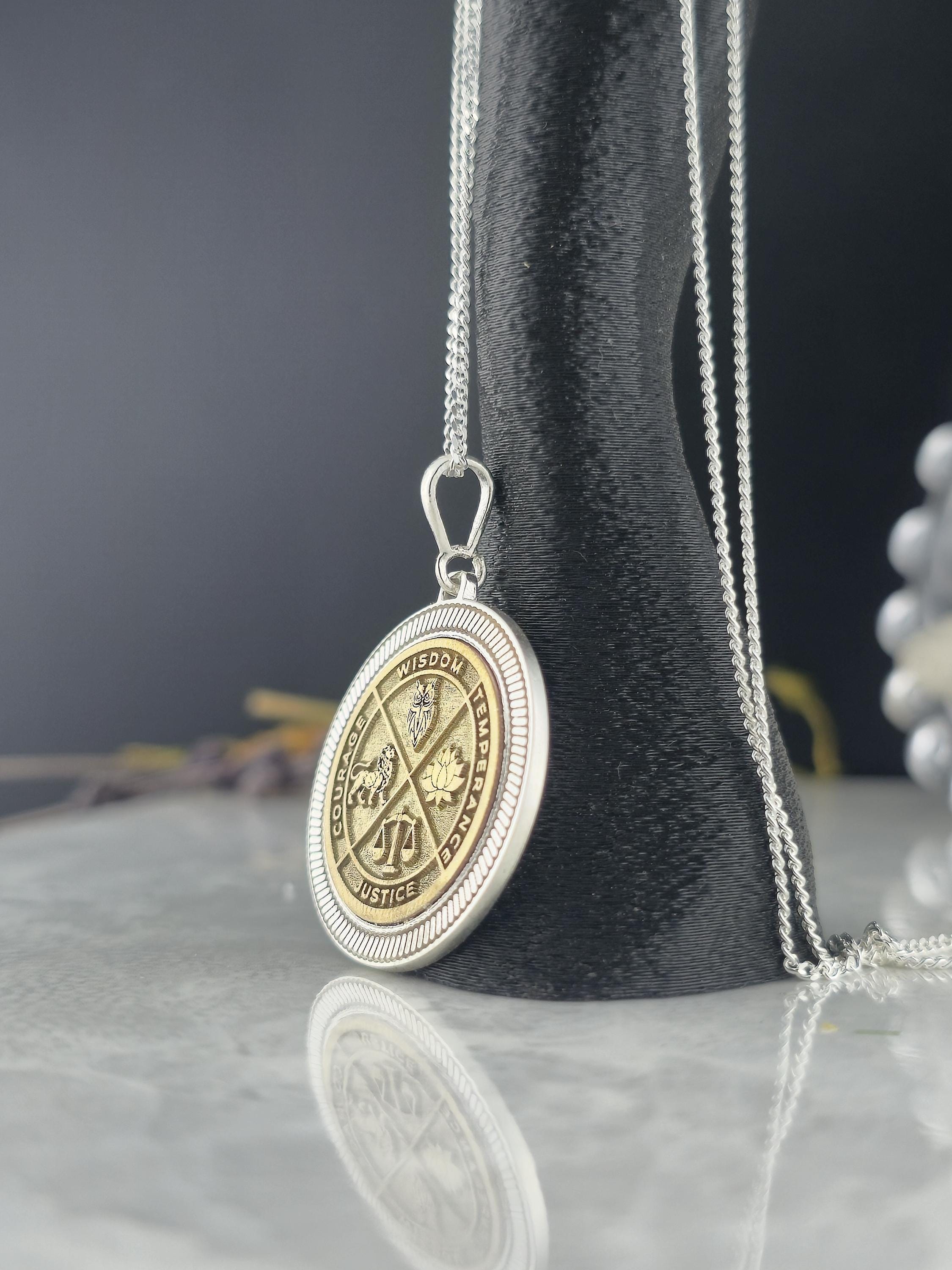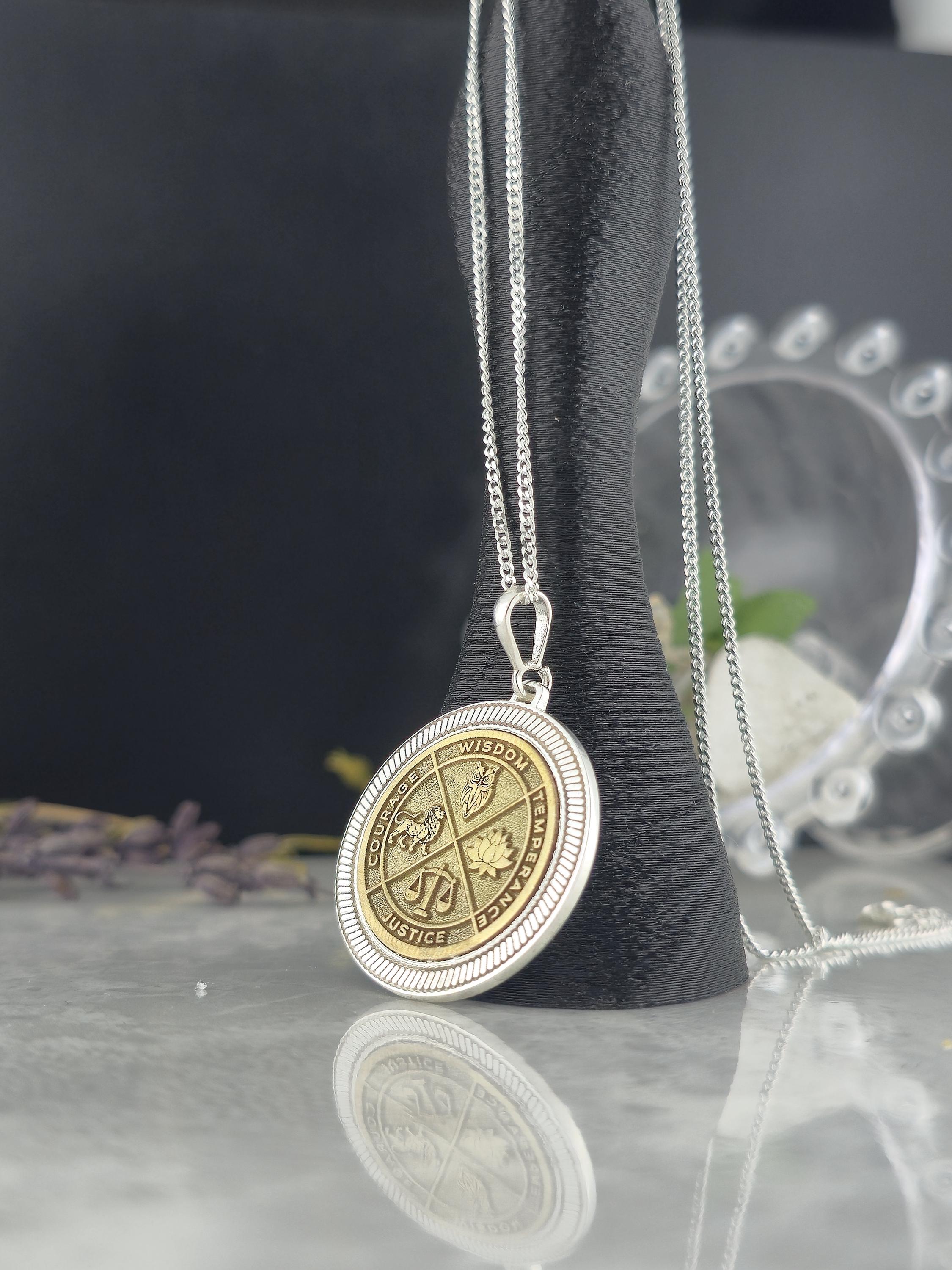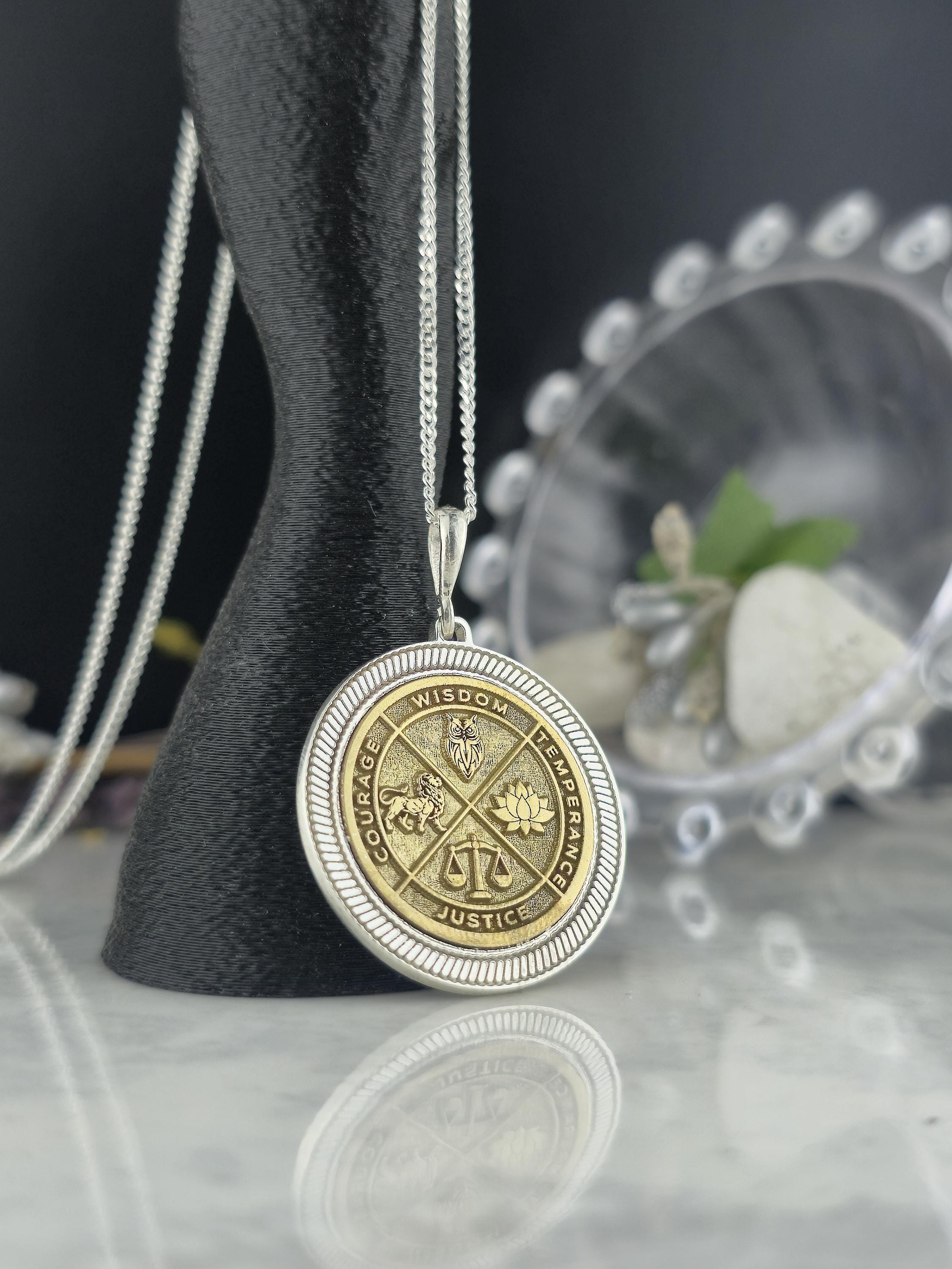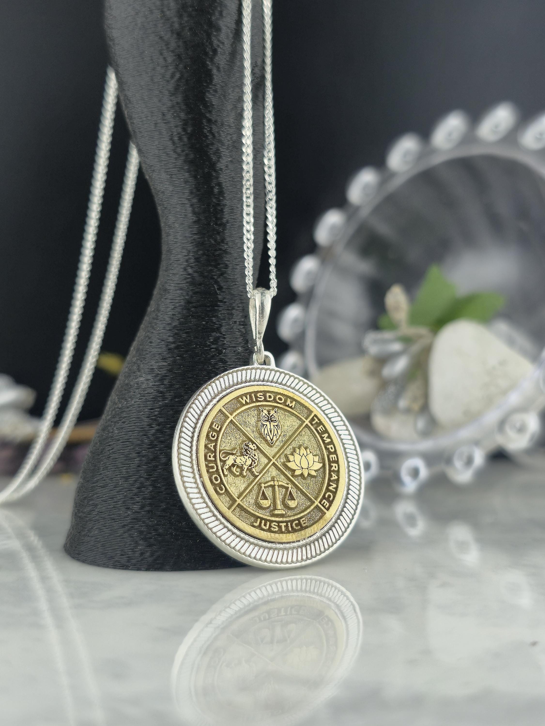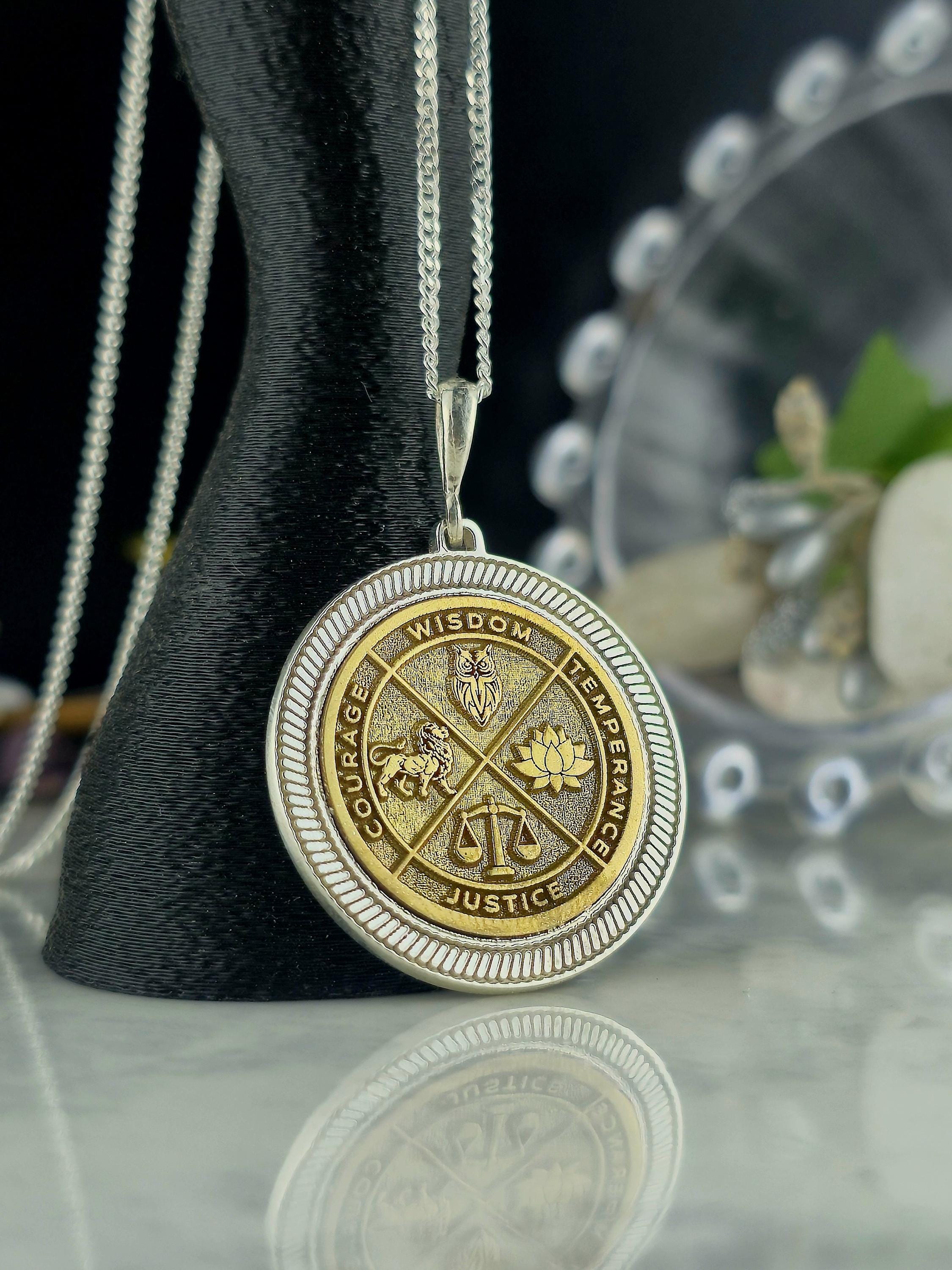 Wisdom Virtue Medallion Necklace 925 Sterling Silver – Courage, Temperance, Justice Pendant – Meaningful Philosophy Talisman Jewelry