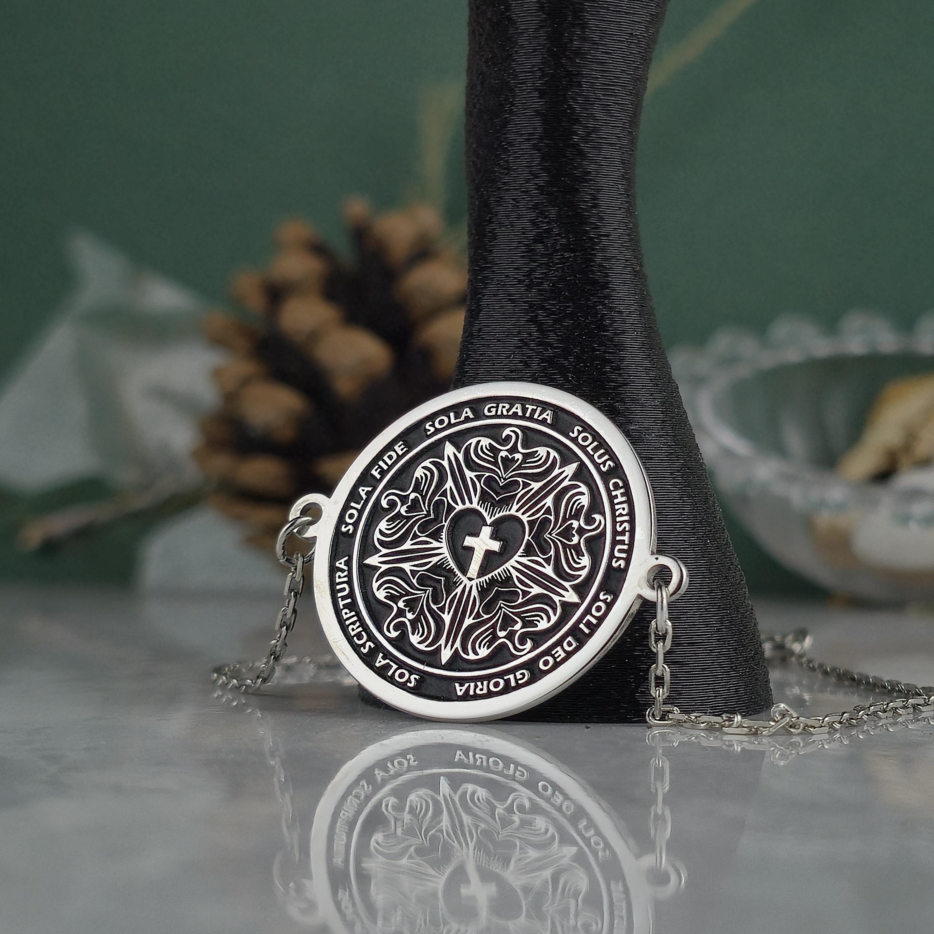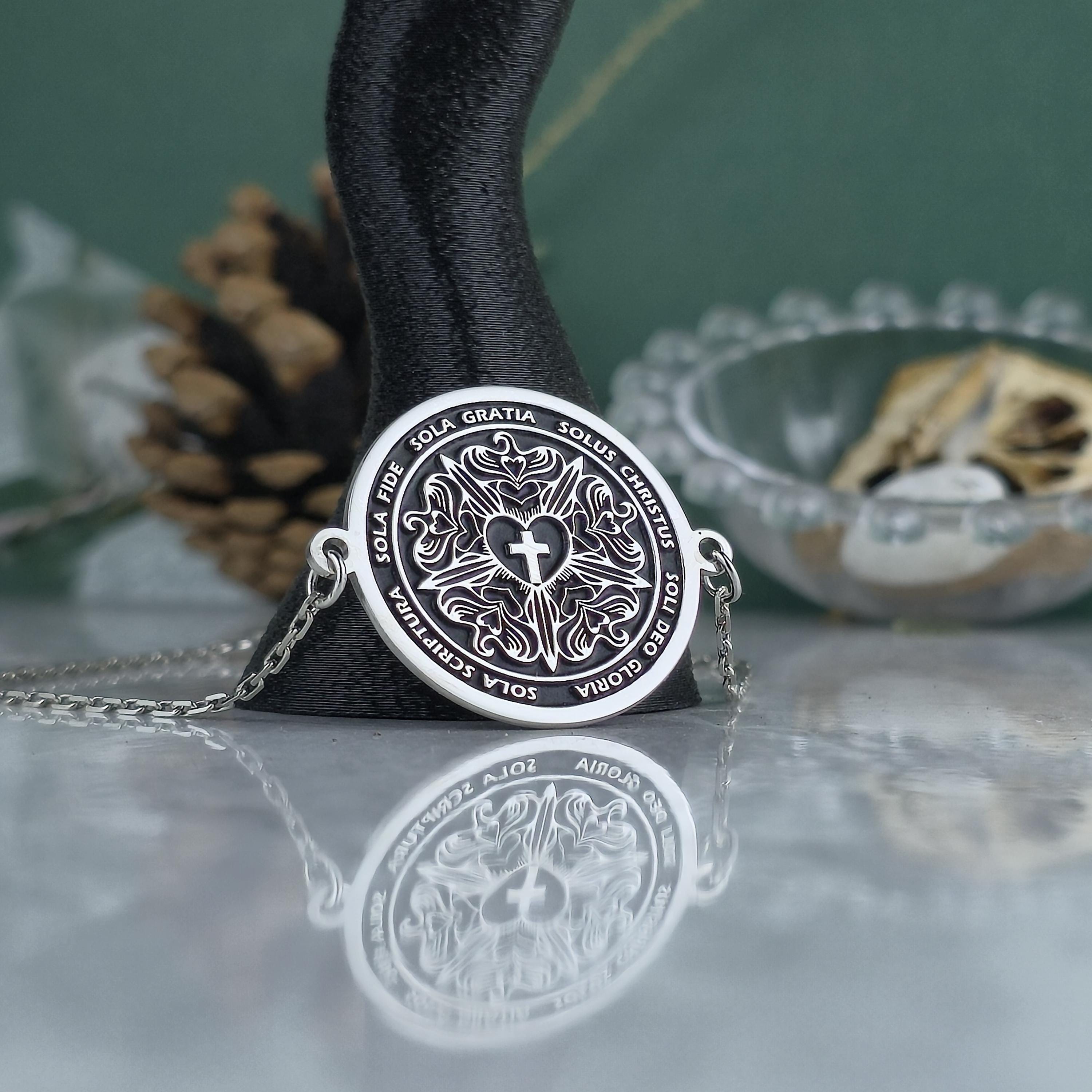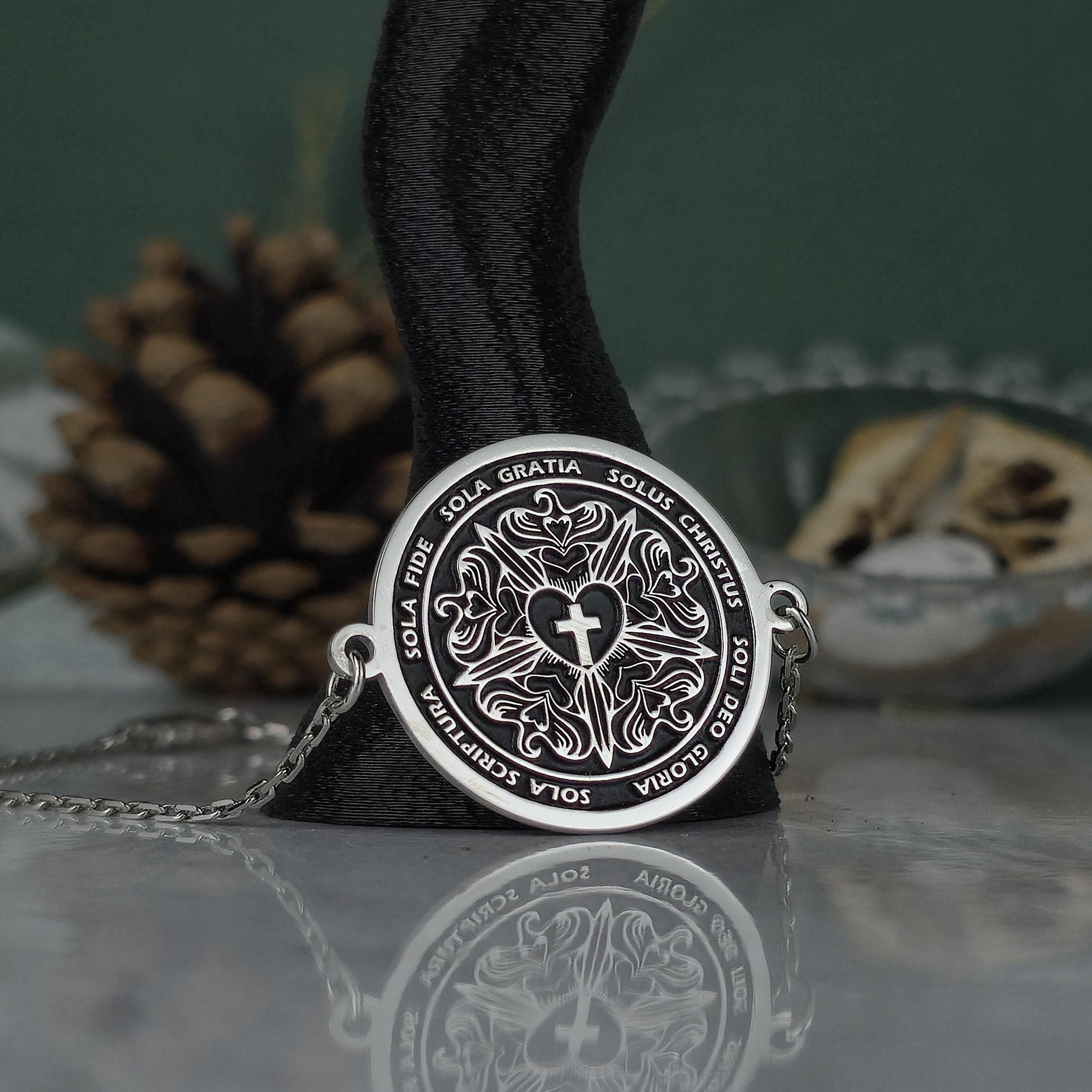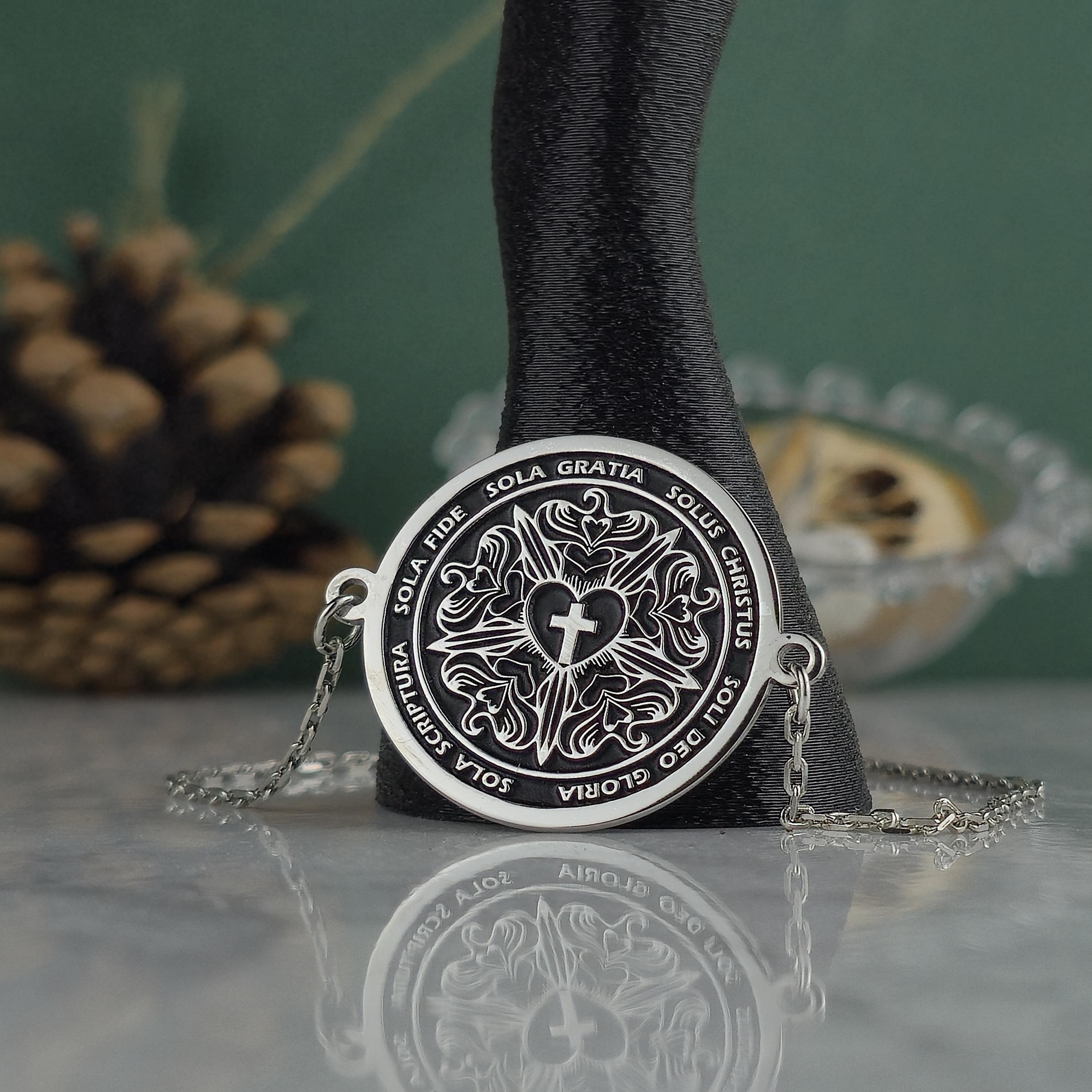 Each inscription on the locket celebrates the core values that have shaped Christian devotion for centuries: faith alone, grace alone, Christ alone, Scripture alone, and glory to God alone.