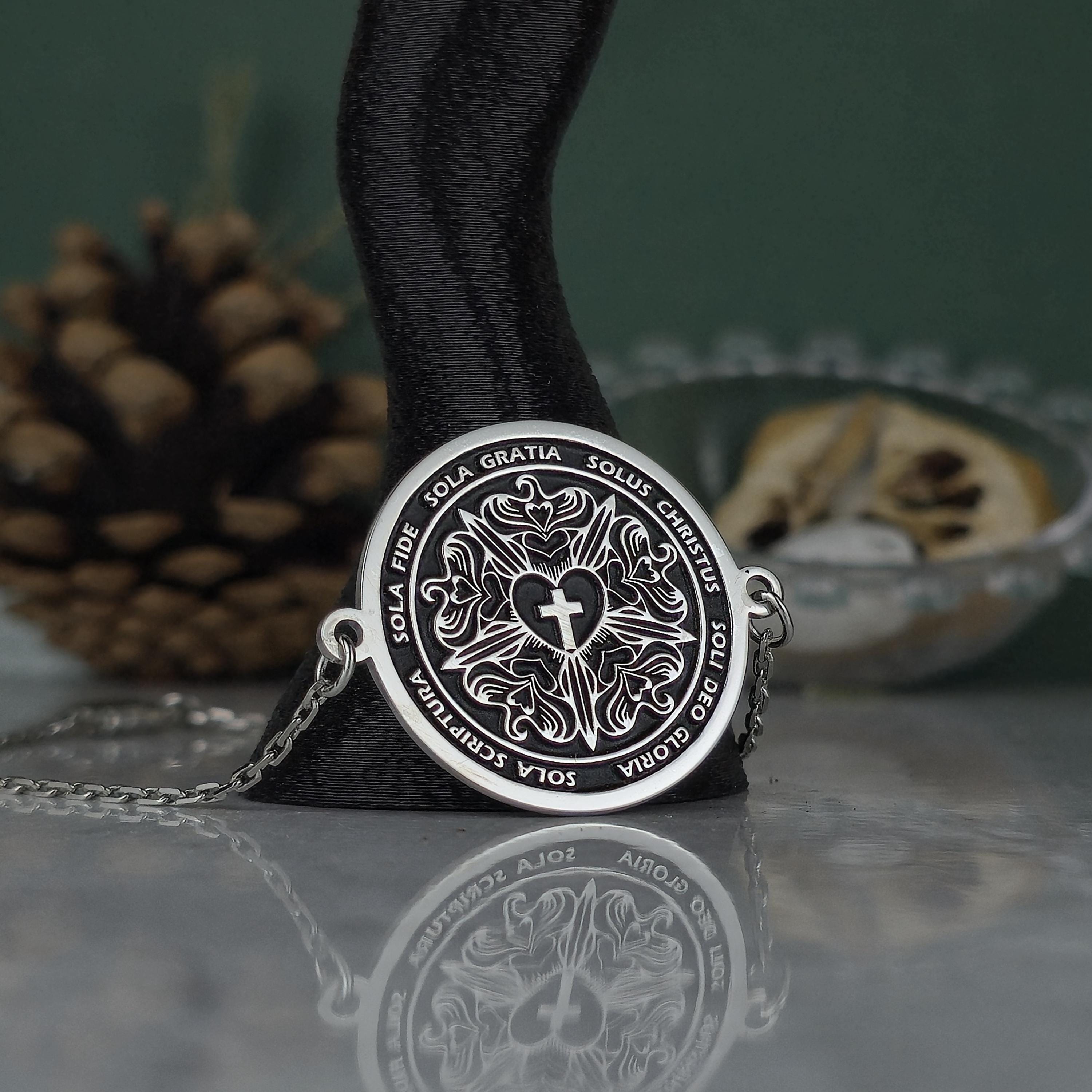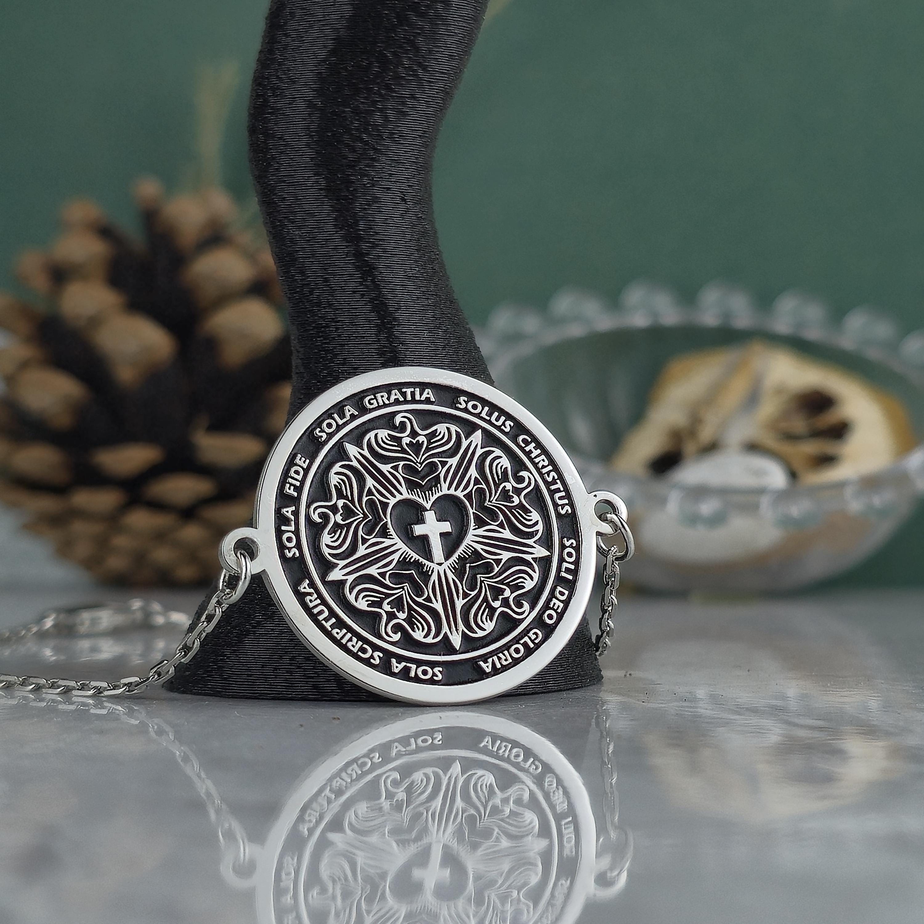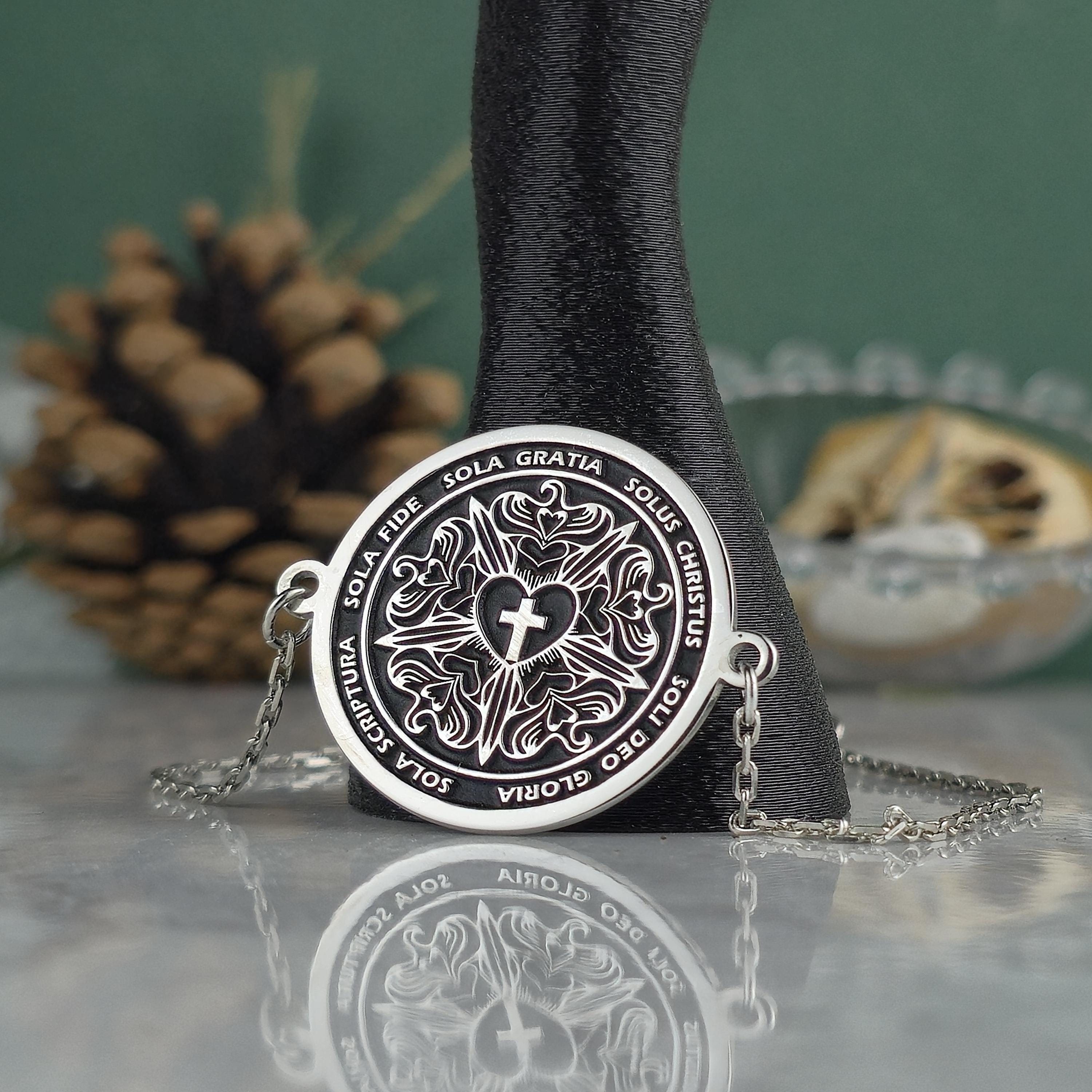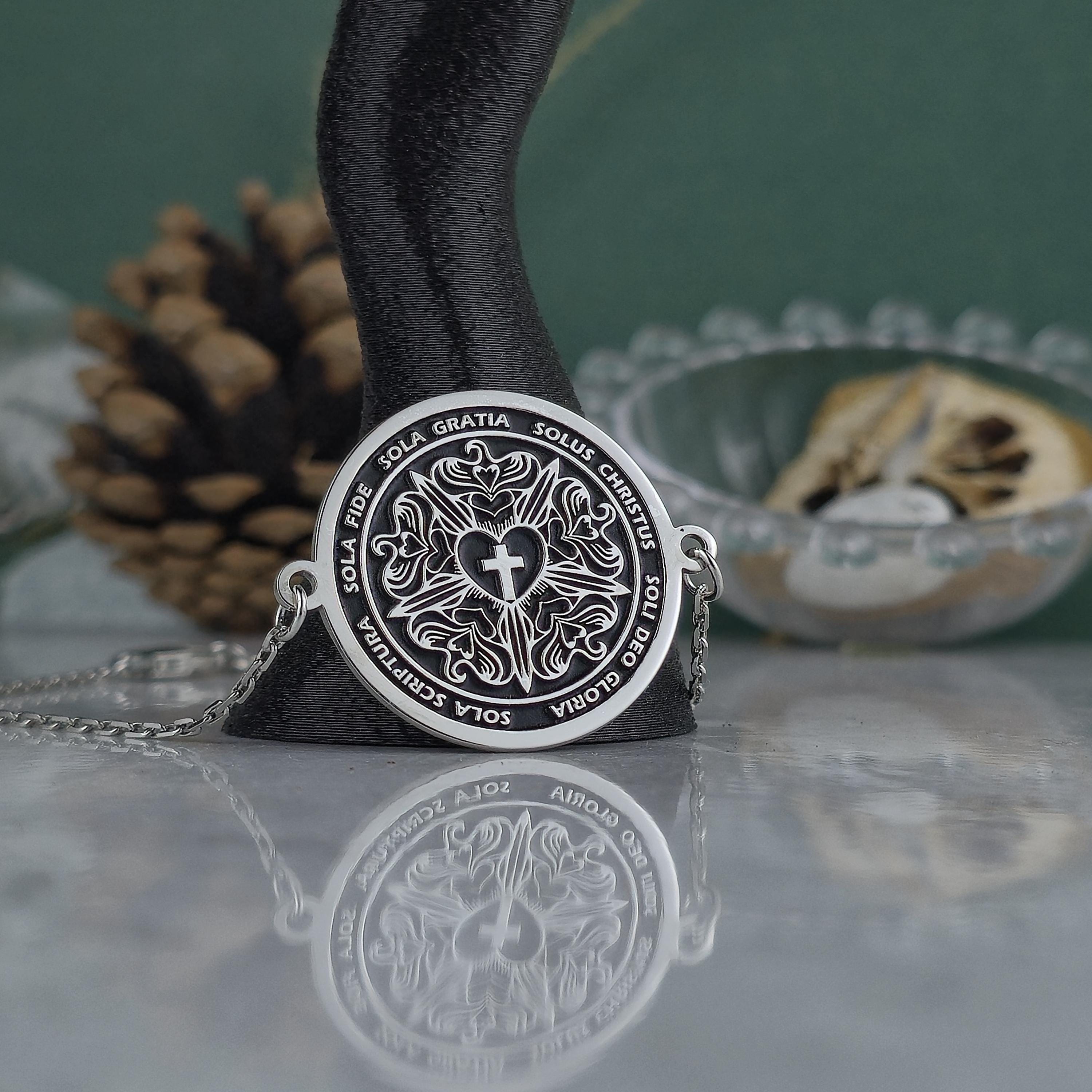 Each inscription on the locket celebrates the core values that have shaped Christian devotion for centuries: faith alone, grace alone, Christ alone, Scripture alone, and glory to God alone.
