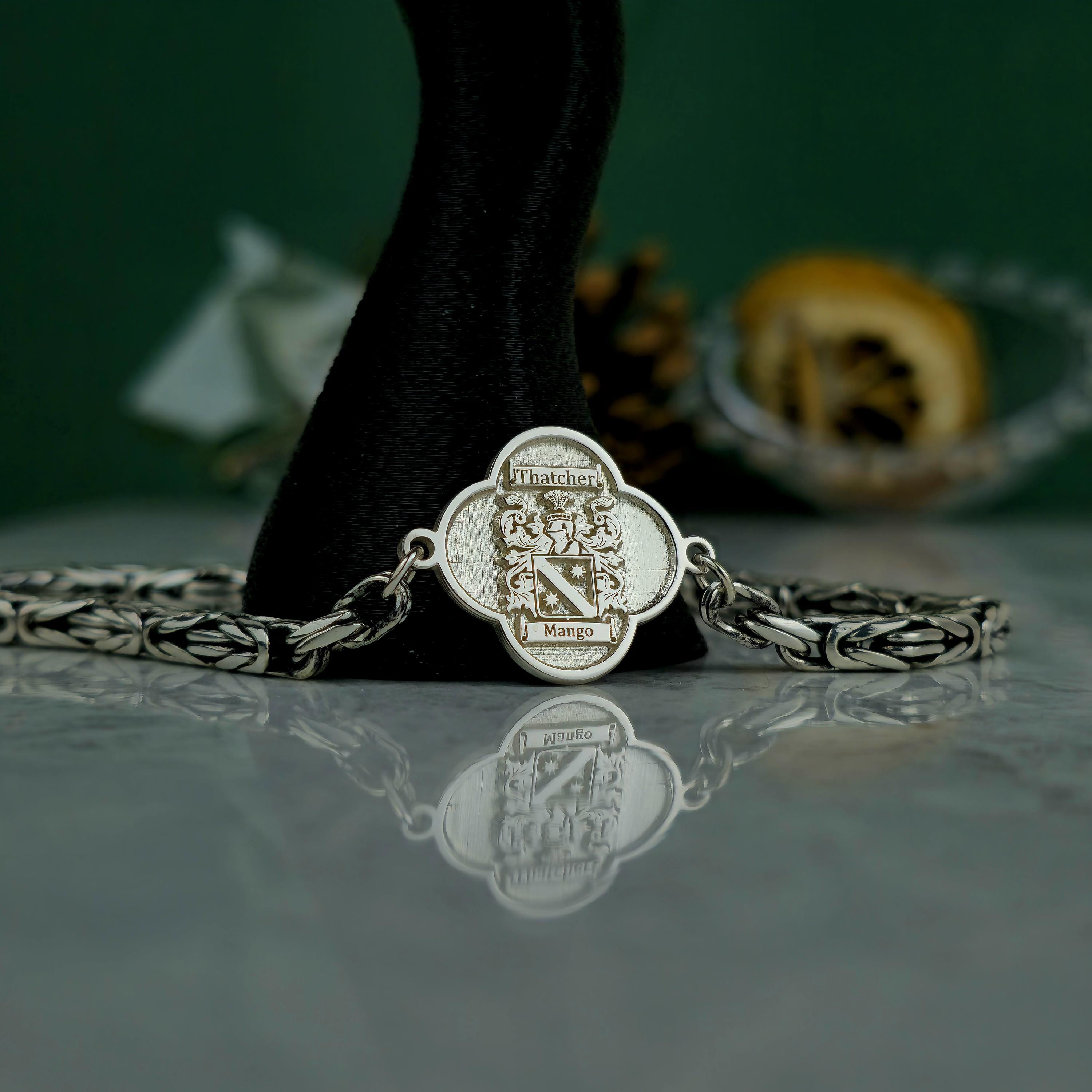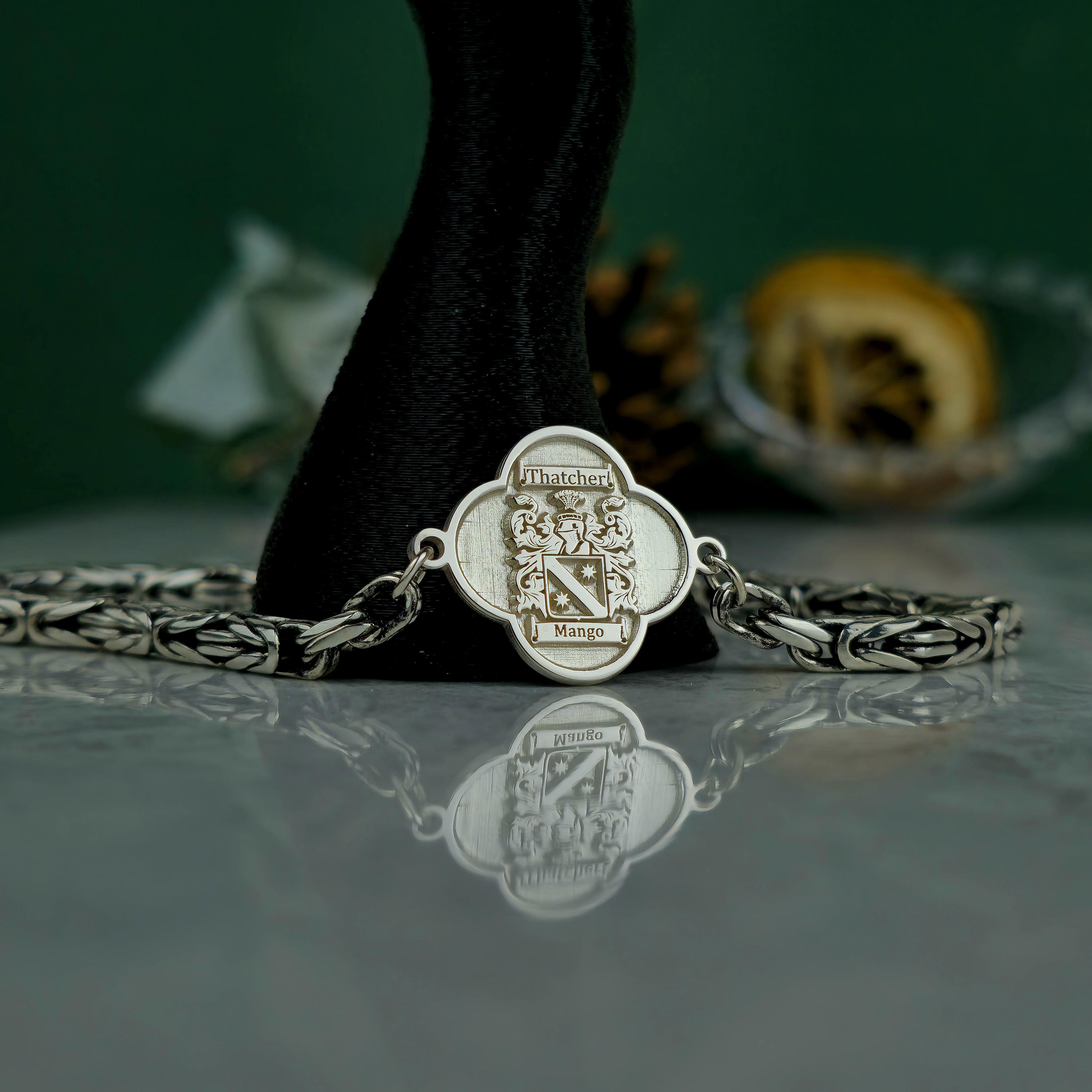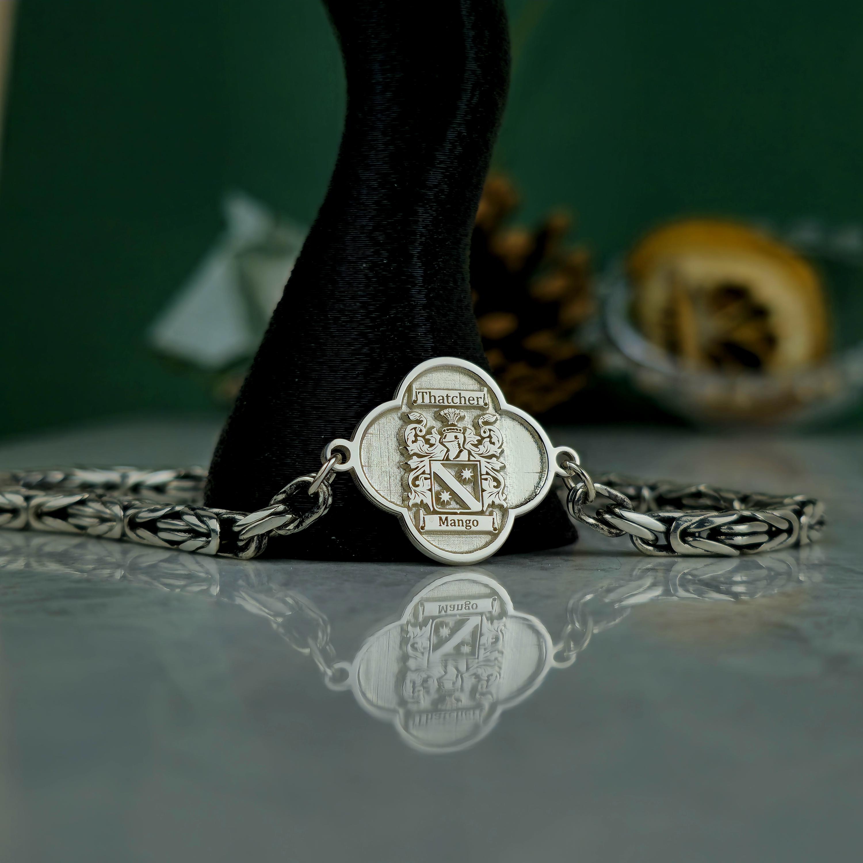 This handcrafted bracelet combines ancestral pride with bold, masculine elegance. Featuring a polished centerpiece with a custom-engraved family crest and an oxidized royal chain, this piece is designed for those who carry their heritage with confidence. 🛡️ Product Features