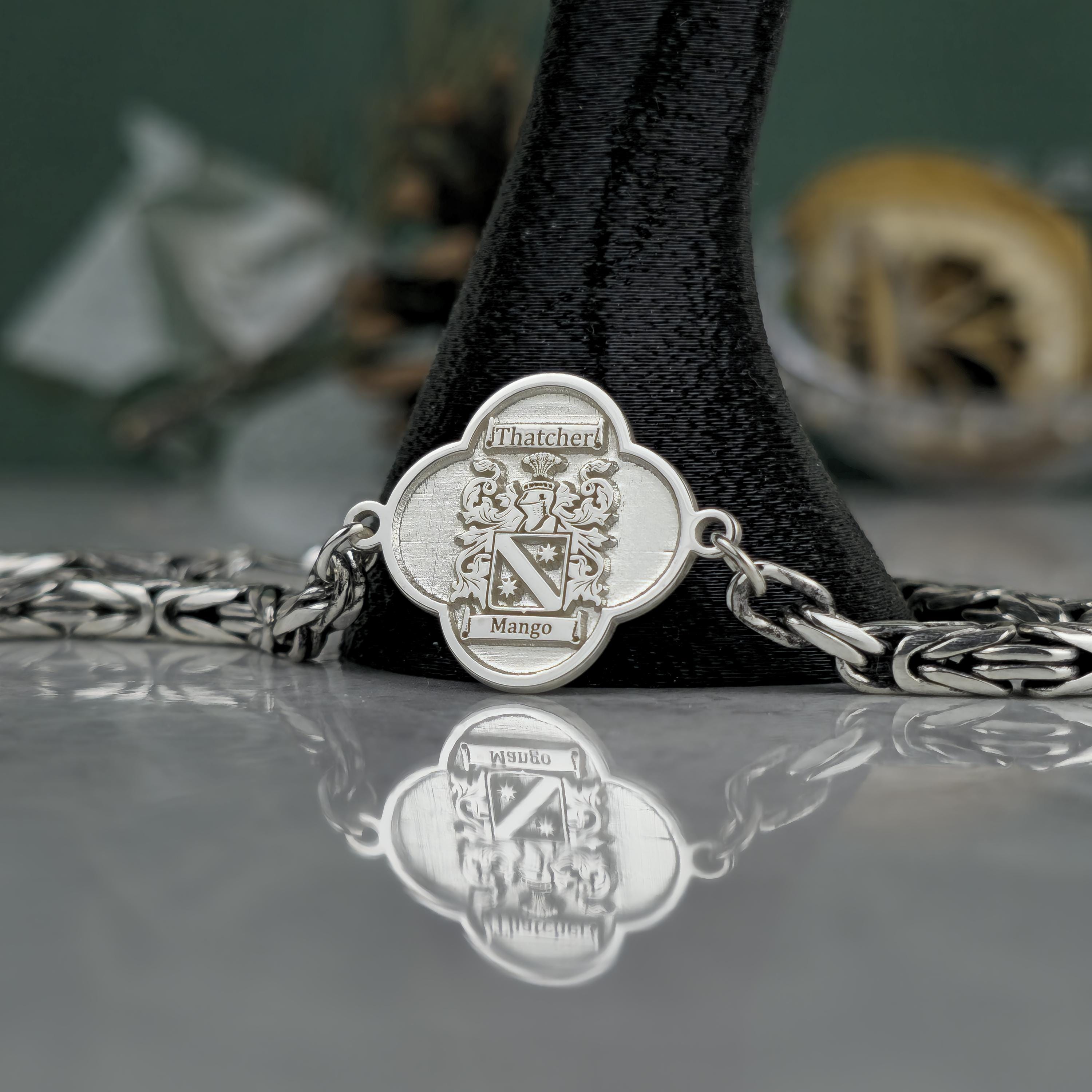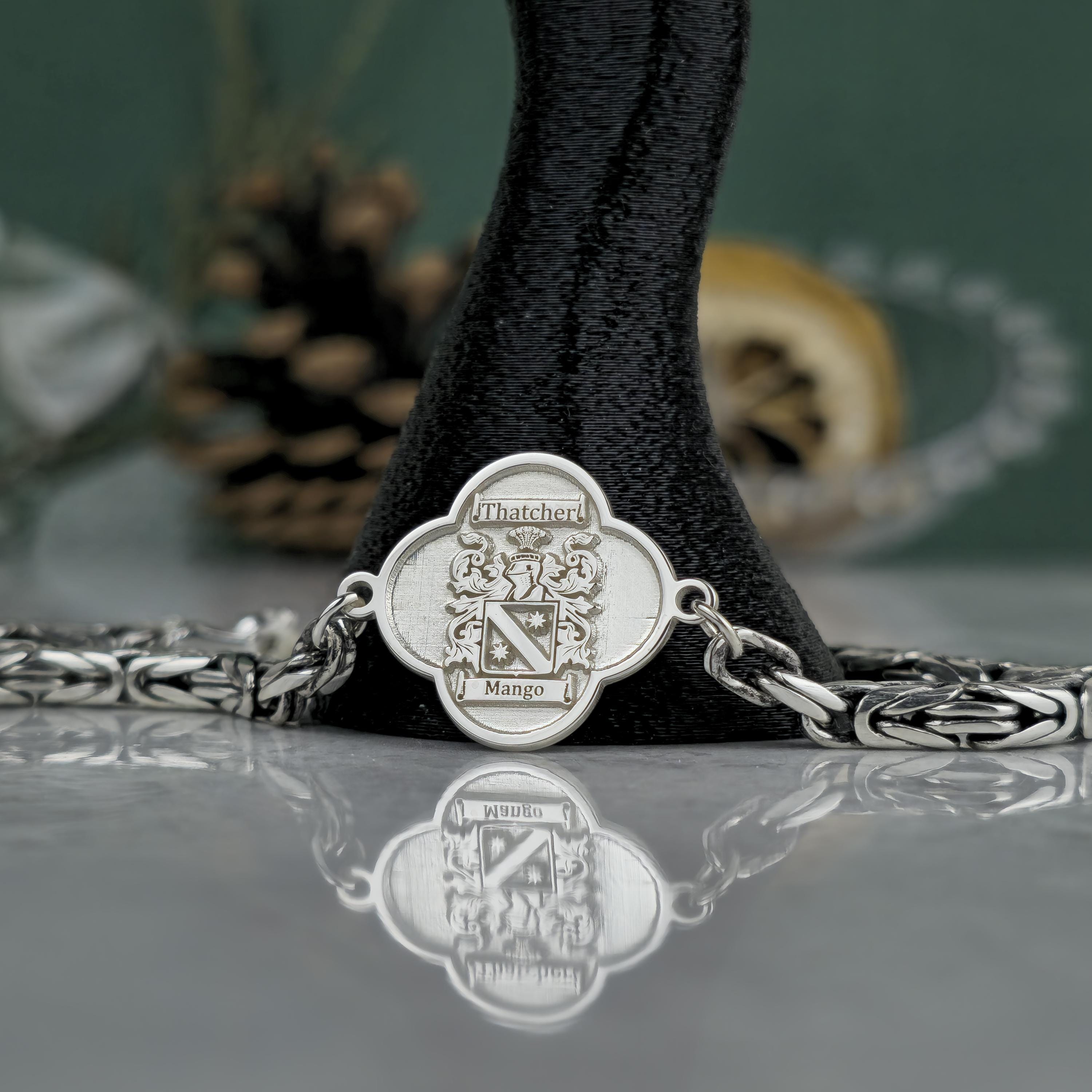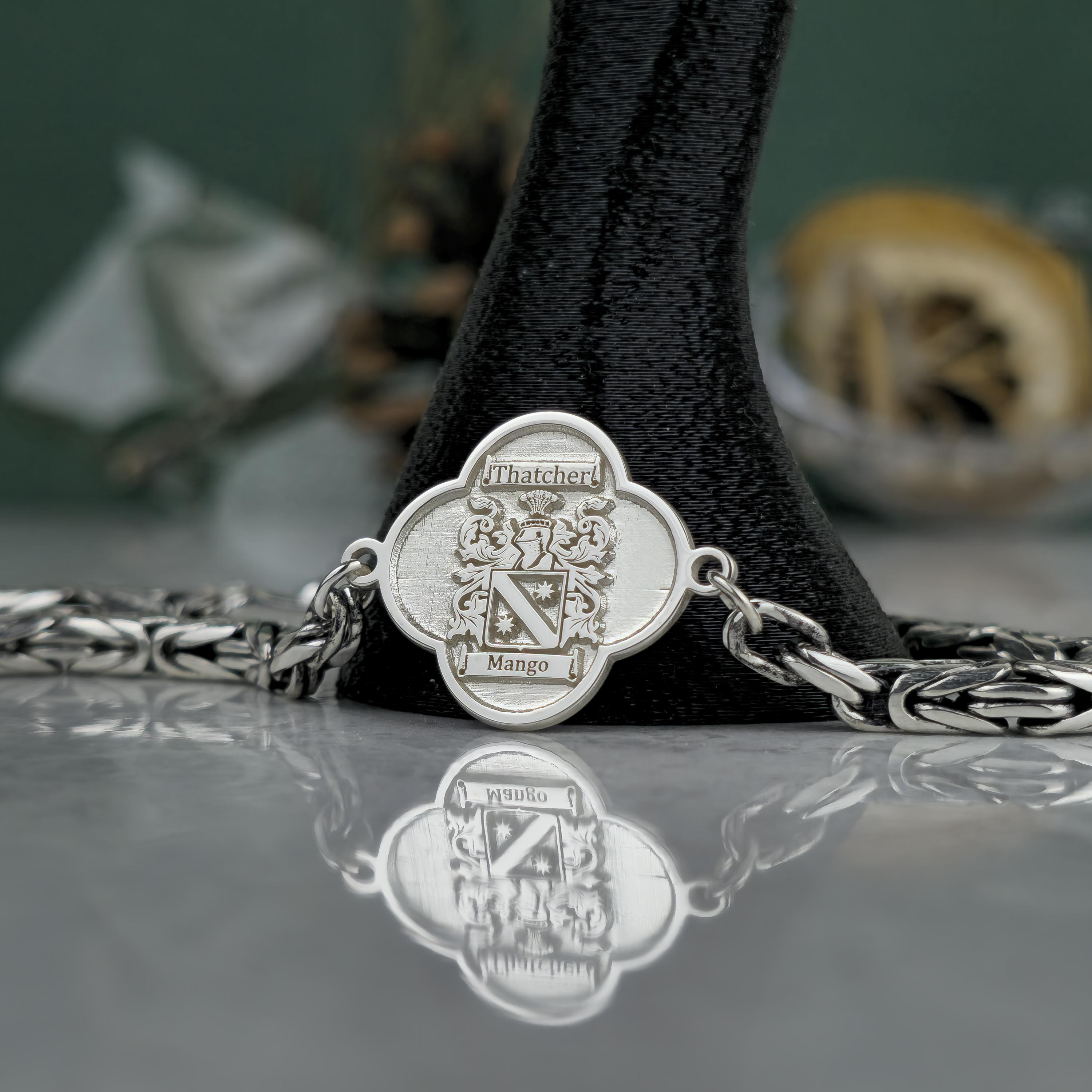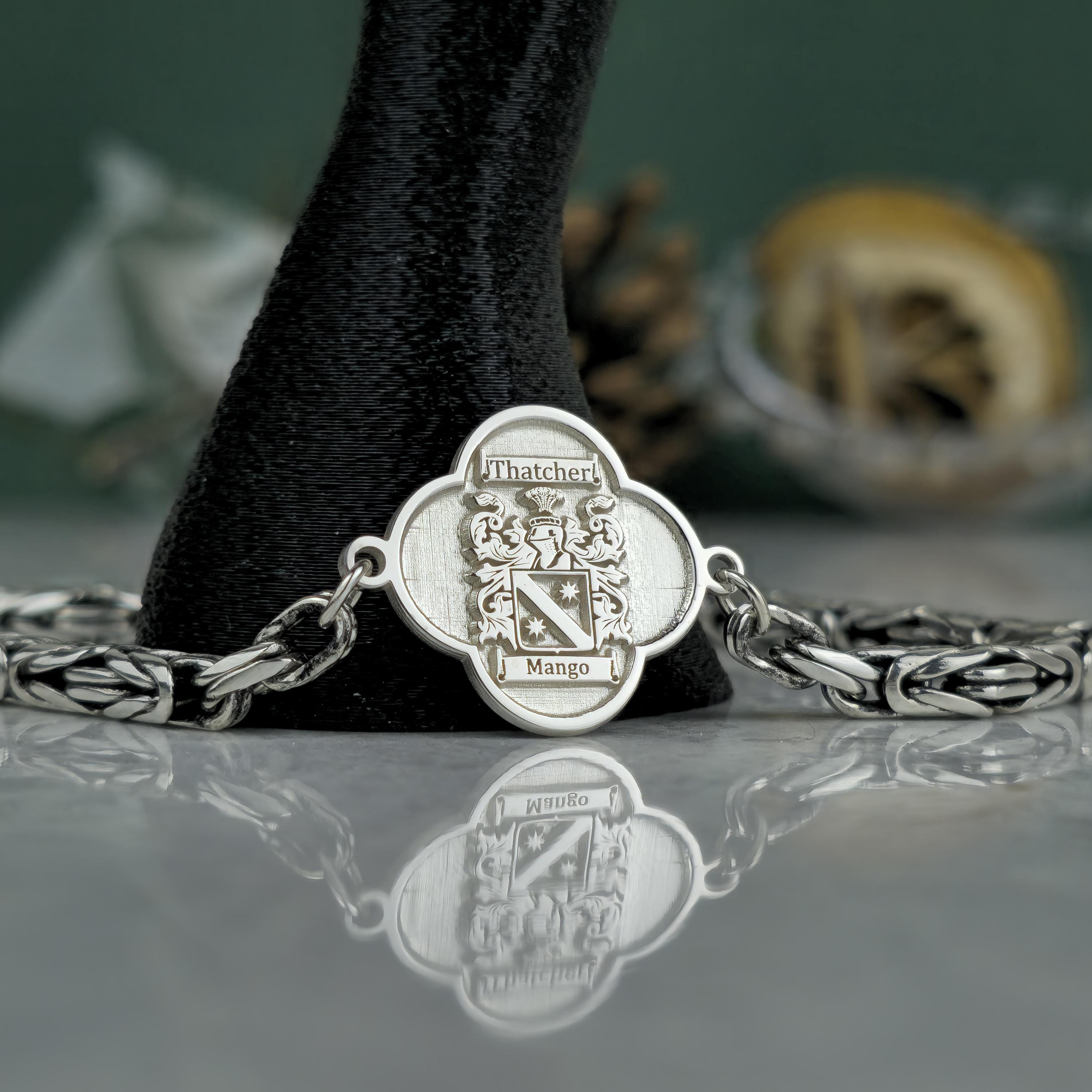 This handcrafted bracelet combines ancestral pride with bold, masculine elegance. Featuring a polished centerpiece with a custom-engraved family crest and an oxidized royal chain, this piece is designed for those who carry their heritage with confidence. 🛡️ Product Features