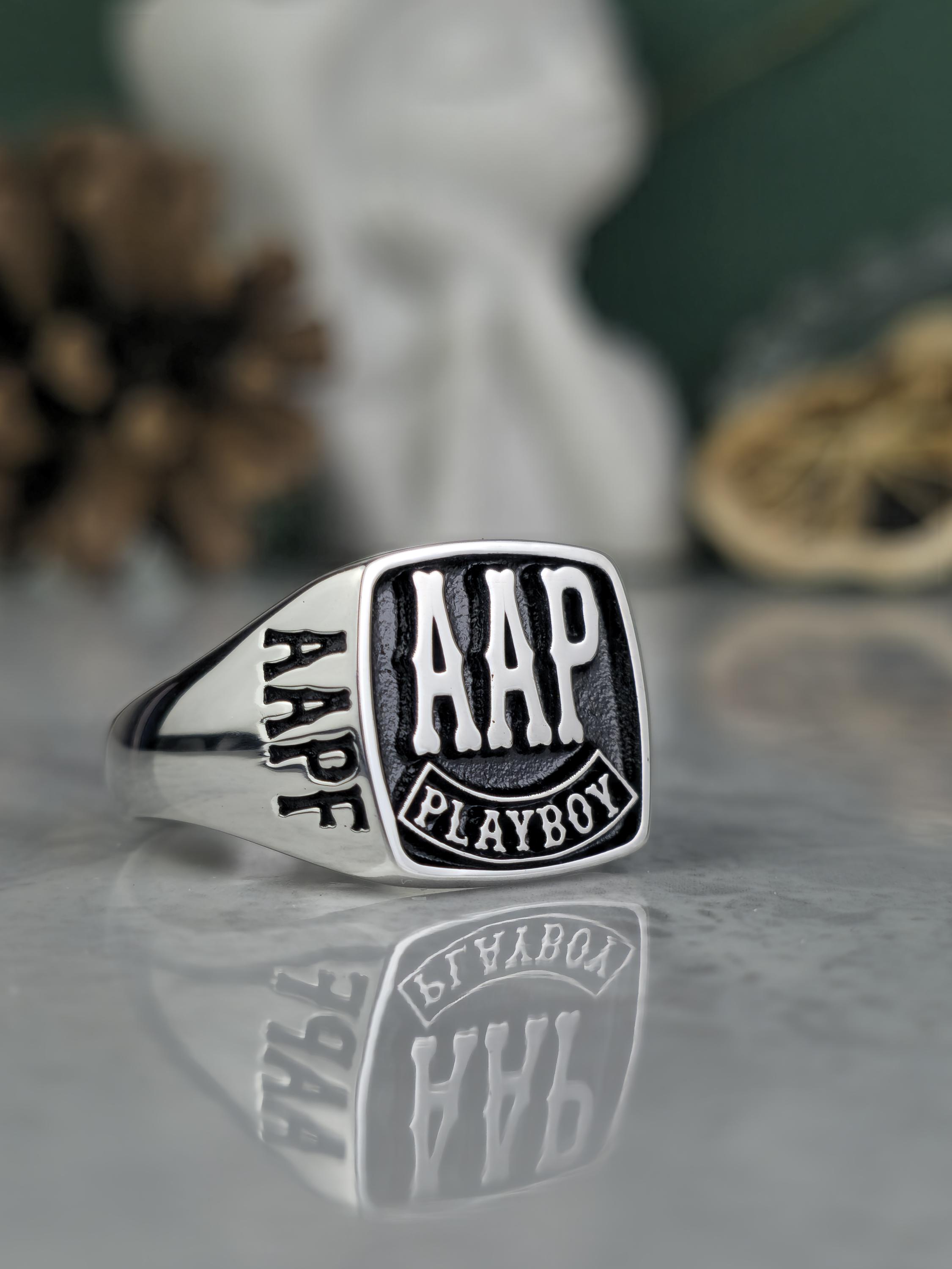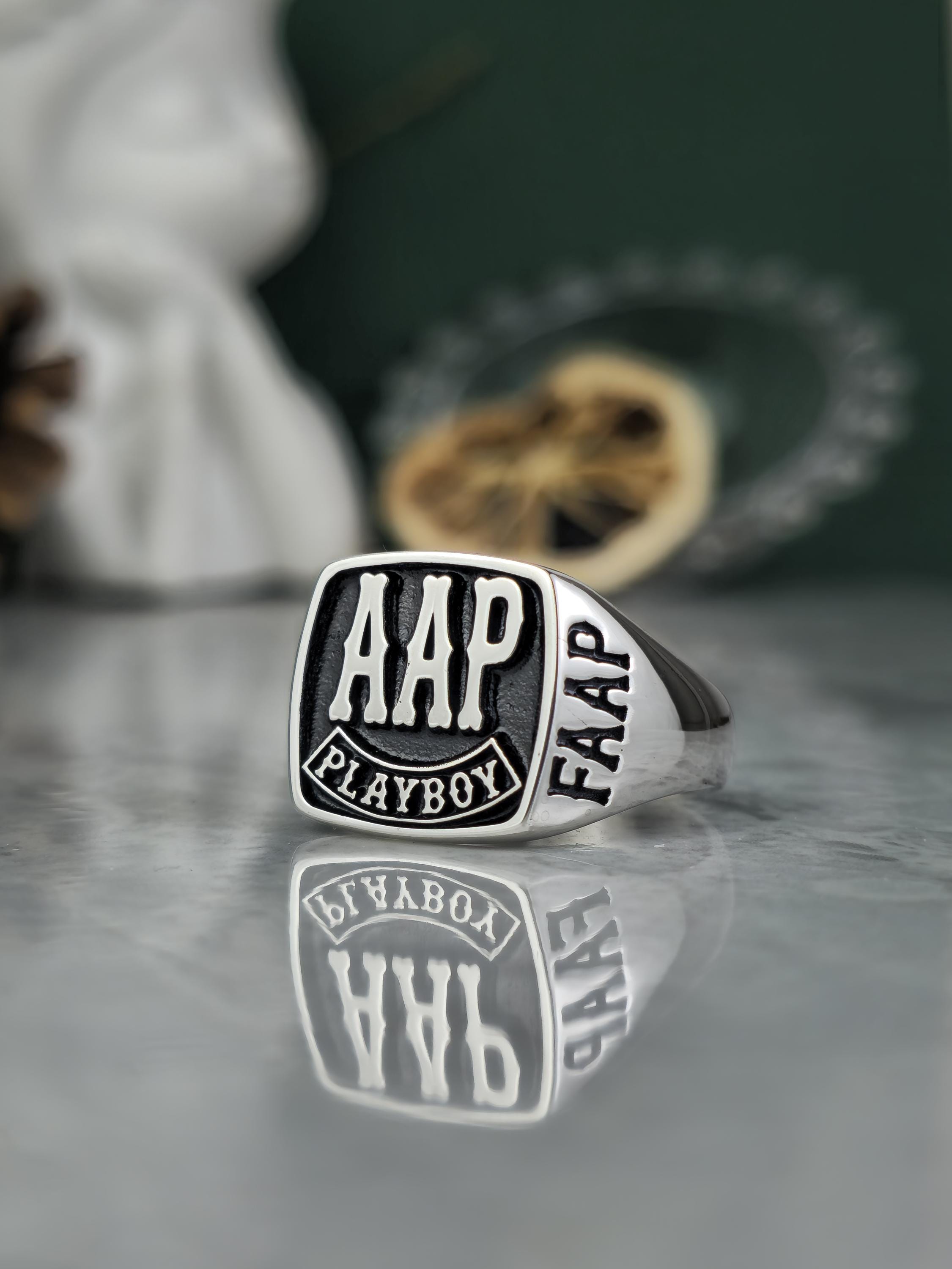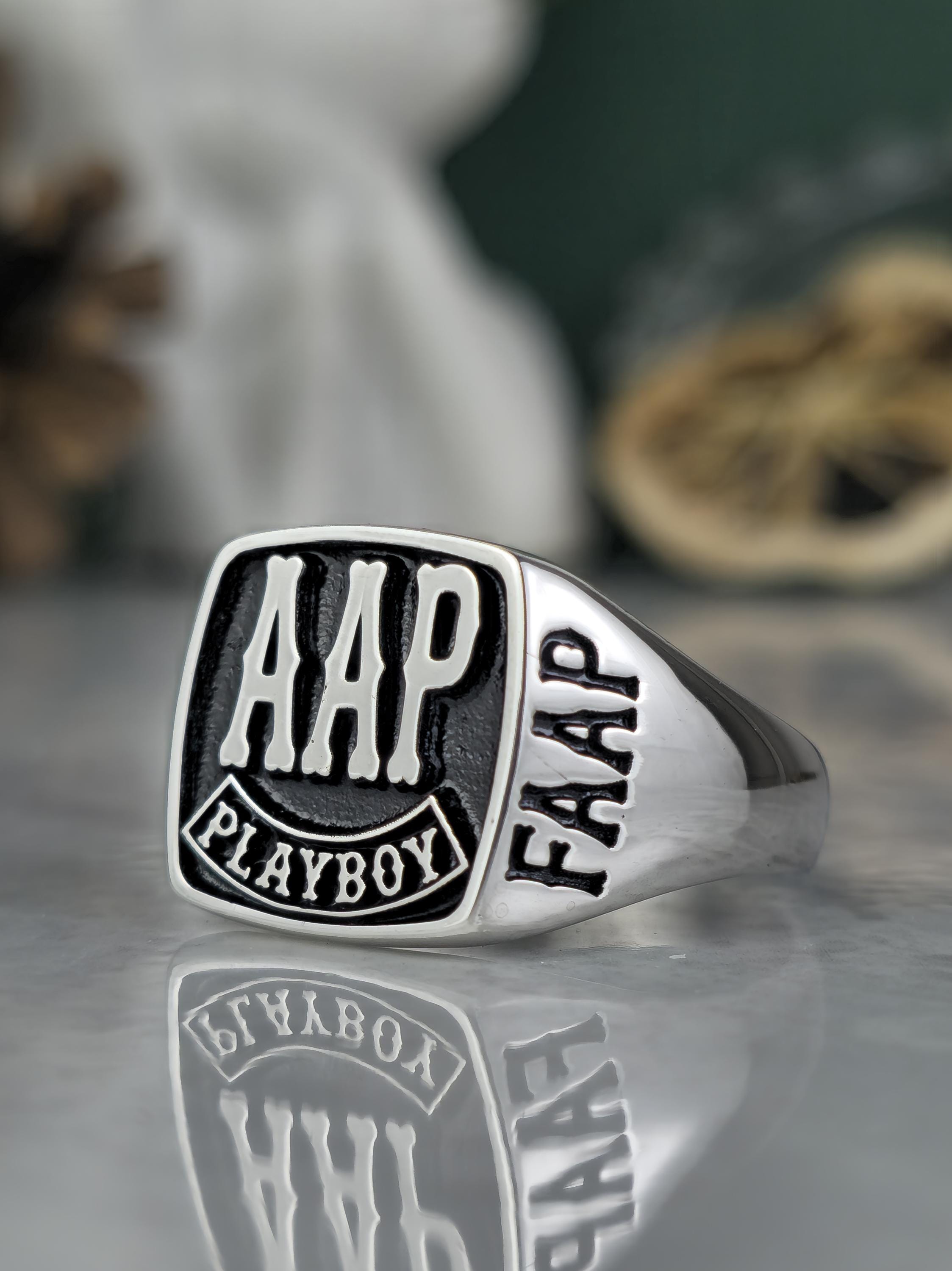 This uniquely designed biker ring is handcrafted for those who want to reflect their personal style and embody the spirit of camaraderie. Made from solid 925 sterling silver, this ring symbolizes individuality and freedom. The FAAP, AHD, and PLAYBOY engravings give it a personalized meaning.