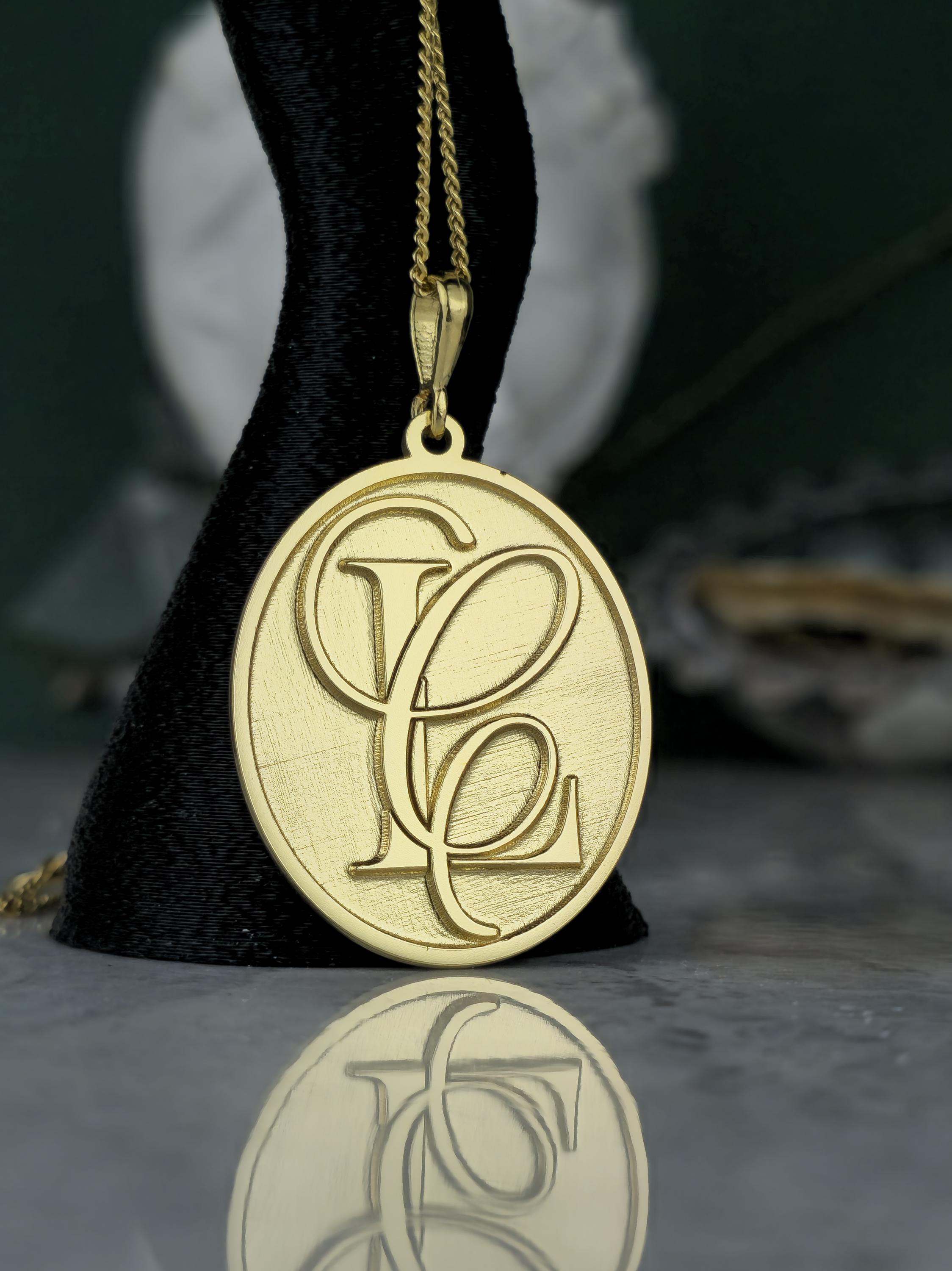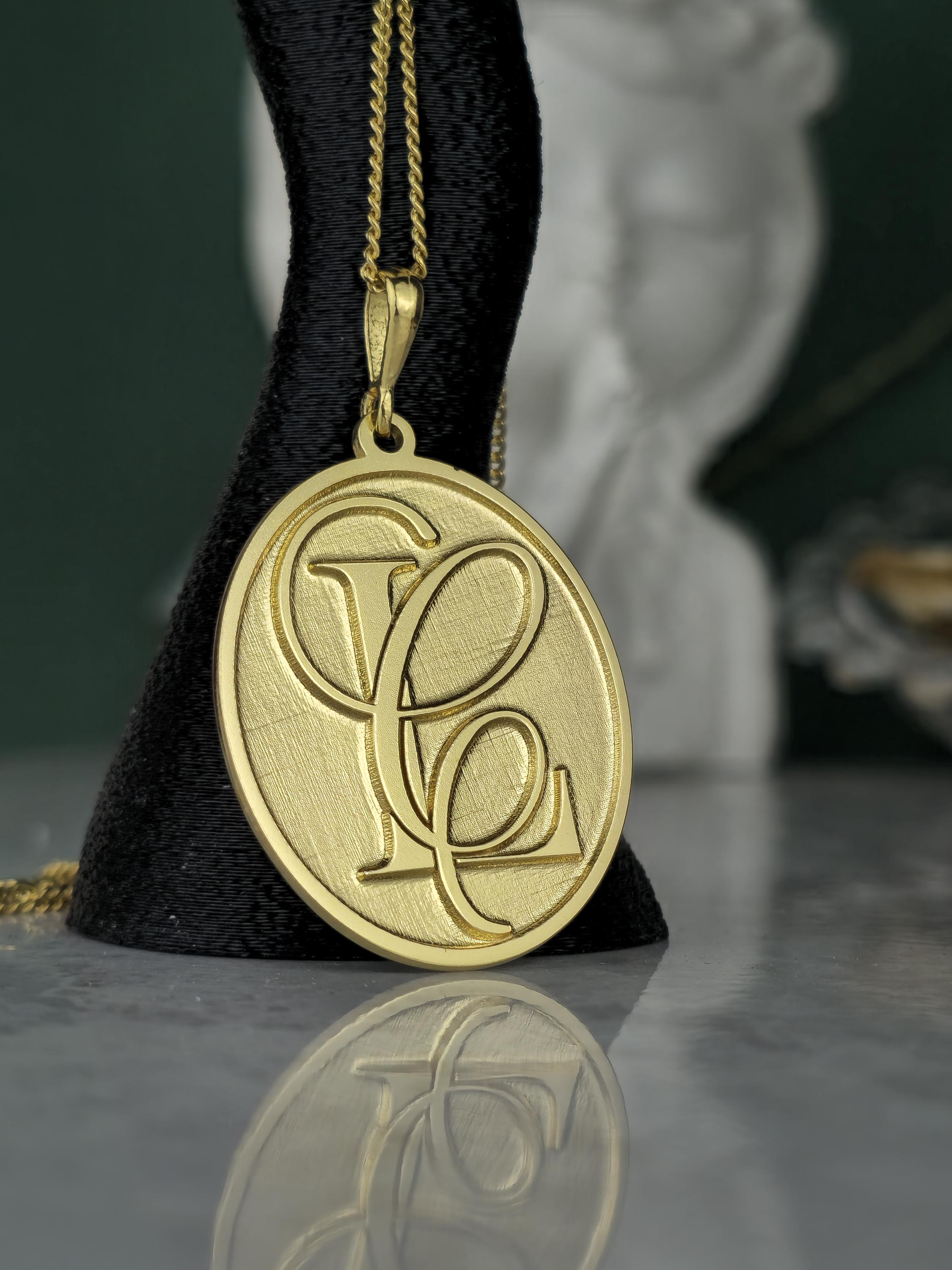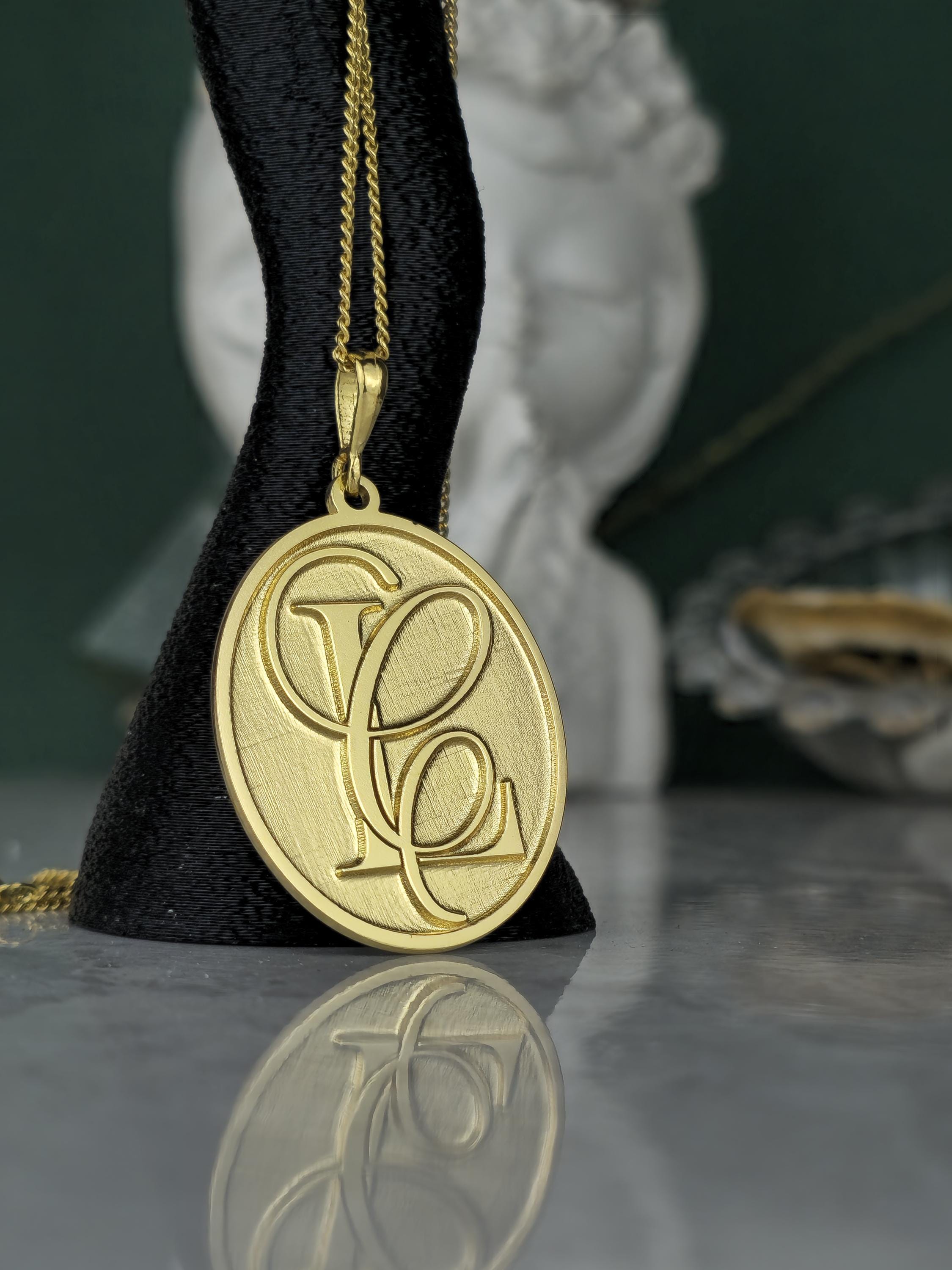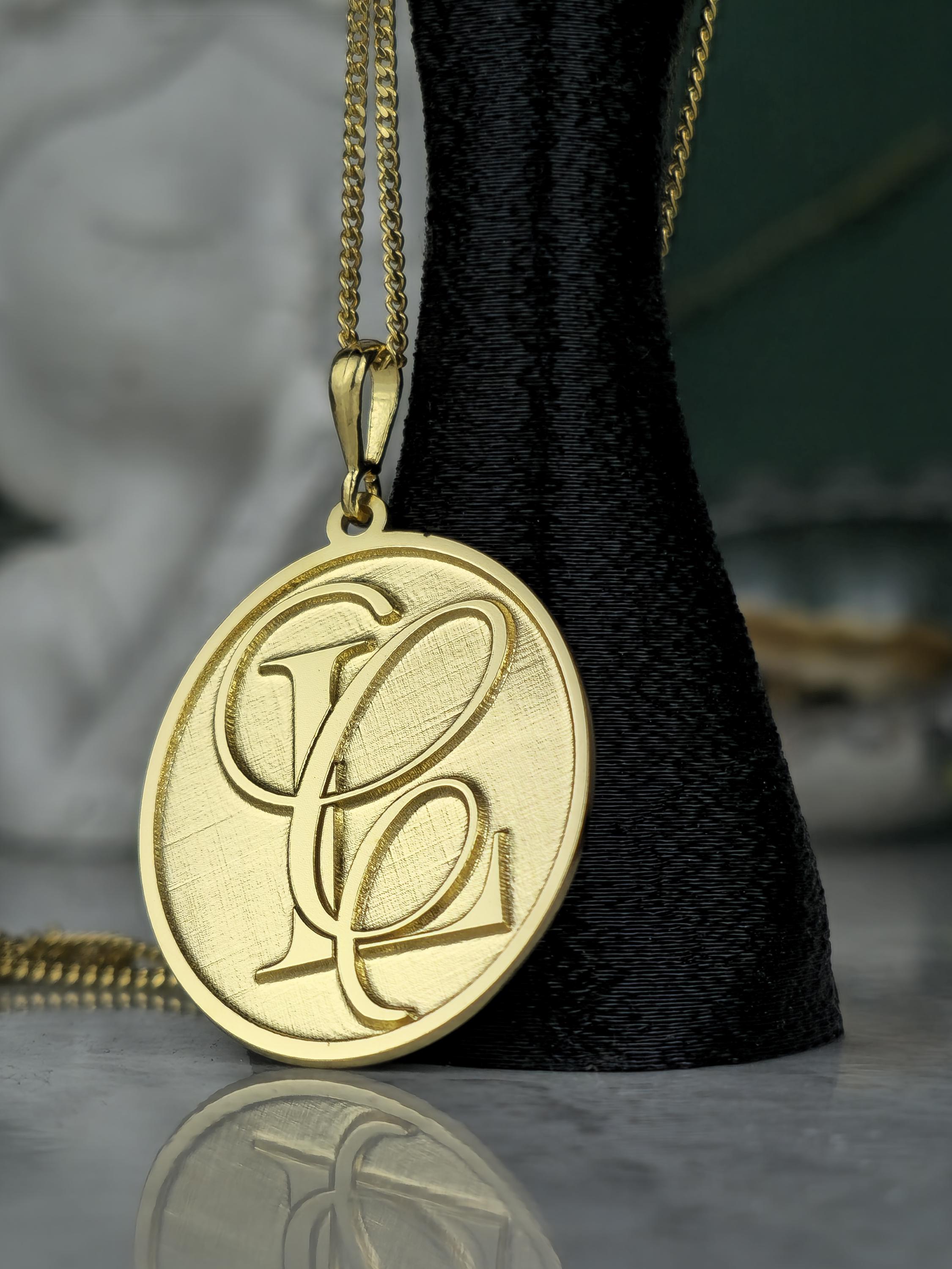 Design: 💖 Elegant oval pendant with intricately designed, intertwined custom initials (e.g., SF, FS). A classic brushed gold finish for a refined look.