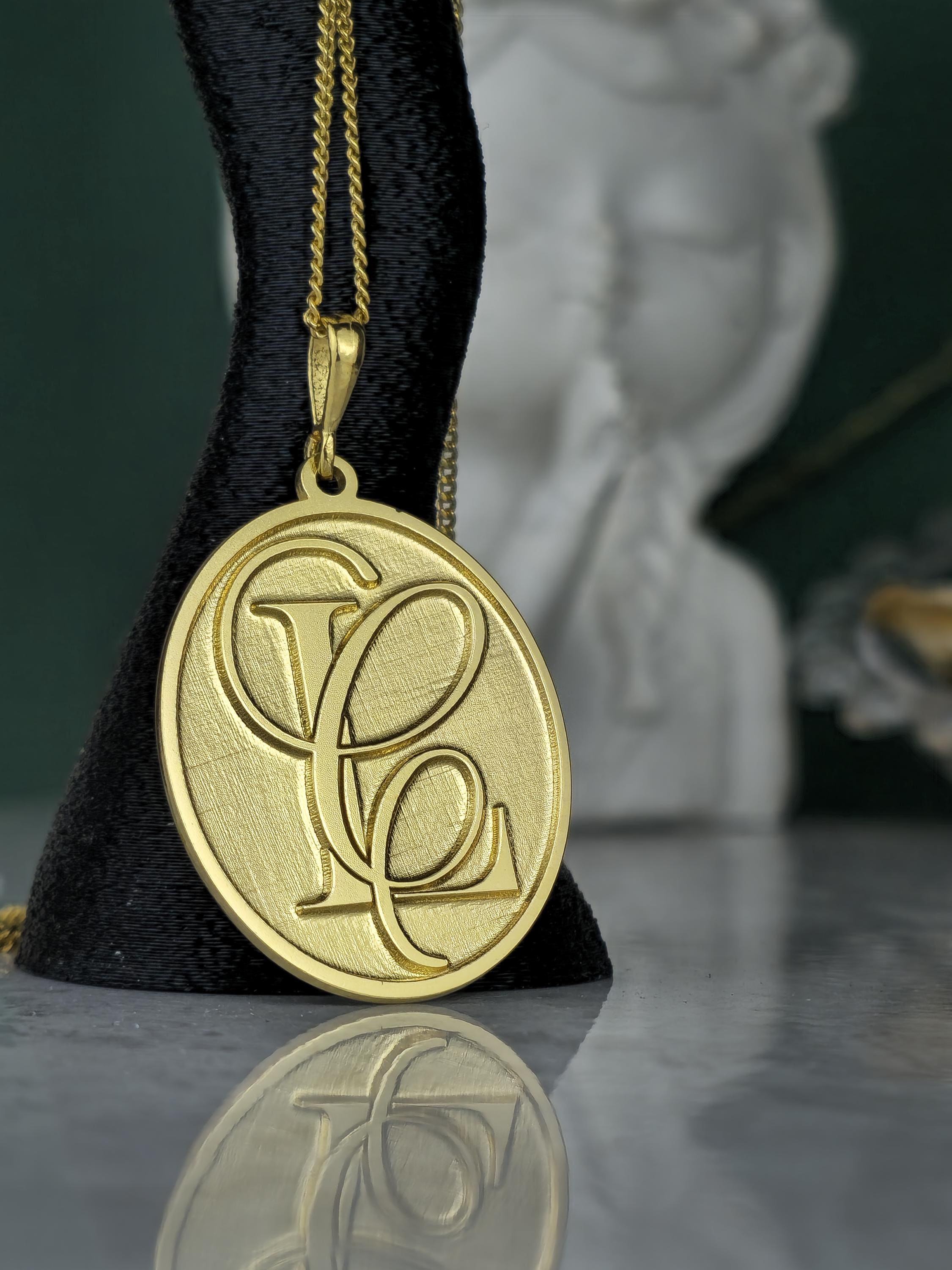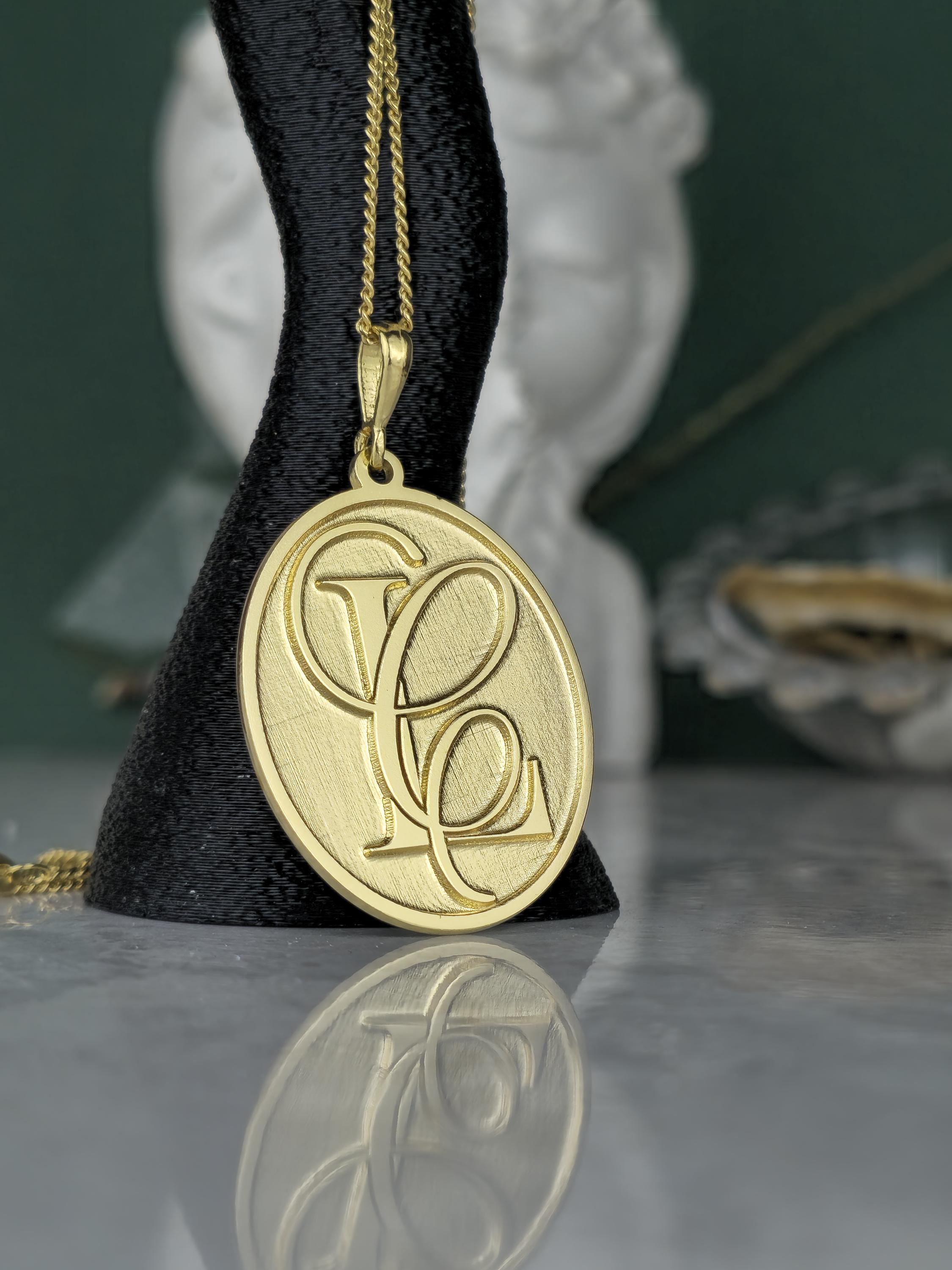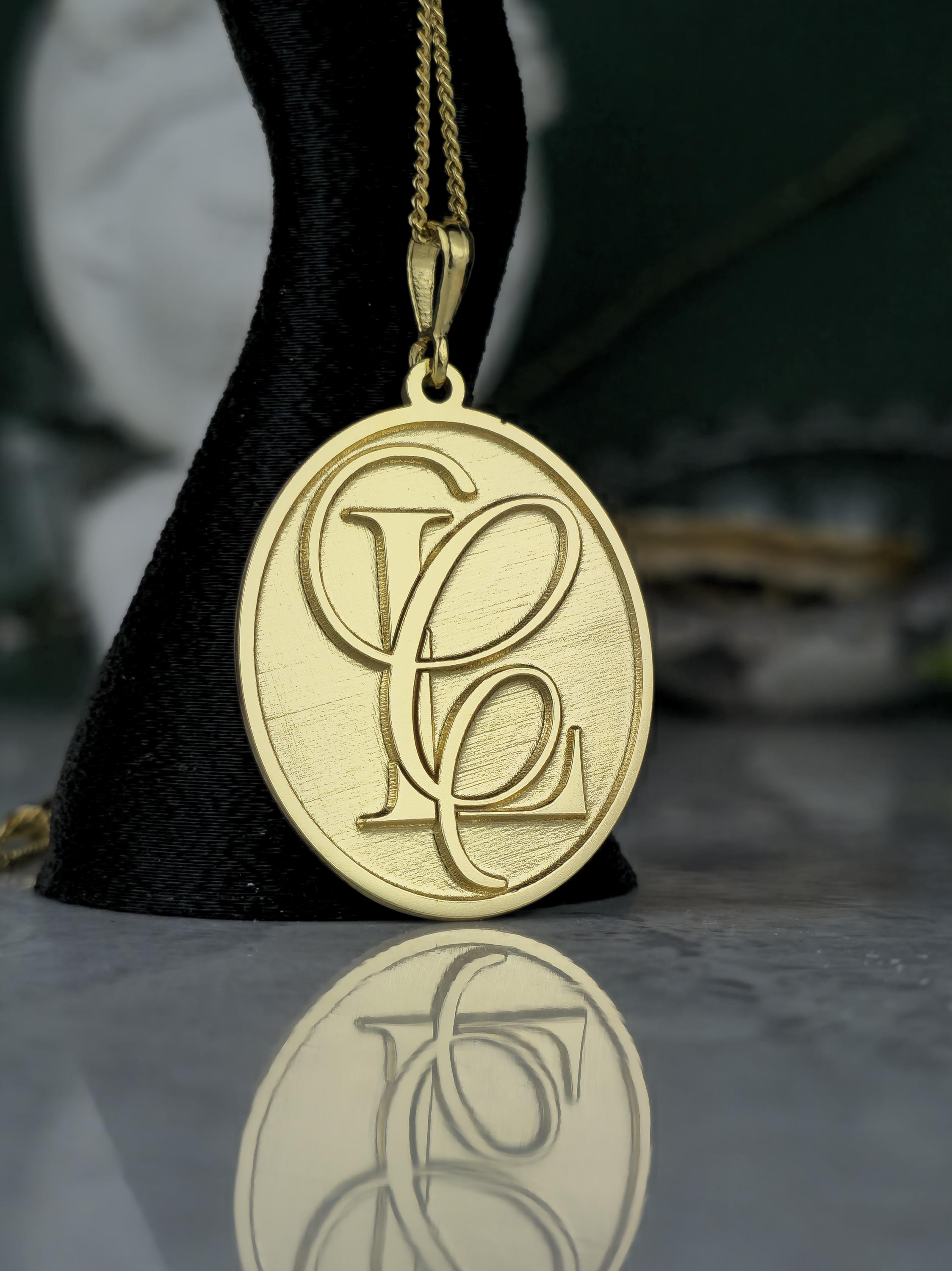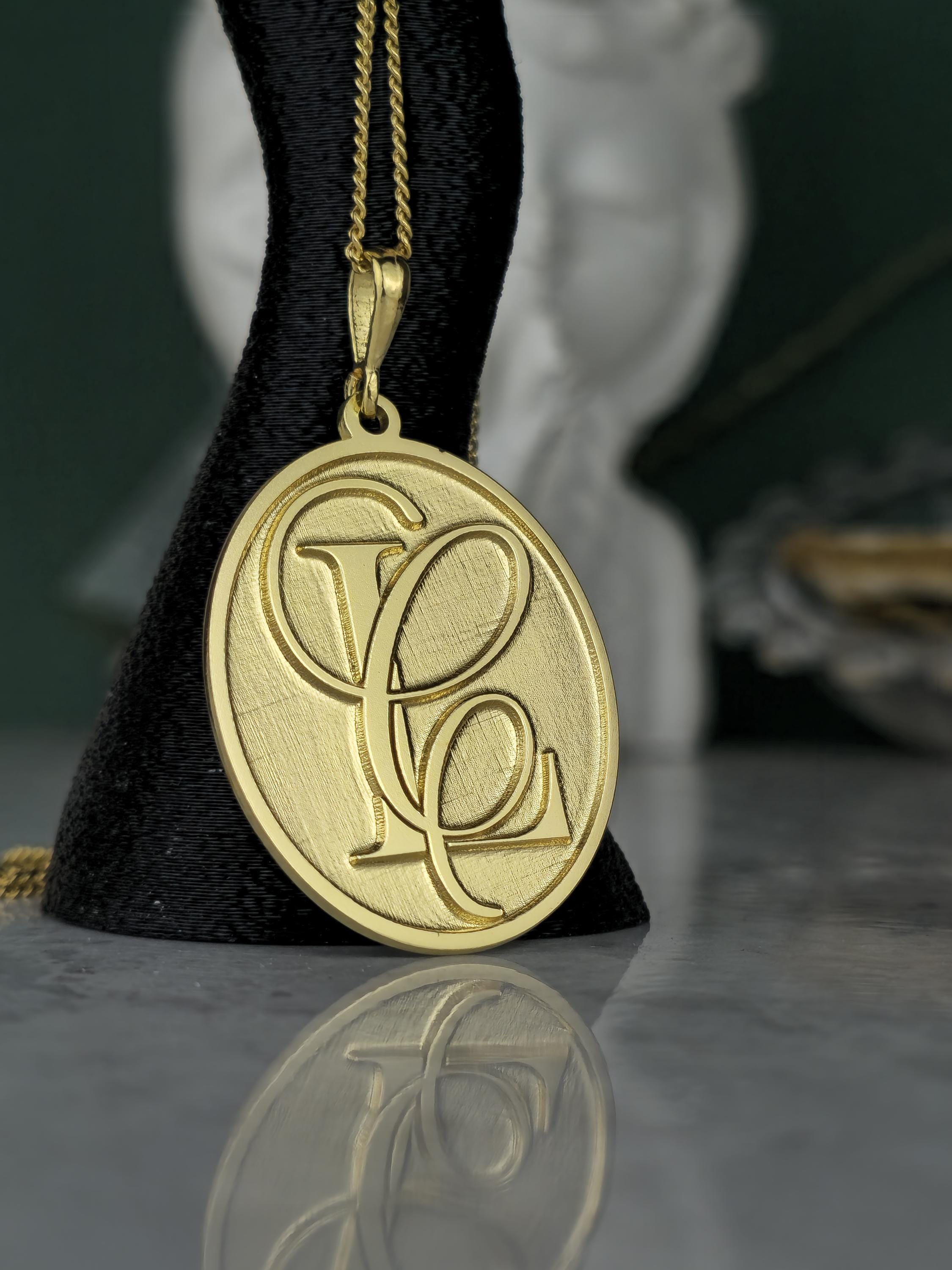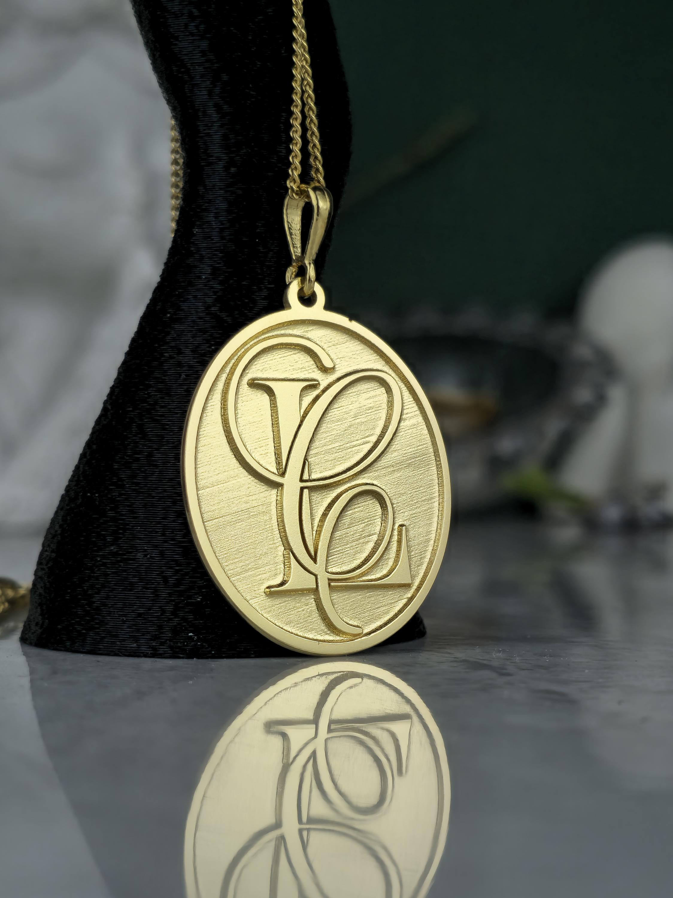 Design: 💖 Elegant oval pendant with intricately designed, intertwined custom initials (e.g., SF, FS). A classic brushed gold finish for a refined look.